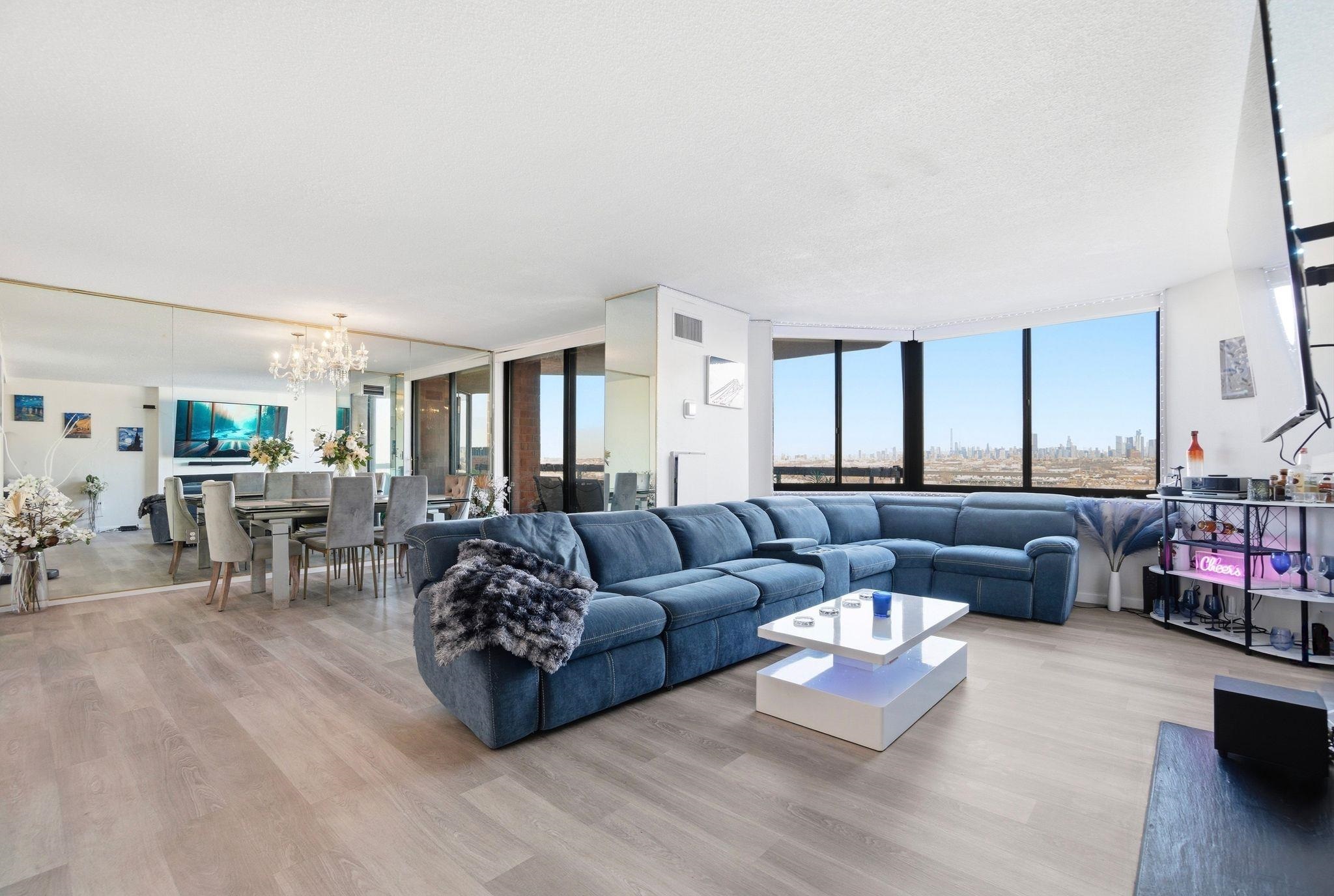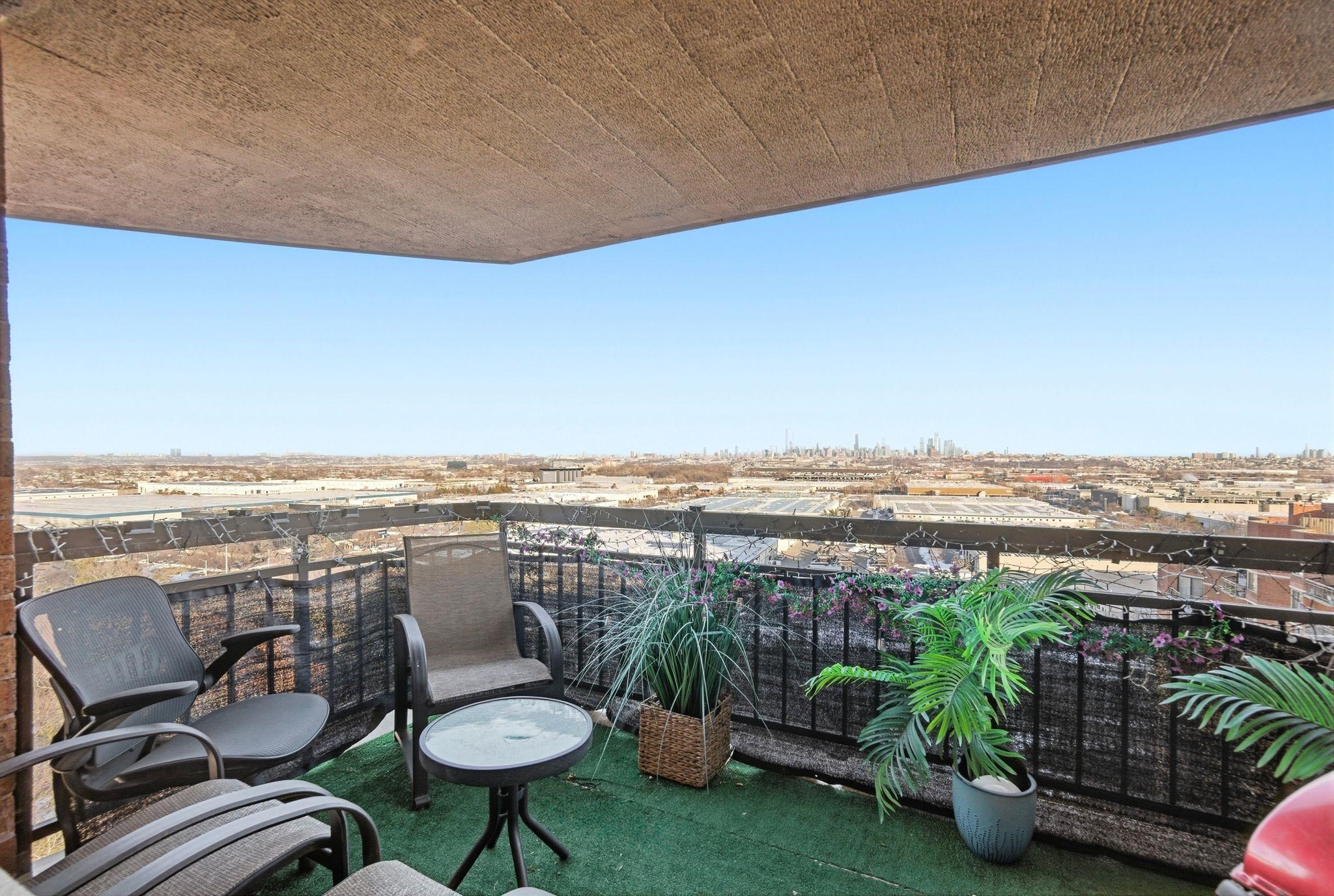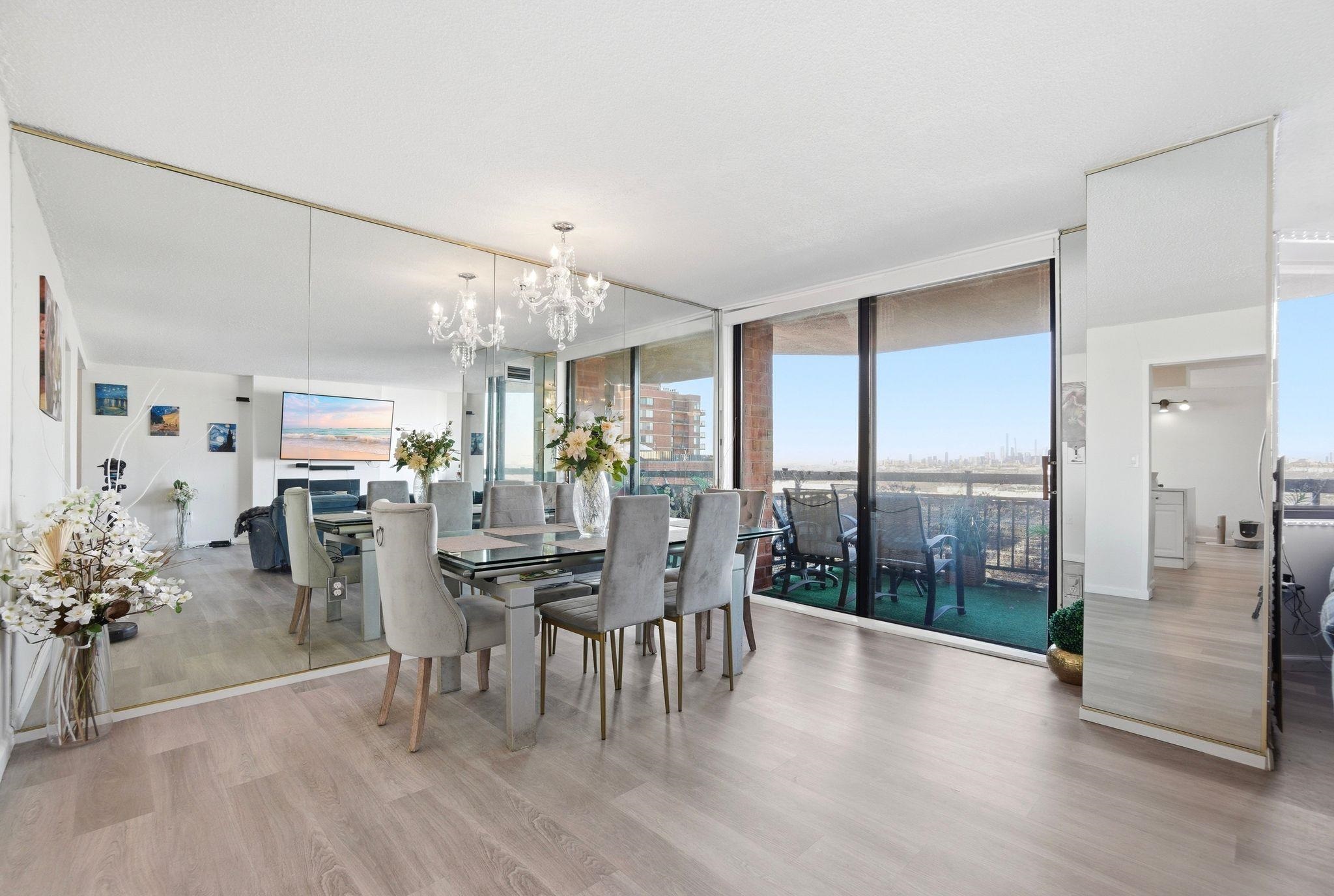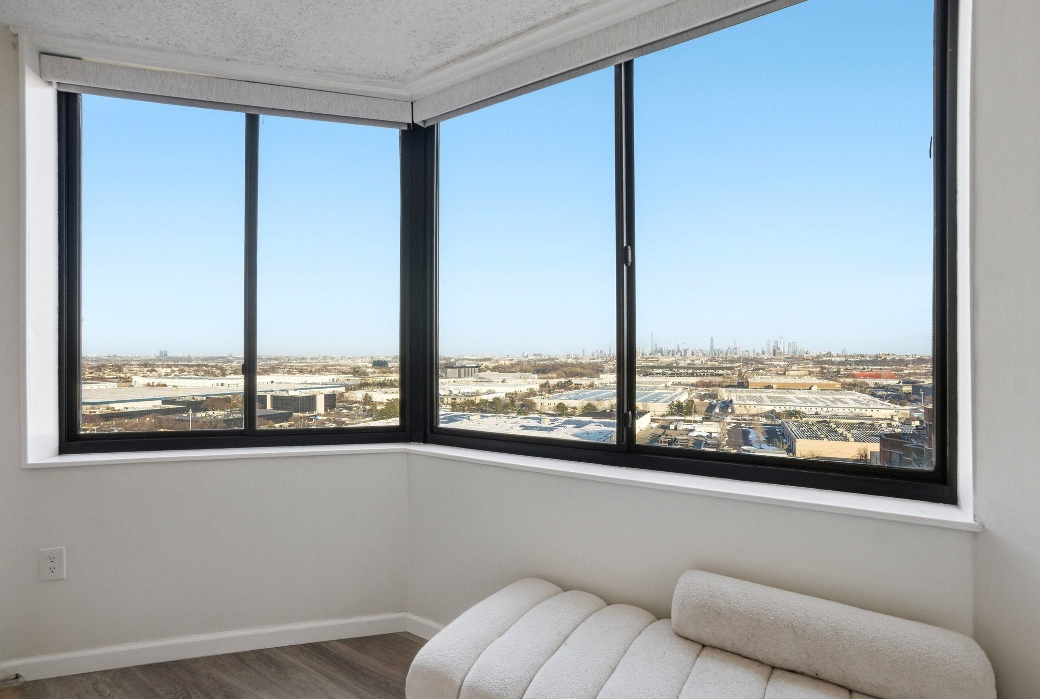 Welcome to this beautiful, oversized, and rare corner condo offering breathtaking NYC skyline views! This stunning and renovated residence features 2 bedrooms and 2 full bathrooms, plus an oversized eat-in kitchen with bonus den space ideal for additional seating or a work-from-home setup. Located on the 16th floor just steps from the elevator, this bright and spacious home is filled with natural light throughout. Enjoy spectacular, unobstructed NYC skyline views from both inside the home and your private walk-out terrace — the perfect place to relax, unwind, and take in the city lights. The thoughtfully designed layout includes a large entry foyer, expansive living room, formal dining area, and an eat-in kitchen equipped with quartz countertops and stainless steel appliances. The luxurious primary suite features a walk-in closet and an oversized bathroom complete with Jacuzzi tub, separate standing shower, and double sinks. Wake up and fall asleep to stunning NYC skyline views visible from the bedrooms as well. A generously sized second bedroom and full hallway bath complete the home. Additional highlights include central A/C, in-unit washer/dryer, and one deeded indoor parking space. Indoor storage and extra parking spots available through management. Residents of Harmon Cove Towers enjoy resort-style amenities including 24-hour doorman/concierge, security, elevators, pool and kids’ pool, fitness center, steam room, basketball and tennis courts, children’s playroom, game room, outdoor play area, and vibrant community social events. Commuters’ dream location with on-site NYC transportation, NJ Transit express bus directly under the building, and close proximity to Secaucus Junction, NJ Turnpike, Routes 3, and Newark Airport. Situated in a quiet town with well-regarded schools and variety of shopping stores. Move right in and enjoy luxury living with unbeatable NYC access!