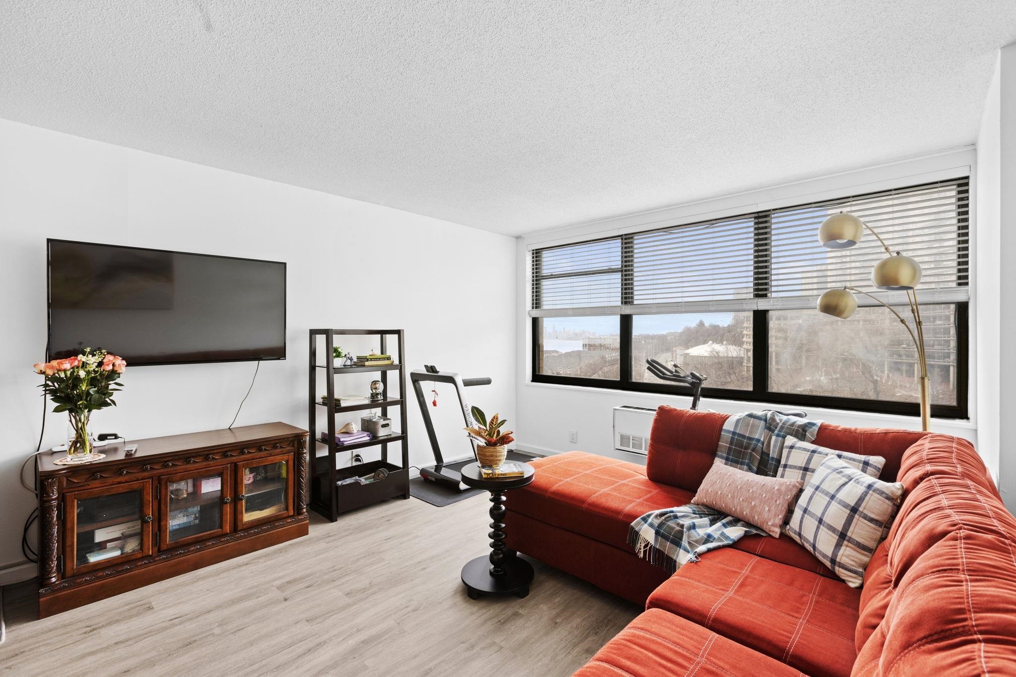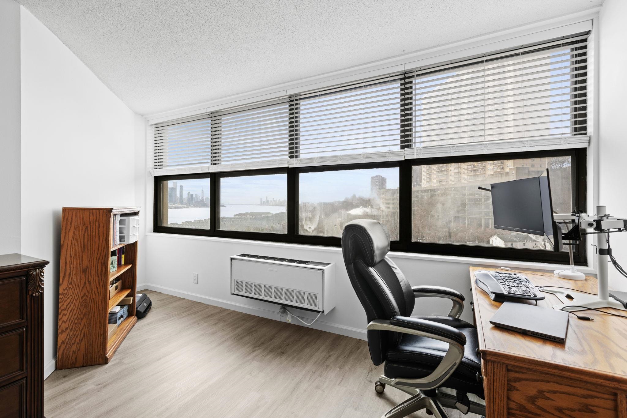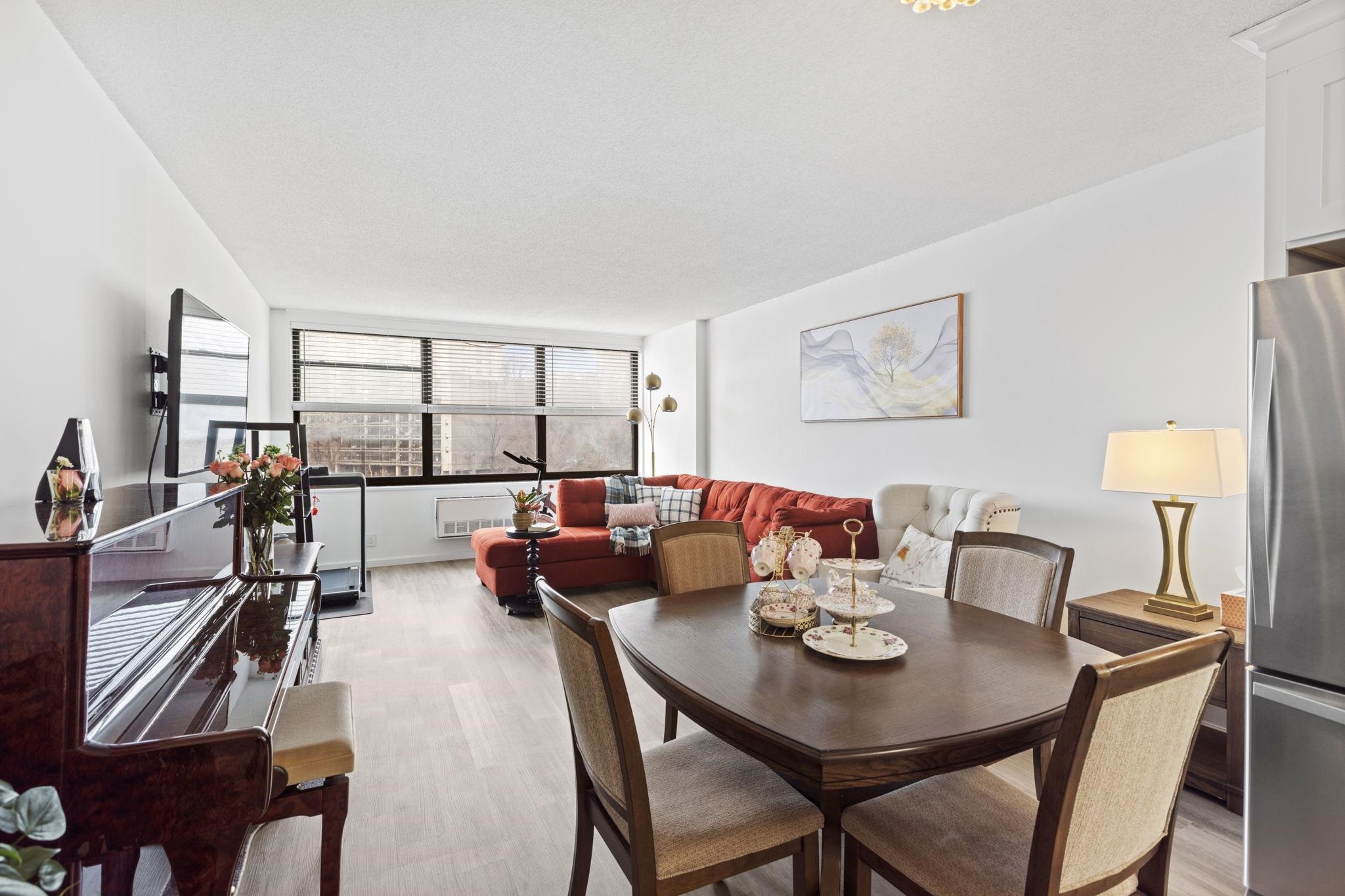 Experience luxurious living in this elegant 1-bedroom, 1.5 bathroom residence at The Galaxy along the Hudson River. Spanning 932 square feet, this chic home has been completely remodeled in 2023, boasting clean lines and a contemporary design. As you step inside, natural light floods the open layout with south/east facing windows, creating a warm and inviting ambiance. The kitchen features modern appliances and an open concept, while the bedroom and both bathrooms exude contemporary sophistication. A walk-in closet completes the picture. Revel in spectacular views of NYC and the Hudson River from your windows. Nestled just 2.5 miles north of the Lincoln Tunnel and 5 miles south of the George Washington Bridge, The Galaxy offers effortless commuting options, including easy access to buses and scenic ferry rides into Manhattan. Upgrade your lifestyle with a 24-hour concierge, access to on-site Health & Wellness Spa, state-of-the-art gym equipped with Life Fitness gear, Pelotons, and free weights. Enjoy newly renovated indoor and outdoor pools, jacuzzi, saunas, steam rooms, game room, children's room, meeting rooms, and a club room with a kitchen. Take advantage of tennis and pickleball courts, and unwind in the .75-acre elevated, zen-like landscaped private park, perfect for quiet enjoyment and picnics. The attached mini-mall offers an array of conveniences, including restaurants, a grocery store, ATM, dry cleaner, pharmacy, dentist, doctors, and day care. Nearby, you'll find an abundance of restaurants, as well as a 167-acre park with a lake, flea market, and seasonal farmer's market just 10 blocks away. The Galaxy welcomes up to 2 pets per apartment, and a 2nd indoor parking spot is available for $120 per month per car. Don't miss the opportunity to live in luxury at The Galaxy.