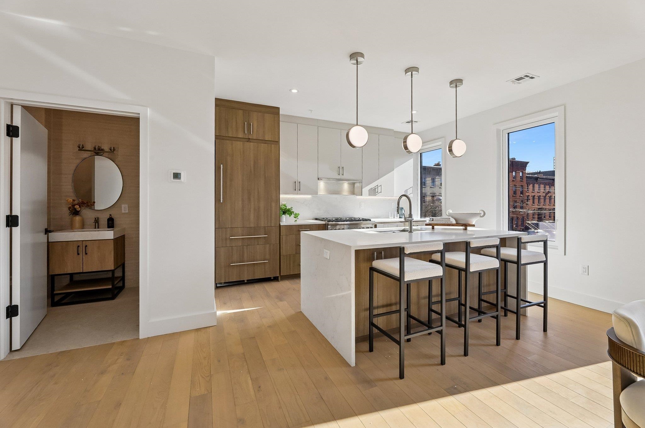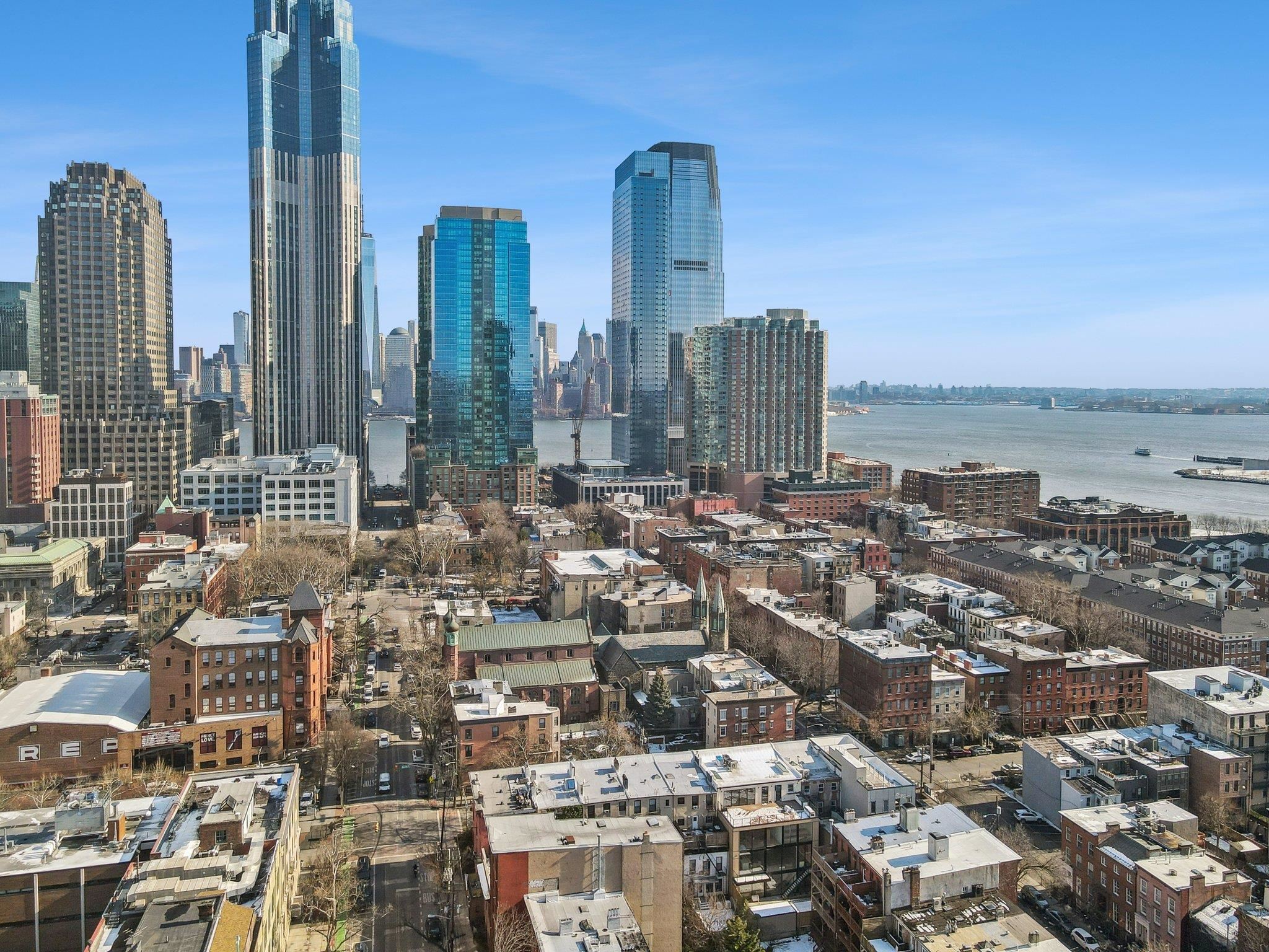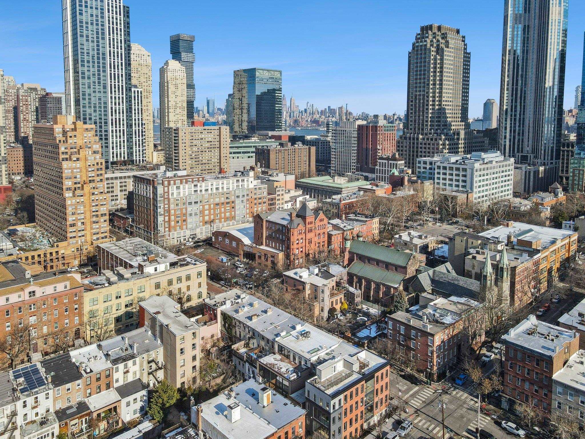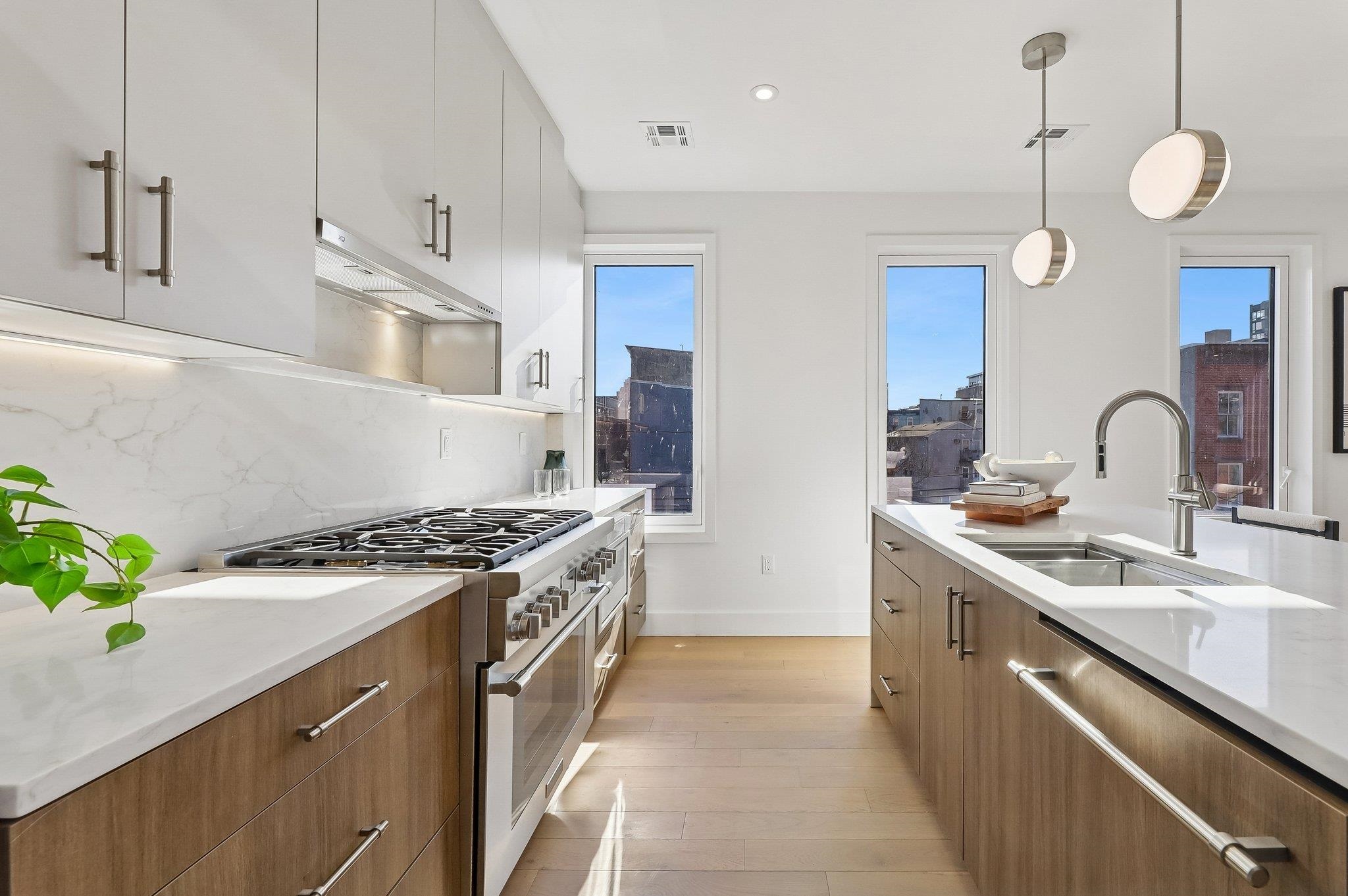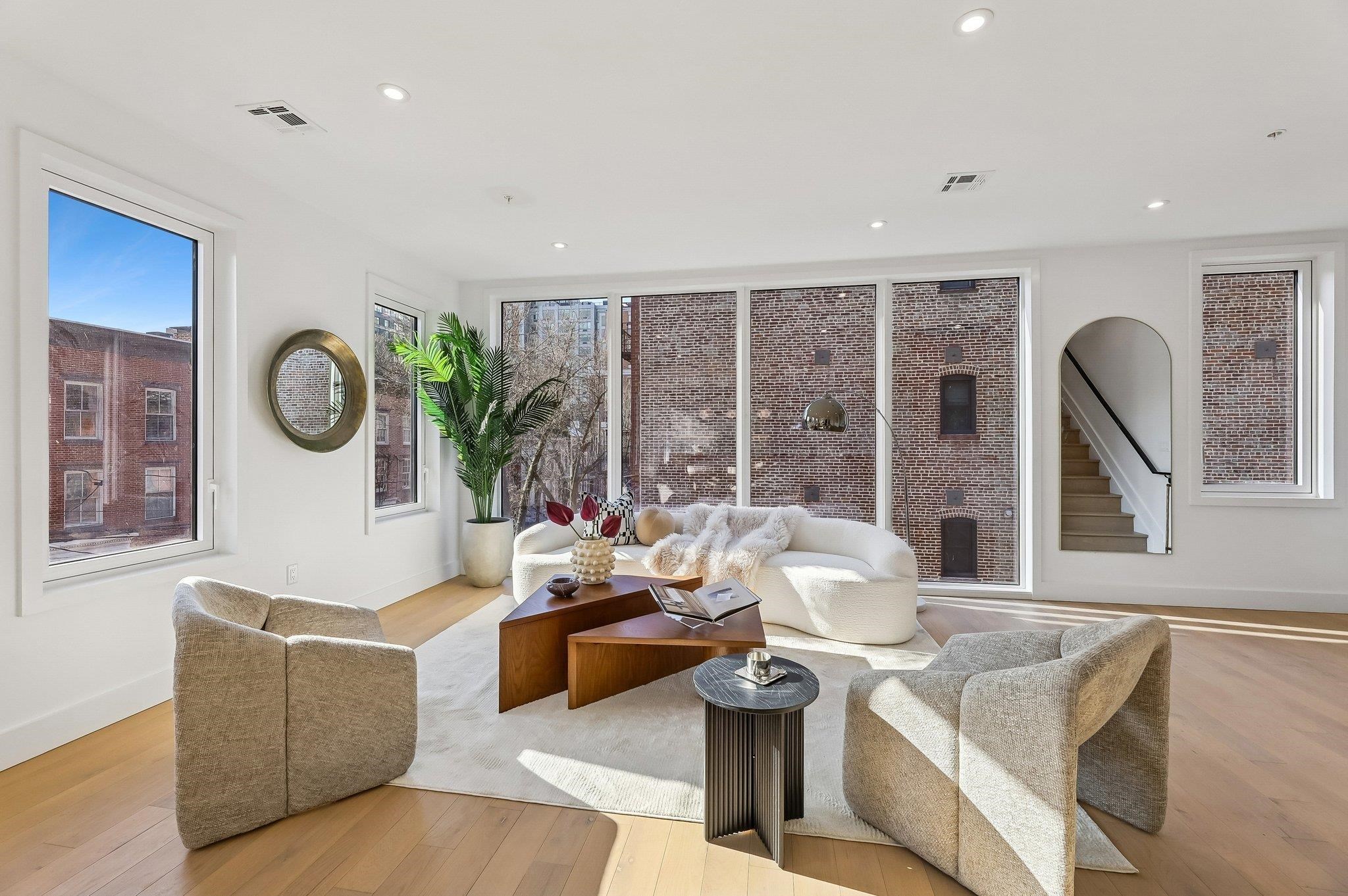 Sprawling Penthouse Duplex with private sky terrace and garage parking in the heart of Paulus Hook! Penthouse C at 215 Warren is a brand NEW CONSTRUCTION, 3 bedroom, 3 full bath stunner offers 2,080 sq. feet of wonderful livability. A gated and private paver walkway leads to the front door of your individual residence. Enter to massive, natural light-filled space, high ceilings, wide plank hardwood floors, architectural lighting, and a full glass curtain wall showcasing the open concept living/dining area! The professional grade kitchen is any chef's dream, with a full suite of paneled Thermador appliances, vented XO range hood, dual tone cabinetry, waterfall edge carrara quartz island, backspash, and counters, and tremendous storage space. A full bath on this living level is perfect for all family and guests alike. Upstairs 3 bedrooms are embraced in light with open S/W exposures over Paulus Hook, while the corner primary suite featuring a custom, walk-in, California closet, and spectacular spa-bath with floor-to-ceiling stone, floating dual sink vanity, and frameless glass shower. The laundry room is located on this level for convenience and features a full-sized, vented W/D. A wide, interior staircase leads to your private sky terrace with panoramic 360 degree views, maintenace free decking, and huge storage closet for all your outdoor toys. The views up here are even more magical and perfect for alfresco dining, reclining, and recharging. Two zone central HVAC, Navien tankless hot water systems, extensive soundproofing, and ultra-luxurious fit and finishes complete the picture. Want more?.....One garage parking space included with purchase. Truly private Brownstone style living with the advantages of new construction quality, and condo ownership ease! Outside your front door awaits 2 PATH stations, NY Waterway ferry, the renowned PS16/Bradford school, fabulous restaurants, Whole Foods Market, shopping, and waterfront promenade this historic district is known for.
