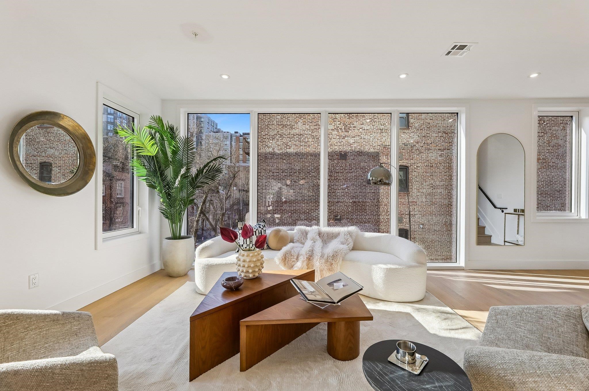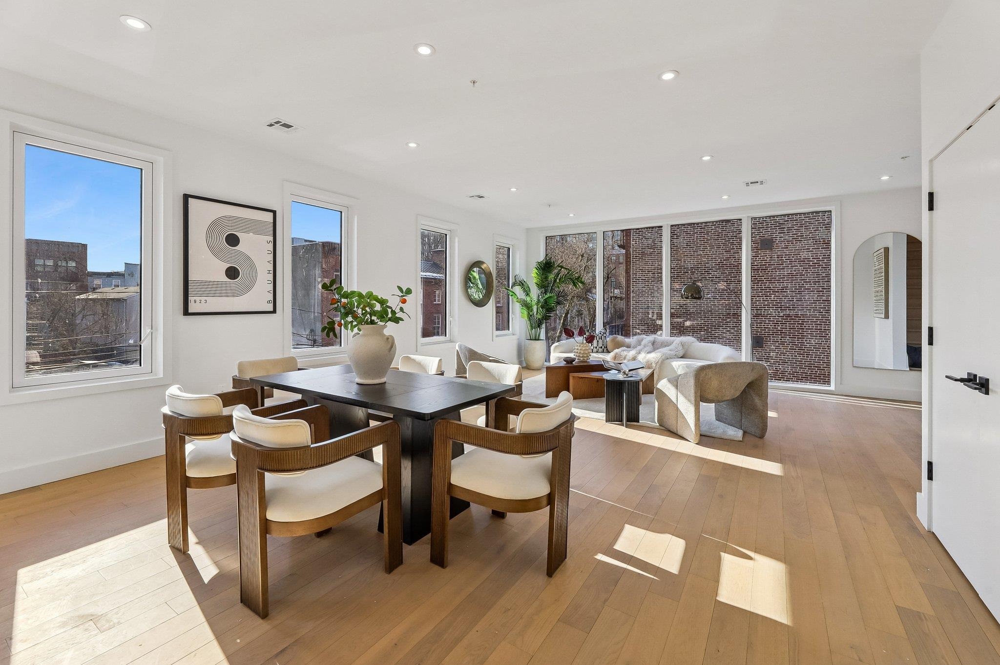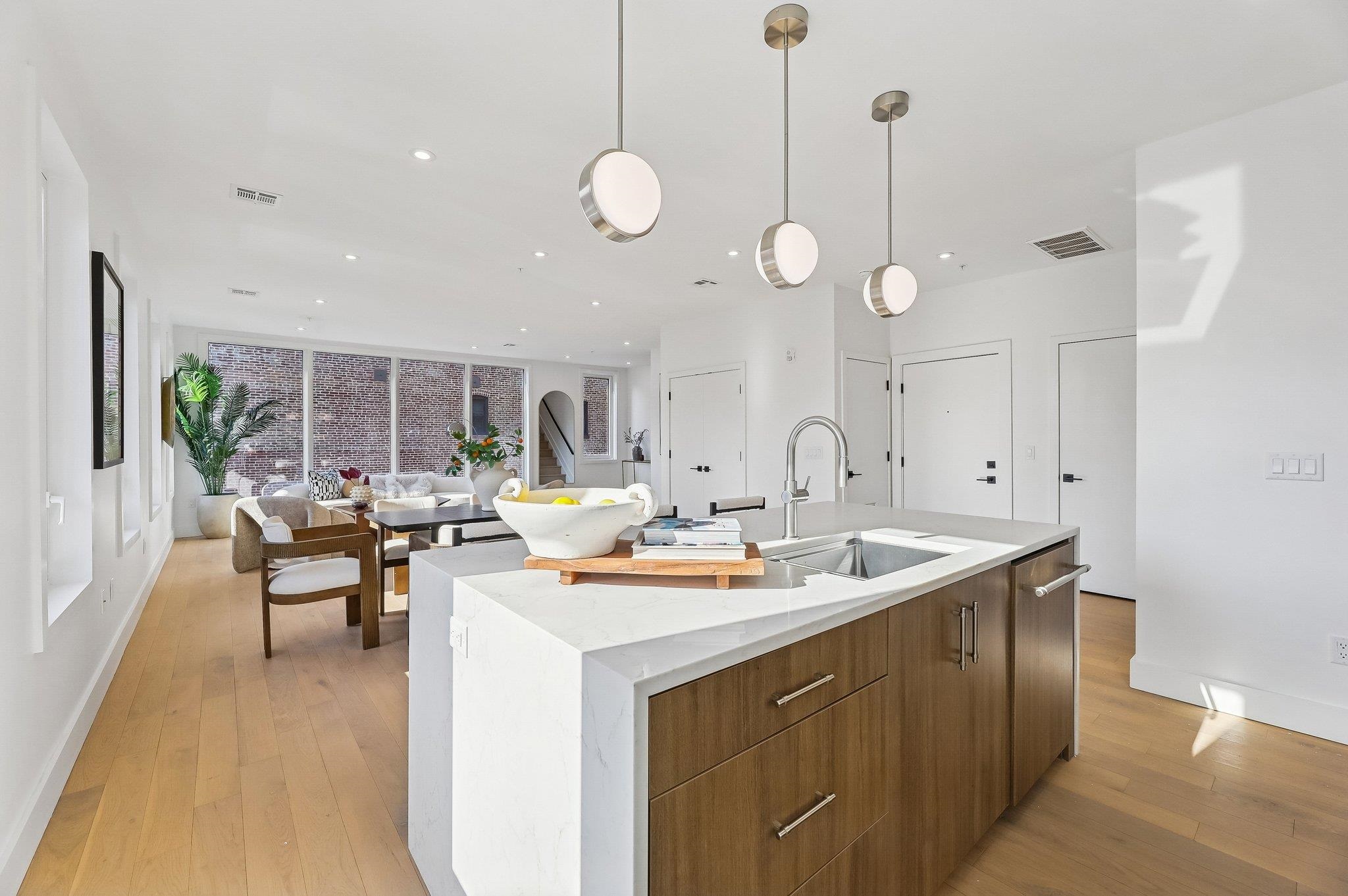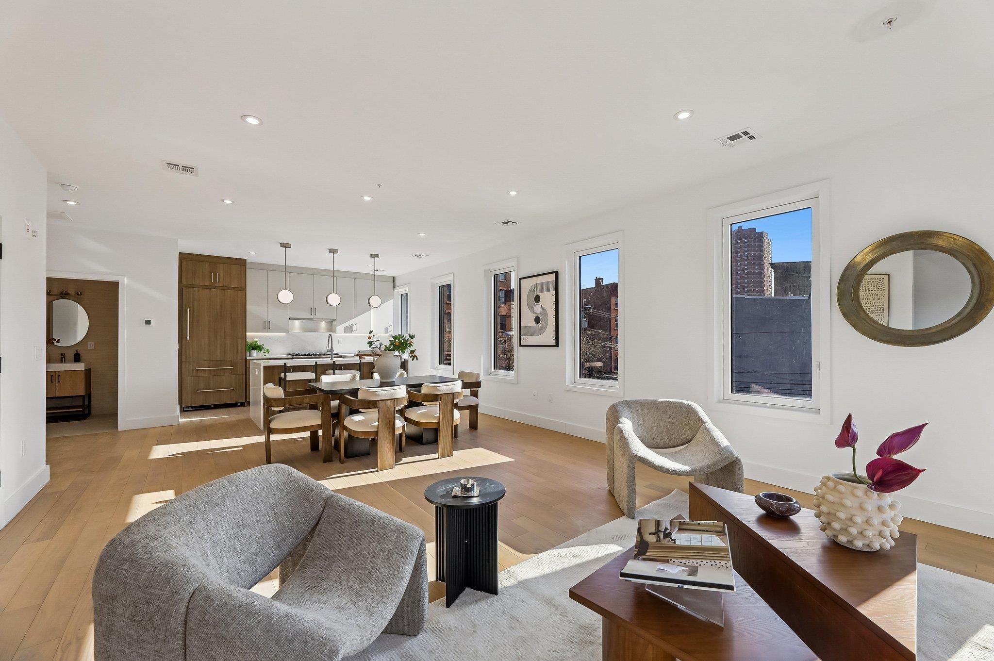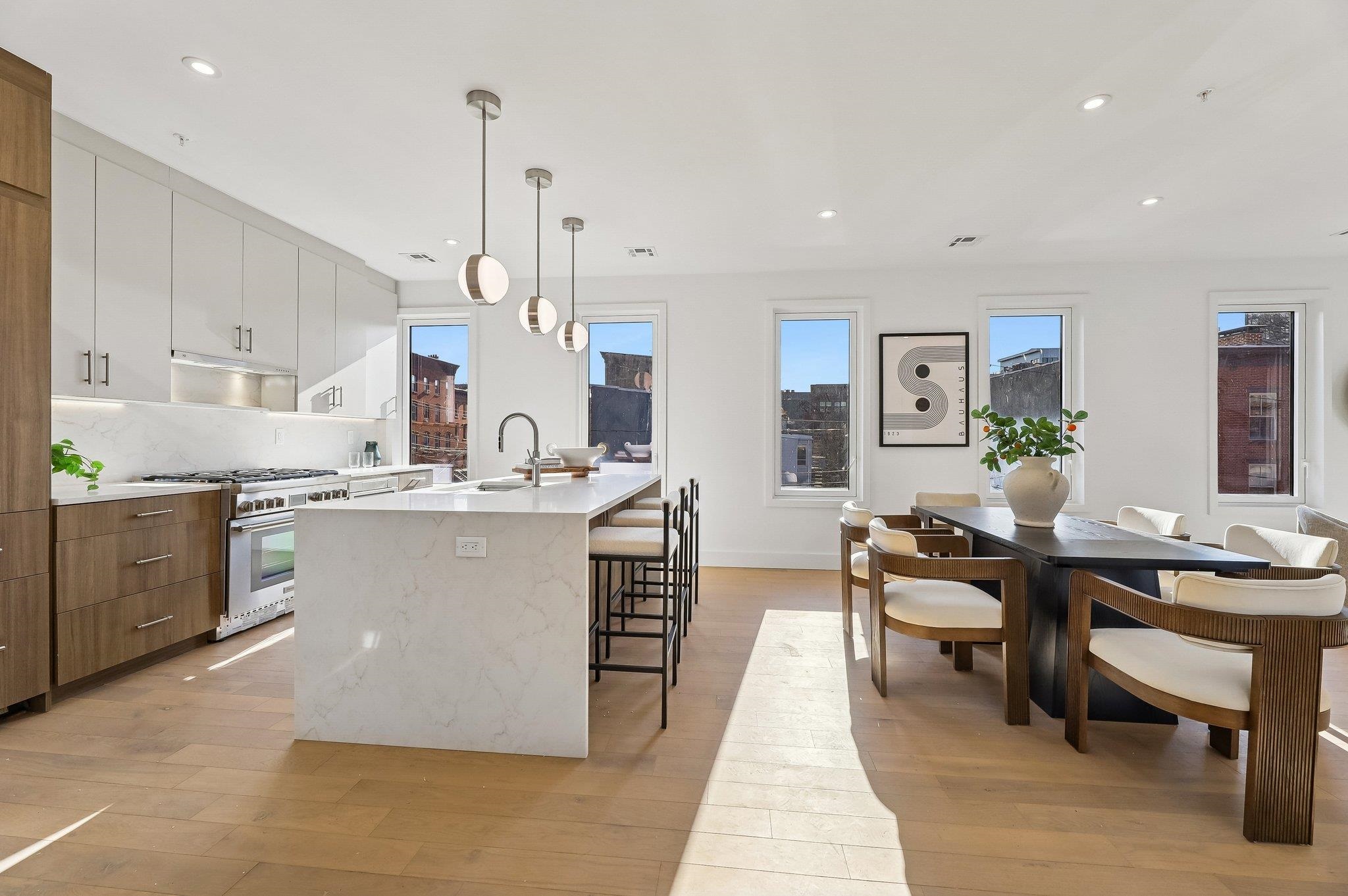 Sprawling Penthouse Duplex with private sky terrace and garage parking in the heart of Paulus Hook! Penthouse C at 215 Warren is a brand NEW CONSTRUCTION, 3 bedroom, 3 full bath stunner offers 2,080 sq. feet of wonderful livability. A gated and private paver walkway leads to the front door of your individual residence. Enter to massive, natural light-filled space, high ceilings, wide plank hardwood floors, architectural lighting, and a full glass curtain wall showcasing the open concept living/dining area! The professional grade kitchen is any chef's dream, with a full suite of paneled Thermador appliances, vented XO range hood, dual tone cabinetry, waterfall edge carrara quartz island, backspash, and counters, and tremendous storage space. A full bath on this living level is perfect for all family and guests alike. Upstairs 3 bedrooms are embraced in light with open S/W exposures over Paulus Hook, while the corner primary suite featuring a custom, walk-in, California closet, and spectacular spa-bath with floor-to-ceiling stone, floating dual sink vanity, and frameless glass shower. The laundry room is located on this level for convenience and features a full-sized, vented W/D. A wide, interior staircase leads to your private sky terrace with panoramic 360 degree views, maintenace free decking, and huge storage closet for all your outdoor toys. The views up here are even more magical and perfect for alfresco dining, reclining, and recharging. Two zone central HVAC, Navien tankless hot water systems, extensive soundproofing, and ultra-luxurious fit and finishes complete the picture. Want more?.....One garage parking space included with purchase. Truly private Brownstone style living with the advantages of new construction quality, and condo ownership ease! Outside your front door awaits 2 PATH stations, NY Waterway ferry, the renowned PS16/Bradford school, fabulous restaurants, Whole Foods Market, shopping, and waterfront promenade this historic district is known for.