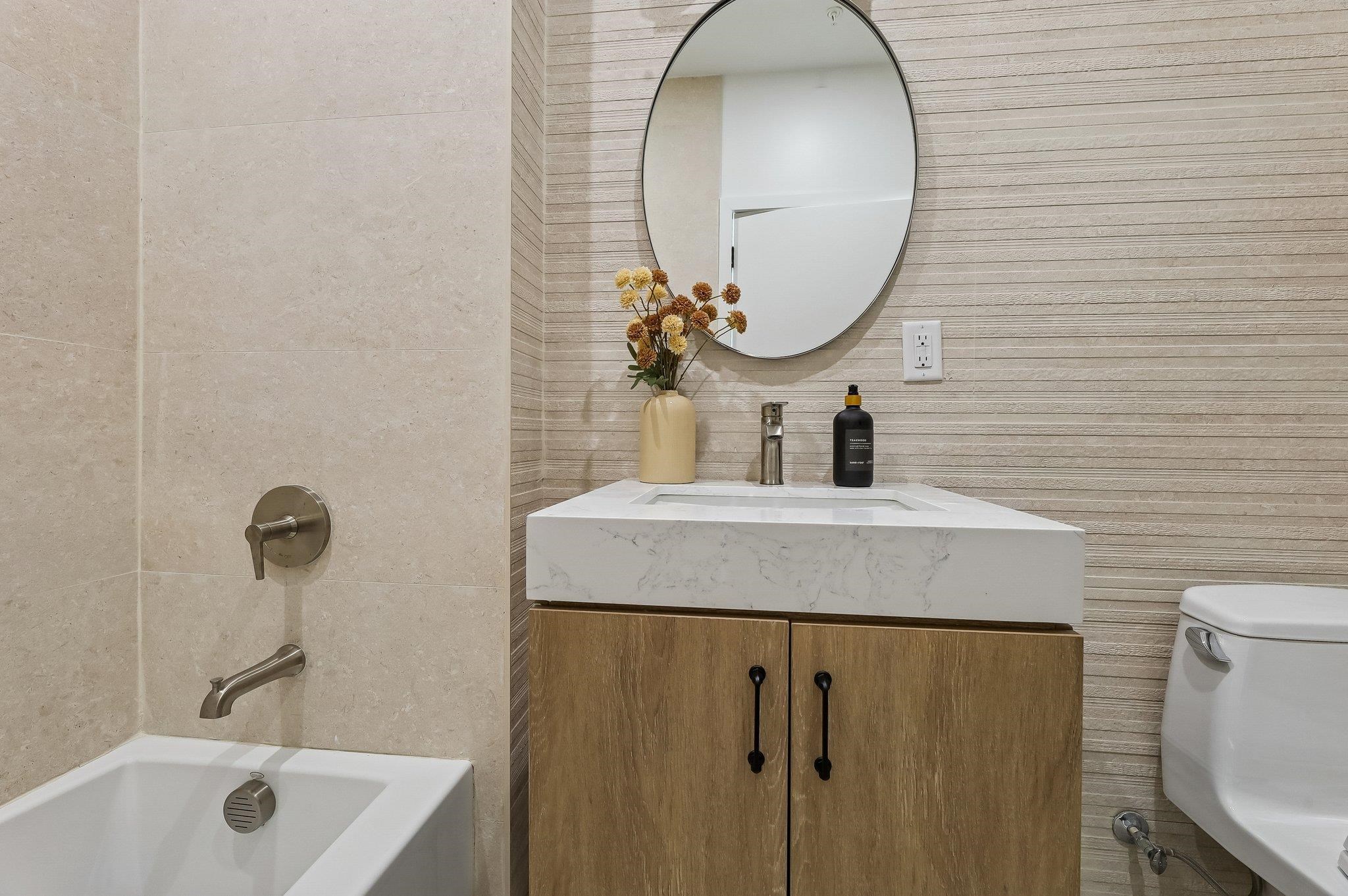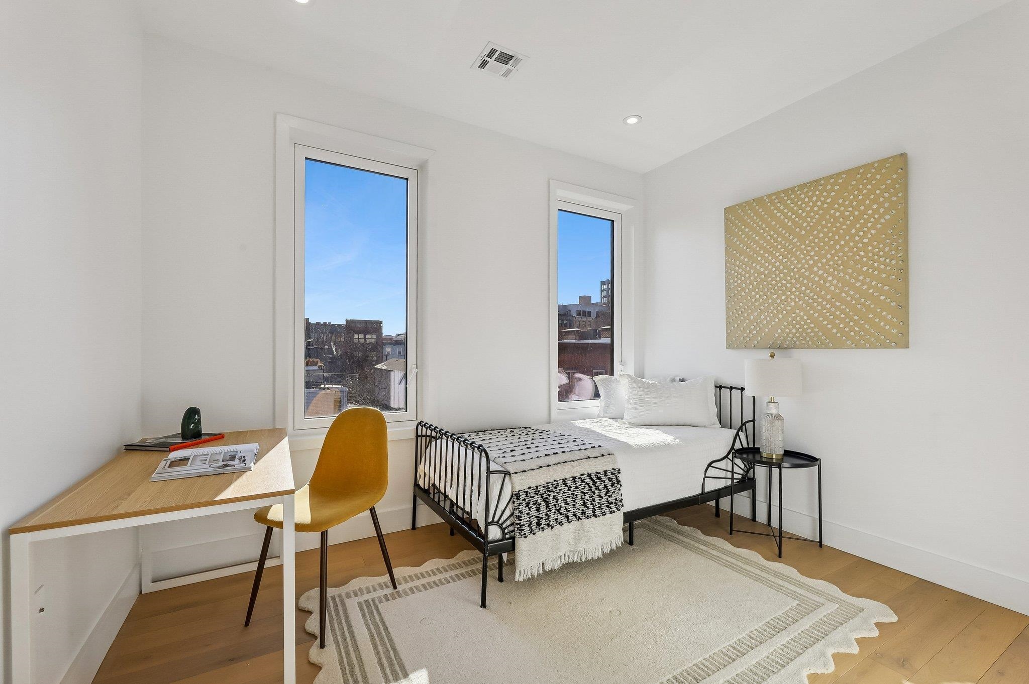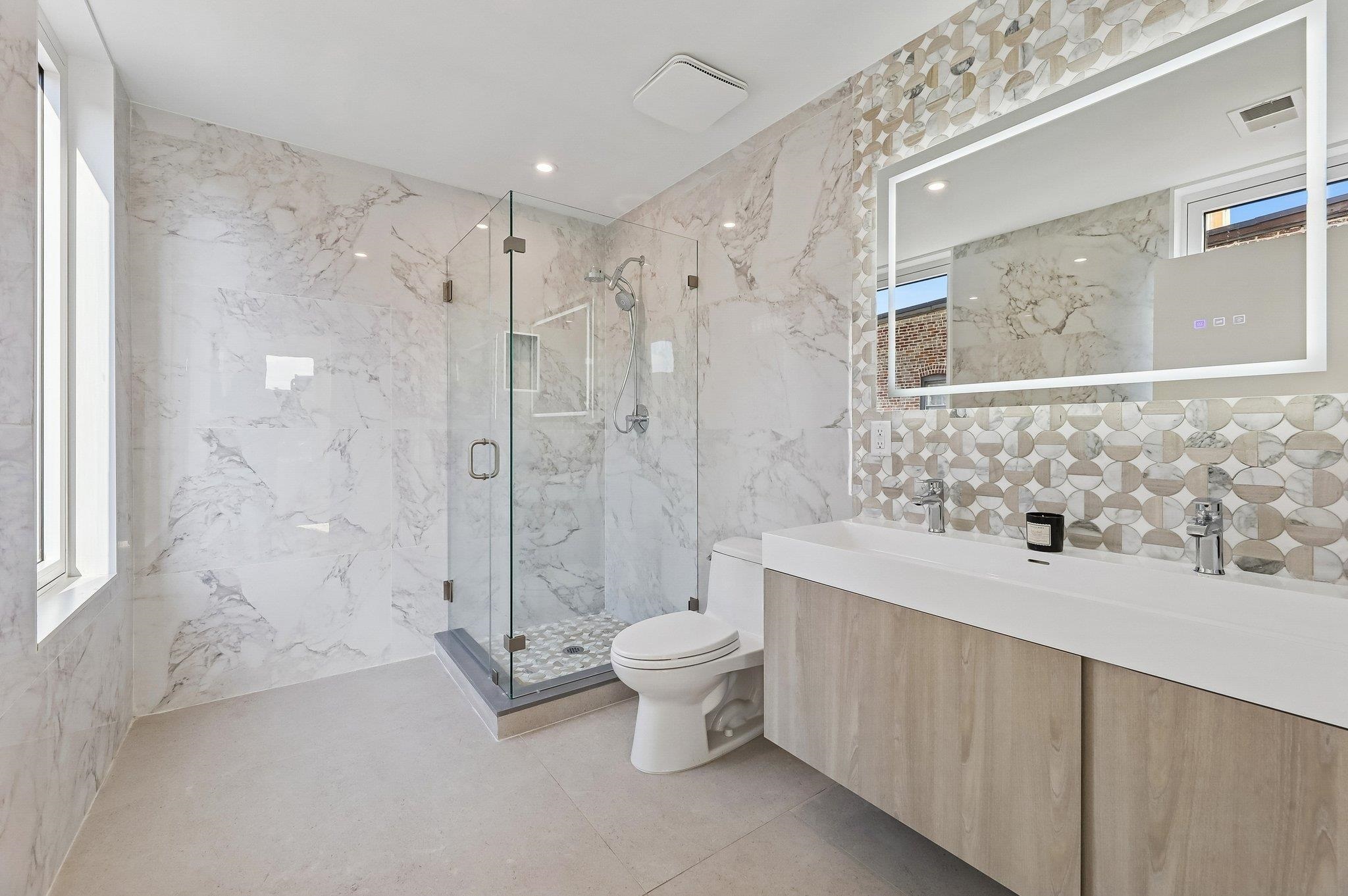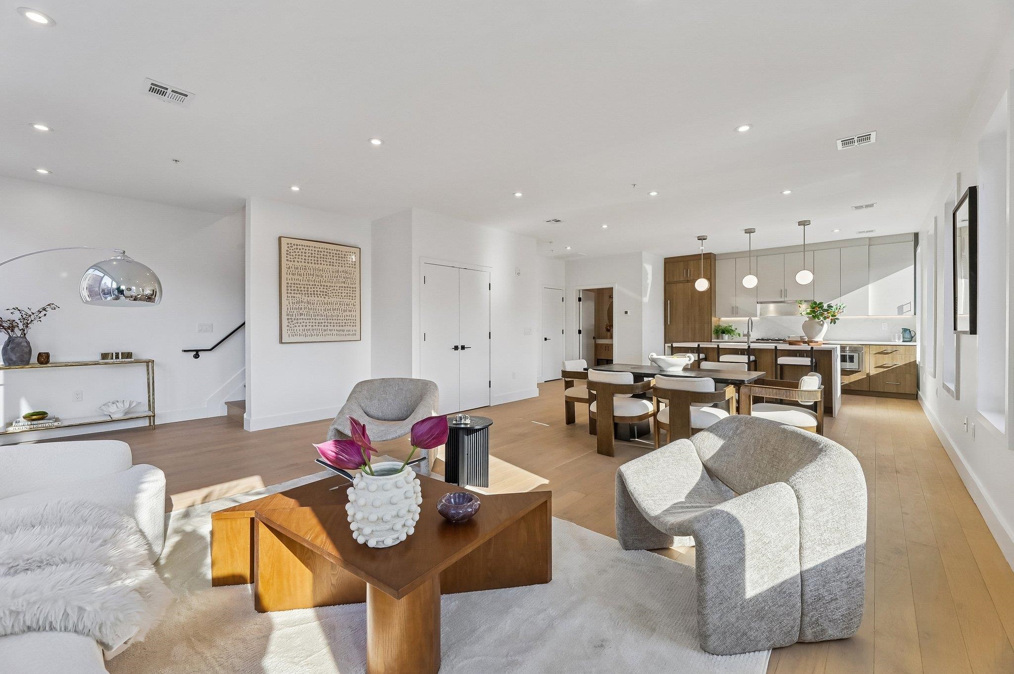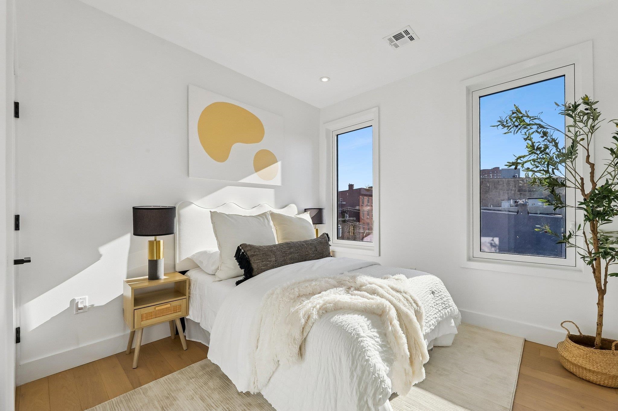 Sprawling Penthouse Duplex with private sky terrace and garage parking in the heart of Paulus Hook! Penthouse C at 215 Warren is a brand NEW CONSTRUCTION, 3 bedroom, 3 full bath stunner offers 2,080 sq. feet of wonderful livability. A gated and private paver walkway leads to the front door of your individual residence. Enter to massive, natural light-filled space, high ceilings, wide plank hardwood floors, architectural lighting, and a full glass curtain wall showcasing the open concept living/dining area! The professional grade kitchen is any chef's dream, with a full suite of paneled Thermador appliances, vented XO range hood, dual tone cabinetry, waterfall edge carrara quartz island, backspash, and counters, and tremendous storage space. A full bath on this living level is perfect for all family and guests alike. Upstairs 3 bedrooms are embraced in light with open S/W exposures over Paulus Hook, while the corner primary suite featuring a custom, walk-in, California closet, and spectacular spa-bath with floor-to-ceiling stone, floating dual sink vanity, and frameless glass shower. The laundry room is located on this level for convenience and features a full-sized, vented W/D. A wide, interior staircase leads to your private sky terrace with panoramic 360 degree views, maintenace free decking, and huge storage closet for all your outdoor toys. The views up here are even more magical and perfect for alfresco dining, reclining, and recharging. Two zone central HVAC, Navien tankless hot water systems, extensive soundproofing, and ultra-luxurious fit and finishes complete the picture. Want more?.....One garage parking space included with purchase. Truly private Brownstone style living with the advantages of new construction quality, and condo ownership ease! Outside your front door awaits 2 PATH stations, NY Waterway ferry, the renowned PS16/Bradford school, fabulous restaurants, Whole Foods Market, shopping, and waterfront promenade this historic district is known for.