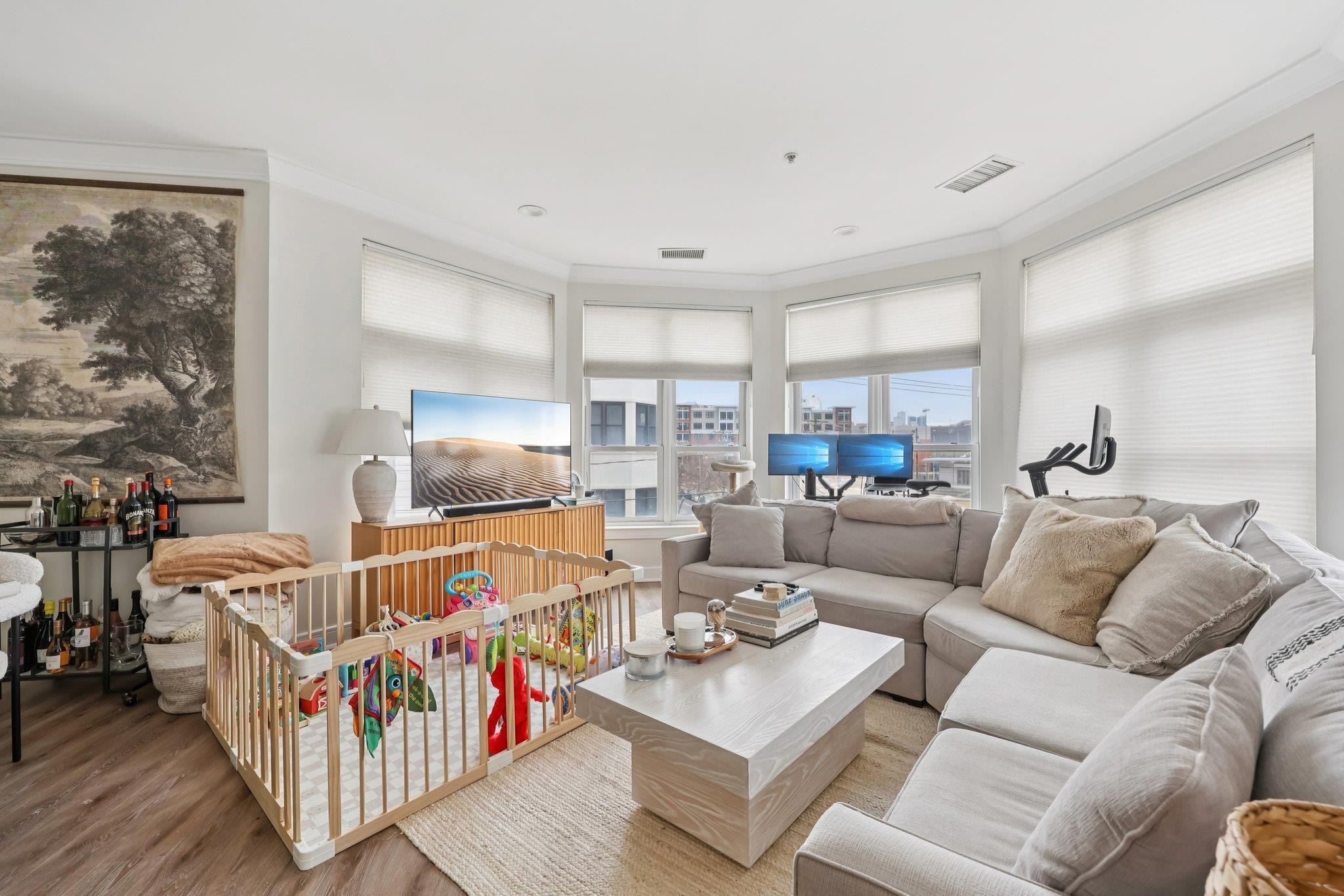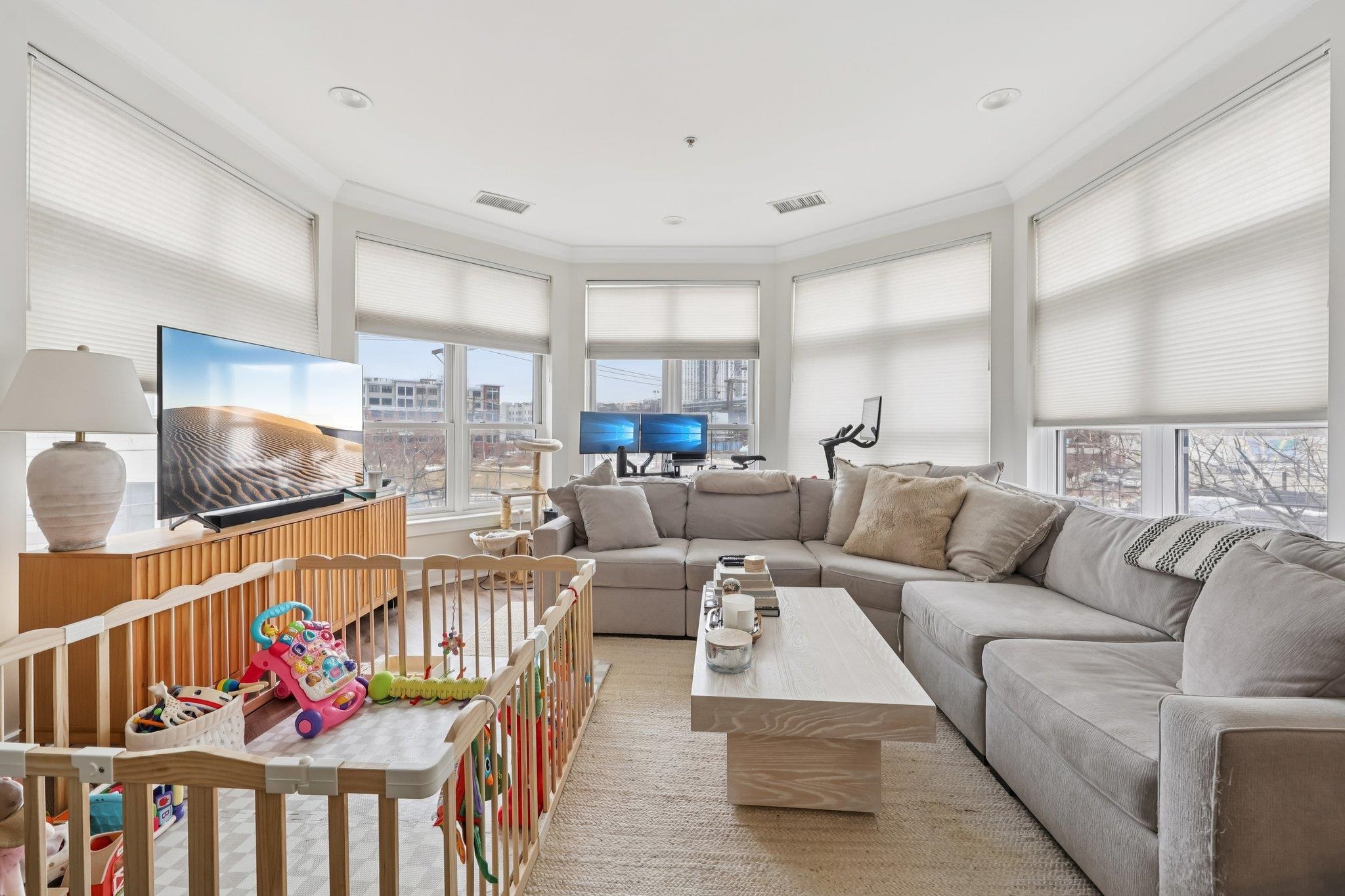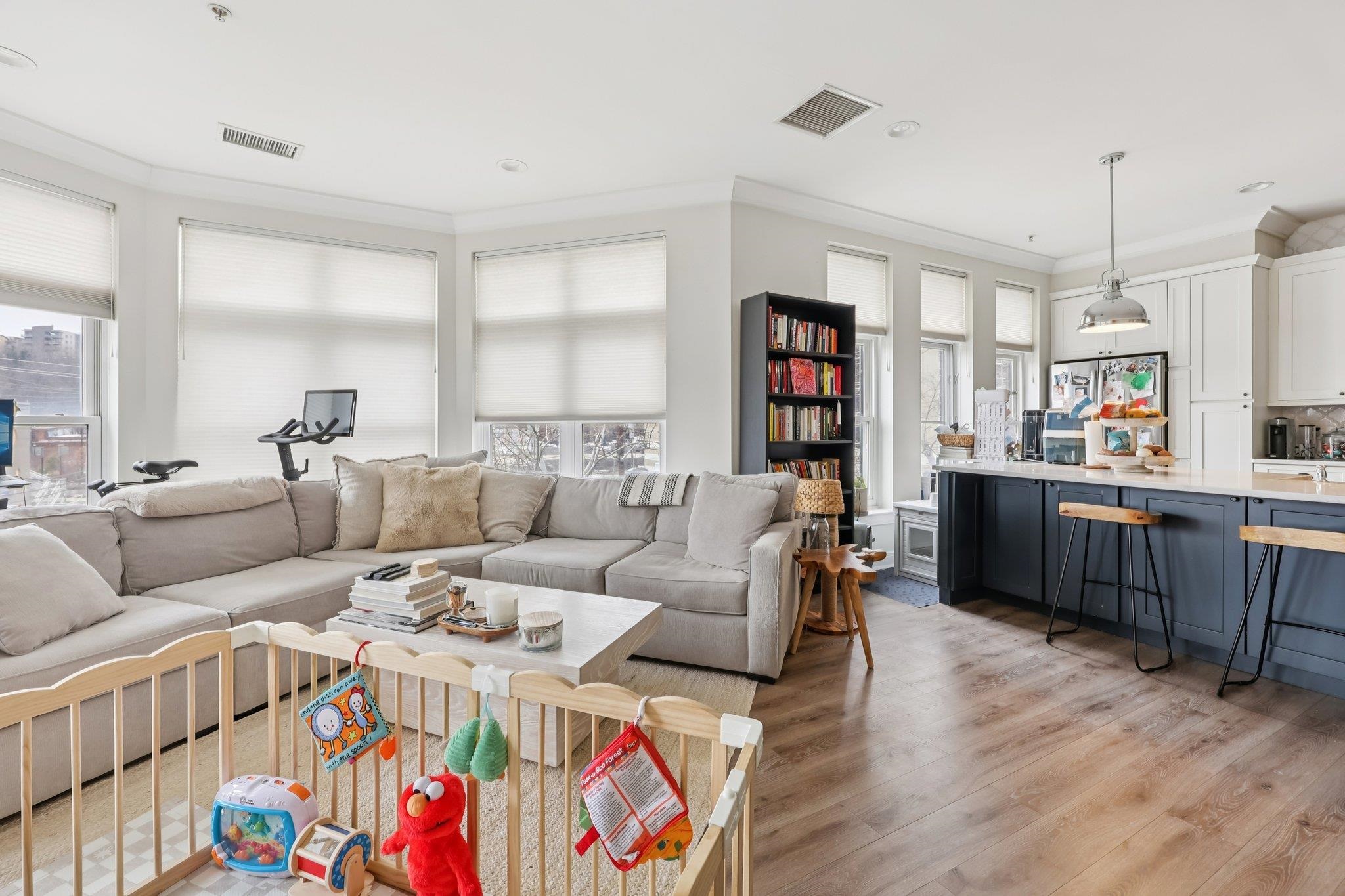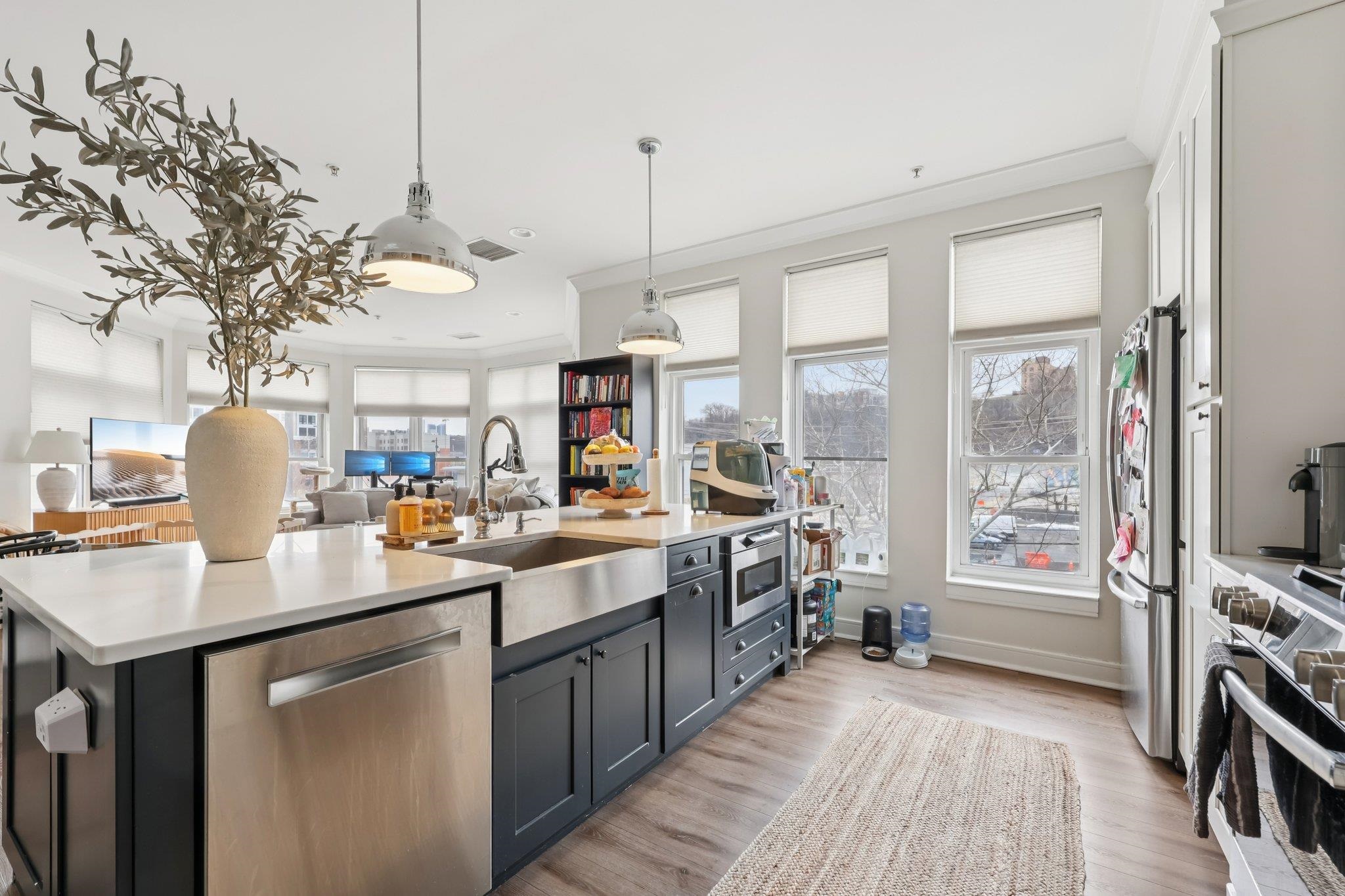 Fully renovated in 2019/20, this exceptional 1,161 SF Upper Grand home is the largest two-bedroom, two-bathroom floor plan in the building. This premiere residence features 17 south- and west-facing windows overlooking Hoboken’s largest park and is filled with all-day sun and beautiful sunsets. The interior showcases premium custom millwork, including 7-foot solid wood doors, modern crown and baseboard moldings, and indestructible NuWood wide-plank flooring. The custom kitchen is a standout, boasting a massive 10-foot island with dual-sided storage, stainless steel appliances, Shaker-style cabinetry with a pantry, quartz countertops, and stylish pendant lighting. The primary suite offers a tranquil escape with a luxurious bathroom featuring timeless stone details. A fun and fashionable second bathroom features a deep soaking tub, custom vanity, and contemporary tilework. Additional upgrades include a recently replaced HVAC system with a Nest thermostat, a water heater, and an LG Laundry Tower. This home purchase includes a full-size garage parking spot (#80). 1300 Grand Street (also known as 1301 Adams Street) is a concrete-and-steel constructed building featuring two lobbies, two elevators, a fitness center, a beautiful courtyard, and a strong HOA. Residents enjoy easy access to the bus, ferry, highways, and Hoboken’s free HOP shuttle to the PATH. The vibrant neighborhood features playgrounds, Trader Joe’s, a seasonal farmer’s market, a dog park, and numerous shops and restaurants. The North End of the Mile Square is where everything is happening.