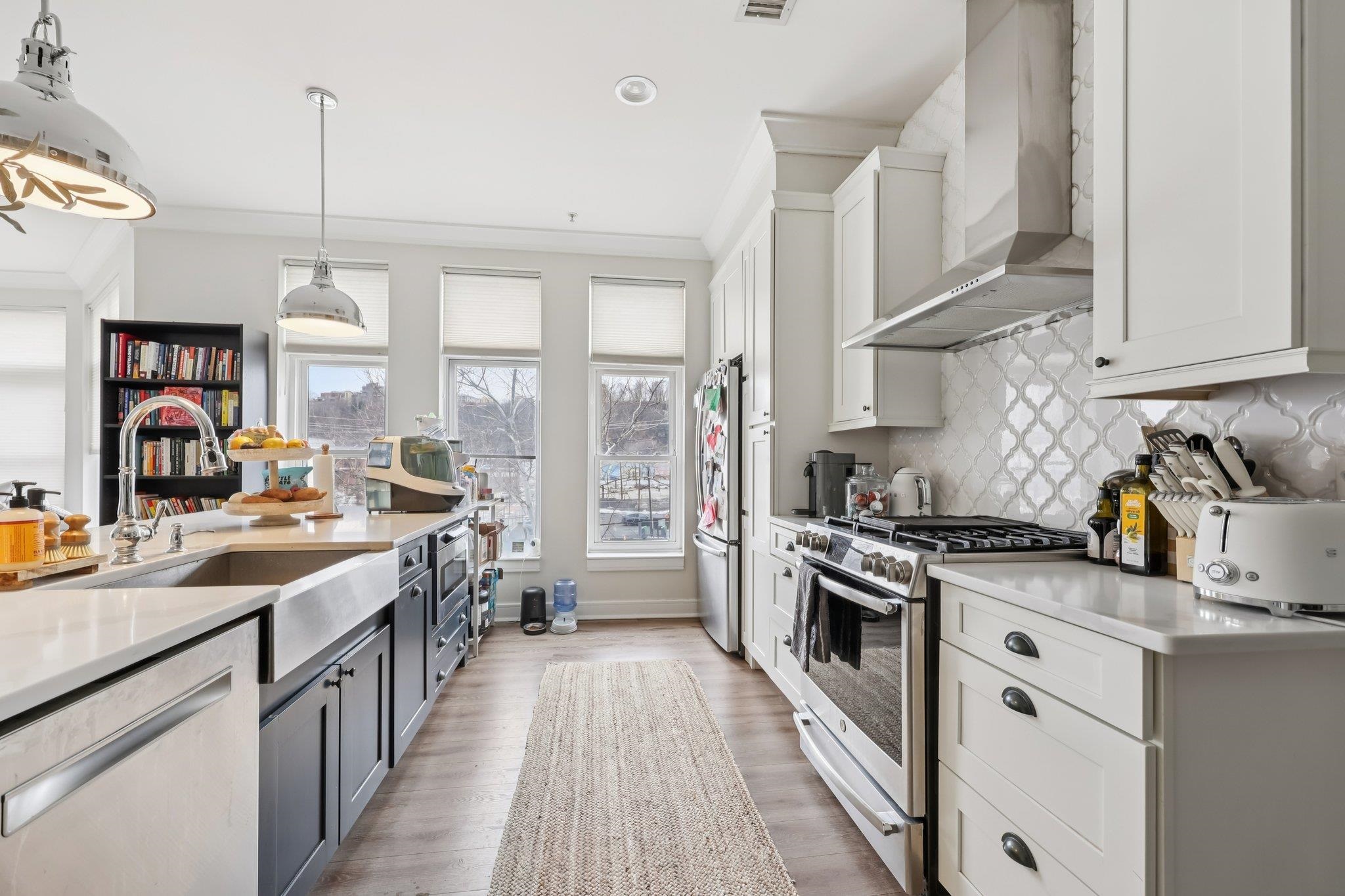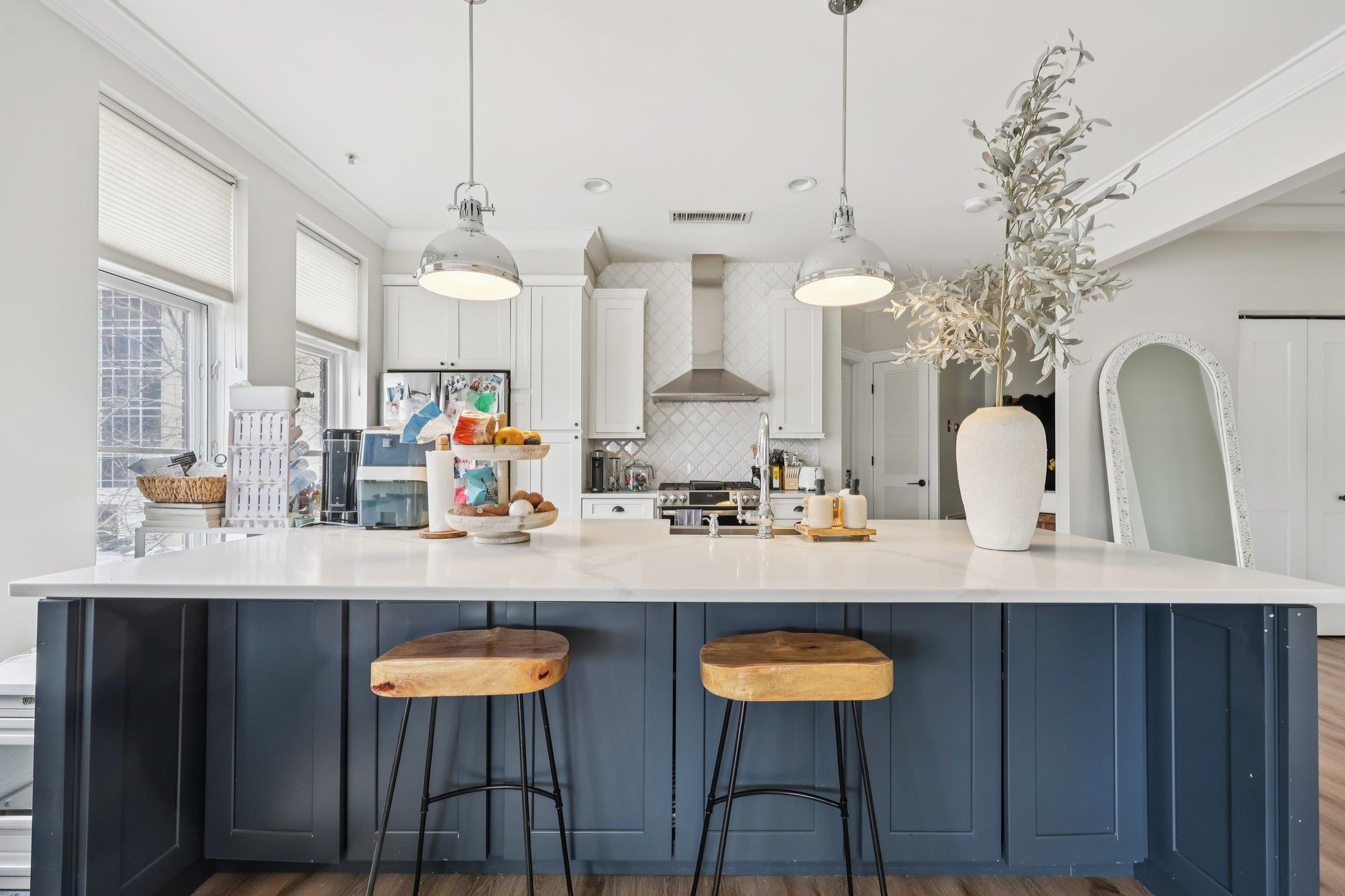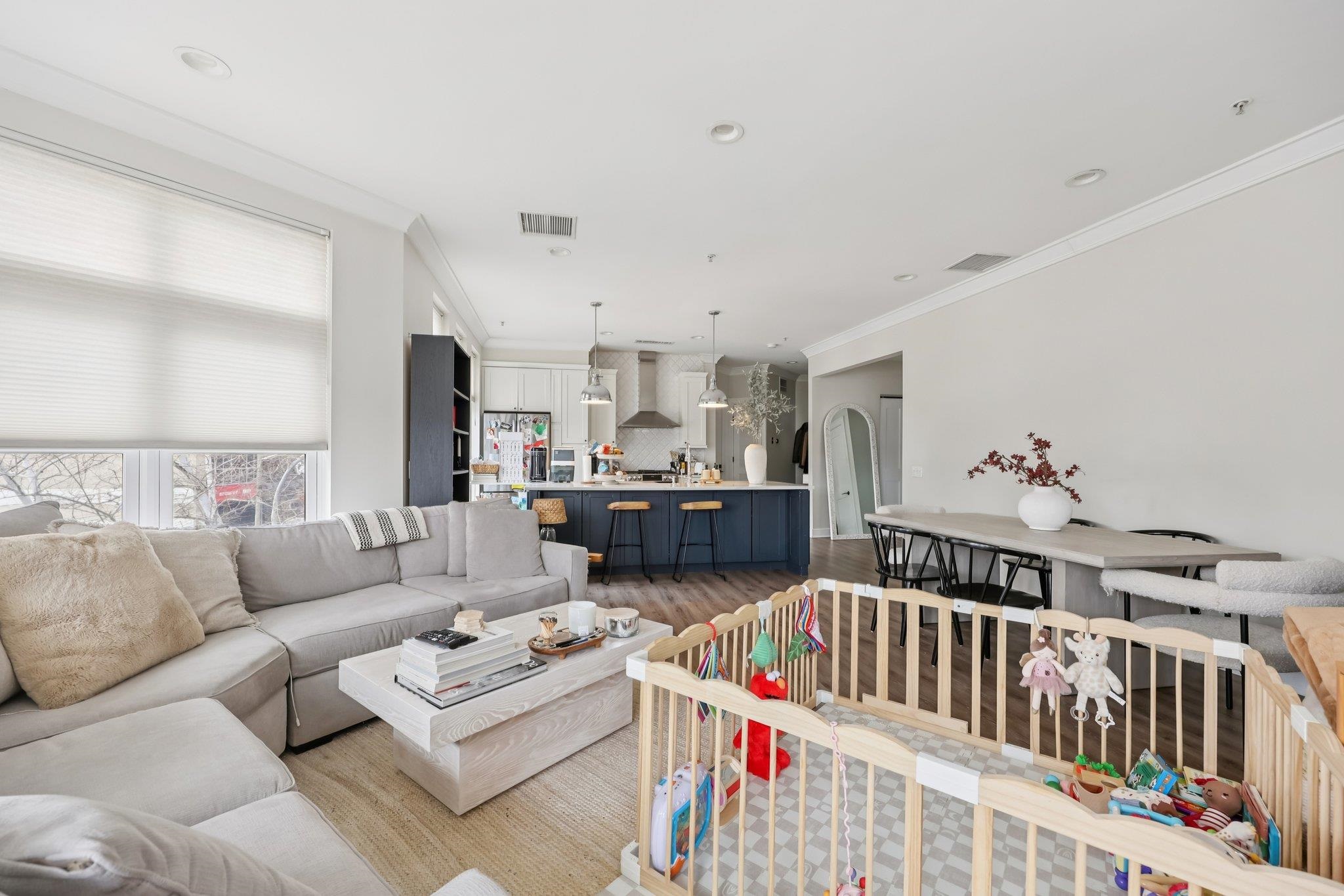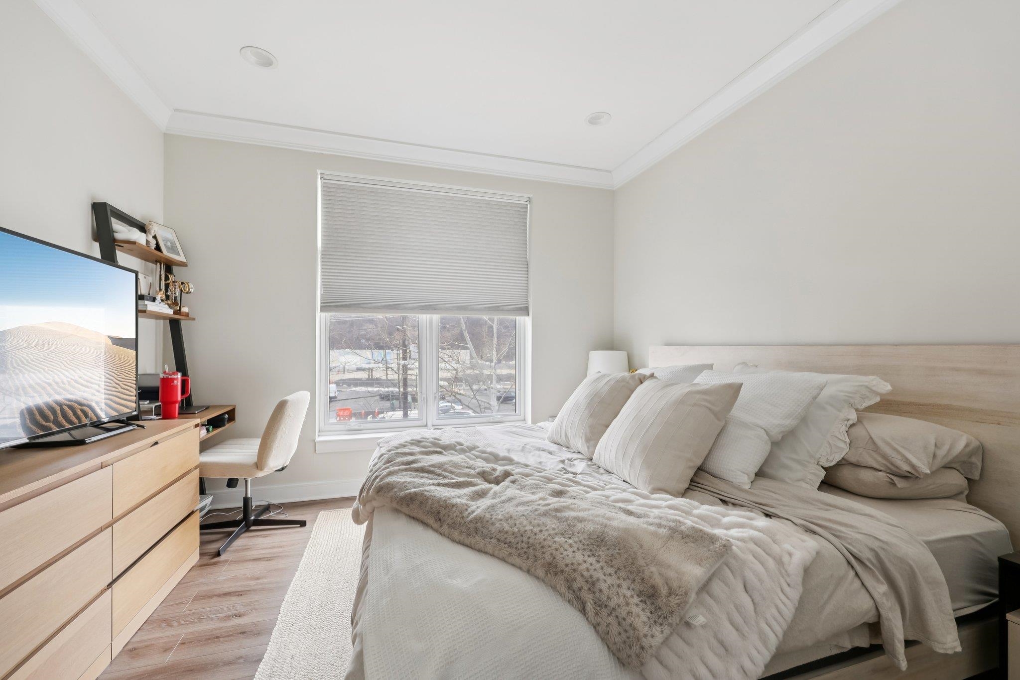 Fully renovated in 2019/20, this exceptional 1,161 SF Upper Grand home is the largest two-bedroom, two-bathroom floor plan in the building. This premiere residence features 17 south- and west-facing windows overlooking Hoboken’s largest park and is filled with all-day sun and beautiful sunsets. The interior showcases premium custom millwork, including 7-foot solid wood doors, modern crown and baseboard moldings, and indestructible NuWood wide-plank flooring. The custom kitchen is a standout, boasting a massive 10-foot island with dual-sided storage, stainless steel appliances, Shaker-style cabinetry with a pantry, quartz countertops, and stylish pendant lighting. The primary suite offers a tranquil escape with a luxurious bathroom featuring timeless stone details. A fun and fashionable second bathroom features a deep soaking tub, custom vanity, and contemporary tilework. Additional upgrades include a recently replaced HVAC system with a Nest thermostat, a water heater, and an LG Laundry Tower. This home purchase includes a full-size garage parking spot (#80). 1300 Grand Street (also known as 1301 Adams Street) is a concrete-and-steel constructed building featuring two lobbies, two elevators, a fitness center, a beautiful courtyard, and a strong HOA. Residents enjoy easy access to the bus, ferry, highways, and Hoboken’s free HOP shuttle to the PATH. The vibrant neighborhood features playgrounds, Trader Joe’s, a seasonal farmer’s market, a dog park, and numerous shops and restaurants. The North End of the Mile Square is where everything is happening.