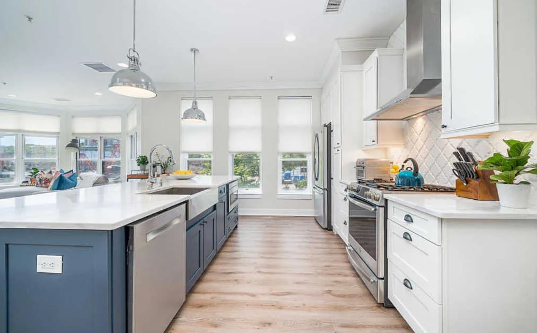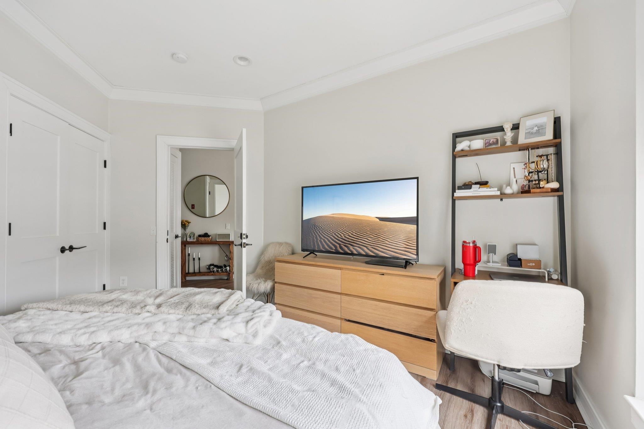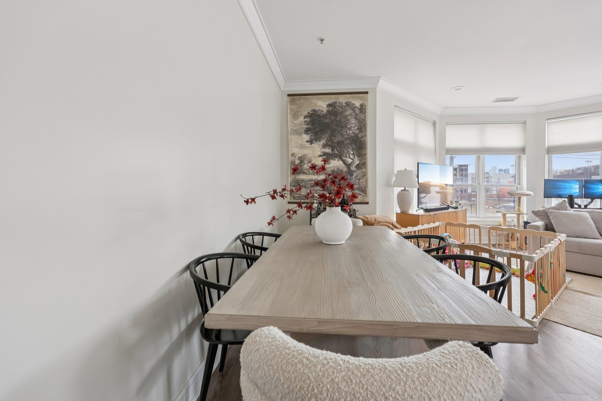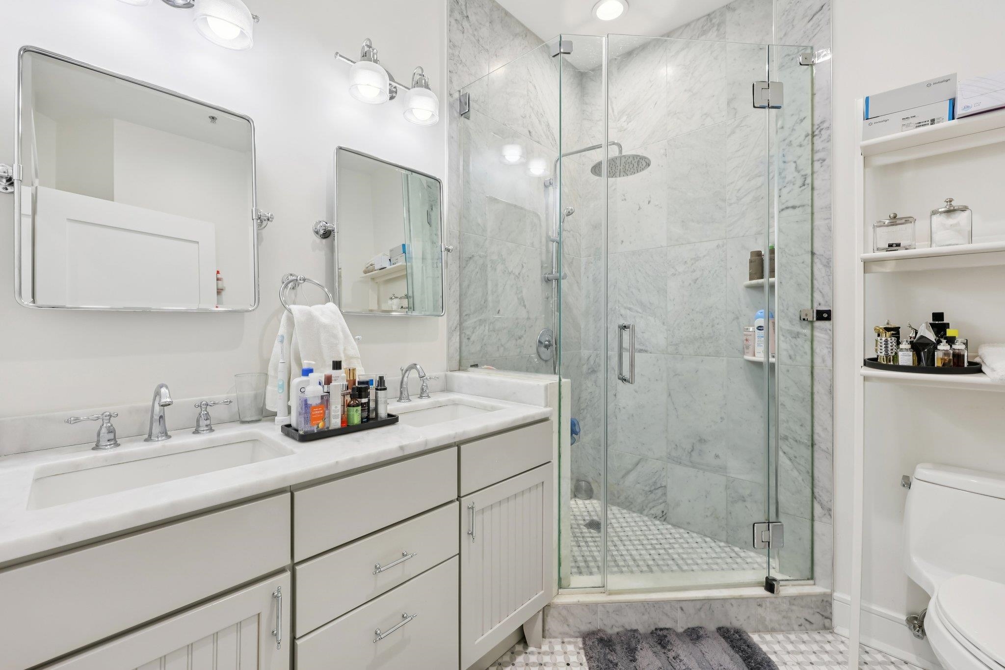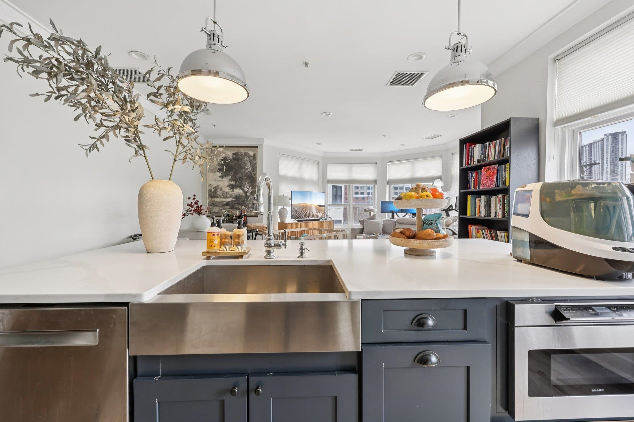 Fully renovated in 2019/20, this exceptional 1,161 SF Upper Grand home is the largest two-bedroom, two-bathroom floor plan in the building. This premiere residence features 17 south- and west-facing windows overlooking Hoboken’s largest park and is filled with all-day sun and beautiful sunsets. The interior showcases premium custom millwork, including 7-foot solid wood doors, modern crown and baseboard moldings, and indestructible NuWood wide-plank flooring. The custom kitchen is a standout, boasting a massive 10-foot island with dual-sided storage, stainless steel appliances, Shaker-style cabinetry with a pantry, quartz countertops, and stylish pendant lighting. The primary suite offers a tranquil escape with a luxurious bathroom featuring timeless stone details. A fun and fashionable second bathroom features a deep soaking tub, custom vanity, and contemporary tilework. Additional upgrades include a recently replaced HVAC system with a Nest thermostat, a water heater, and an LG Laundry Tower. This home purchase includes a full-size garage parking spot (#80). 1300 Grand Street (also known as 1301 Adams Street) is a concrete-and-steel constructed building featuring two lobbies, two elevators, a fitness center, a beautiful courtyard, and a strong HOA. Residents enjoy easy access to the bus, ferry, highways, and Hoboken’s free HOP shuttle to the PATH. The vibrant neighborhood features playgrounds, Trader Joe’s, a seasonal farmer’s market, a dog park, and numerous shops and restaurants. The North End of the Mile Square is where everything is happening.