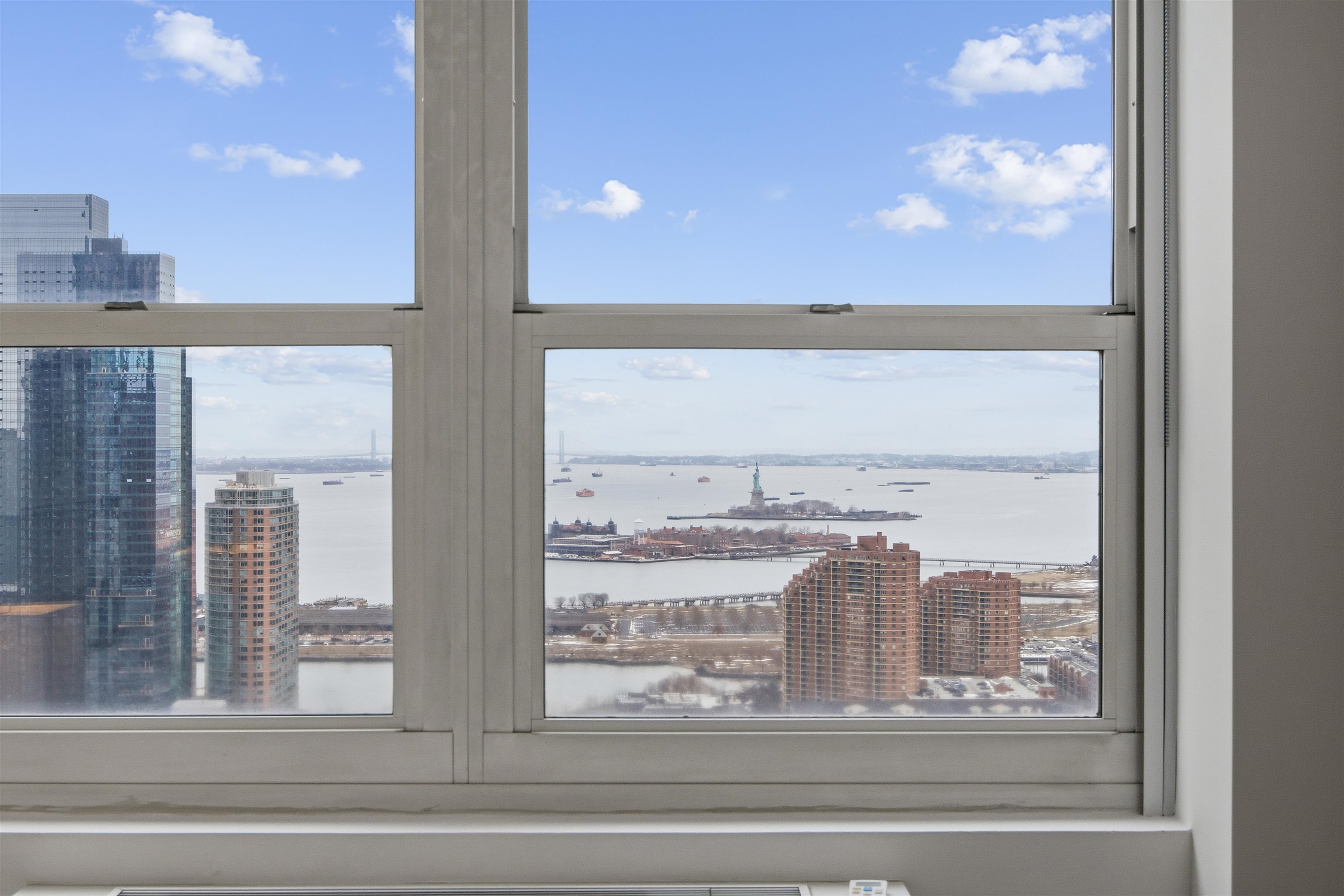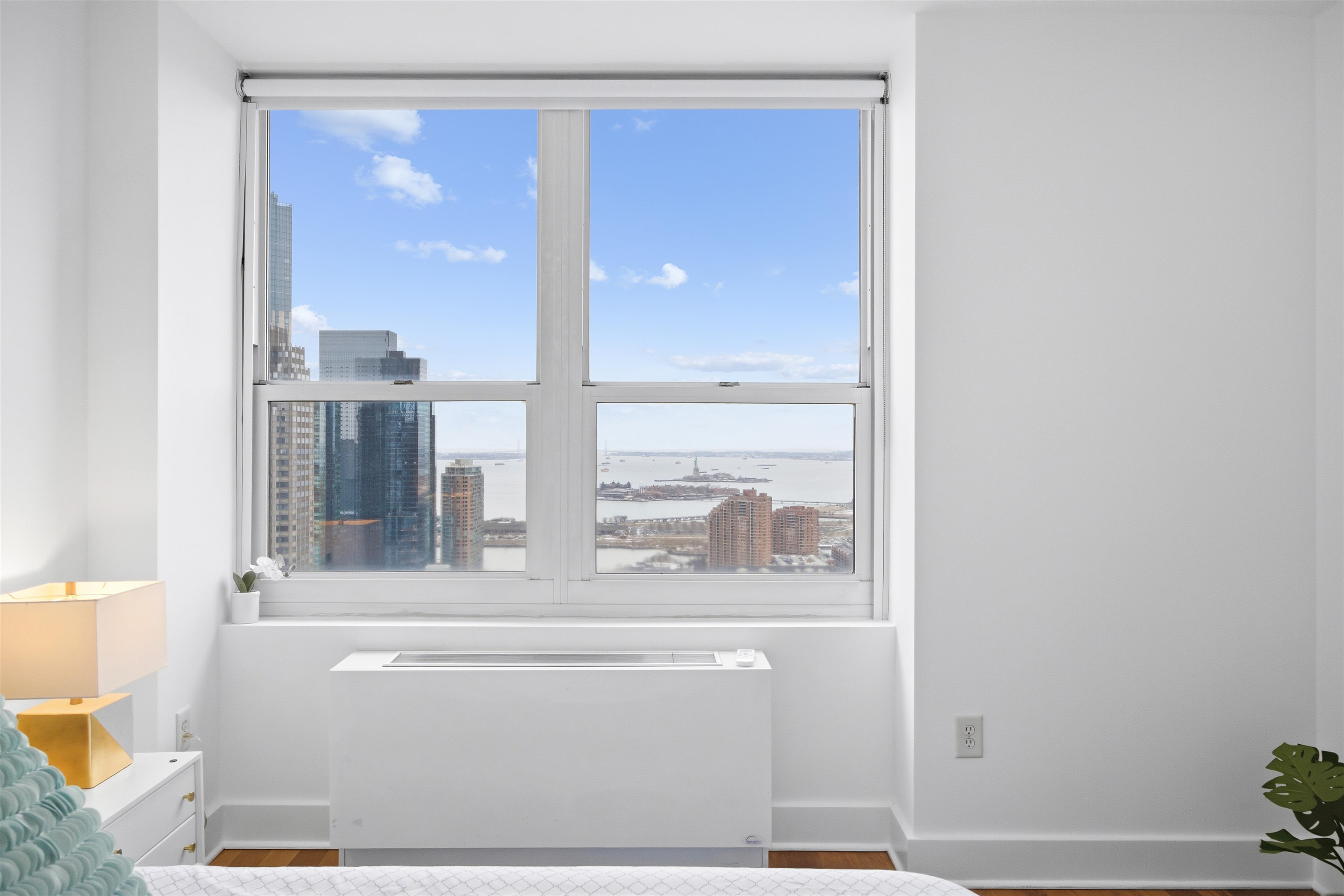Perched on the 43rd Floor, this stunning South Facing home offers breathtaking views. Flooded with natural sunlight throughout the day. A spacious open layout with no wasted space. A gourmet kitchen featuring stainless steel appliances, granite countertops, tiled backsplash and a large breakfast bar. Great closet space with a coat closet at the entrance, closet in the hallway, walk-in closet in the bedroom and a large linen closet in the bathroom. Move-in ready with newly refinished Hardwood floors and updated bathroom vanity. Enjoy the convenience of an in-unit washer/dryer. World Class Amenities include: 24-hour concierge, state-of-the-art fitness center, multiple resident lounges, game room, virtual golf, heated outdoor pool, jacuzzi, steam room, sauna, plus much more! Conveniently located between the Newport, Grove and Exchange PATH!