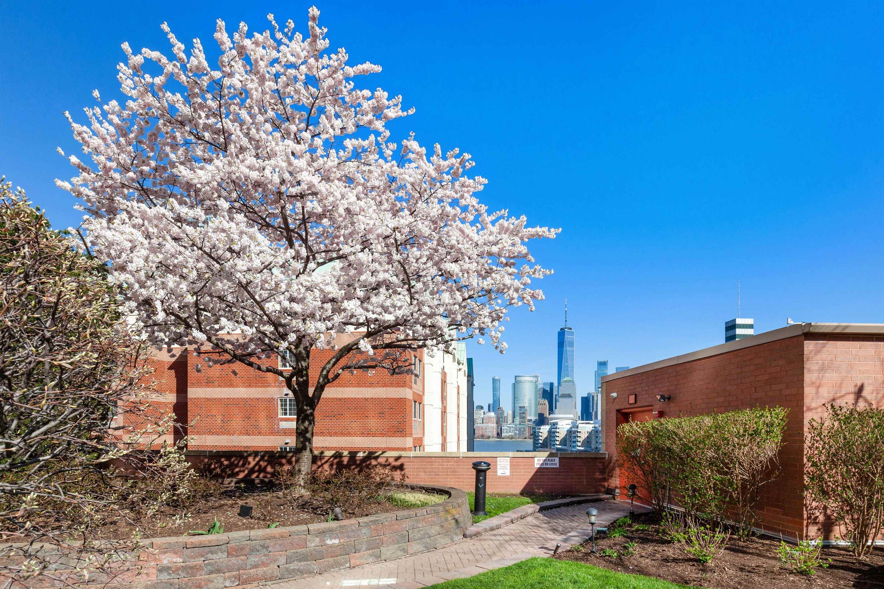 Enjoy spectacular sunset views from your private terrace in this sun-filled corner 2-bed 2-bath home at The Portofino, showcasing panoramic views of the New York City skyline and the Hudson River. The home features a modern open-concept kitchen with newer stainless steel appliances and ample cabinetry, flowing seamlessly into a spacious living and dining area—perfect for relaxing or entertaining. Additional highlights include newly upgraded flooring, renovated bathrooms, and a generously sized primary suite. Located on a quiet, tree-lined street, this luxury waterfront condominium offers an impressive suite of amenities including a heated outdoor pool, well equipped fitness center, residents’ lounge, co-working spaces, game room, and children’s playroom. The HOA fee covers water, internet, and DirecTV, providing added convenience. Ideally situated near grocery stores and major transportation options to NYC, and just moments from the restaurants, cafés, and the vibrant nightlife of Downtown Jersey City. This home offers the perfect blend of comfort, luxury, and city living. One parking spot included.