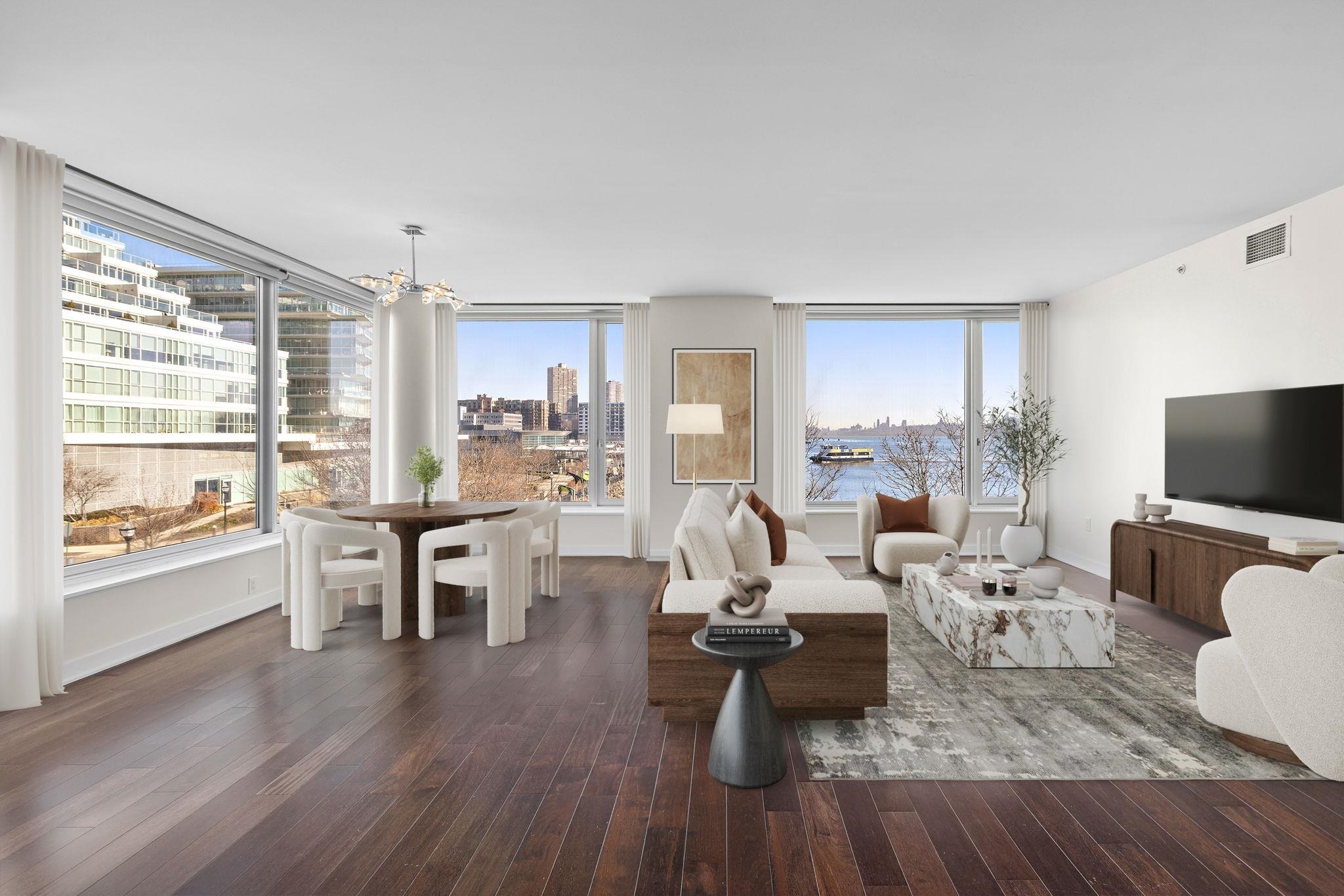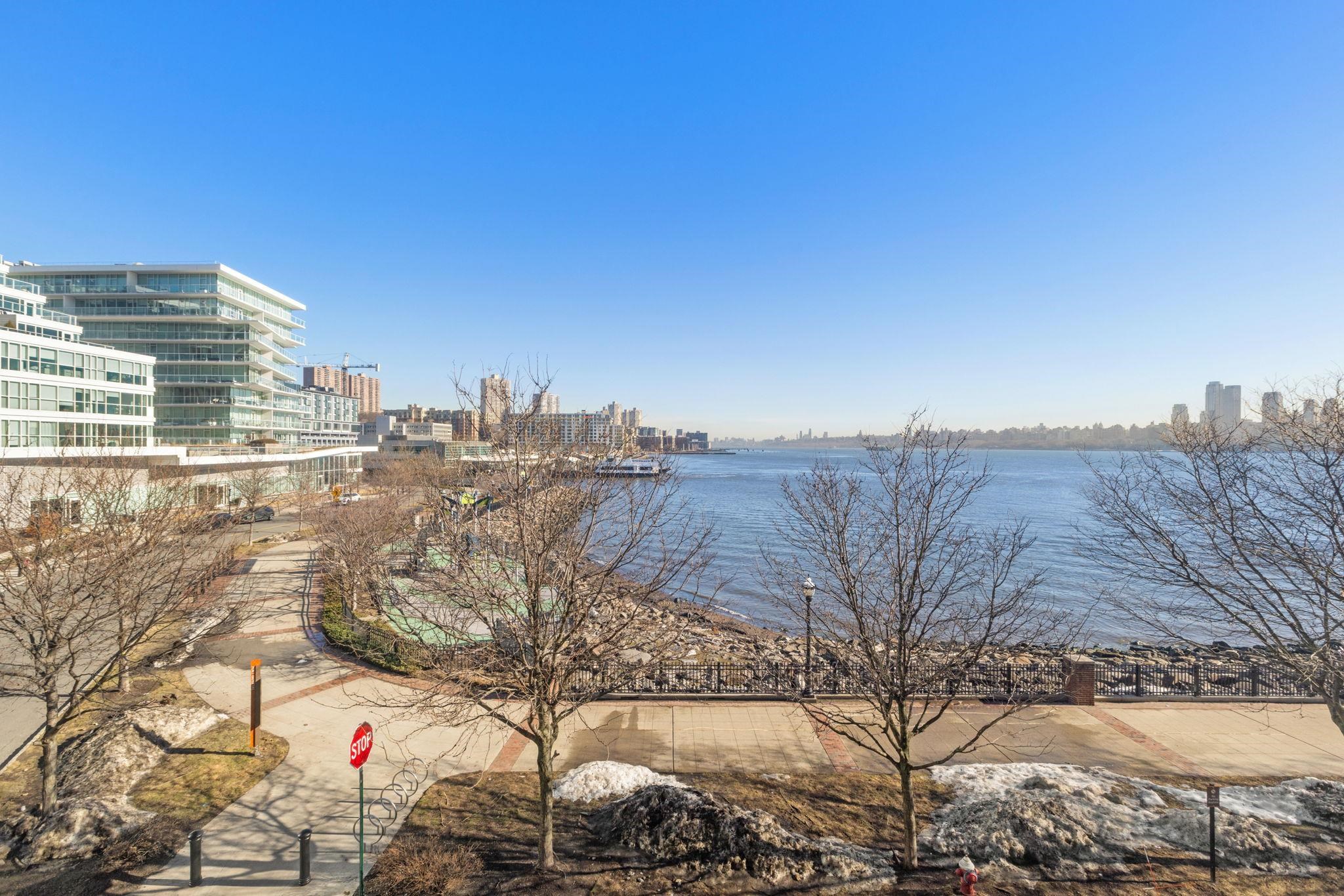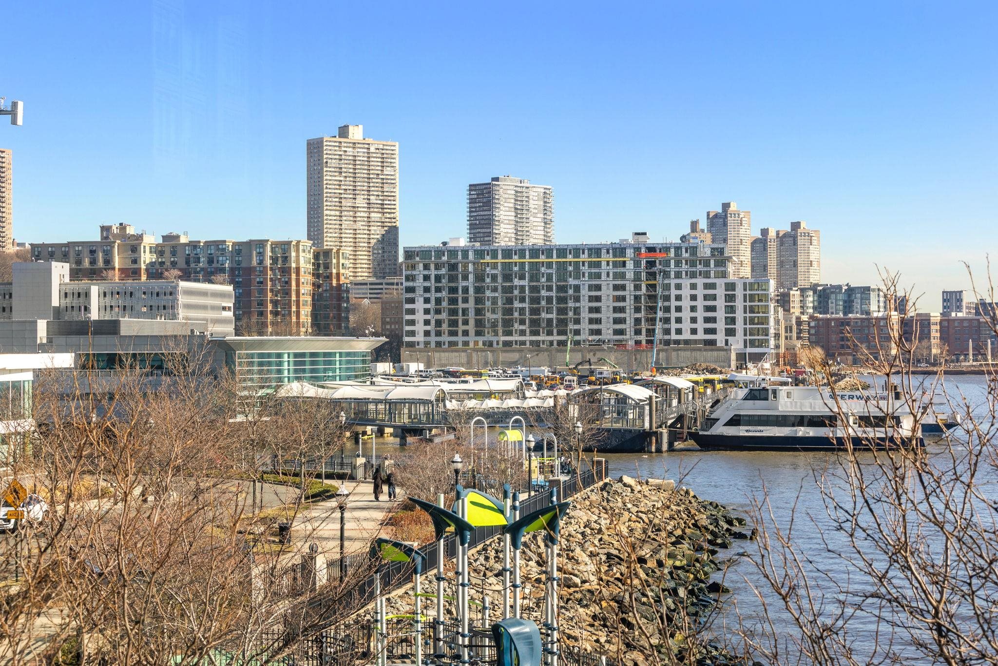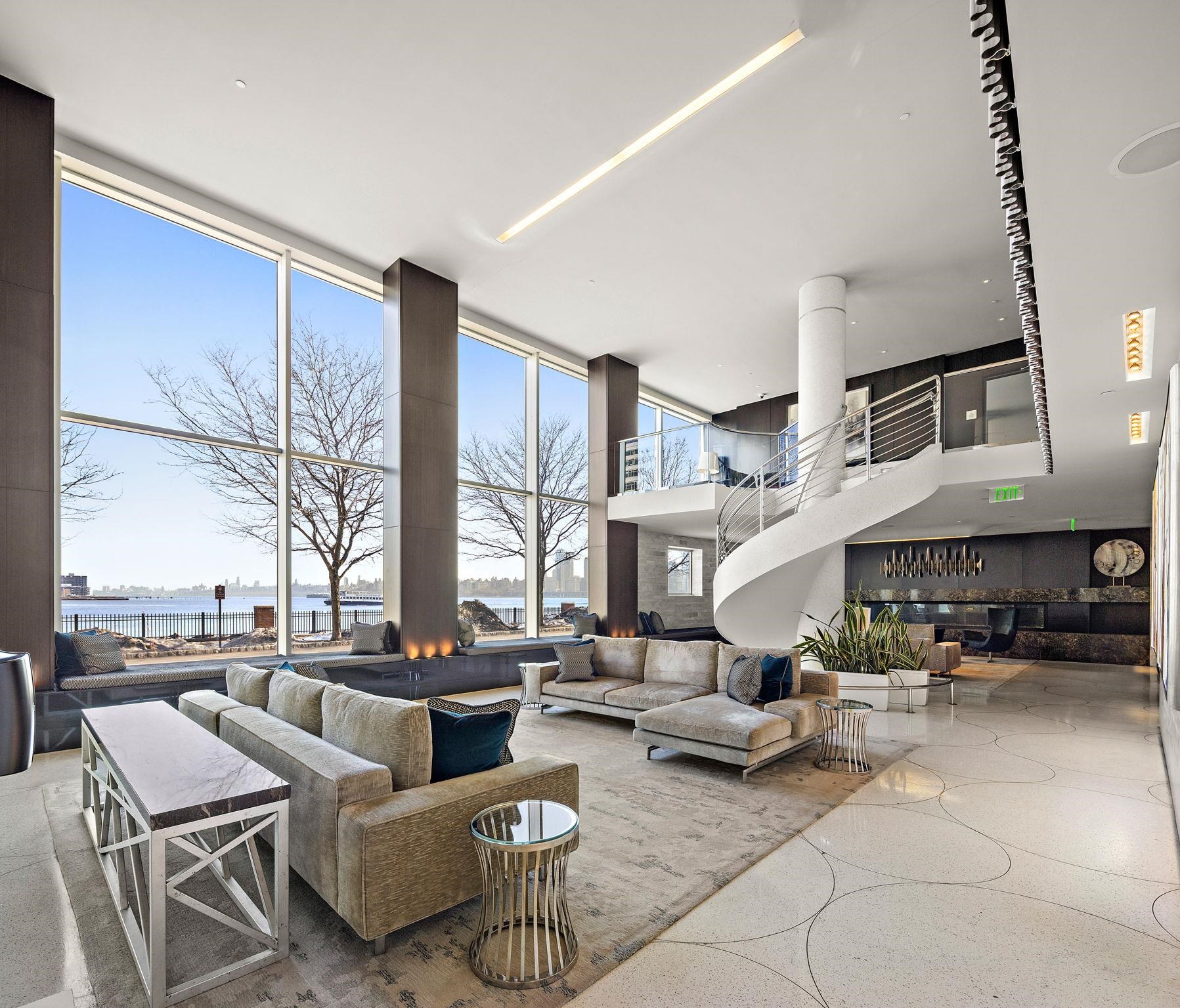 A rare and highly desirable layout offering 1,979 sq. ft. of comfortable corner living space at The Avenue Collection. The open-concept living and kitchen area is framed by floor-to-ceiling wraparound windows, capturing breathtaking Hudson River views and the Manhattan skyline. The expansive design fills the home with natural light while creating a warm, sophisticated atmosphere—perfect for both everyday living and effortless entertaining. Thoughtfully designed for privacy and flow, the residence welcomes you with a gracious foyer entry featuring two large hallway closets. From here, one wing leads to the third bedroom and a full bathroom, ideal for guests or a home office. The main living and kitchen space unfolds ahead, while a separate hallway leads to the utility room, in-unit laundry, the second bedroom, and the primary suite. Each bedroom enjoys the luxury of its own full bathroom, providing comfort and privacy for residents and guests alike. The primary bathroom offers a spa-inspired experience with elegant finishes, a separate toilet room, and a dedicated shower area. Residents enjoy a host of premium building amenities including: 24-hour concierge service; Elegant lobby lounge with fireplace; Conference room; Fitness center conveniently located near the unit; Secure residents-only parking garage with EZ-Pass access. Outdoor amenities include a playground and the Hudson River Waterfront Walkway, perfect for morning jogs or evening strolls along the river. Ideally located next to the Port Imperial Ferry Terminal, offering an easy 8-minute commute to Midtown Manhattan (W 39th St.). The NJ Transit bus to Port Authority is just steps away, and the Hudson-Bergen Light Rail is directly across the street. Enjoy the convenience of nearby shops, restaurants, and cafés, along with ample street and public garage parking for guests.