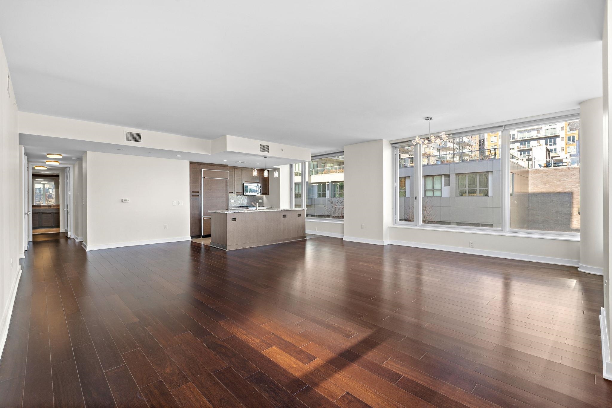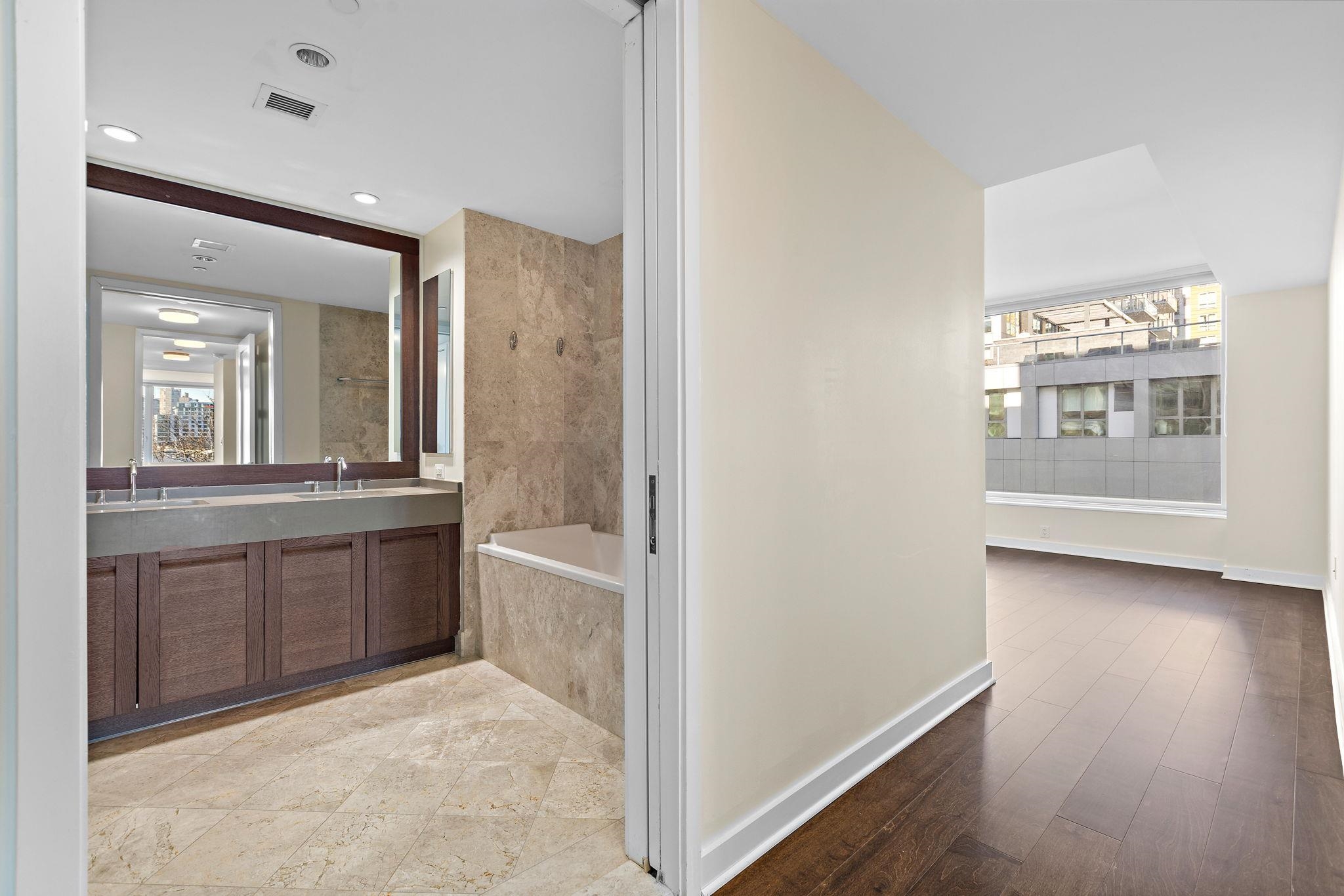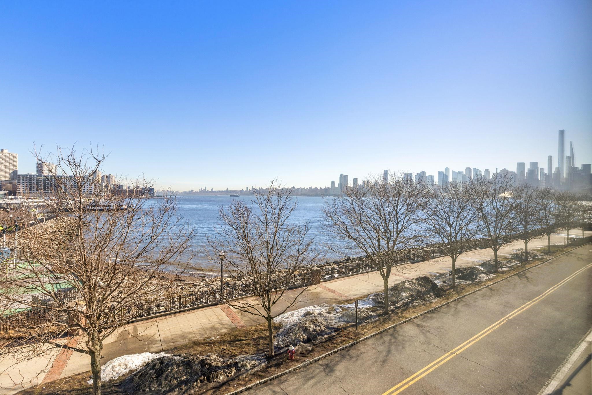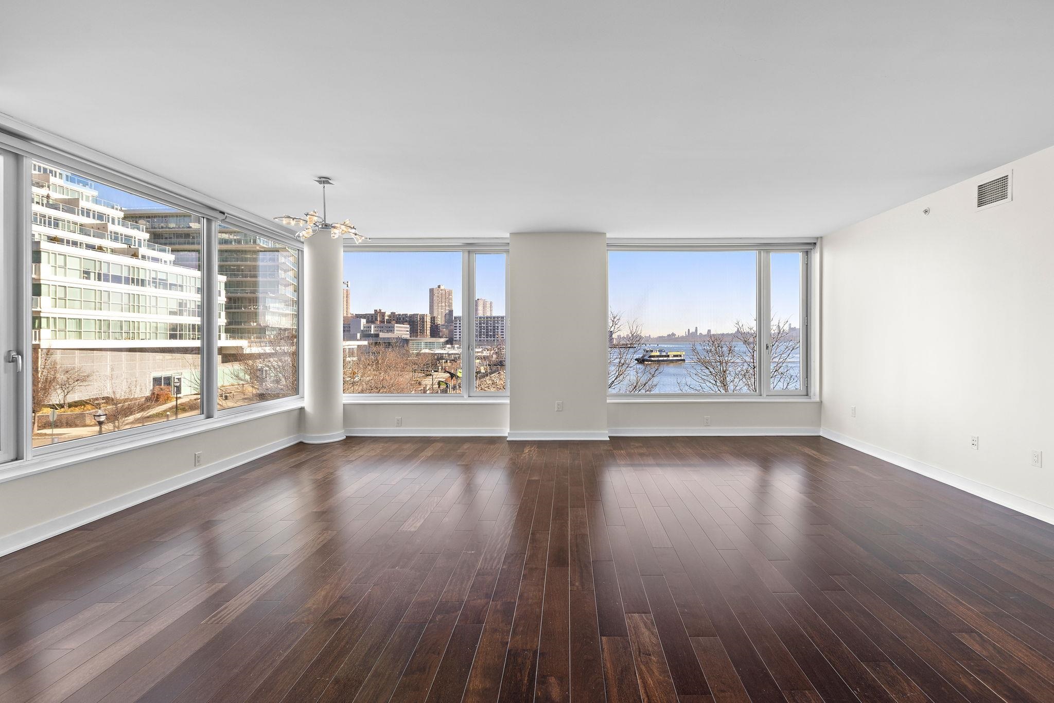 A rare and highly desirable layout offering 1,979 sq. ft. of comfortable corner living space at The Avenue Collection. The open-concept living and kitchen area is framed by floor-to-ceiling wraparound windows, capturing breathtaking Hudson River views and the Manhattan skyline. The expansive design fills the home with natural light while creating a warm, sophisticated atmosphere—perfect for both everyday living and effortless entertaining. Thoughtfully designed for privacy and flow, the residence welcomes you with a gracious foyer entry featuring two large hallway closets. From here, one wing leads to the third bedroom and a full bathroom, ideal for guests or a home office. The main living and kitchen space unfolds ahead, while a separate hallway leads to the utility room, in-unit laundry, the second bedroom, and the primary suite. Each bedroom enjoys the luxury of its own full bathroom, providing comfort and privacy for residents and guests alike. The primary bathroom offers a spa-inspired experience with elegant finishes, a separate toilet room, and a dedicated shower area. Residents enjoy a host of premium building amenities including: 24-hour concierge service; Elegant lobby lounge with fireplace; Conference room; Fitness center conveniently located near the unit; Secure residents-only parking garage with EZ-Pass access. Outdoor amenities include a playground and the Hudson River Waterfront Walkway, perfect for morning jogs or evening strolls along the river. Ideally located next to the Port Imperial Ferry Terminal, offering an easy 8-minute commute to Midtown Manhattan (W 39th St.). The NJ Transit bus to Port Authority is just steps away, and the Hudson-Bergen Light Rail is directly across the street. Enjoy the convenience of nearby shops, restaurants, and cafés, along with ample street and public garage parking for guests.