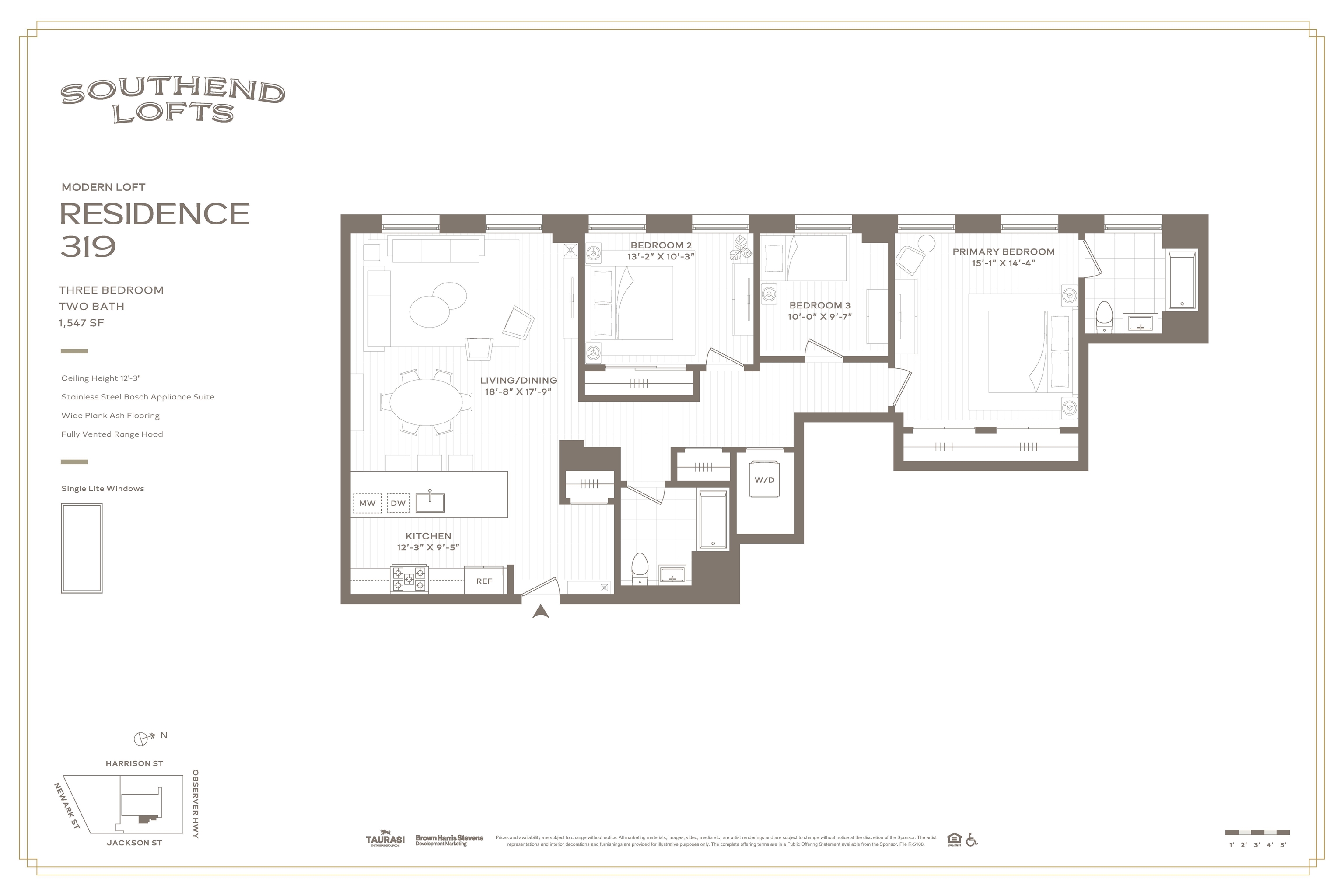 Massive Three Bedroom Loft Residence 319 is a sprawling 1,547 square foot 3 bedroom 2 bath featuring a massive living/dining room, soaring 12’ plus ceilings, oversized windows and a custom kitchen featuring abundant storage, Calacatta Valentin countertops and backsplash and a suite of Bosch stainless steel appliances as well as a vented range hood, microwave drawer and dishwasher. The large primary suite features a massive walk-in closet, luxurious primary bath with Calacatta Lucca wall and floor tiles, and custom vanity with white quartz countertop, Kohler sinks and distinctive pill-shaped vanity mirrors with integrated lighting. The second and third bedrooms offer ample closet space and flexibility to use both as bedrooms or one as a home office or den. Wide Plank ash wood floors, high performance VRF heating and air conditioning, LG washer and state of the art heat pump dryer round out the exceptional finish package of this brand-new home. Southend Lofts features 1 - 5 bedroom newly built condominiums offering over 20,000 square feet of amenities including a massive roof garden with incredible Manhattan Views, a 40' pool, BBQ stations, recreation area and lounging, 24 hour attended lobby, fitness center, co-working areas, a Golf and Multi Sports Simulator and Children's Playroom. Indoor parking is available at an additional cost. Exclusive Sales and Marketing Agent: Brown Harris Stevens New Jersey Development Marketing. The complete offering terms are in a Public Offering Statement available from the Sponsor. File R-5108. Equal Housing Opportunity