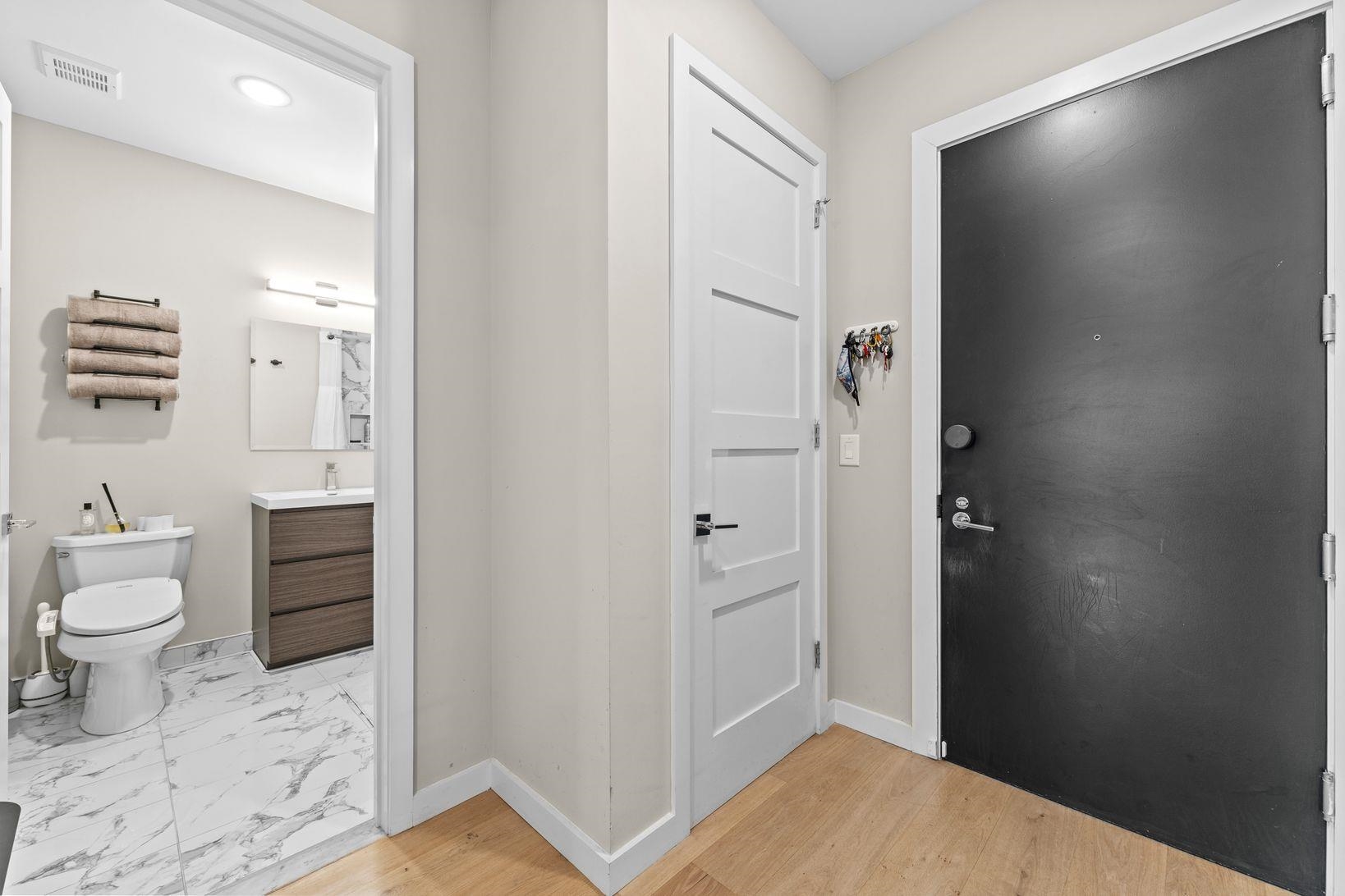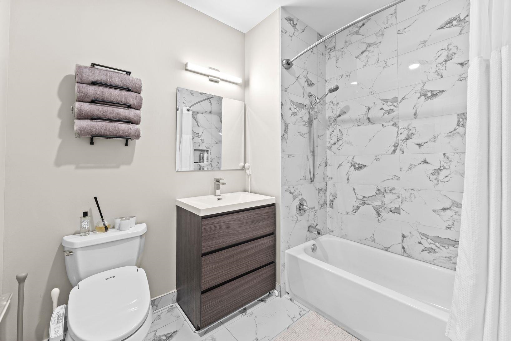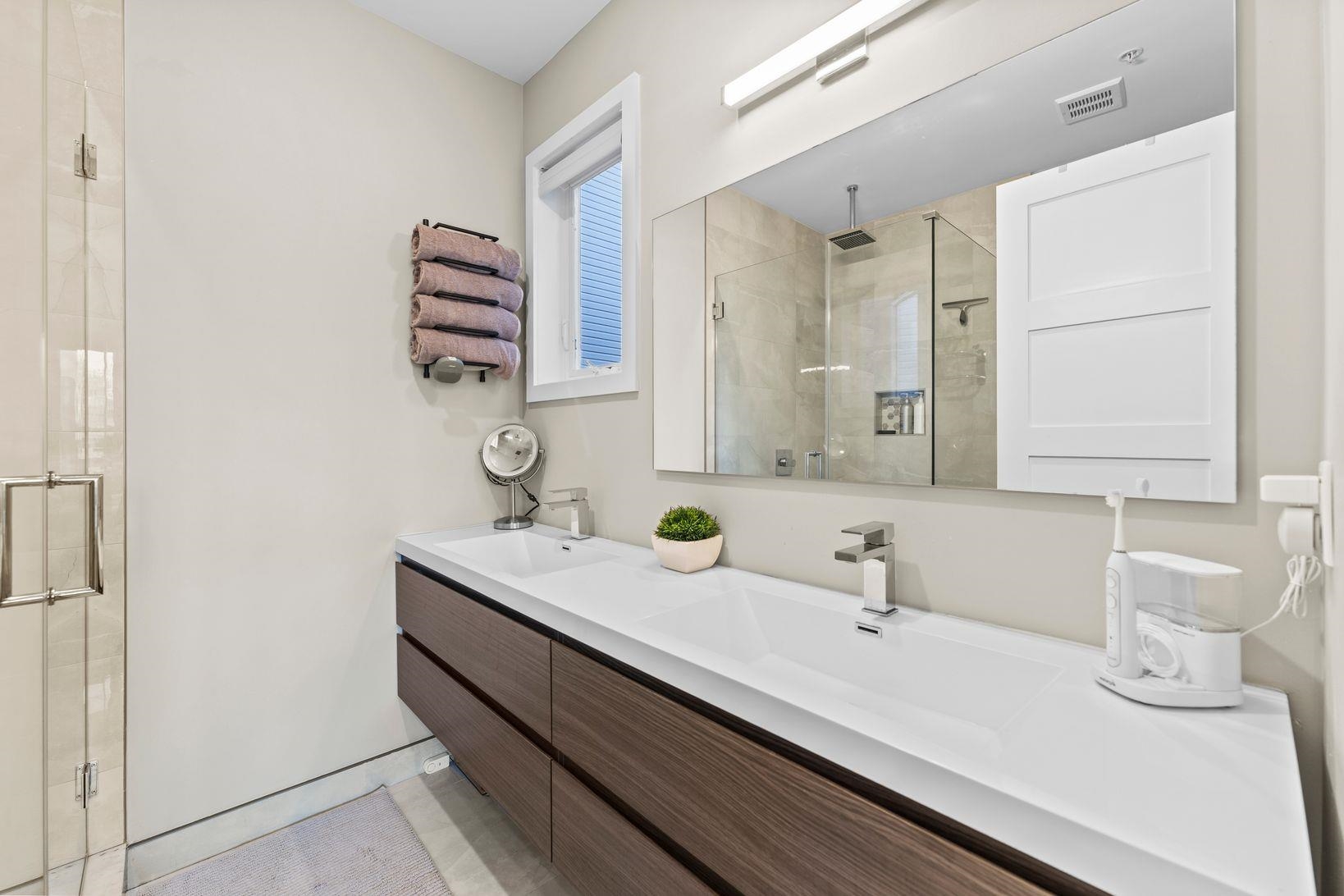 Bright & spacious 2 bedroom, 2 bathroom condo in modern 2019 constructed boutique condo building which features garage parking, elevator access and a large shared yard & patio. This second floor unit features luxury finishes throughout with wide-plank wood flooring, designer kitchen & bathrooms, central AC, in-unit laundry, Ring security cam & system, large windows, a large private balcony and more! Large open living room has plenty of room for a dining table and opens up to the kitchen, which features quartz countertops, stainless steel appliances, and a beautiful waterfall peninsula, offering plenty of counter space. Primary bedroom includes an en suite with a double vanity, glass enclosed shower and a rain shower head. Second bedroom is spacious and includes a walk-in closet with an infrared sauna. Situated on the border of Hoboken and Jersey City Heights, the neighborhood is known for its rich cultural heritage, vibrant arts scene, walkable streets, local shops, restaurants, parks, and sweeping views of the Manhattan skyline from atop the Hudson Palisades. Washington Park’s multi-million dollar renovation includes 10 tennis courts, 2 pickleball courts, basketball courts, a large playground, a splash pad, dog park, picnic benches, walking trails and more! Commuters will love the quick access to New York City: NJ Transit buses provide frequent service to Port Authority in 20 - 30 minutes. You’re also just a couple of blocks to the 9th St Light Rail, which can get you to the PATH train or to downtown Hoboken / Jersey City. For drivers, Route 495 and the Lincoln Tunnel make car commutes into Manhattan a breeze. Whether you’re seeking urban convenience, cultural vibrancy, or an affordable alternative to Manhattan / Hoboken living without sacrificing space or comfort, this home delivers with style, location, and unbeatable access to everything the area has to offer.