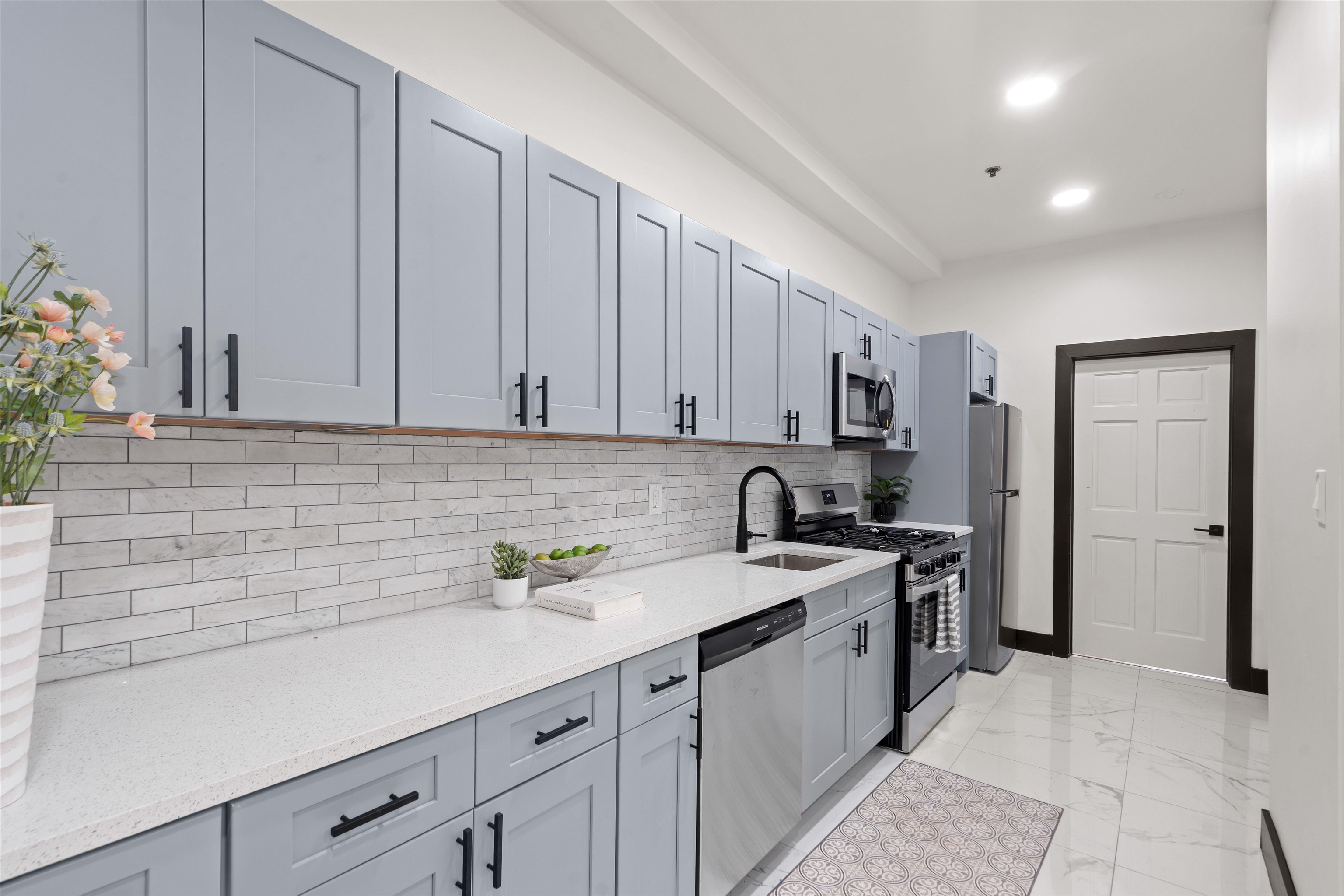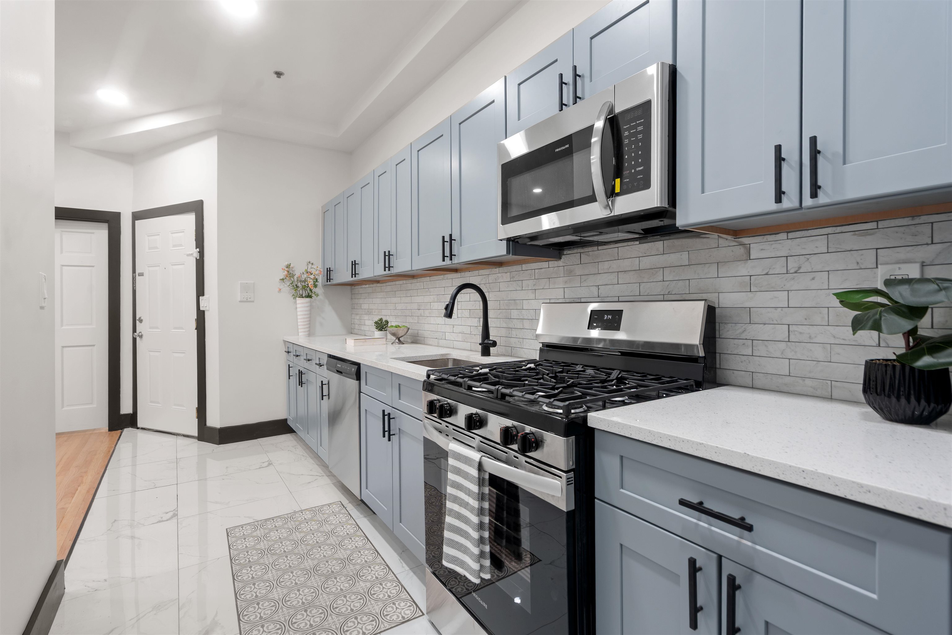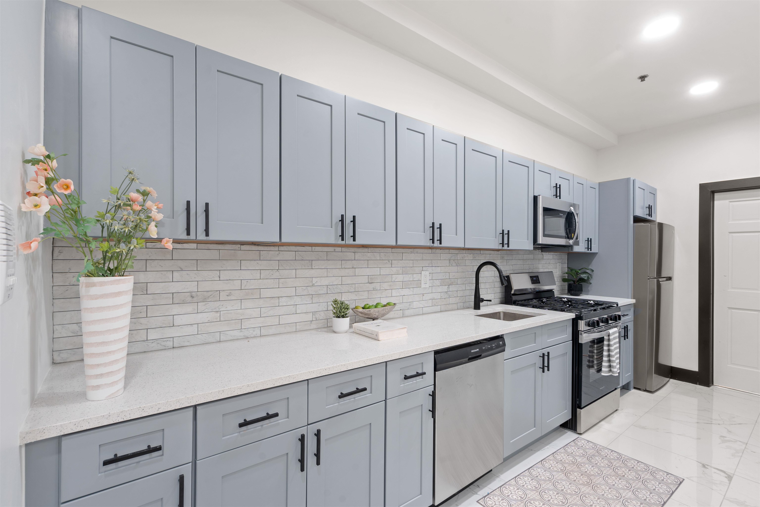 Welcome home to this beautifully renovated 2-bedroom, 1-bathroom apartment at 391 Central Avenue, Unit #1! Situated in the vibrant and convenient Jersey City Heights neighborhood, this residence offers the perfect blend of classic charm and modern upgrades. Step inside and be greeted by gleaming hardwood floors that flow seamlessly throughout the entire apartment. The stylish kitchen boasts elegant shaker cabinets, providing ample storage and a sophisticated touch. You'll appreciate the convenience of an in-unit washer and dryer, making laundry day a breeze. The thoughtful design extends to the details, with striking black trim adding a contemporary edge to the space. Beyond the apartment itself, you'll also benefit from extra storage space located in the basement – perfect for stowing away seasonal items and more. Located on Central Avenue, you'll find yourself surrounded by an array of local shops, restaurants, and cafes. Enjoy easy access to public transportation, making your commute to NYC and other parts of New Jersey a cinch. Don't miss this opportunity to live in a beautifully appointed apartment in one of Jersey City's most desirable neighborhoods! Schedule your showing today. Parking available nearby for an additional fee.