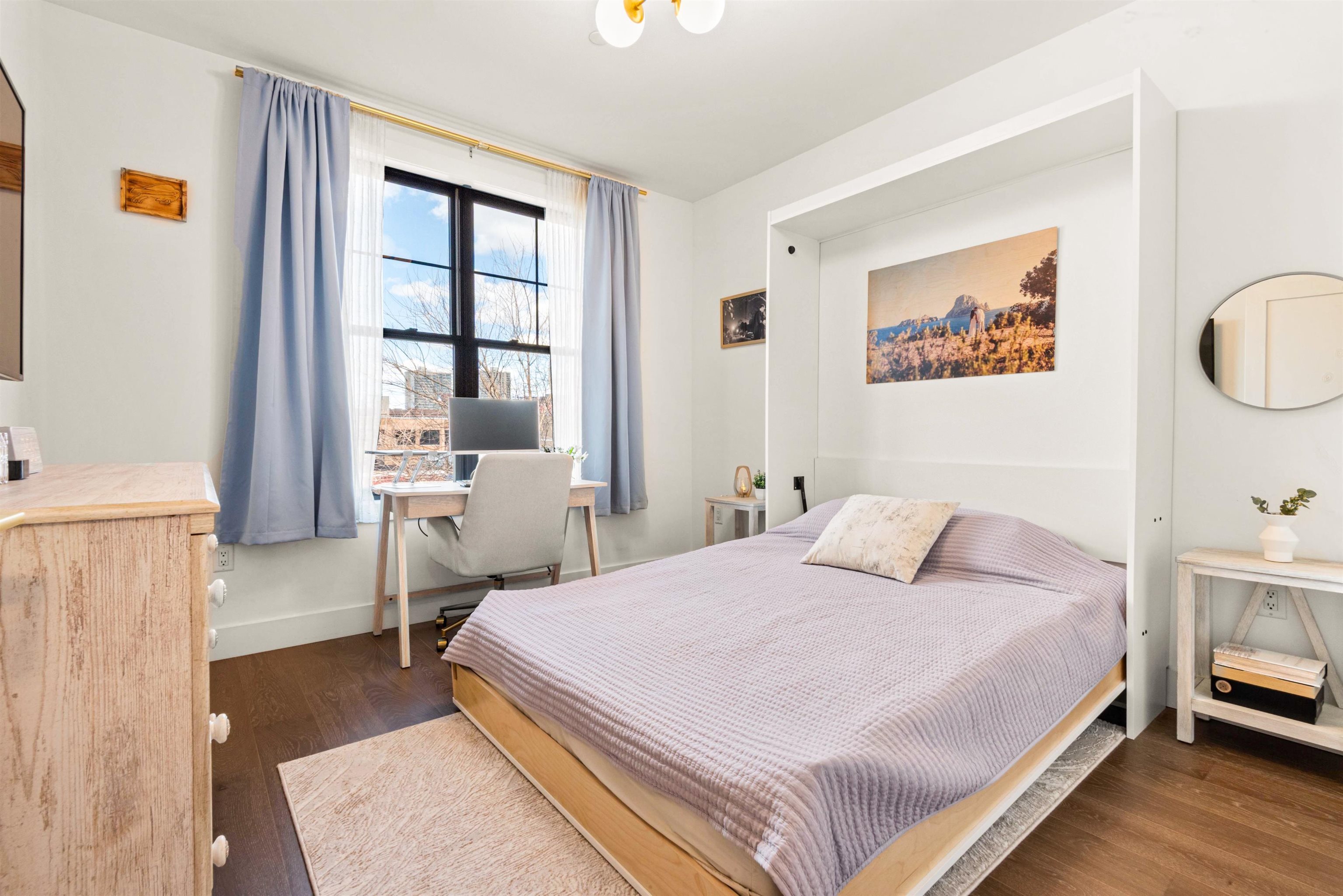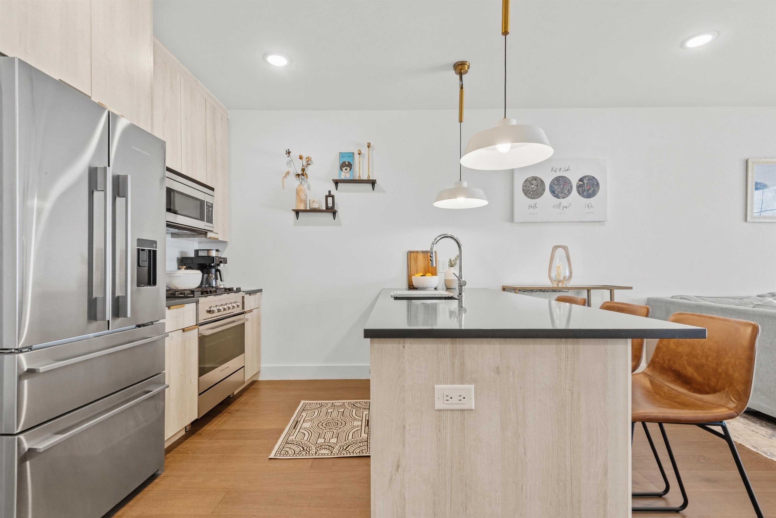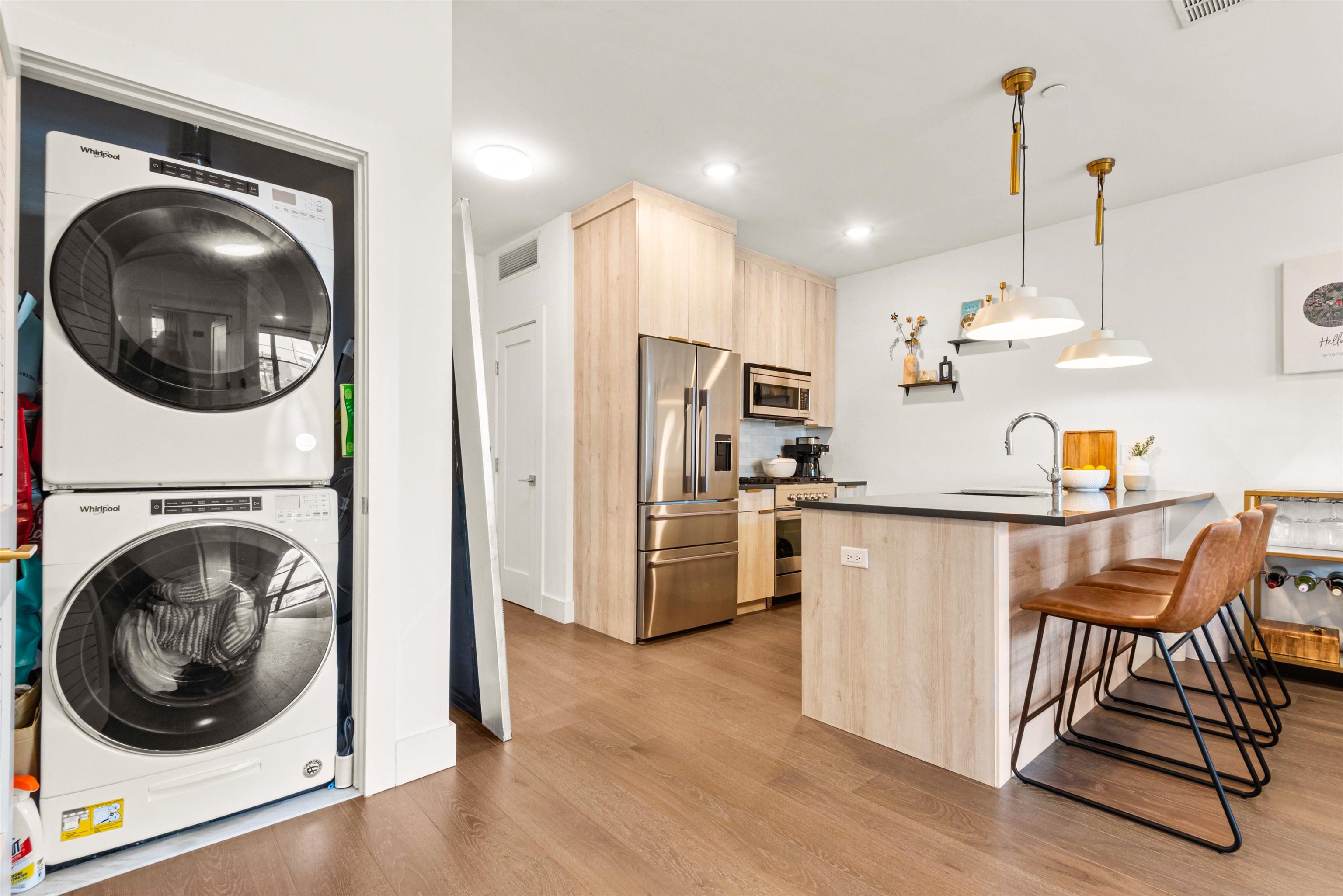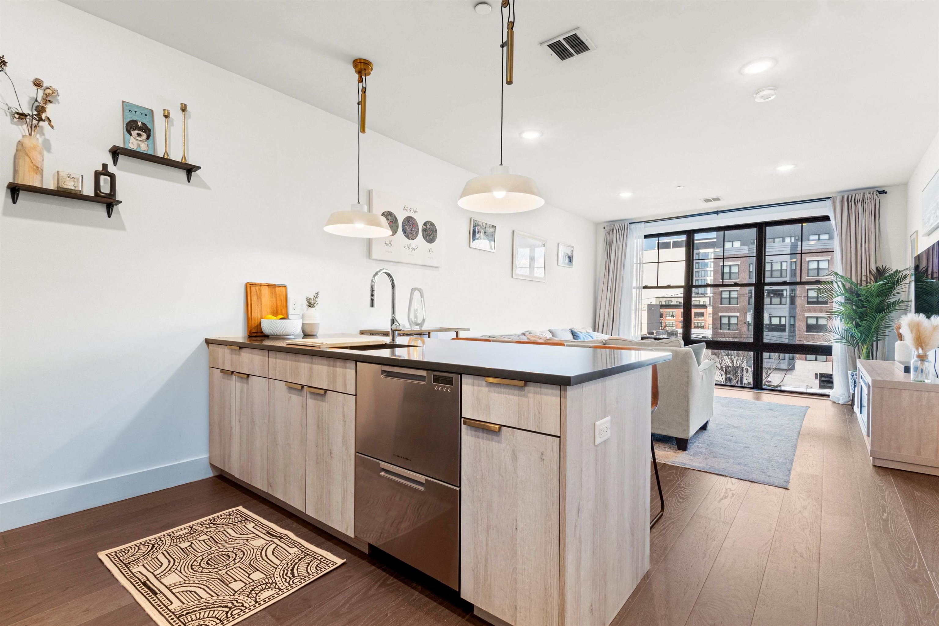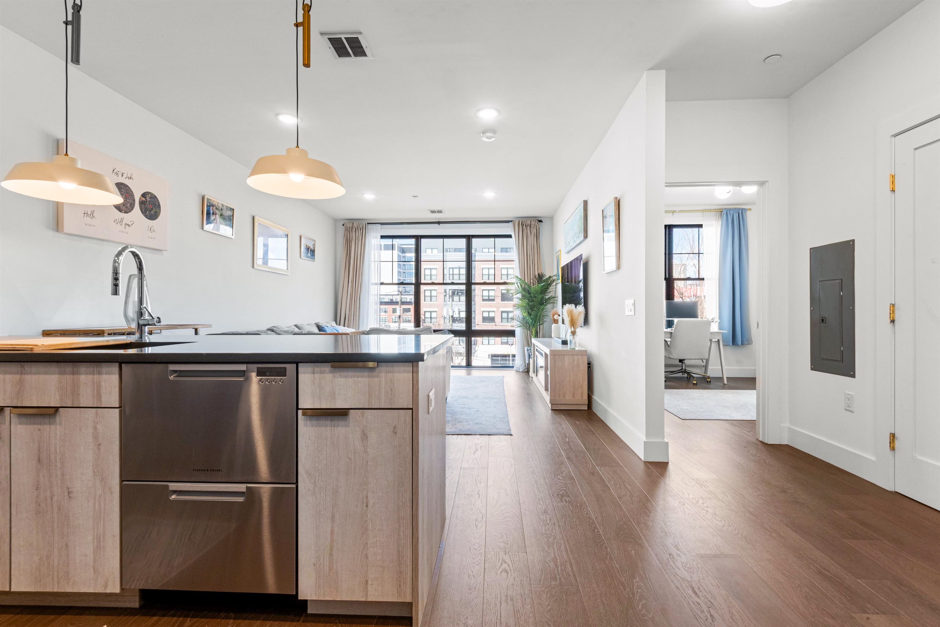 You've outgrown your rental apartment and want space, style in a lively and burgeoning neighborhood without the NYC price tag. Welcome to 386 5th Street, a modern and sleek one bed one bath recently constructed residence in the heart of Historic Downtown Jersey City's Village community. Part of an 18-unit boutique elevator building this open-concept home includes light hardwood floors, oversized windows, and an in-unit washer/dryer. Central A/C and heat throughout. The kitchen features warm wood-tone cabinetry, dark Quartz countertops, brass accent finishes, and top of the line Fisher & Paykel stainless steel appliances. The bathroom comes with Carrara marble floors, bidet toilet, a large stand-up shower, and a floating vanity. In the hall just outside of the apartment entrance you will find an additional storage closet with hvac. Building amenities include an elevator, FOB entry, video intercom, security monitoring, bike storage, pet-friendly policy, trash drop-off room, and Amazon Parcel Pending lockers. Located within walking distance of some of Jersey City most trendy restaurants such as the top rated Cellar 335, Jane Doe, Madame and Prato Bakery. You are also just steps to White Eagle Hall arts and music center and short stroll to the Newark Ave pedestrian place with convenient access to PATH service into Manhattan (10 minute walk). Building is located in close proximity to the planned entrance of the Sixth Street Embankment which will be a 5-acre elevated public park, similar to NYC's High Line. Planning for this exciting new "High-Line type" park is currently underway. Parking lot close by if you are interested in renting a parking spot. Floorplan will be posted soon.