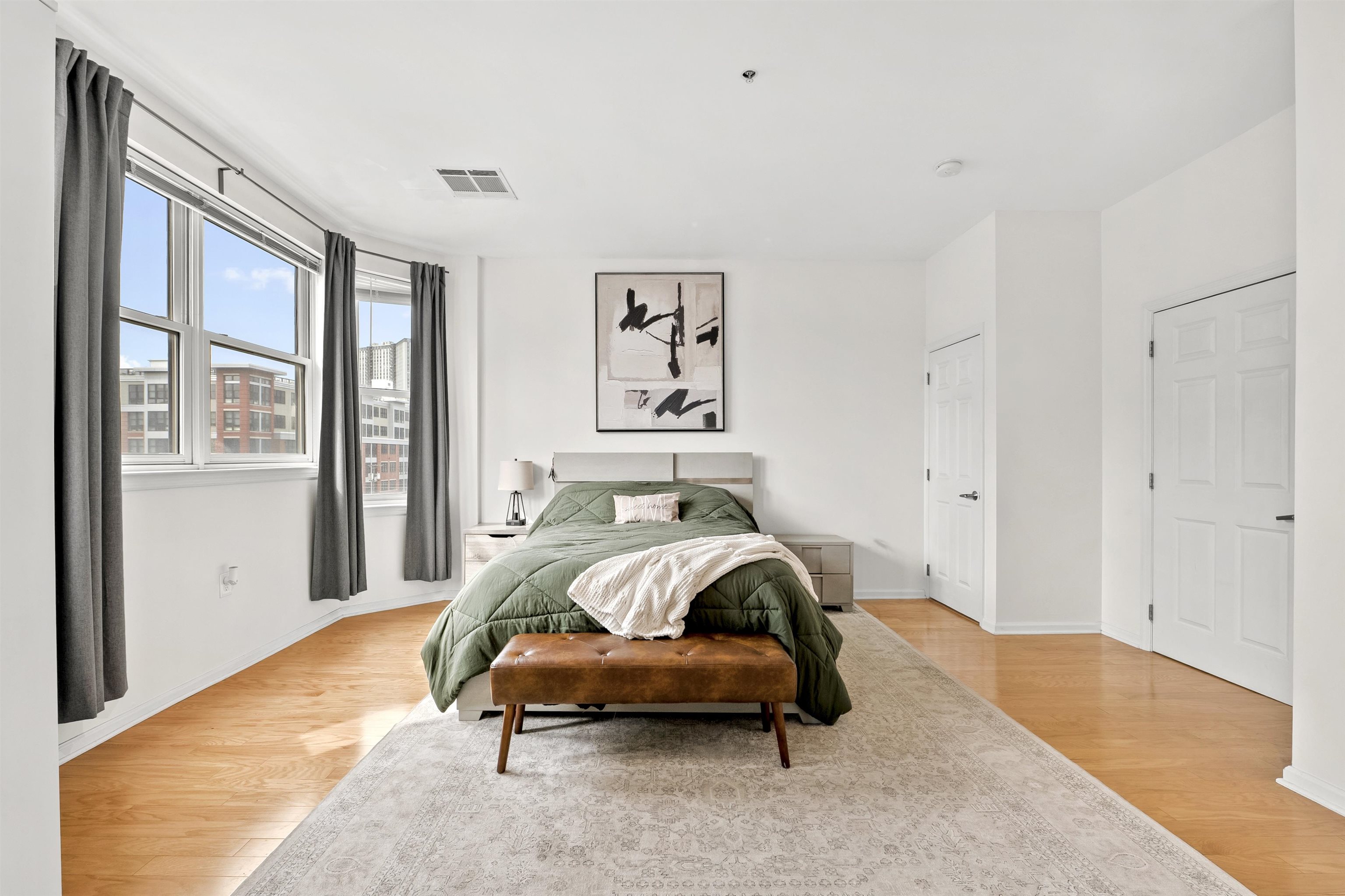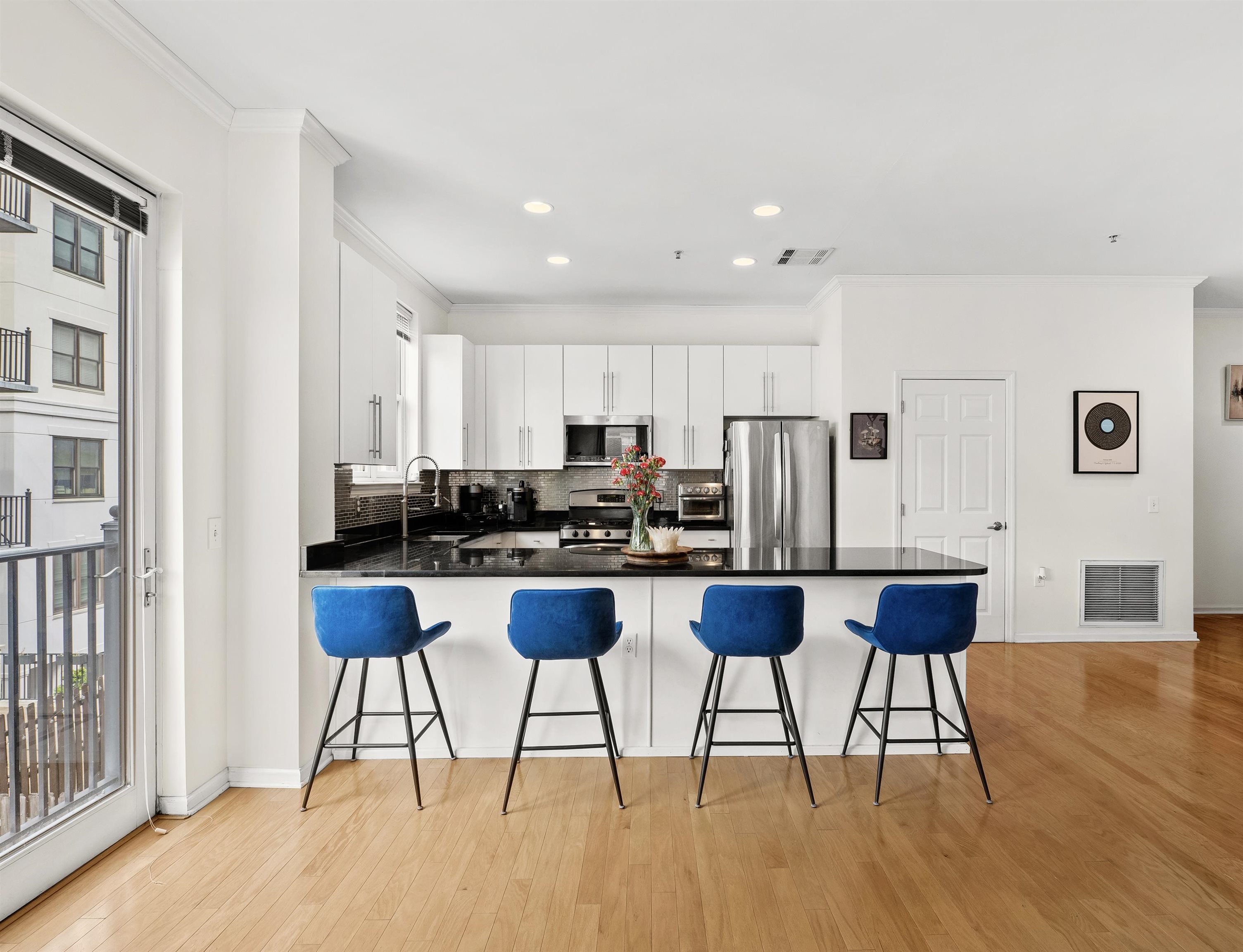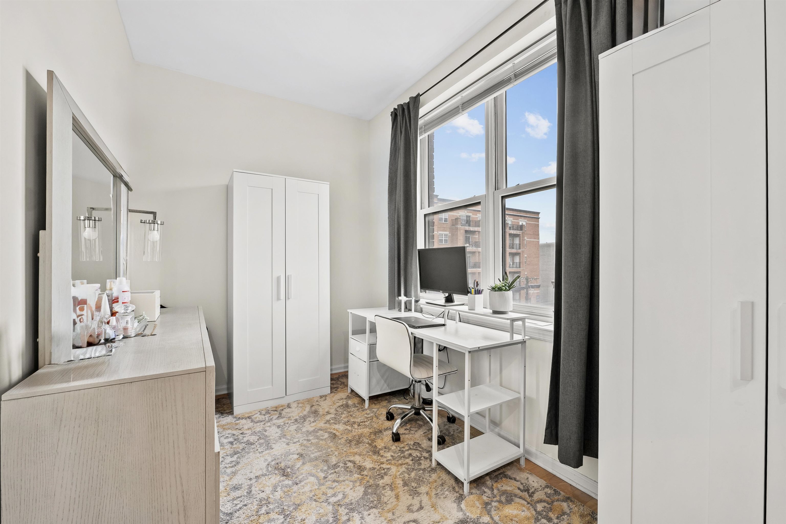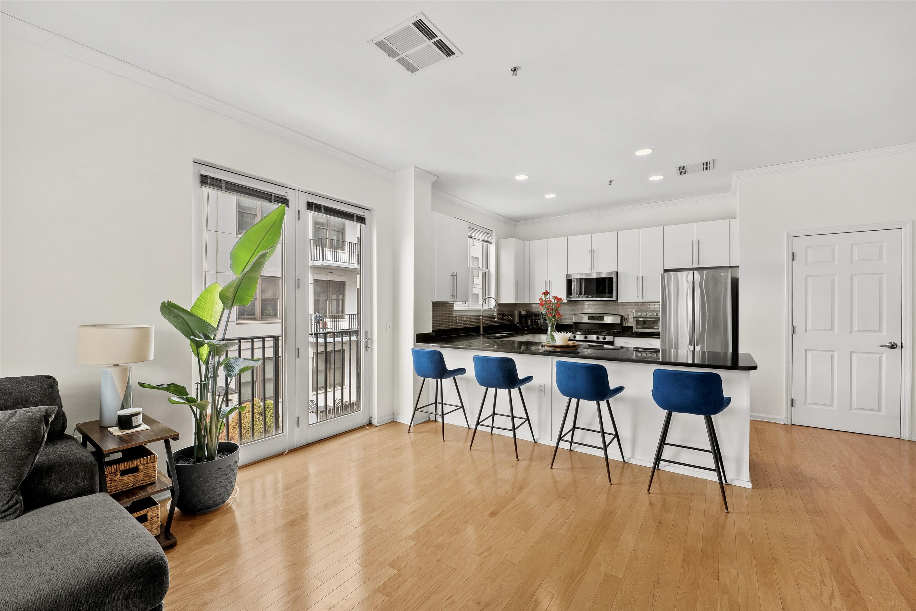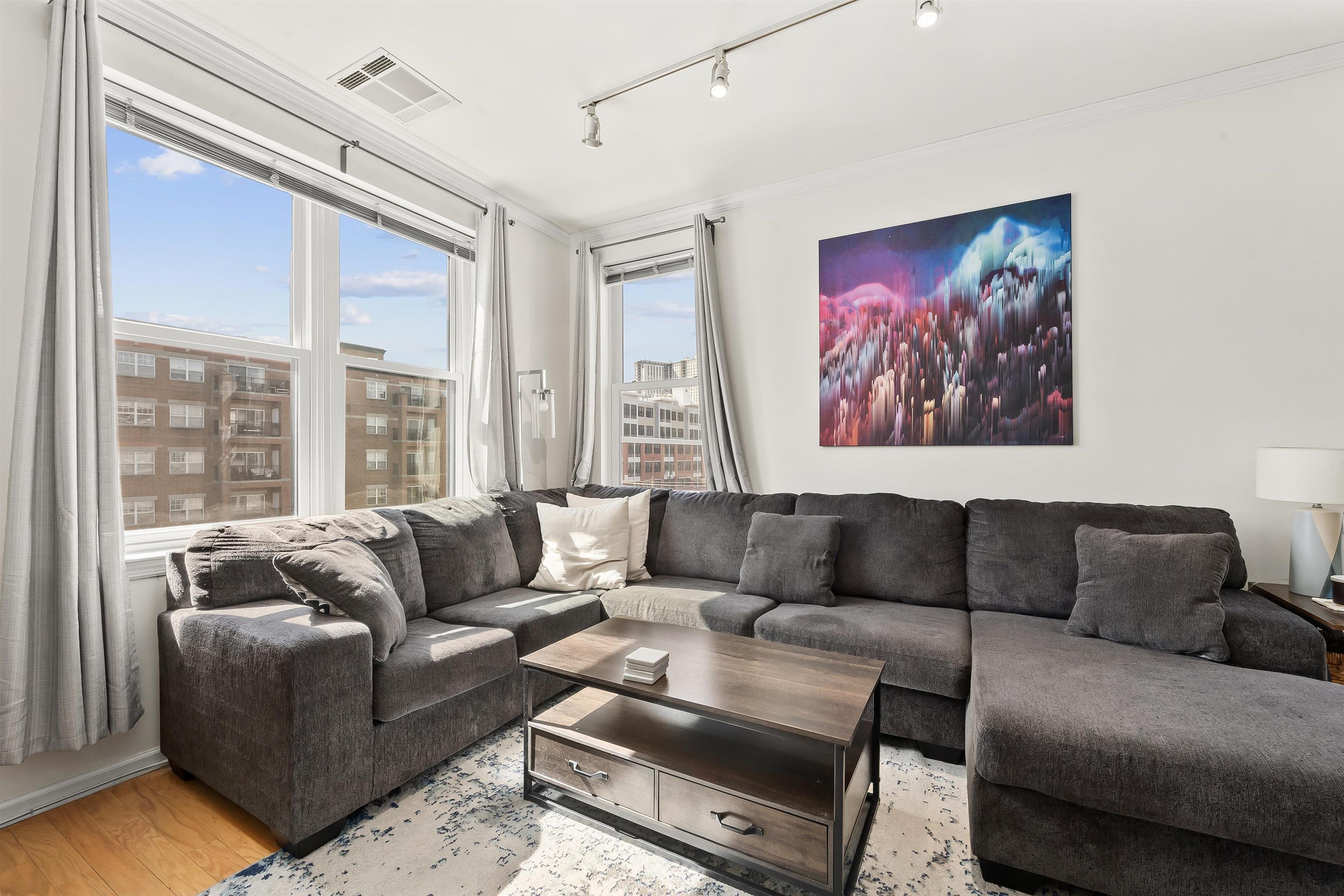 Rarely available sun-drenched corner 1 bedroom + den at the highly sought after Upper Grand, with garage parking included! South and west facing, this 1027 sqft home is flooded with natural light all day long. The airy and open layout features space for a dining table, and is enhanced by a Juliet balcony overlooking the courtyard. The modern chef’s kitchen is designed to impress, boasting granite countertops, stainless steel appliances, custom backsplash, an oversized breakfast bar, all with abundant cabinet space. The spacious bedroom is highlighted by beautiful south facing bay windows. A bonus alcove within the bedroom offers incredible flexibility—perfect for a home office or nursery. Additional features include in-unit washer/dryer, smart thermostat controlled central A/C, over 9 ft ceilings, and hardwood floors throughout. The Upper Grand is a quiet, steel-and-concrete elevator building with premium amenities, including a community room, secure package room, ButterflyMX intercom system, landscaped courtyard, and a fully equipped fitness center with Peloton. SUV-sized garage parking for one car is included. Unbeatable location just steps from Trader Joe's, the 126 bus to Port Authority, and directly across from the Northwest Resiliency Park.