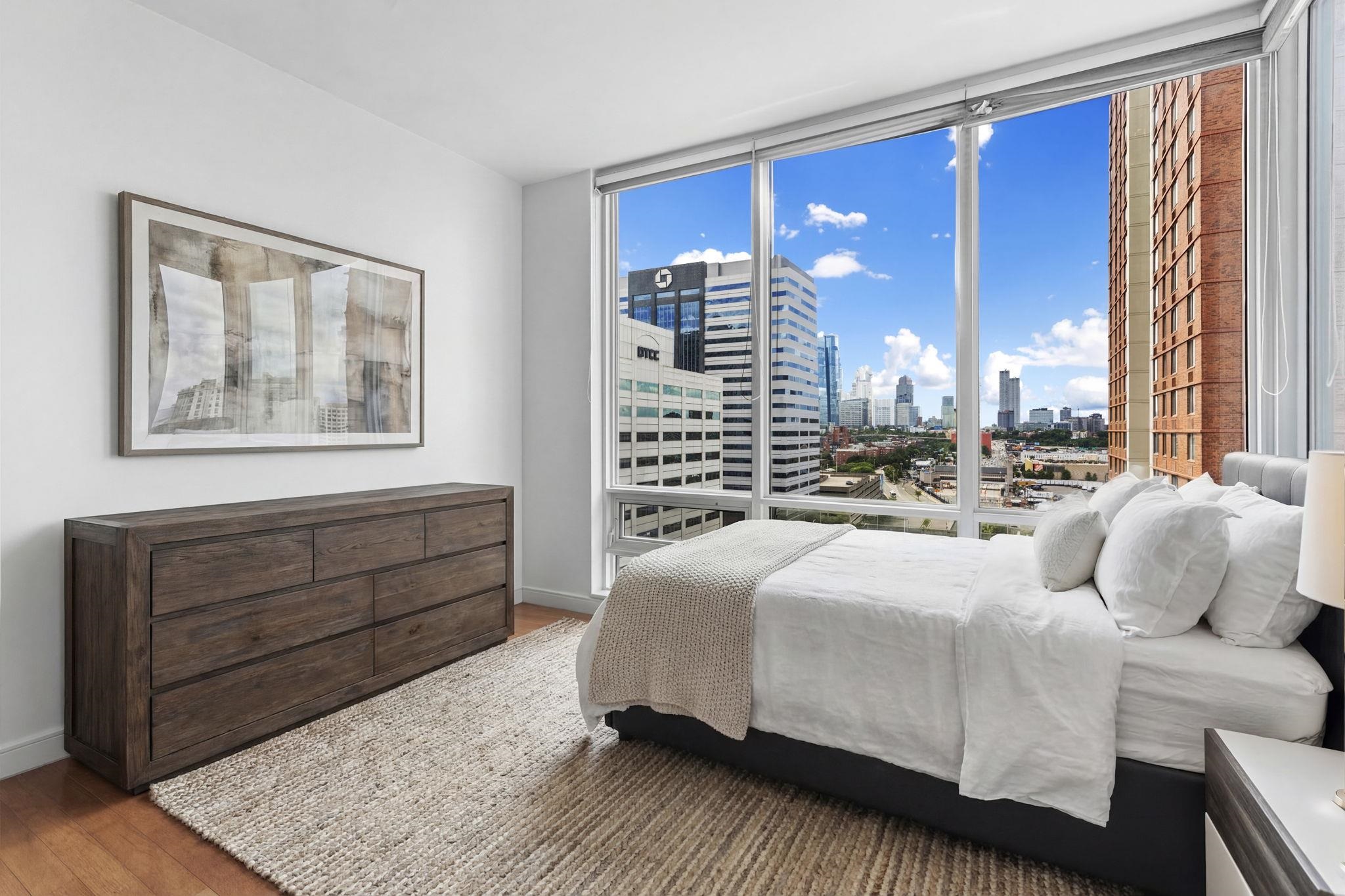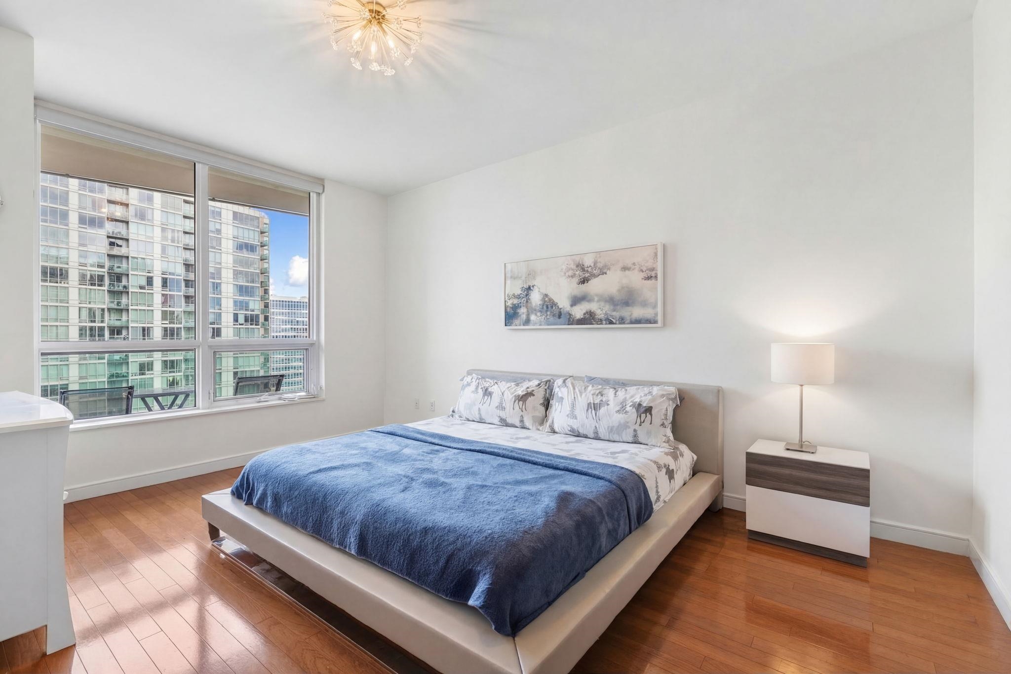 Expansive 2 bed + den corner home with private balcony and NYC views in luxury community of 20 Newport Parkway! Chef's kitchen features SS appliances, granite counter tops, and kitchen island. The primary bedroom has a walk-in closet and ensuite bathroom. Additional bedroom, bathroom, and central den space make this the perfect home. Also included are hardwood floors throughout, recessed lighting, window treatments, washer/dryer in unit, and a ton of closet space. The building's generous amenities include 24/7 Concierge, resident lounge, screening room, jacuzzi, sauna/steam room, conference room, fitness center, and a rooftop deck. Conveniently located near Hoboken & Newport PATH, Morton Williams Supermarket, and mall.
