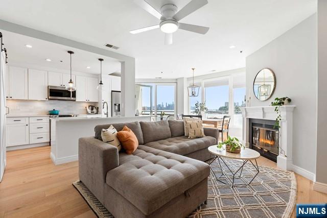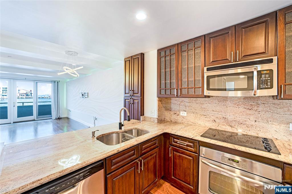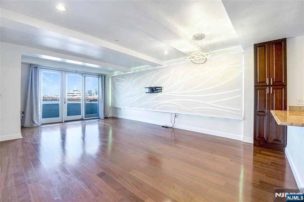 Beautifully updated 1-Bedroom + Den, 2-Bathroom Condo with walk-in closet offers breathtaking views of the Manhattan skyline and Hudson River. The kitchen is fitted with granite countertops, a built-in cooktop, and rich espresso cabinetry. The Living room centerpiece features a custom museum-quality architectural art wall installation with programmable LED backlighting. A wood-burning fireplace creates the perfect cozy retreat, while the oversized balcony invites you to unwind and take in the stunning scenery. Enjoy the convenience of in-unit washer/dryer, garage parking, and building amenities including; a gym, indoor heated pool, and 24-hour concierge. With Whole Foods, the Ferry, Light Rail, and bus service just steps away, truly one of the best locations on the waterfront.