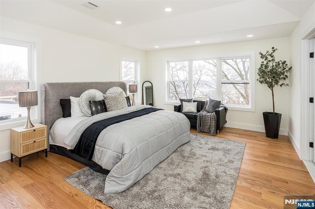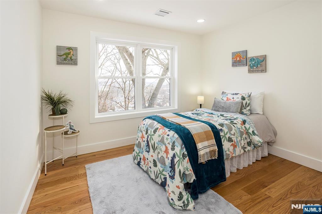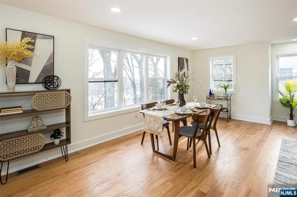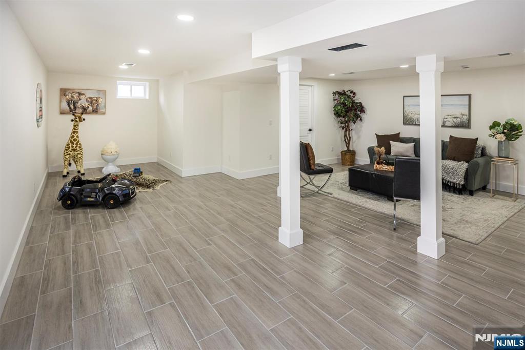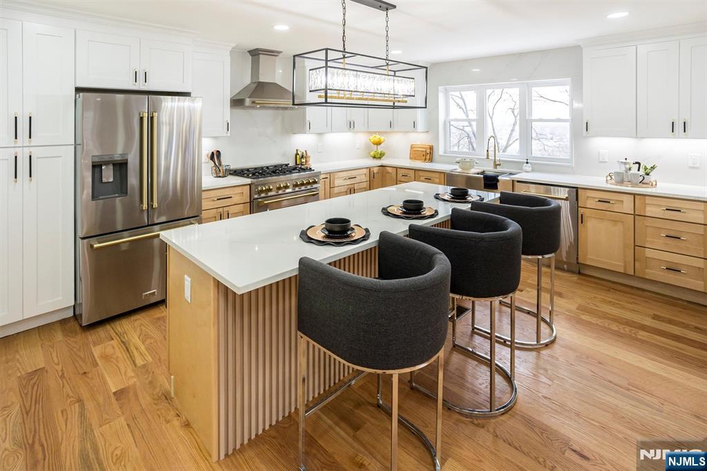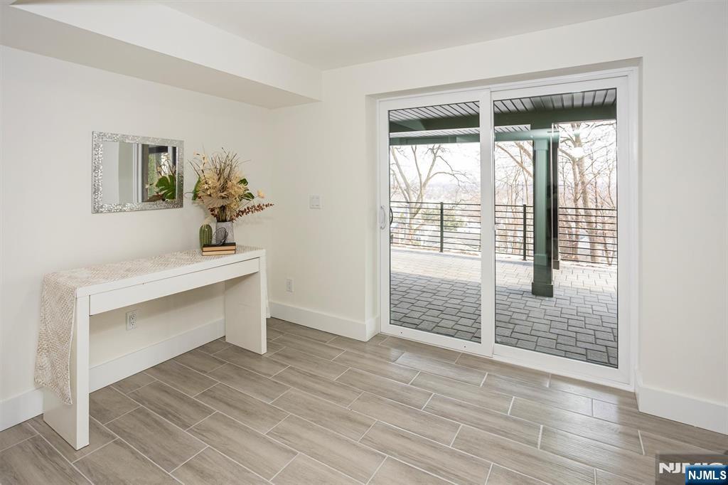 This spectacularly expanded residence has been meticulously renovated with exceptional attention to detail throughout. The modern open-concept floor plan is highlighted by beautiful oak floors, abundant natural light, and a seamless connection between the spacious living and dining areas. The expansive kitchen overlooks the main living space and features a sleek modern electric fireplace, creating a warm yet contemporary ambiance. A well-appointed first-floor bedroom with a private en-suite bath offers flexibility for guests or multi-generational living, complemented by an elegant powder room on the main level. The second floor is anchored by a generously sized primary suite showcasing winter skyline views of New York City and a luxurious spa-inspired bath with a soaking tub and oversized glass-enclosed shower. Three additional well-proportioned bedrooms and a stunning hall bath complete this level. The lower level offers a large family or recreation room, utility space, and walkout access to a beautifully designed, mostly covered patio overlooking the yard. Truly move-in ready, this home reflects thoughtful craftsmanship and refined finishes at every turn.