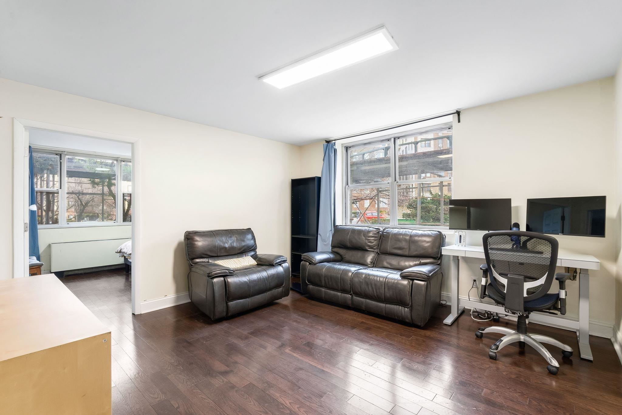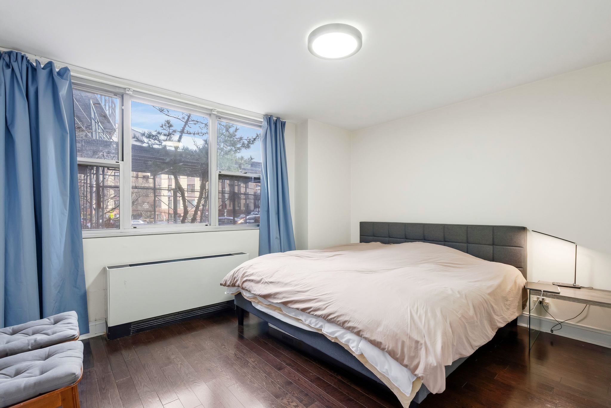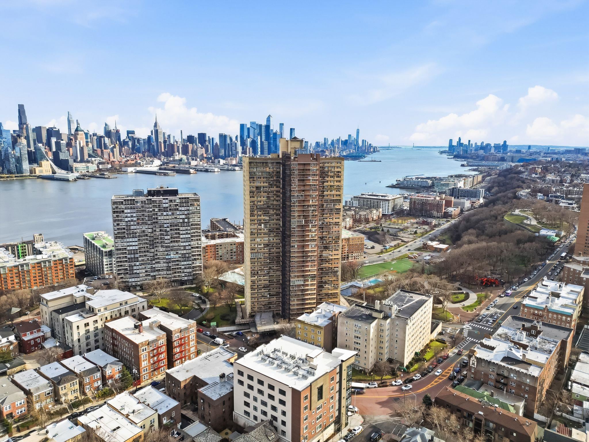 This spacious ground-floor co-op at the prestigious Riviera Towers in West New York offers approximately 775 square feet of bright, modern living space. The residence features an inviting living area with elegant hardwood floors that run throughout the entire unit, complemented by numerous windows that flood the space with natural light. The heart of the home is the newly updated kitchen, which has been thoughtfully designed to include sleek quartz countertops and a full suite of stainless steel appliances. The bedroom is impressively spacious, providing ample room for a king-sized set and additional furniture, while multiple closets throughout the apartment offer excellent storage solutions. Located directly on Boulevard East, Riviera Towers is a premier luxury high-rise that provides an unparalleled lifestyle with 24-hour concierge and valet services for guests. Residents enjoy access to a wealth of on-site amenities, including a refreshing outdoor pool, a well-equipped gym available for an additional fee, and the ultimate convenience of an in-building grocery store and laundry facilities. This location is a commuter's dream, offering immediate access to NYC buses and Jitneys, as well as a dedicated shuttle to the Port Imperial Ferry. With all utilities—heat, air conditioning, water, gas, and electric—included in the monthly maintenance, and a vibrant neighborhood full of great restaurants just steps away, this home perfectly balances luxury and ease.