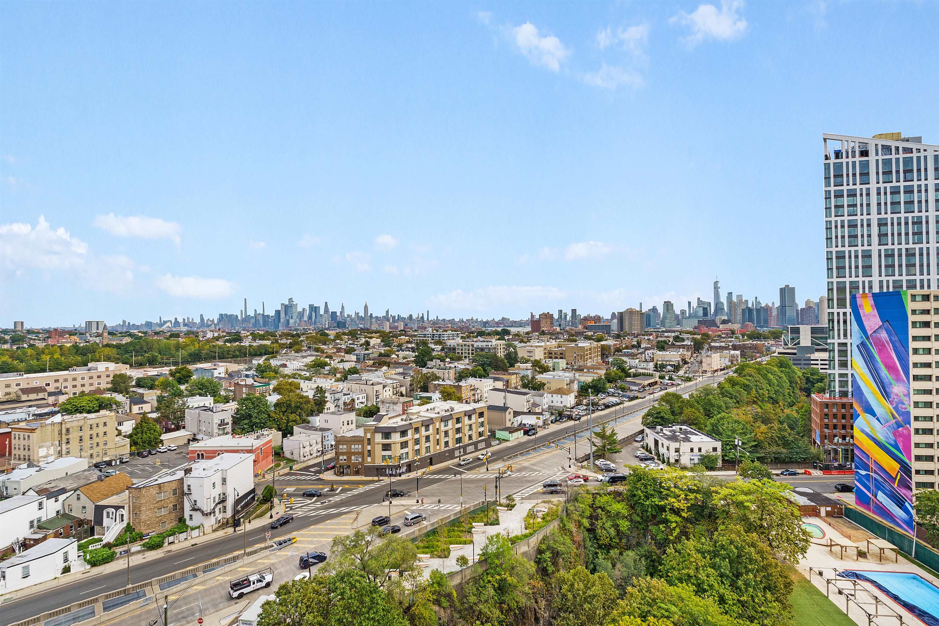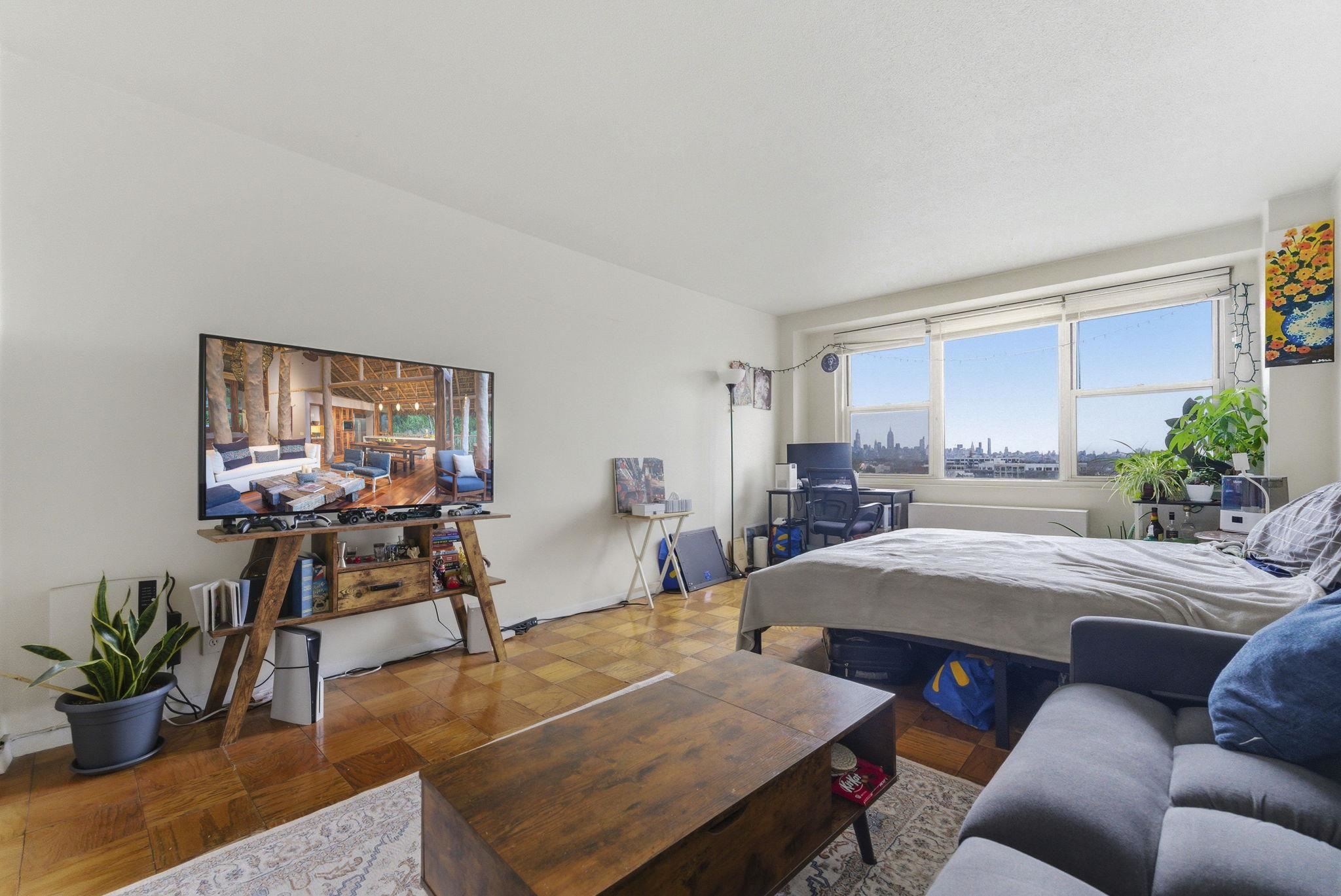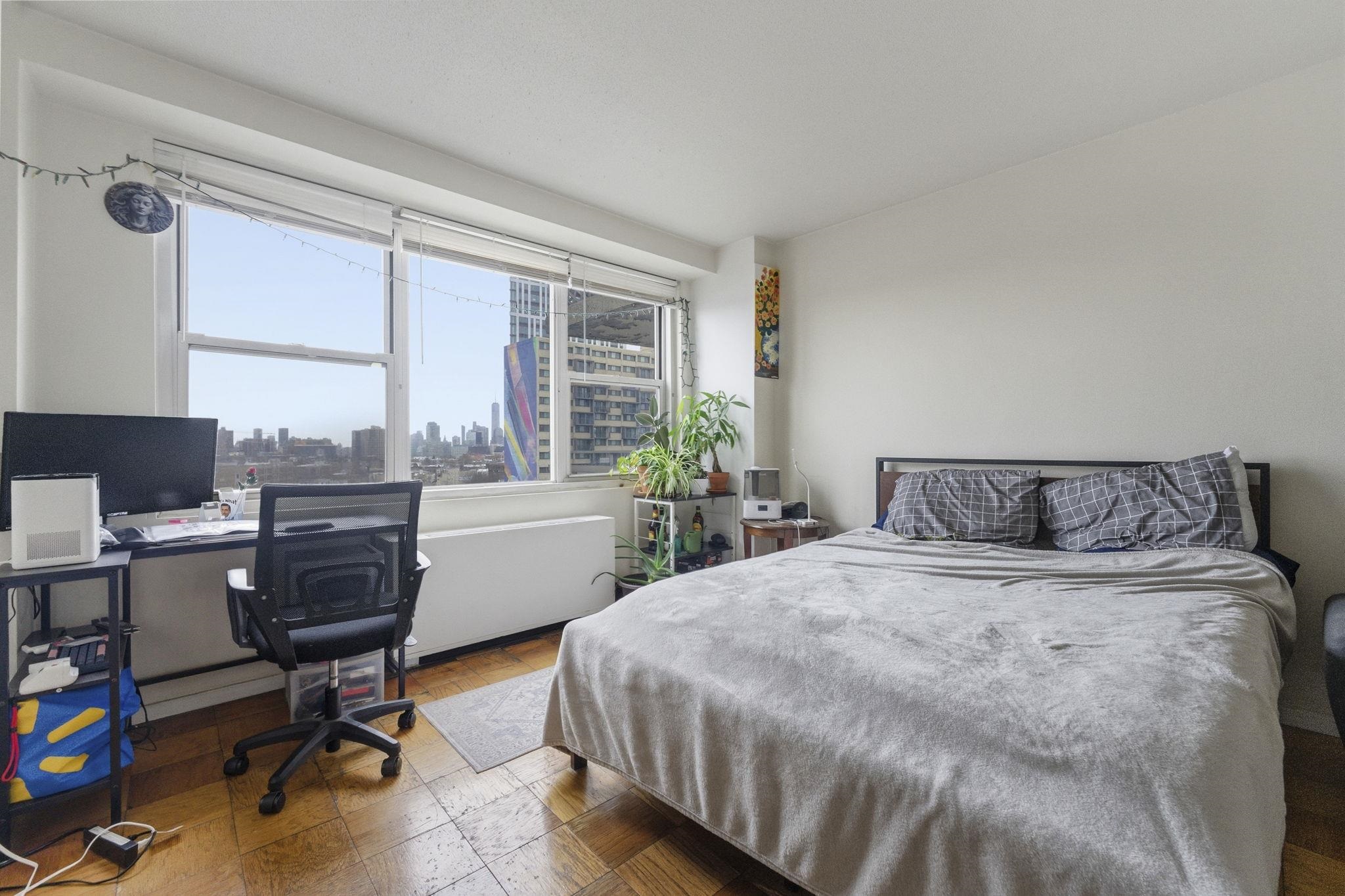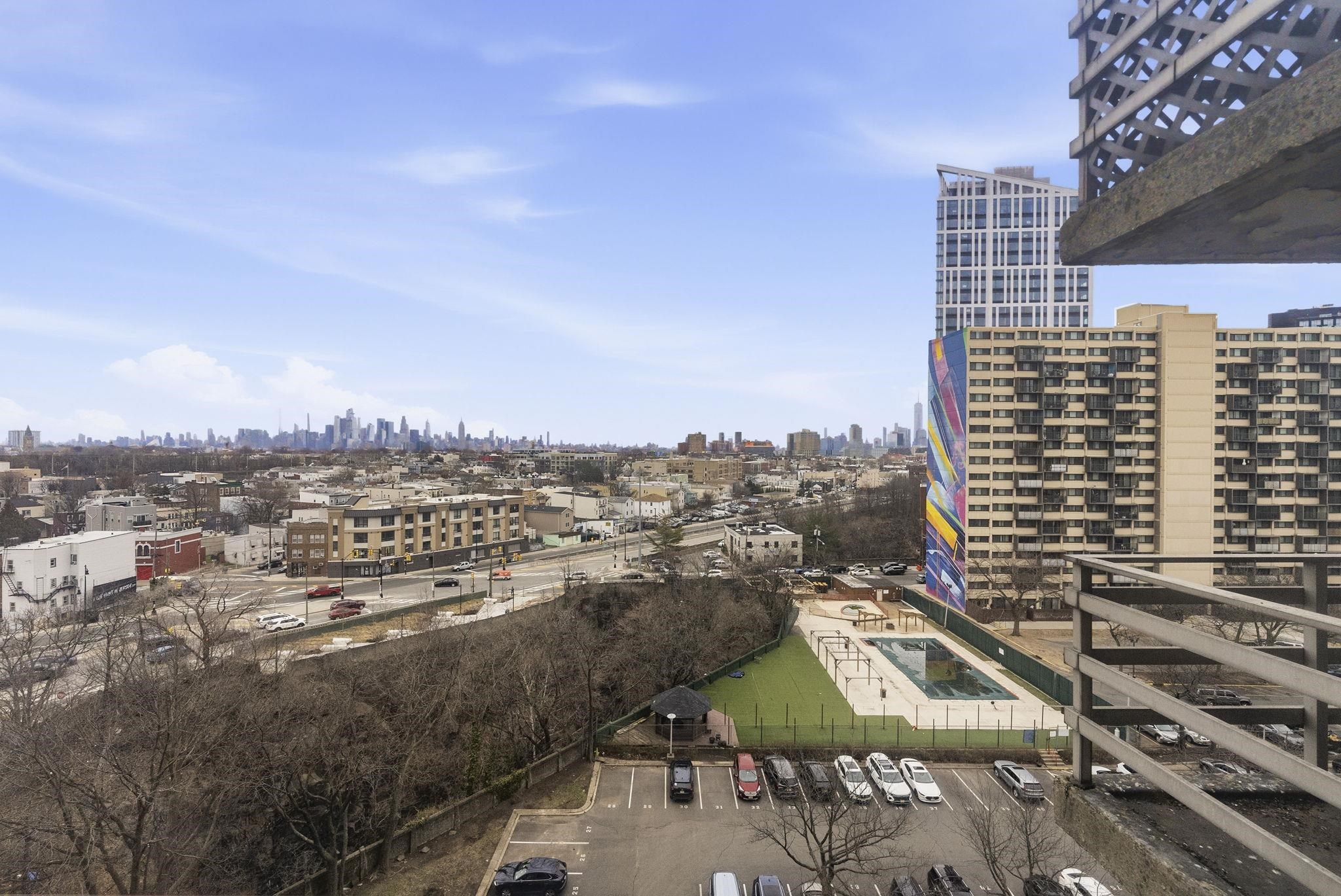 Discover this east-facing studio condominium in the heart of the vibrant new Journal Square, Jersey City. Bathed in morning light, this bright and spacious unit boasts panoramic NYC skyline views through large windows, creating a breathtaking backdrop for everyday living. The well-designed layout includes a full-size kitchen and plenty of closets for ample storage. Best of all, the HOA fee covers heat, hot water, gas, and central air conditioning, so you can enjoy truly worry-free living. Residents also benefit from 24-hour concierge service, an outdoor swimming pool, a peaceful meditation garden, and optional parking (additional fee). Ideally located just 4 blocks from the JSQ PATH Station, this home offers effortless access to Manhattan while being surrounded by the energy, dining, and excitement of one of Jersey City’s most dynamic neighborhoods. Don’t miss this rare opportunity to own your slice of the NYC skyline — schedule your viewing today!