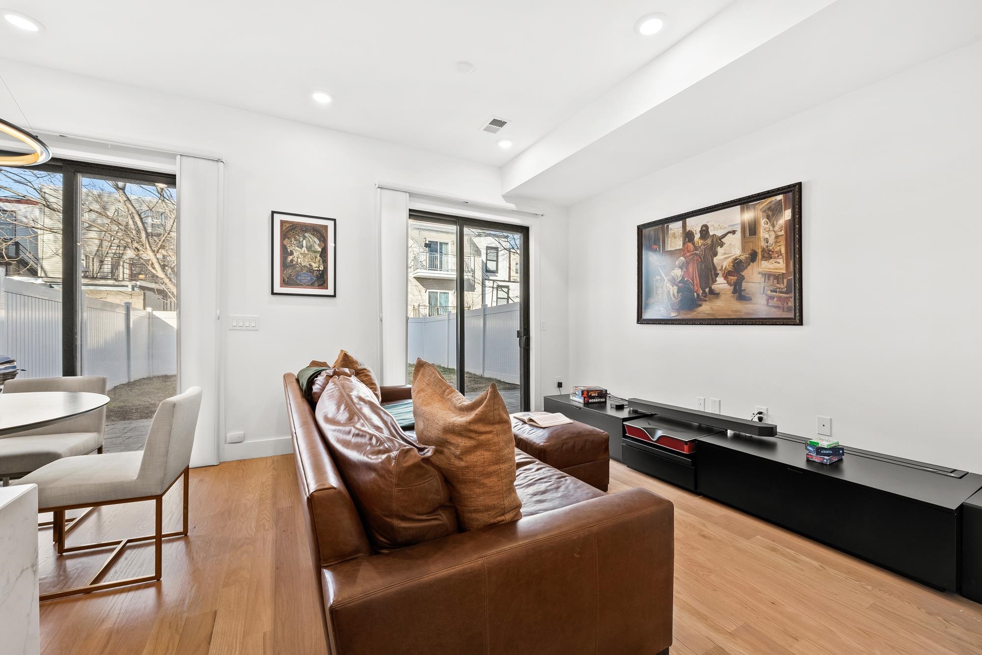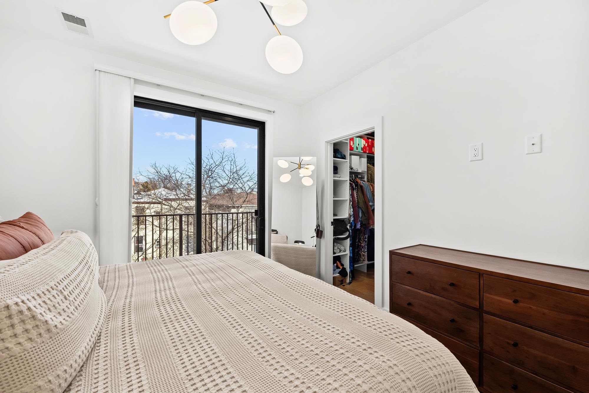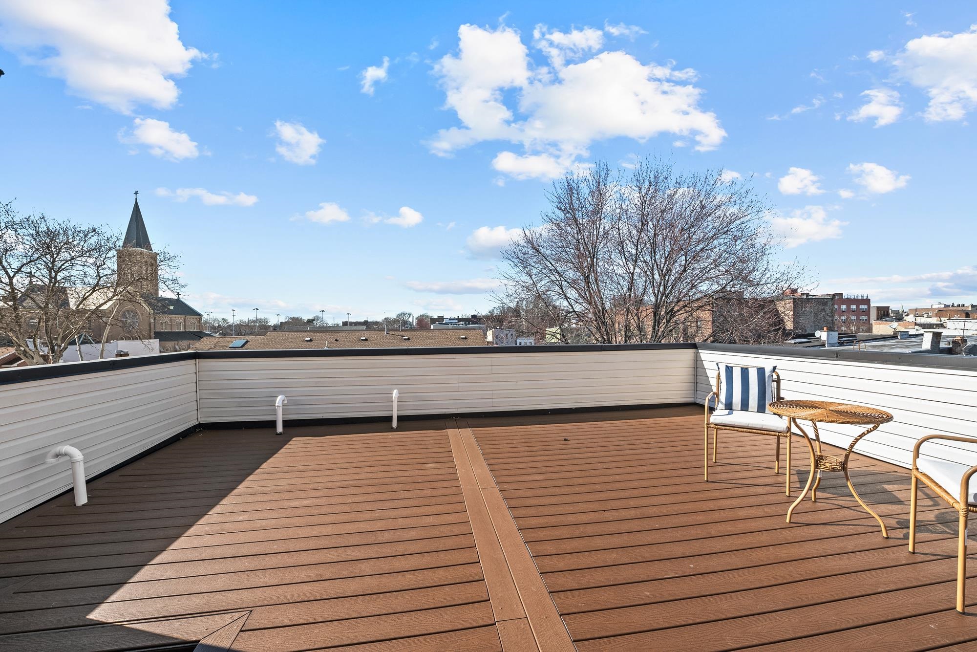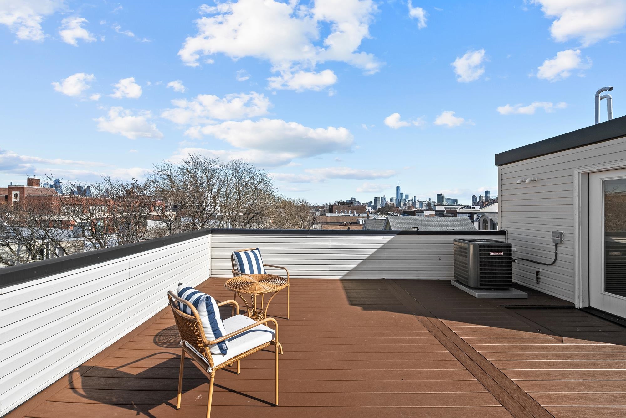 Welcome to 34 Manhattan Ave #2, a sprawling and meticulously designed 4-bedroom, 3-full, and 2-half bath condominium that redefines luxury living in the heart of Jersey City Heights. This multi-level residence seamlessly blends high-end custom finishes with the rare privilege of two distinct private outdoor retreats. From the moment you step inside, the home’s open-concept heart unfolds into an entertainer’s dream. The designer kitchen is a masterpiece of form and function, featuring white wood soft-close cabinetry, striking waterfall countertops with a breakfast bar, and a full suite of Samsung stainless appliances, complete with a vented hood, over-range pot filler, in-cabinet drawer microwave, and a dedicated wine fridge. Under-cabinet lighting and a tiled backsplash accentuate the space, while custom West Elm lighting in the living room leads you directly to your private backyard sanctuary. The second level is thoughtfully laid out to accommodate the modern lifestyle, currently featuring two versatile bedrooms utilized as a high-end home gym and a professional office. The gym-configured bedroom serves as a secondary suite, boasting a private Juliet balcony and an ensuite bathroom with a glass-enclosed shower. This floor also includes a well-appointed hallway bathroom with a soaking tub and the ultimate urban convenience: a dedicated laundry area with full-sized, stacked Samsung washer and dryer units. Throughout the home, custom window treatments from The Shade Store provide both privacy and a polished aesthetic. Ascending to the third floor, you’ll find the primary retreat, a true sanctuary designed for ultimate relaxation. The primary suite is anchored by a custom-built walk-in closet and a private Juliet balcony, with elegant West Elm lighting overhead. Its spa-like ensuite bathroom features a massive glass-enclosed shower with a built-in bench and a sleek double vanity. This level is rounded out by a fourth bedroom (currently used as an office) and a convenient hallway half-bath, ensuring every inch of the home is utilized for maximum comfort. The crowning jewel of this residence is found just one flight up: a private roof deck offering breathtaking, unobstructed views of the New York City skyline. Whether you are hosting summer gatherings against the backdrop of Manhattan or enjoying a quiet evening under the stars, this outdoor space is a rare find in the Heights. With its sophisticated custom upgrades and expansive floor plan, 34 Manhattan Ave #2 offers a truly elevated living experience in one of the city's most vibrant neighborhoods. Parking available nearby for an additional fee.