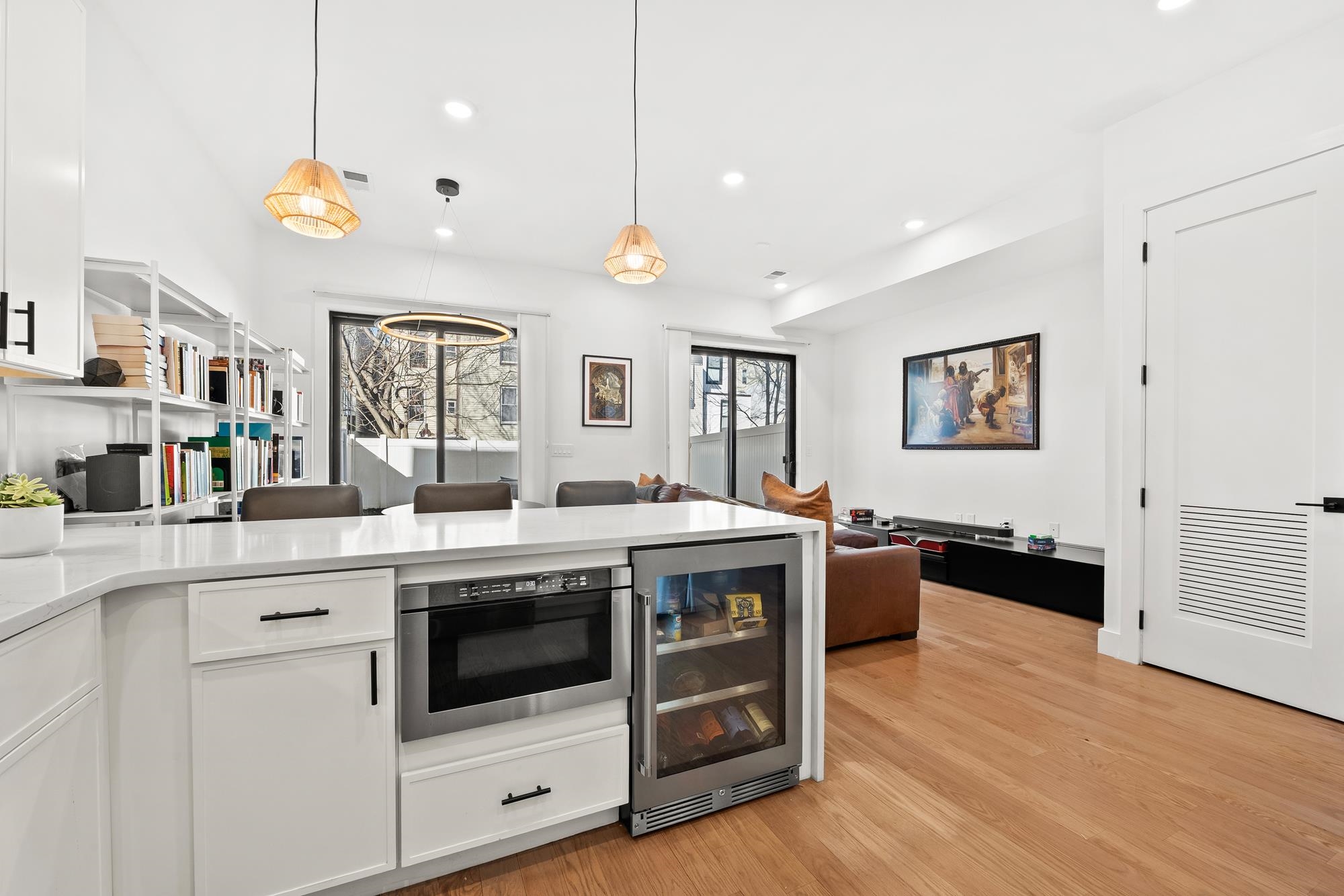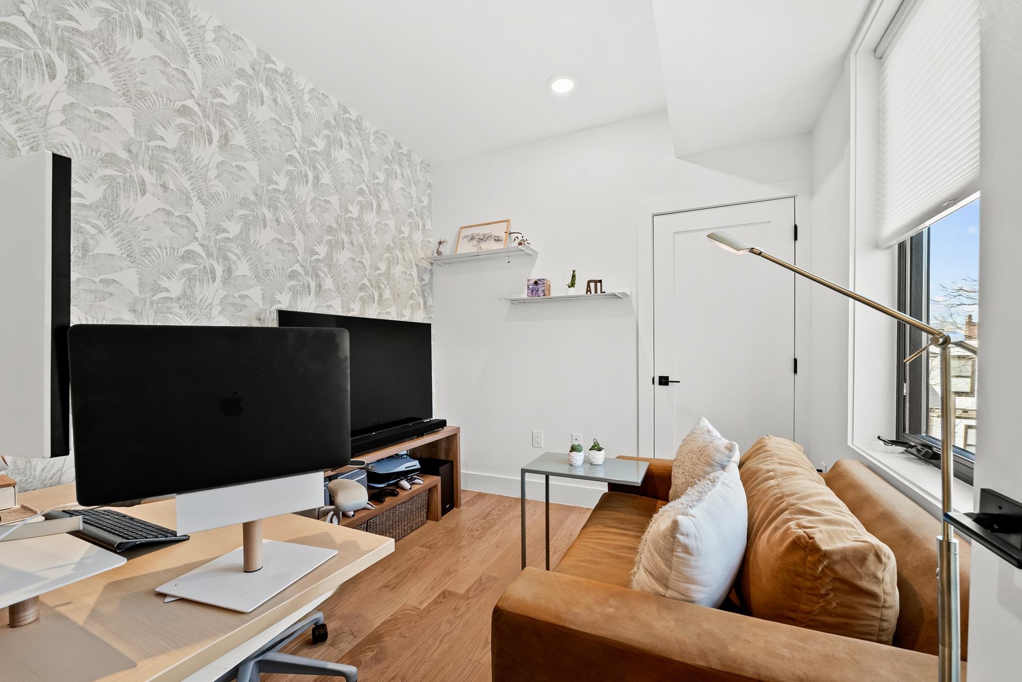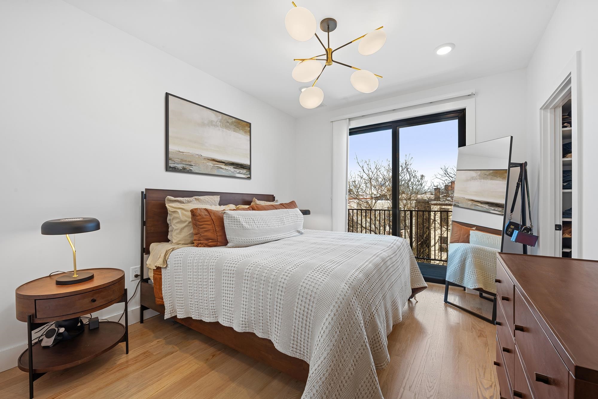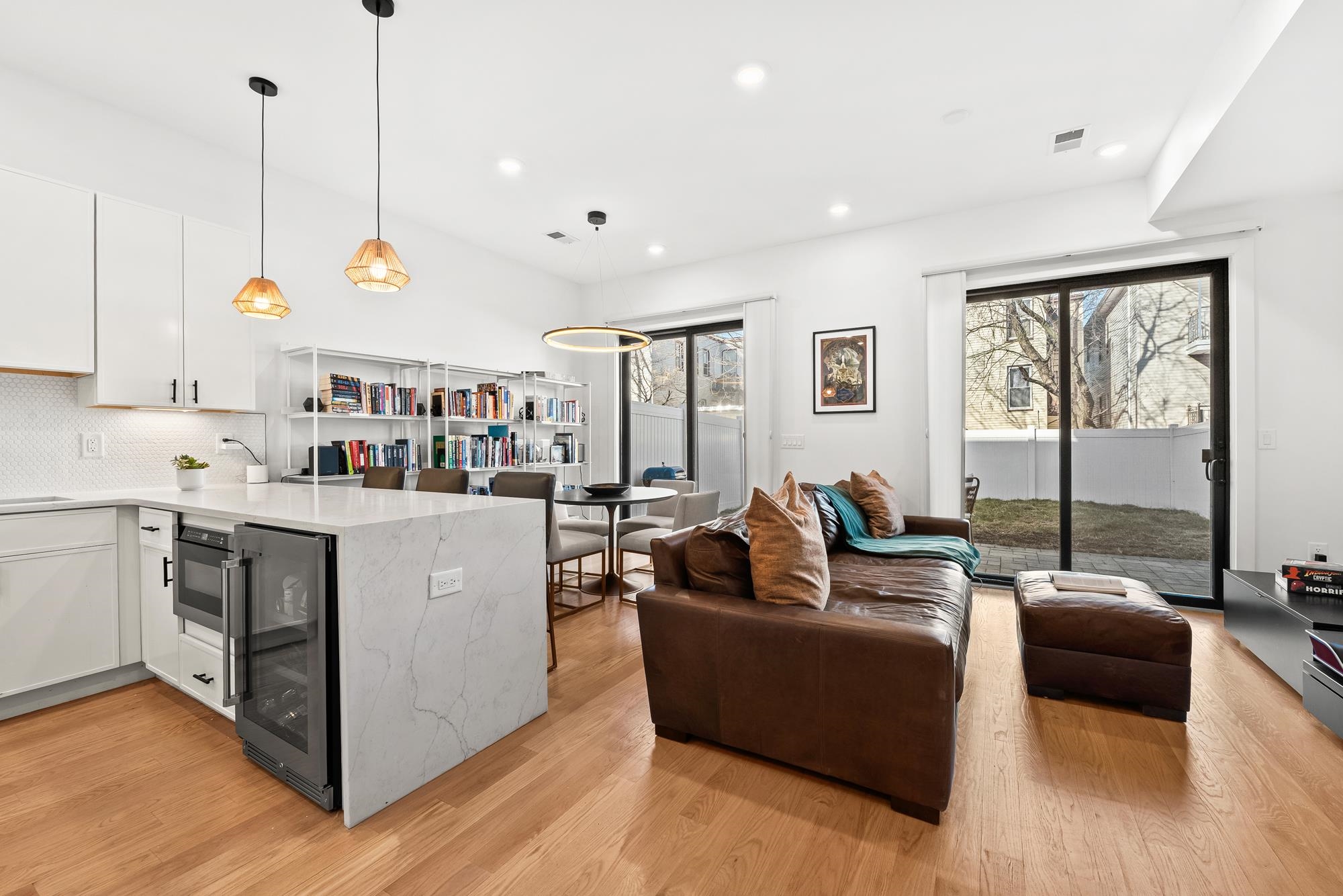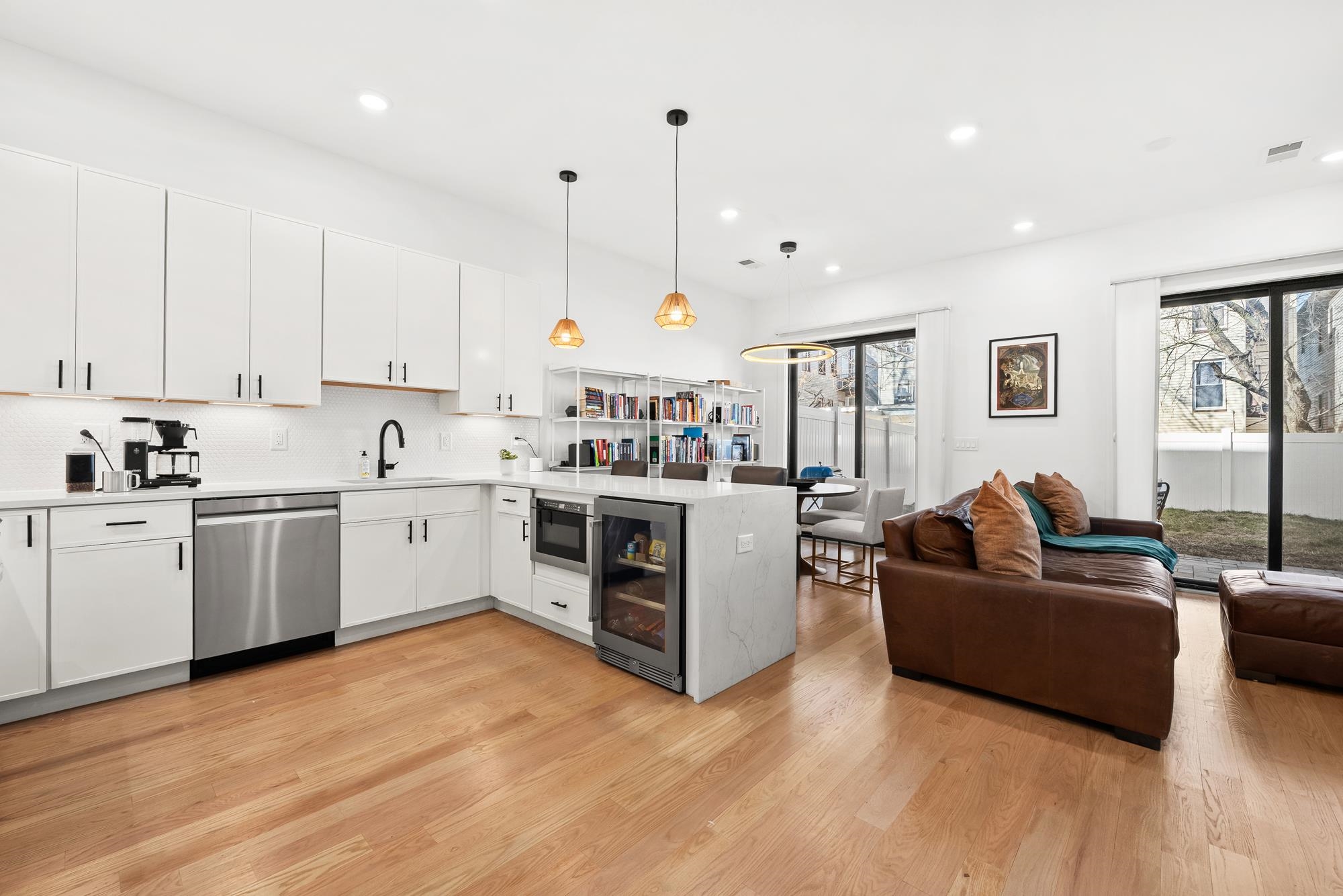 Welcome to 34 Manhattan Ave #2, a sprawling and meticulously designed 4-bedroom, 3-full, and 2-half bath condominium that redefines luxury living in the heart of Jersey City Heights. This multi-level residence seamlessly blends high-end custom finishes with the rare privilege of two distinct private outdoor retreats. From the moment you step inside, the home’s open-concept heart unfolds into an entertainer’s dream. The designer kitchen is a masterpiece of form and function, featuring white wood soft-close cabinetry, striking waterfall countertops with a breakfast bar, and a full suite of Samsung stainless appliances, complete with a vented hood, over-range pot filler, in-cabinet drawer microwave, and a dedicated wine fridge. Under-cabinet lighting and a tiled backsplash accentuate the space, while custom West Elm lighting in the living room leads you directly to your private backyard sanctuary. The second level is thoughtfully laid out to accommodate the modern lifestyle, currently featuring two versatile bedrooms utilized as a high-end home gym and a professional office. The gym-configured bedroom serves as a secondary suite, boasting a private Juliet balcony and an ensuite bathroom with a glass-enclosed shower. This floor also includes a well-appointed hallway bathroom with a soaking tub and the ultimate urban convenience: a dedicated laundry area with full-sized, stacked Samsung washer and dryer units. Throughout the home, custom window treatments from The Shade Store provide both privacy and a polished aesthetic. Ascending to the third floor, you’ll find the primary retreat, a true sanctuary designed for ultimate relaxation. The primary suite is anchored by a custom-built walk-in closet and a private Juliet balcony, with elegant West Elm lighting overhead. Its spa-like ensuite bathroom features a massive glass-enclosed shower with a built-in bench and a sleek double vanity. This level is rounded out by a fourth bedroom (currently used as an office) and a convenient hallway half-bath, ensuring every inch of the home is utilized for maximum comfort. The crowning jewel of this residence is found just one flight up: a private roof deck offering breathtaking, unobstructed views of the New York City skyline. Whether you are hosting summer gatherings against the backdrop of Manhattan or enjoying a quiet evening under the stars, this outdoor space is a rare find in the Heights. With its sophisticated custom upgrades and expansive floor plan, 34 Manhattan Ave #2 offers a truly elevated living experience in one of the city's most vibrant neighborhoods. Parking available nearby for an additional fee.