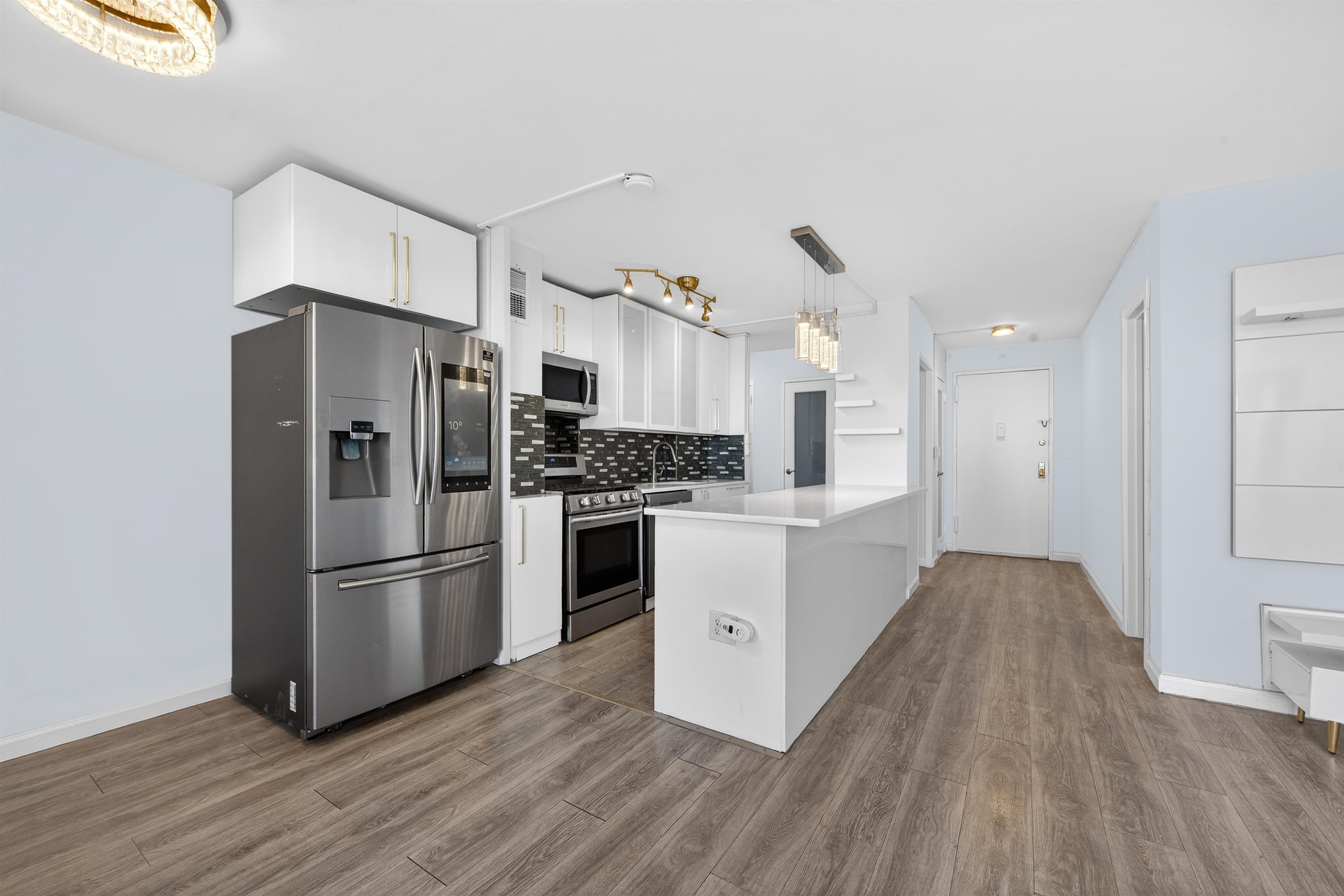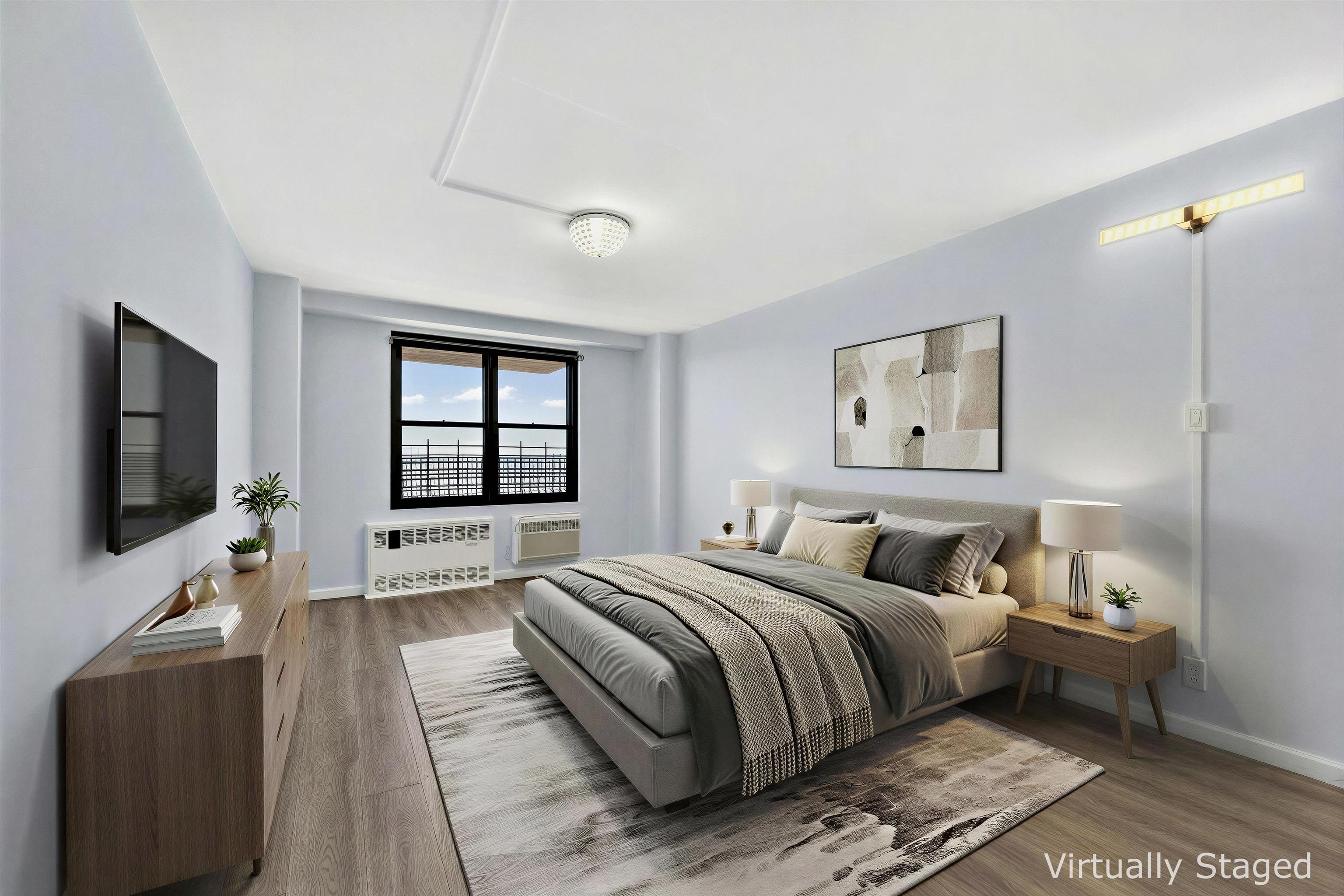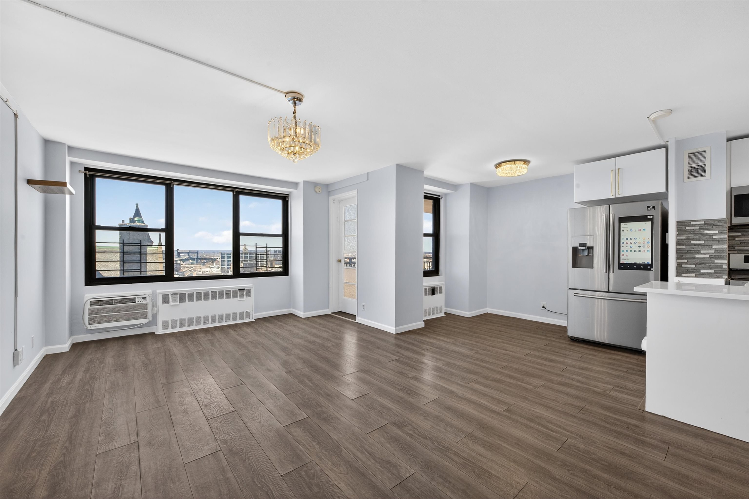 Welcome to Residence 8J, a spacious and beautifully maintained 1-bedroom + Den, 1-bath condo located on the 8th floor of one of Journal Square’s most desirable full-service buildings. Offering approximately 958 square feet of thoughtfully designed living space, this sun-filled home features oversized windows, an open-concept layout, and a private balcony, perfect for morning coffee or evening relaxation with open sky views. Updated kitchen featuring stainless steel appliances, a smart refrigerator, and generous cabinetry ideal for both everyday living and entertaining. Just off the kitchen are three impressive walk-in storage closets, providing exceptional space rarely found in condo living and perfect for pantry use or additional organization. A dedicated home office nook is wired for high-speed Verizon Fios, creating an ideal setup for today’s work-from-home lifestyle. With nearly 1,000 square feet, the flexible layout also allows the den or living configuration to be adapted to suit your needs. Updated bathroom offering a clean, modern aesthetic that complements the home’s bright and comfortable design. Heat and hot water are included in the monthly HOA fee, adding both convenience and value. Residents enjoy a full-service lifestyle with amenities that include a 24-hour concierge, fitness center, swimming pool, on-site laundry, and option to rent a parking spot for $110/month. Ideally located just moments from the PATH at Journal Square, providing quick access to Manhattan while placing you in the center of one of Jersey City’s fastest-growing neighborhoods, surrounded by restaurants, cafés, shopping, and local favorites. Residence 8J presents a rare opportunity for buyers seeking space, convenience, and lifestyle in a prime Jersey City location.