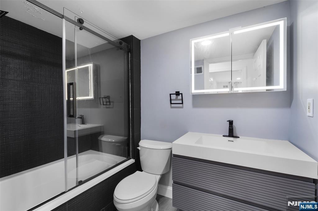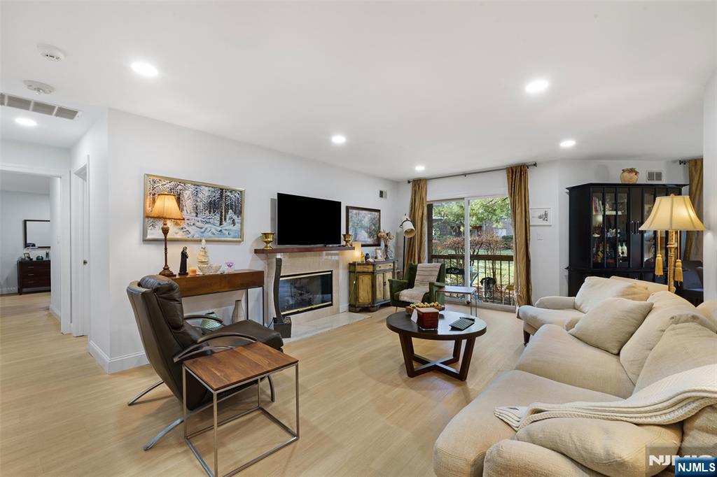 Set within the Tulip Gardens community, this first-floor condo offers a fully updated interior paired with a comfortable layout designed for everyday living. The renovated kitchen features granite countertops, rich cabinetry, stainless steel appliances, and generous prep and storage space, flowing seamlessly into the dining and living areas. Wide-plank flooring throughout enhances the clean, modern aesthetic. The living room is bright and inviting, offering ample space for both relaxing and entertaining, with direct access to a covered porch that extends the living space outdoors. The spacious primary bedroom includes a large walk-in closet and a private en-suite bathroom. Both bathrooms have been thoughtfully updated with contemporary finishes, including sleek floating vanities, modern fixtures, and refined tilework. Recessed lighting and neutral finishes throughout contribute to the home's move-in-ready appeal. Ideally positioned just steps from the NYC bus at the town center, with easy access to the train station and only minutes from Montclair and Upper Montclair's dining and shopping destinations.
