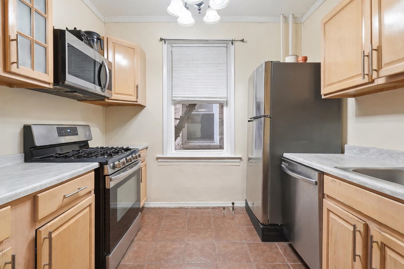 Welcome to North Bergen! This 1-bed, 1-bath condo unit offers a spacious living area, ideal for entertaining. The open-concept dining area flows seamlessly into the kitchen, complete with stainless steel appliances, including a dishwasher, ample storage, and plenty of counter space for meal prep. The sun-filled bedroom features an oversized closet with additional storage on top, providing both style and functionality. Residents enjoy the convenience of onsite laundry and a well-maintained building. Step outside to James J. Braddock Park, right across the street, for outdoor activities and relaxation. With local shops, restaurants, cafes, and public transportation nearby, this location offers easy access to NYC and the surrounding areas. Perfect for anyone seeking a stylish, low-maintenance home in a vibrant community.