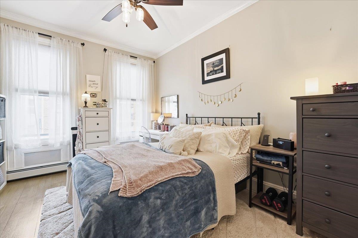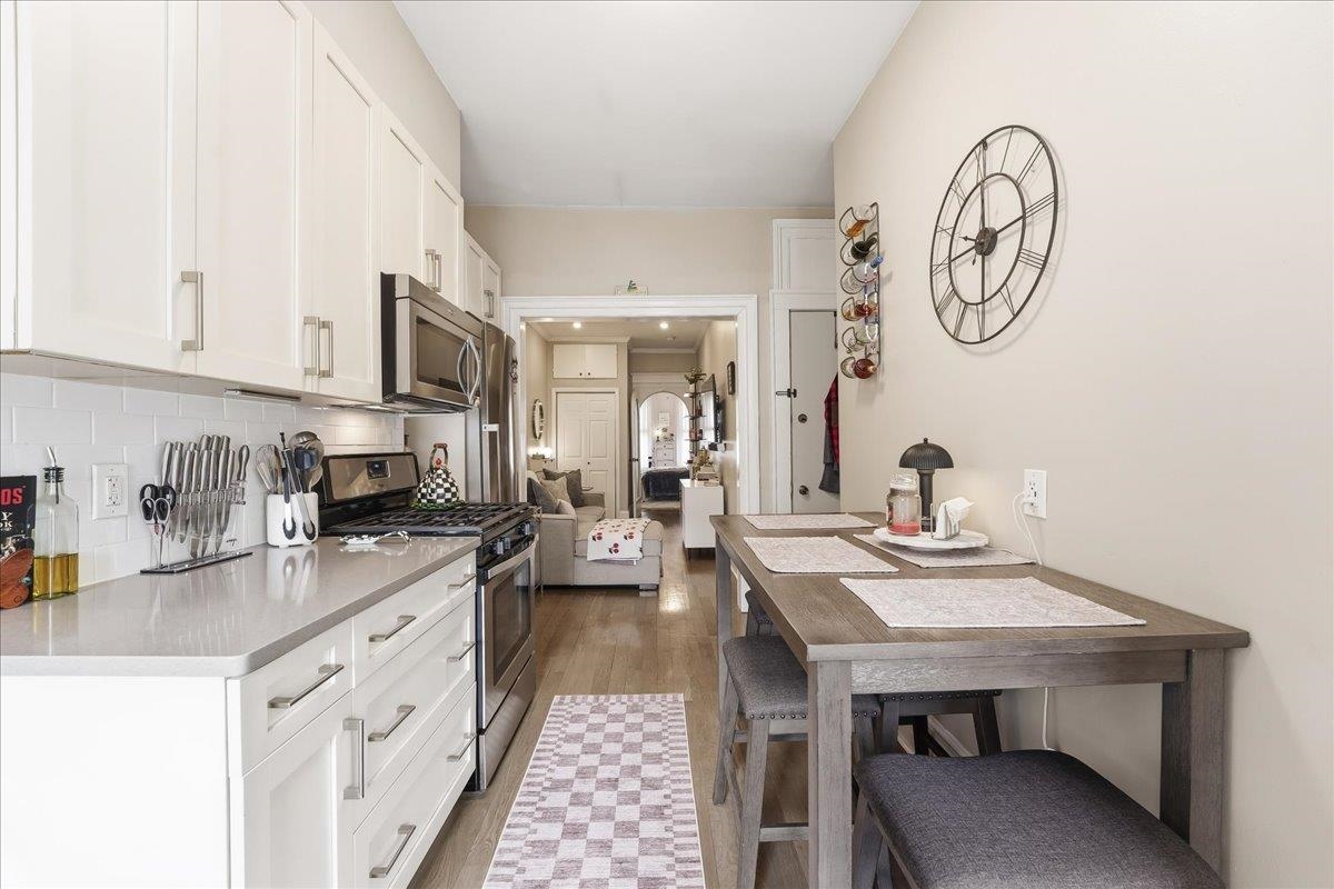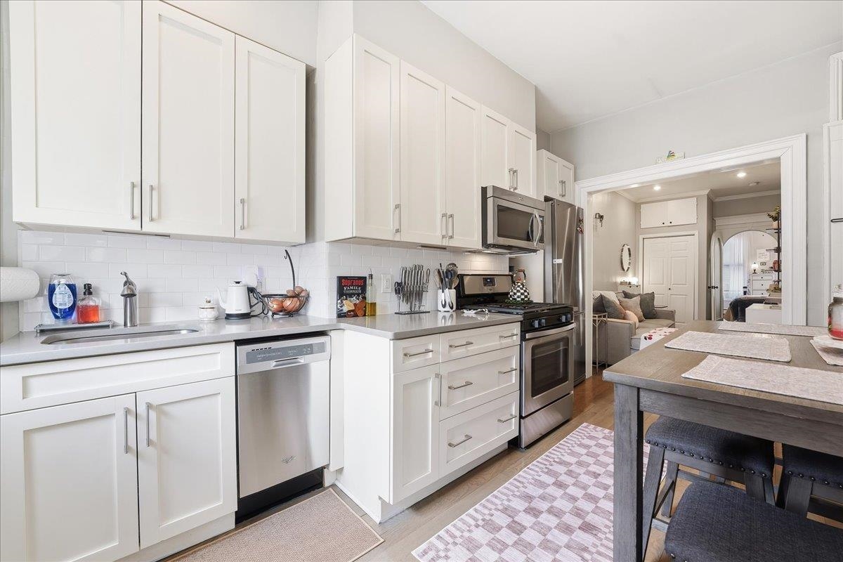 Welcome to this impeccably maintained 1-bedroom, 1-bathroom condo offering 600 square feet of sophisticated living space in a classic pre-war building. This turnkey residence is truly ready for you to move right in, featuring brand-new flooring throughout and a total renovation of both the kitchen and bathroom. The sleek kitchen is a chef's delight, complete with premium quarts countertops and high-end stainless steel appliances. Residents enjoy the ultimate convenience of an on-site washer and dryer within the building. Perfectly situated for the modern commuter, you are just minutes from the Hudson-Bergen Light Rail and the PATH for an easy commute to NYC, with quick access to all major highways. Embrace the best of Mile Square City living with Hoboken’s world-class restaurants, vibrant bars, boutique shopping, and lush waterfront parks right at your doorstep. Experience the perfect blend of historic character and modern luxury in this must-see home.