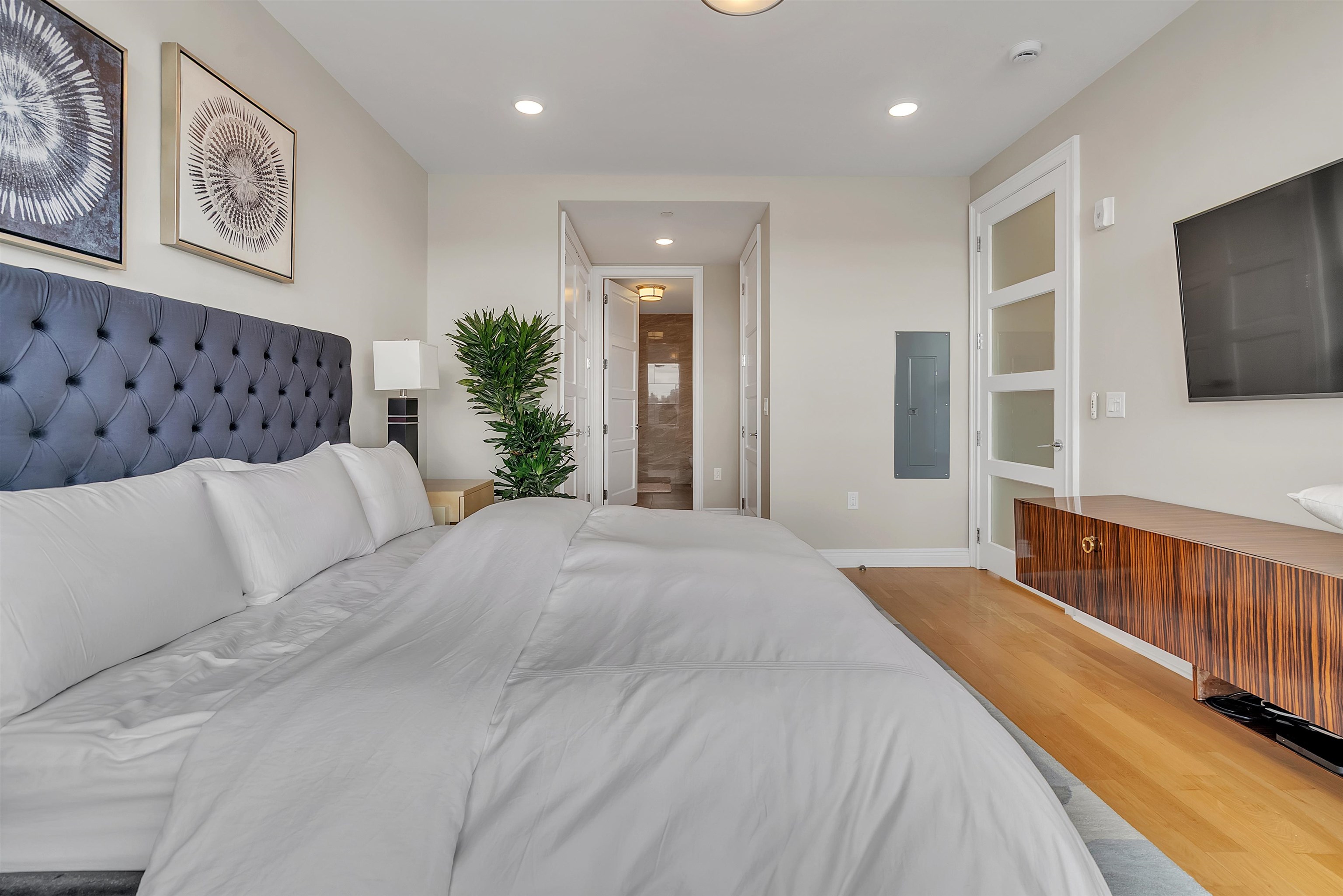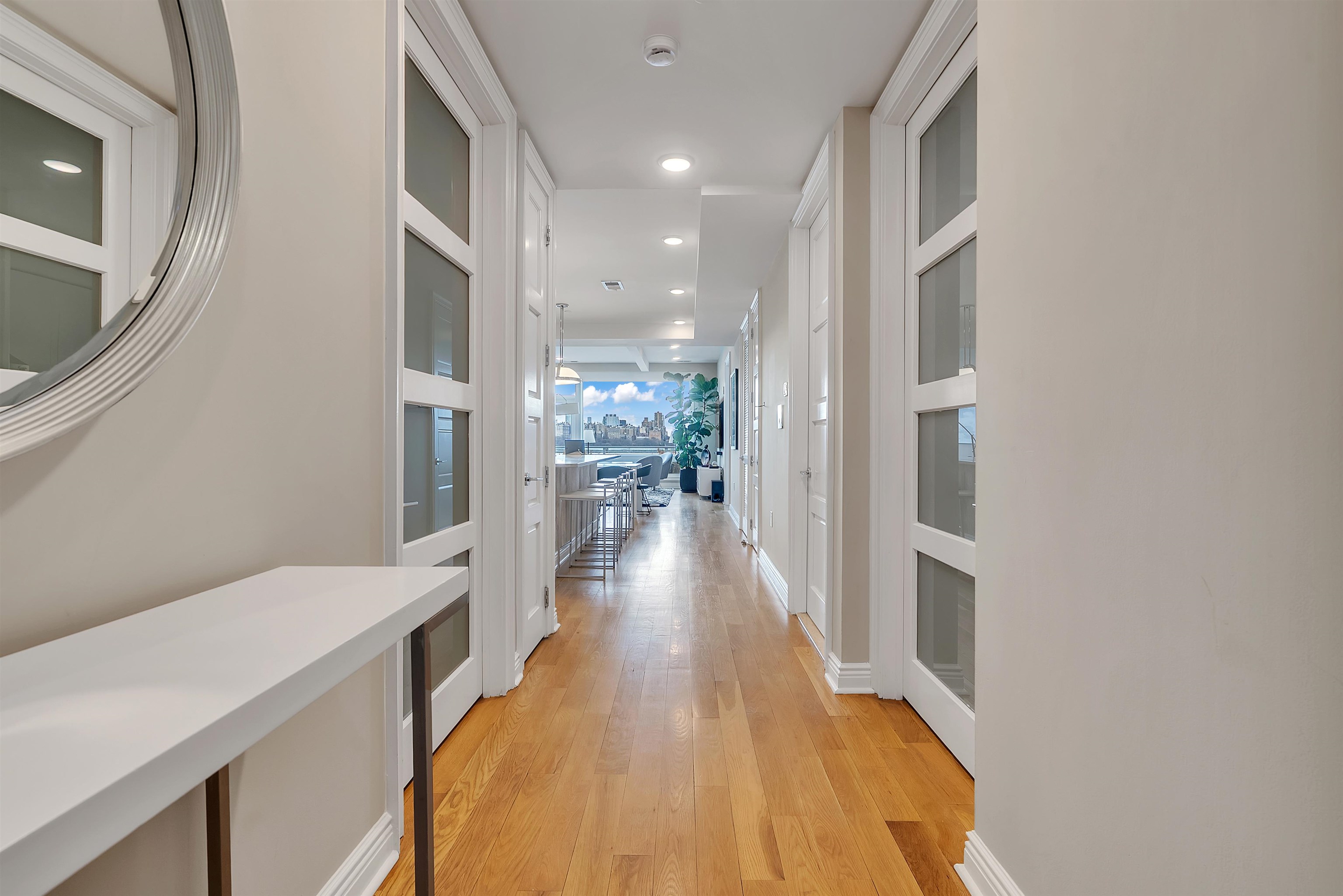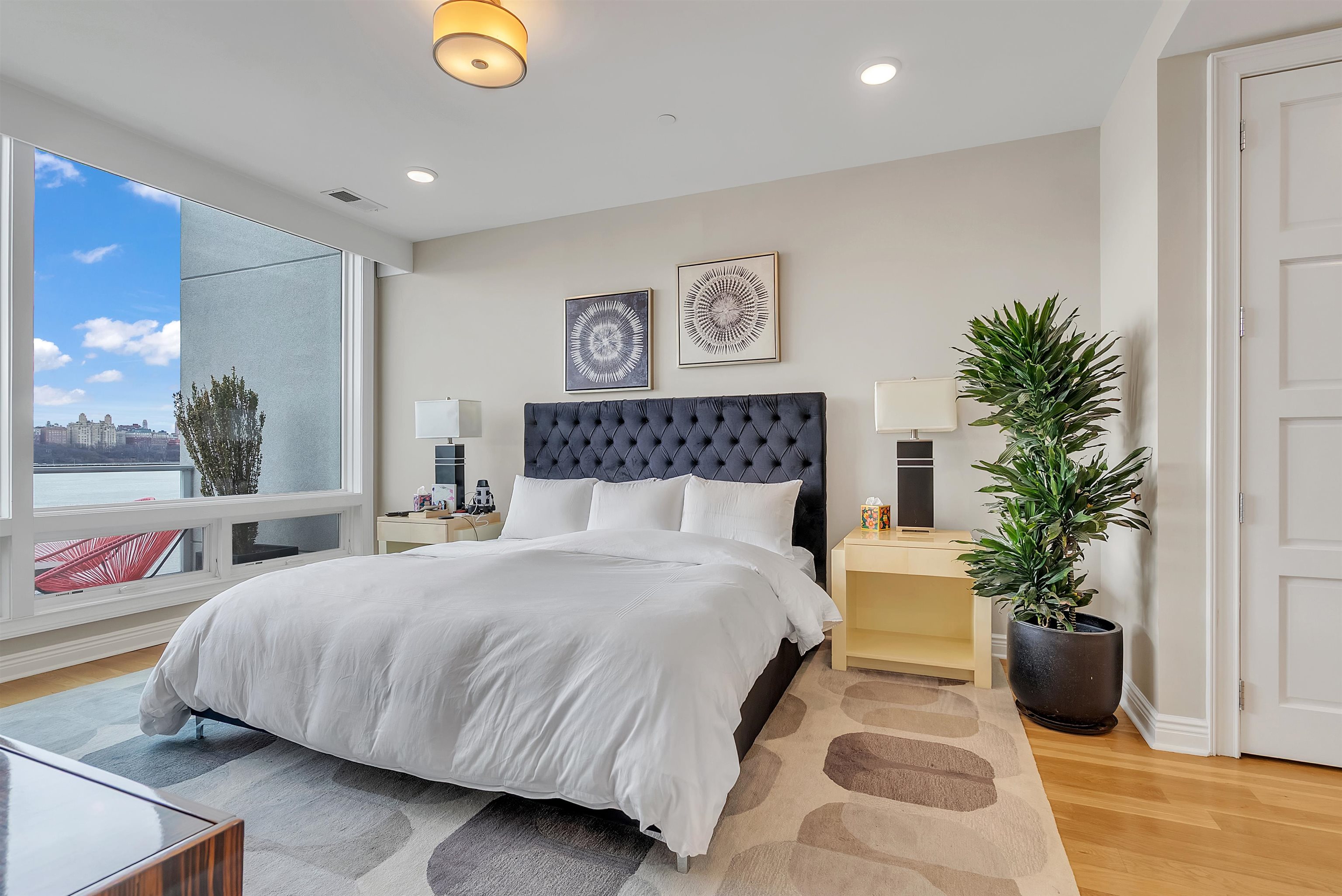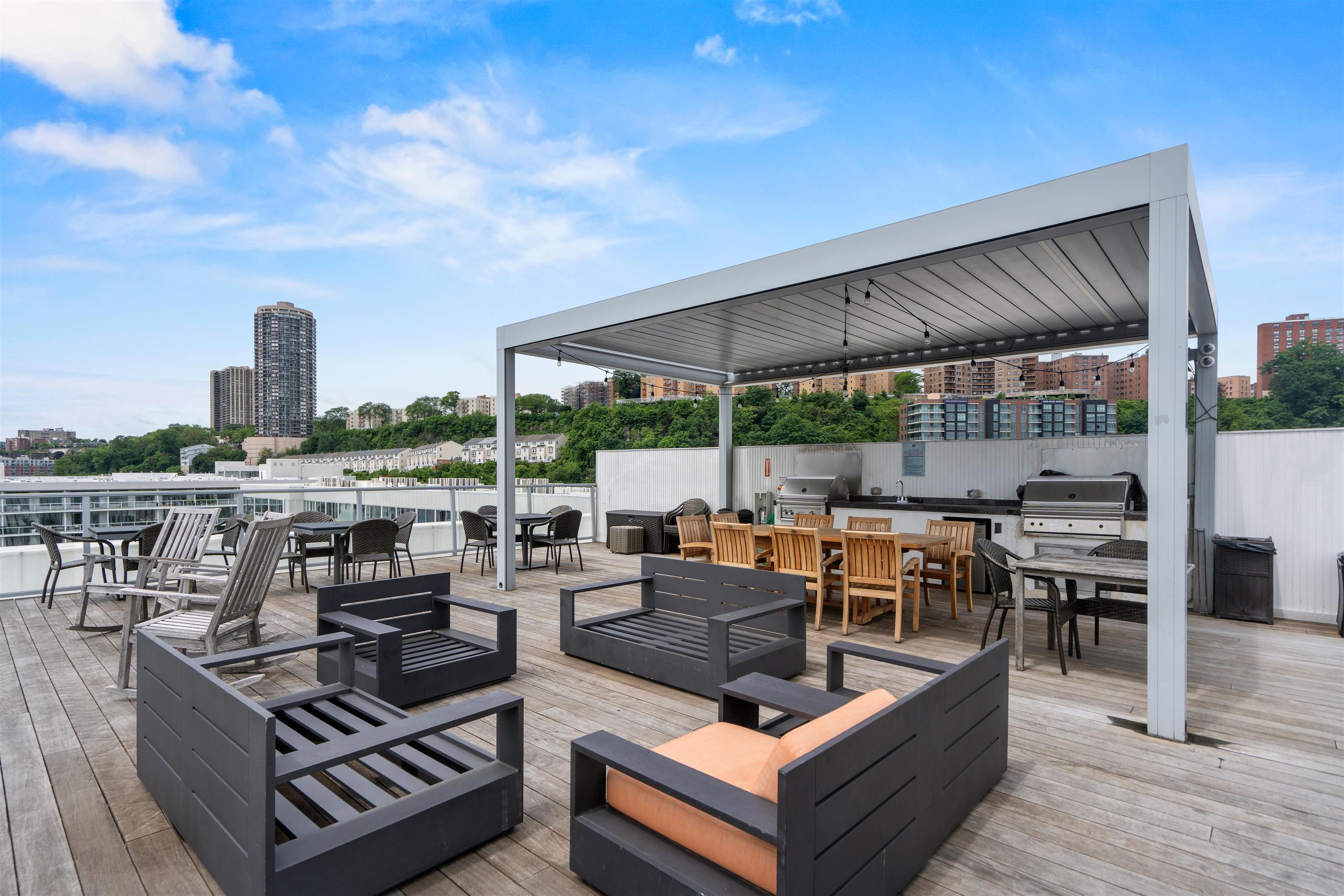 Perched on the top floor, this exceptional 3-bedroom, 2-bath residence offers a rare combination of elevated living, refined finishes, and sweeping NYC skyline views from nearly every room. Spanning approximately 1,430 square feet, the home features soaring ceilings and expansive windows that flood the space with natural light, enhancing the perfectly designed layout. The open-concept living and dining area flows seamlessly, ideal for both everyday living and entertaining, while the chef’s kitchen is appointed with top-of-the-line appliances, sleek cabinetry, and premium finishes throughout. Each bedroom is generously sized, including a stunning primary suite with a spa-inspired bath designed for comfort and relaxation. Step outside to your private east-facing balcony, an incredible highlight, where unobstructed skyline views create the perfect setting for morning coffee or evening unwinding. Top-floor positioning offers added privacy and exclusivity rarely available in the building. Set within a highly desirable, amenity-rich community, this residence delivers the perfect blend of luxury, space, and lifestyle.