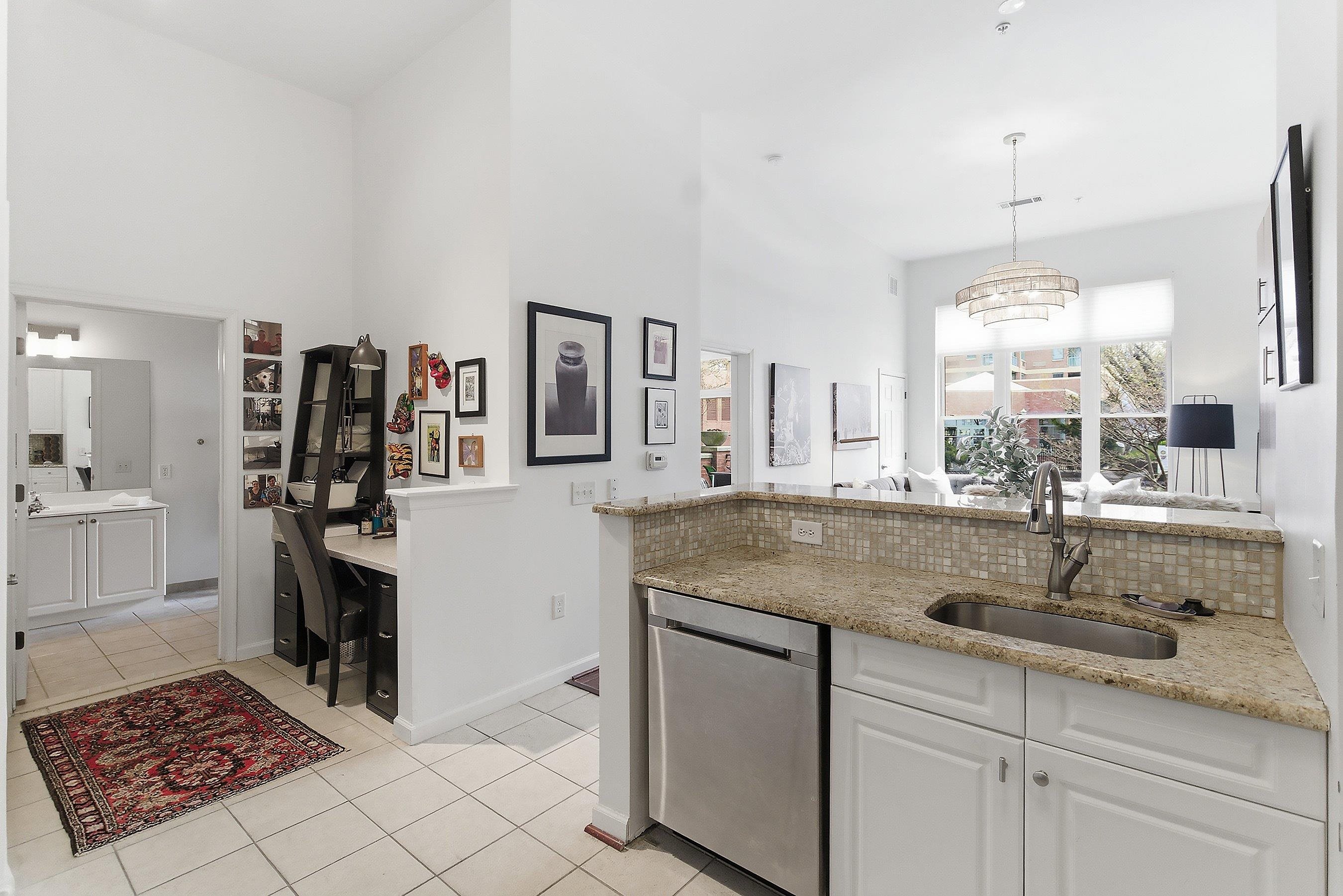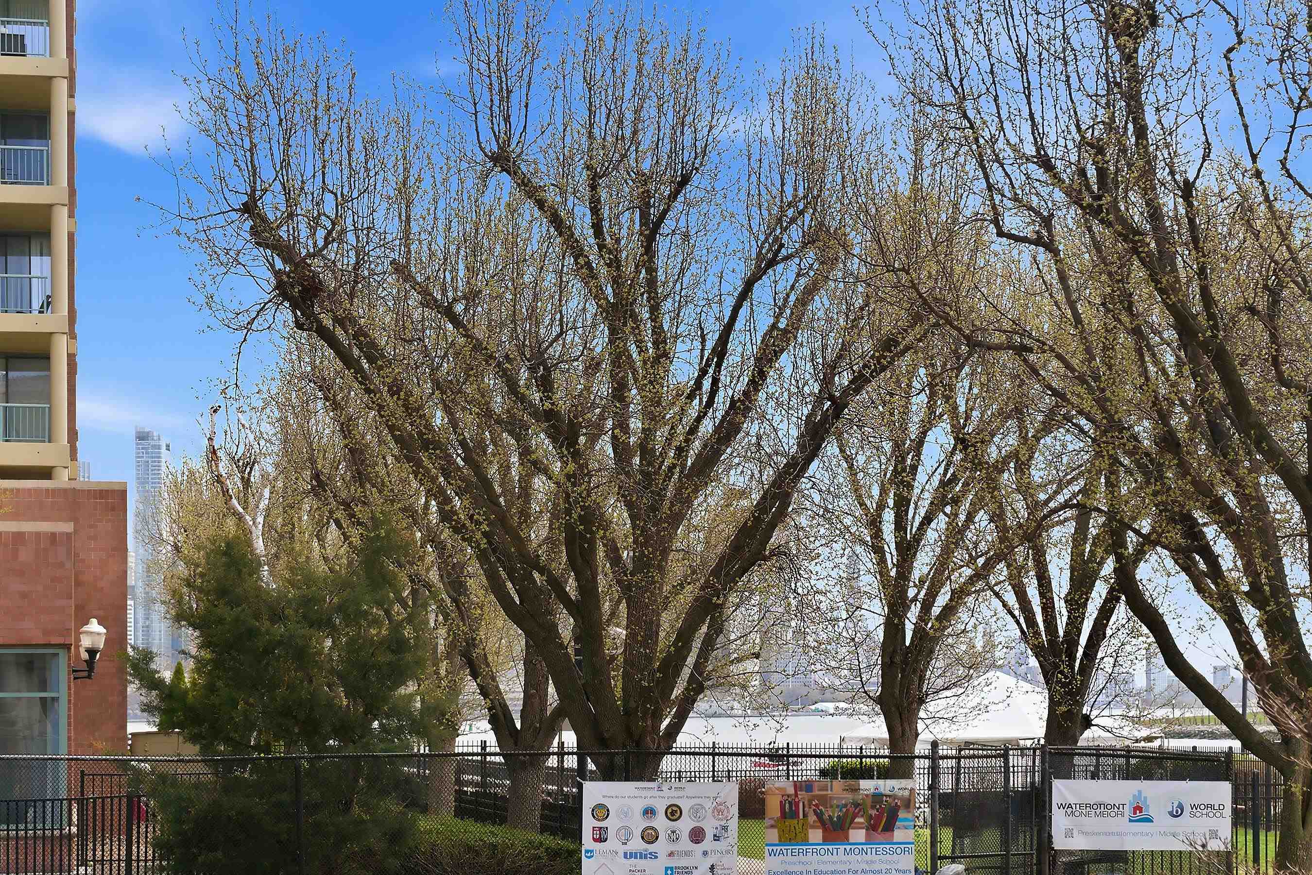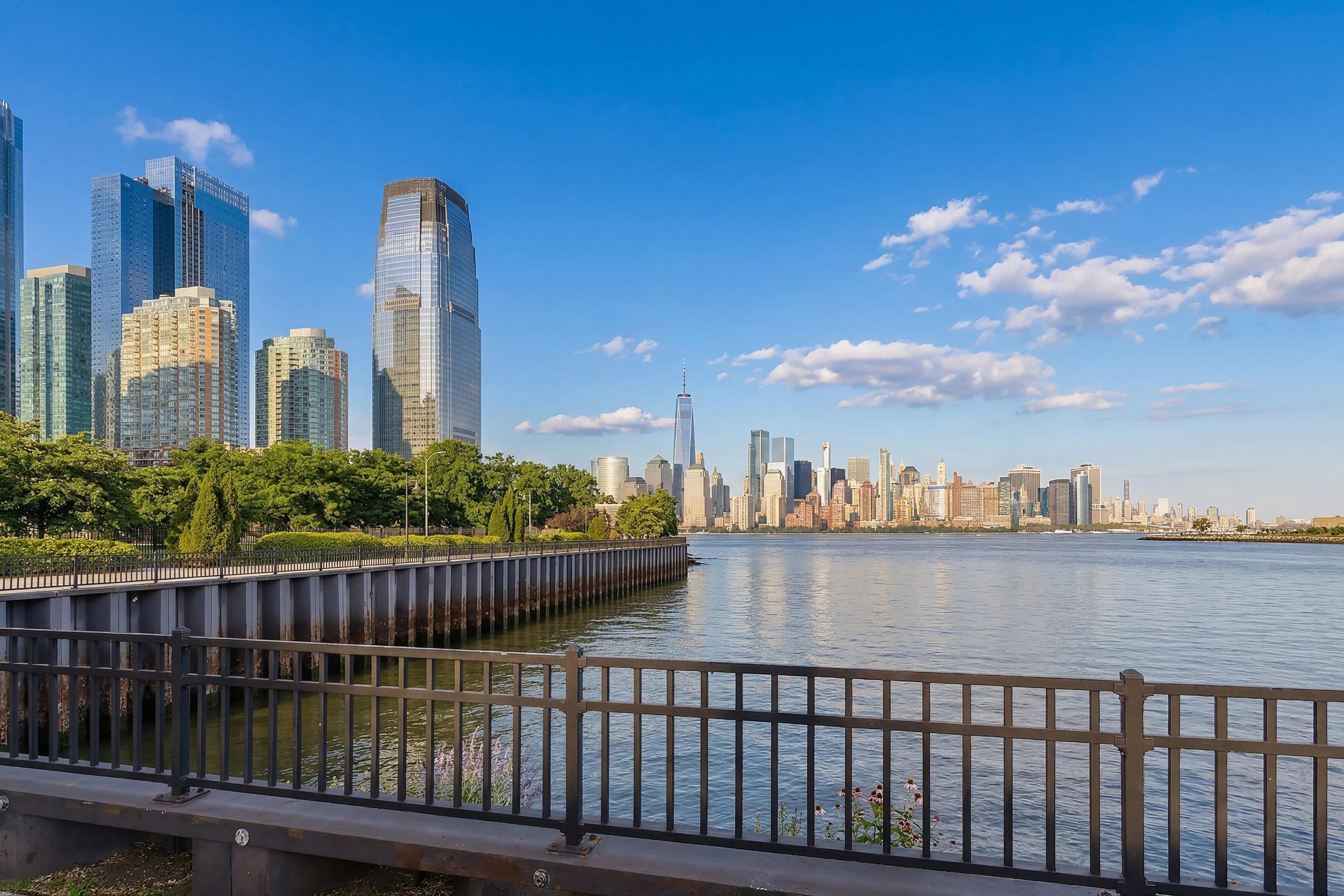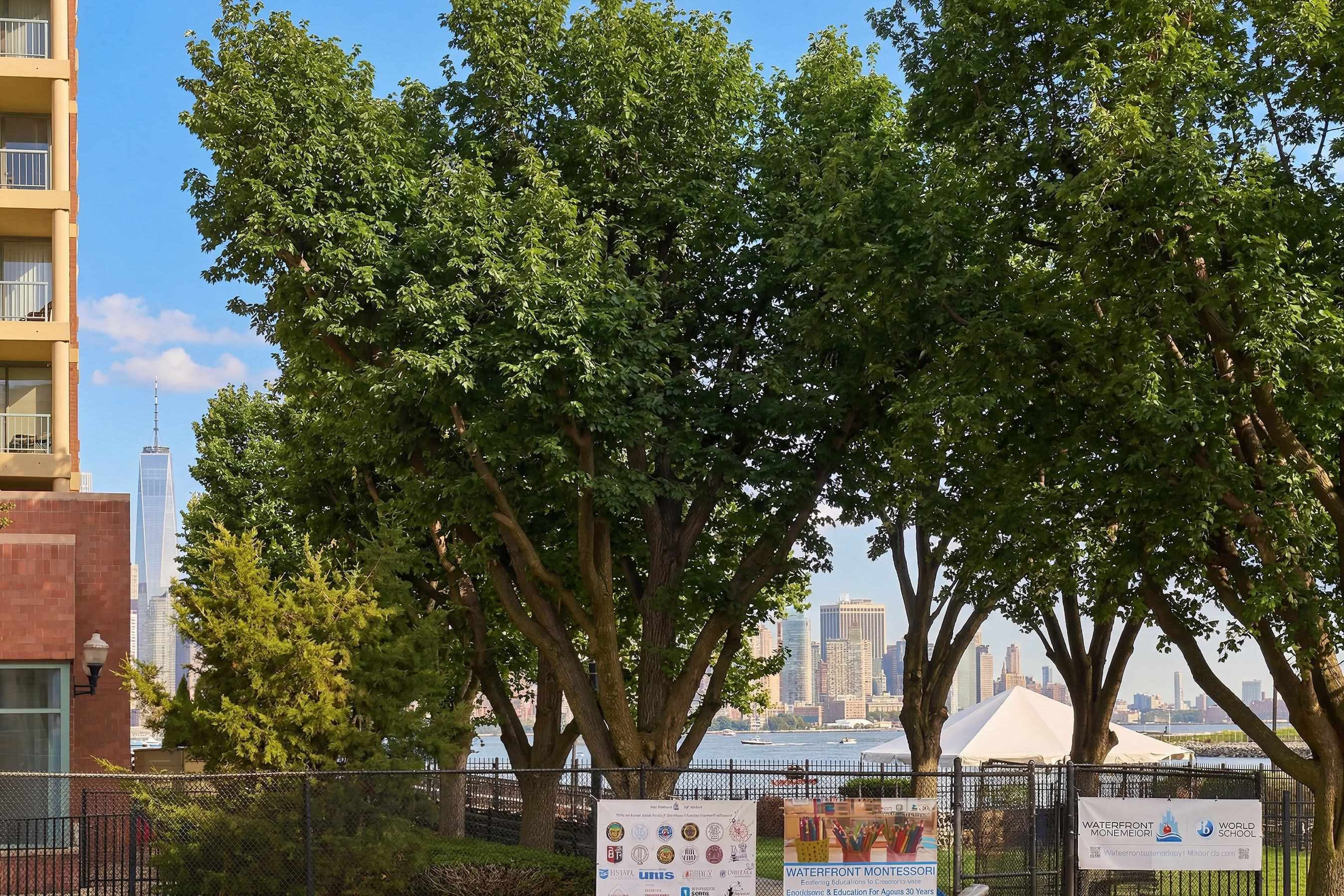 Just Listed - Pier House - Your Bucket List Fulfilled! rare private garage parking • full-size in-unit washer & dryer • balcony with water + partial NYC skyline view • 13' ceilings, build-it office. Step inside this striking, sunlit residence in the heart of Paulus Hook. All the drama awaits as you enter to expansive living/dining with soaring 13' ceilings and floor-to-ceiling windows that frame water views and a glimpse of the Manhattan skyline. Boho style fixtures with gleaming wood flooring throughout the home. Kitchen features generous granite workspaces, breakfast bar and stainless-steel appliances. Cabinets are extra tall for storage. This kitchen flows into a built-in home office area—perfect for remote work without sacrificing style. The primary suite includes a generous walk-in closet. Practical luxury continues with a full-size washer and dryer in the home and the extremely rare convenience of dedicated garage parking. Bedroom offers ceiling fan and custom walk-in closet also adored by oversized windows. Two entrance bathroom with large vanity space. Full-service building amenities include a 24/7 doorman, a well-equipped gym, and a pool—everything you expect from an upscale residence. Located on highly desirable block in Paulus Hook, you’re steps from waterfront parks, dining, transit, and Manhattan ferries. Has it all.
