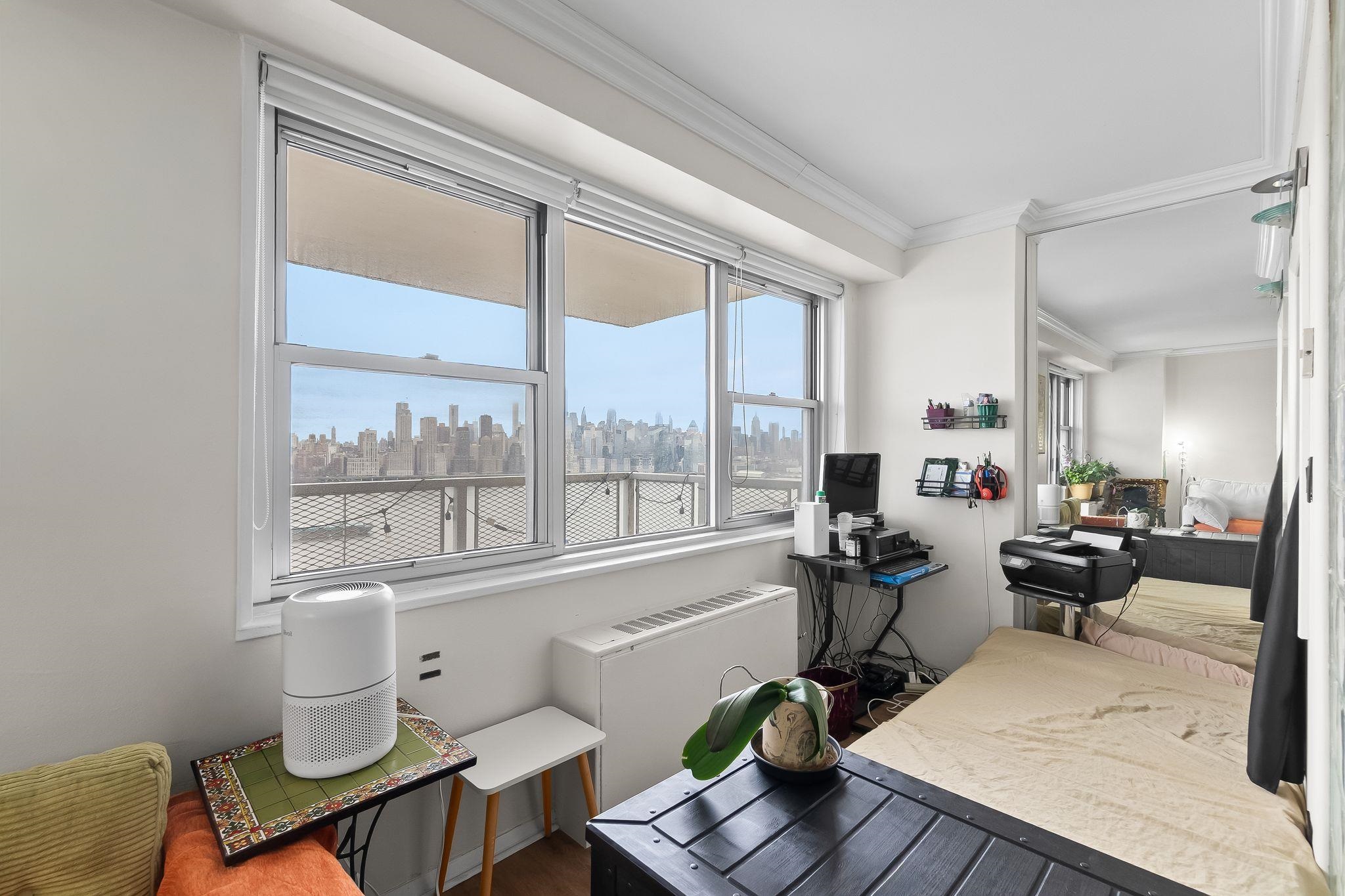 Perched along the highly sought after Boulevard East corridor, this junior one bedroom in the coveted 'A' line offers truly unobstructed, panoramic views of the Manhattan skyline, an ever changing backdrop of the Hudson River, Midtown, and beyond that is nothing short of breathtaking, day or night. Located at 6600 Boulevard East, this full service co-op places you at the heart of one of Hudson County’s most desirable waterfront communities. Enjoy immediate access to NYC via NJ Transit just steps from your door, along with nearby parks, waterfront promenades, and a vibrant local dining scene. Inside, the thoughtfully designed layout features a distinct sleeping area, providing the feel and functionality of a one bedroom while maintaining an open, airy flow. The residence is ideally positioned to maximize natural light and showcase sweeping skyline views from your living space, perfect for both everyday living and entertaining. You'll benefit from a well maintained building with amenities like an outdoor pool, ideal for relaxing or hosting. Parking is available for an additional fee through the HOA, and monthly maintenance includes utilities. A rare opportunity to own a premier, view driven home in one of the Gold Coast’s most desirable locations, offering seamless access to Manhattan.