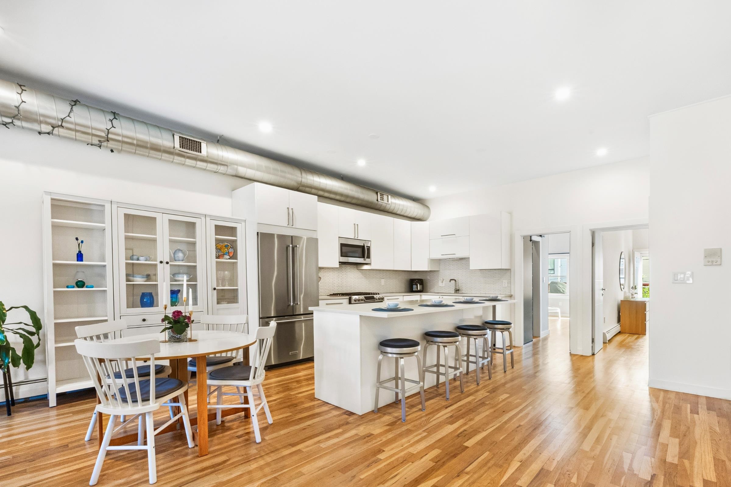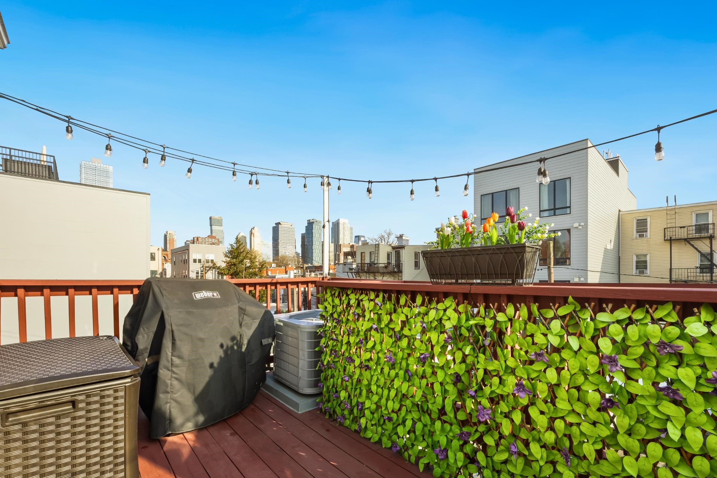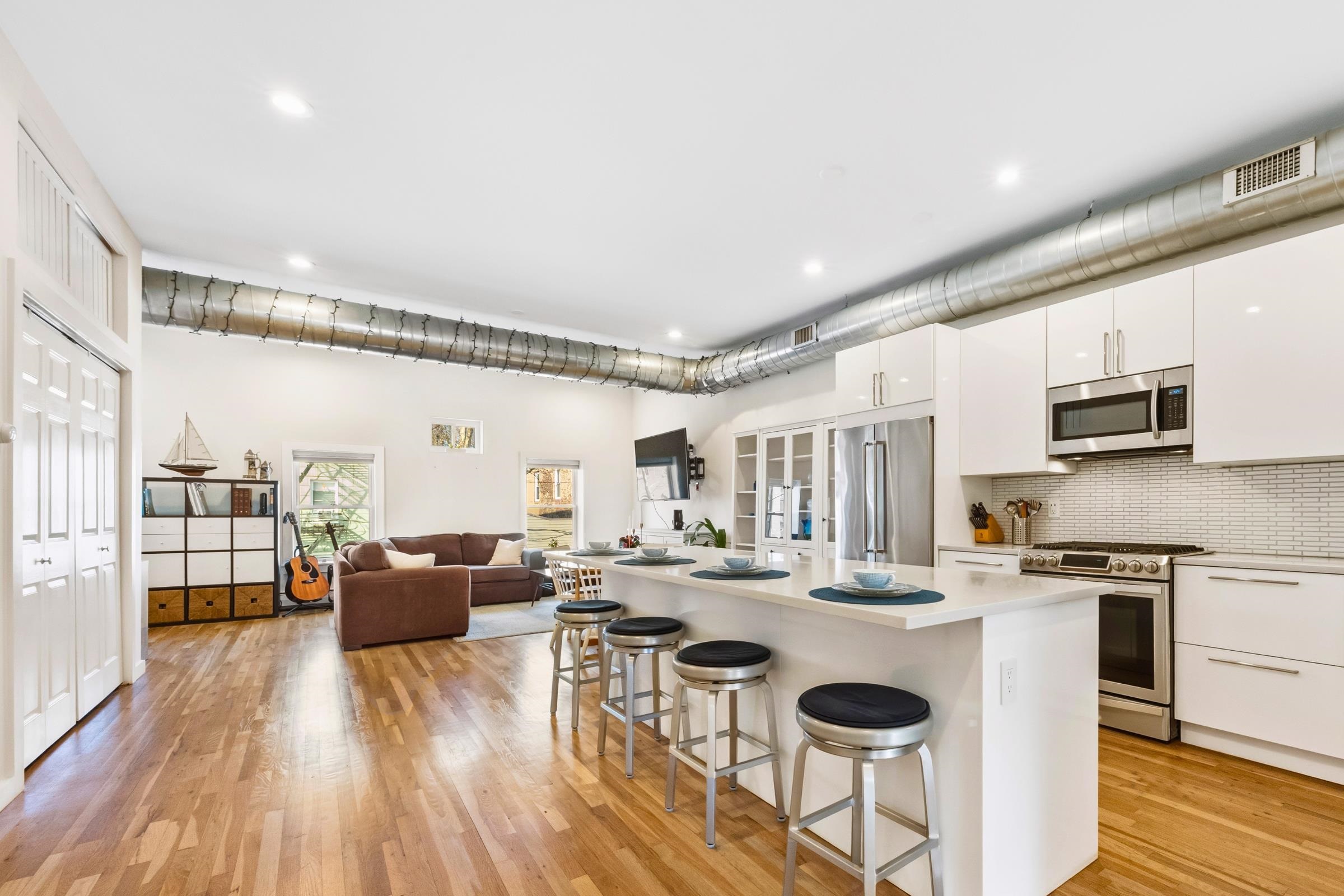Nestled in a quaint and peaceful neighborhood, this exemplary loft-style residence perfectly reflects the aesthetic of modern living. This 2 Bedroom + Office, 2 Full Bathroom Condominium showcases nearly 1,300 Sqft of living space, impeccable ceiling heights, a private outdoor terrace, and a very rare parking space included. The Chef Style kitchen with a massive island countertop and abundant storage is the pinnacle of modern Luxury, completed with chic custom cabinetry, Alpine Mist Caesarstone counters, a premium appliance package, and a built-in wine fridge. Each angle of this sprawling home is designed with natural light and abundant space in mind, creating a versatile layout for a seamless connection from the spacious bedrooms, to the scenic outdoor terrace. The primary bedroom suite is designed to fit a king-sized bed along with a 5-piece bedroom set, adjoined by a captivating ensuite bathroom tiled in a custom herringbone pattern. Additional features include hardwood floors throughout the home, Central AC, with Nest climate control, recessed lights, and a LG washer/dryer. Complementing this home is one of the best neighborhoods in JC Downtown, perfectly located near Hamilton Park, PATH stations, and all of the award-winning restaurants, shops, and stores that Downtown Jersey City has to offer.