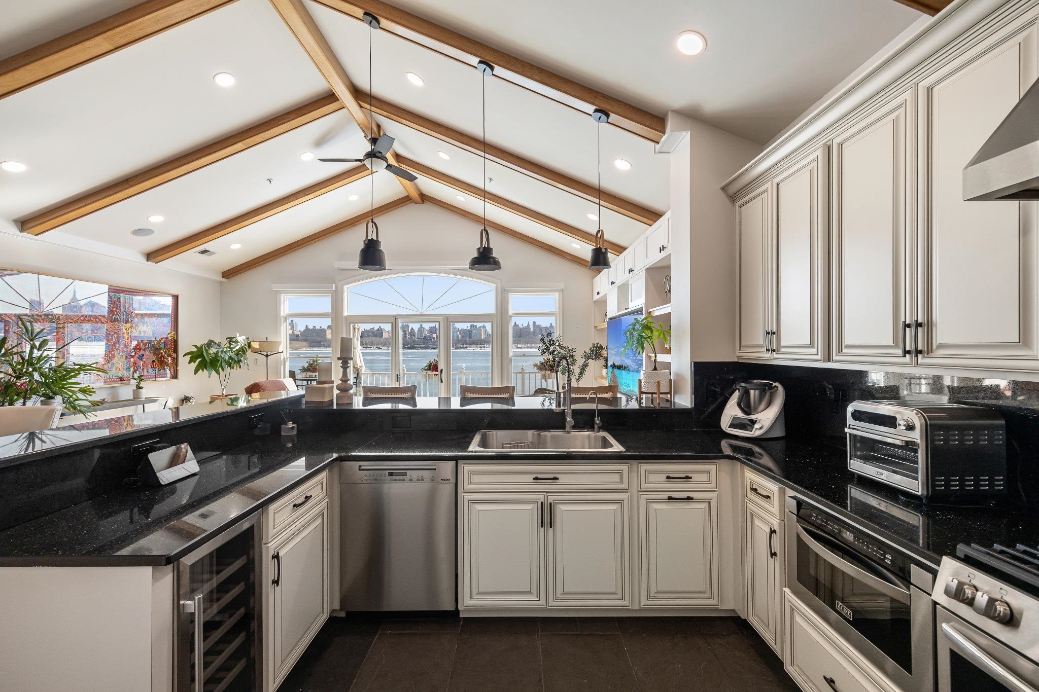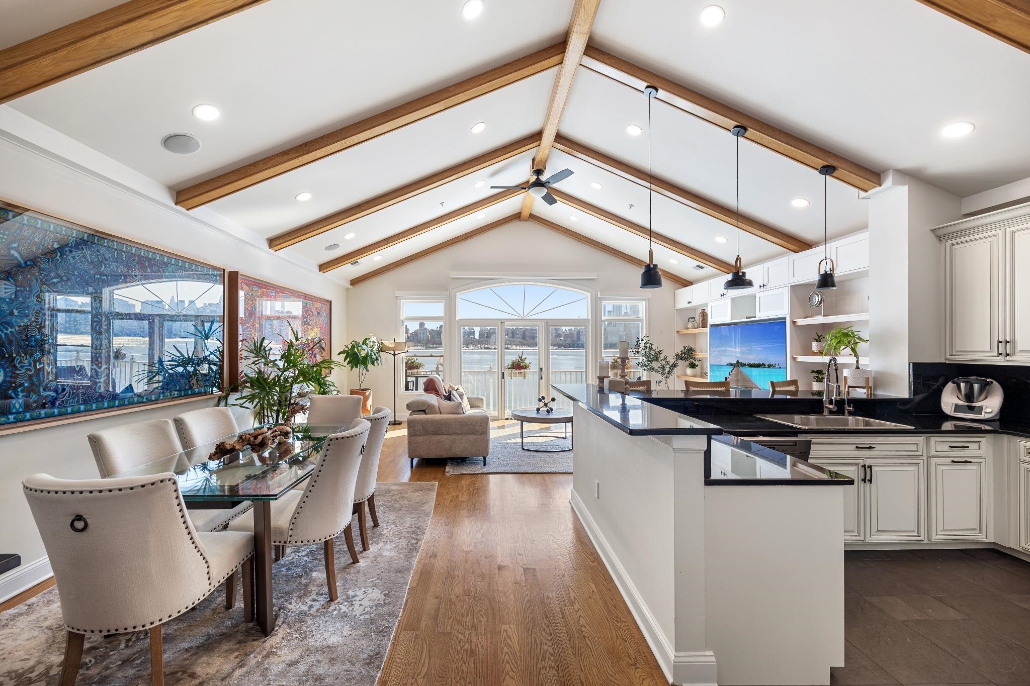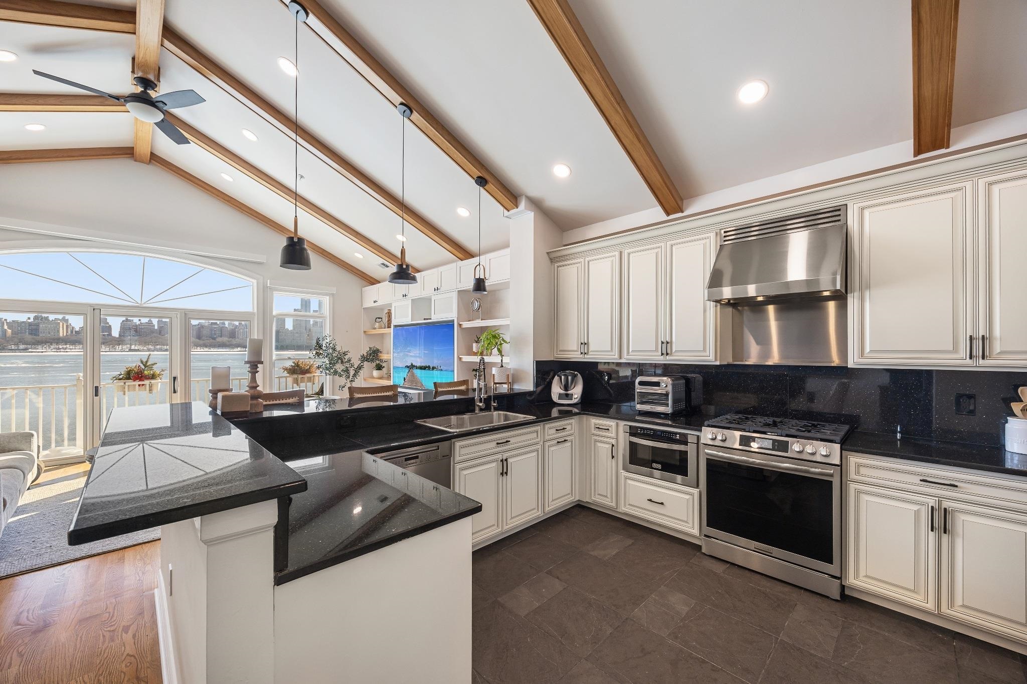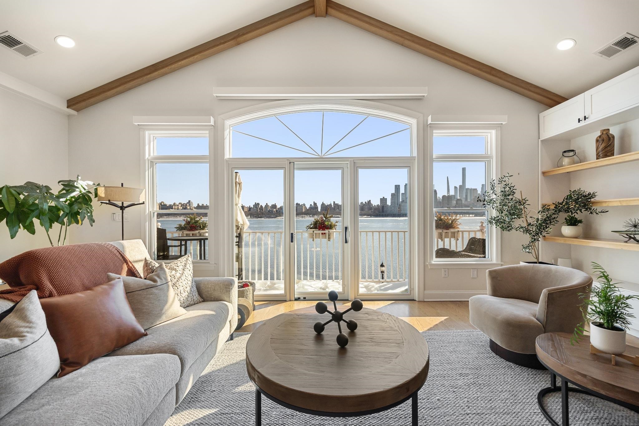Located in the sought-after Bulls Ferry community, 18 Lydia Drive is a fully renovated waterfront residence offering panoramic NYC skyline and Hudson River views from the living, dining, and kitchen areas. This barn-style, loft-inspired home features soaring ceilings, exposed beams, and walls of oversized windows that fill the main living spaces with natural light throughout the day. The expansive private balcony, located off the living room, is ideal for entertaining or enjoying stunning city and river views. A private in-unit elevator provides seamless access between levels. The renovated kitchen and dining area showcase white cabinetry, quartz countertops and backsplash, and black stainless steel appliances—perfectly positioned to take full advantage of the sweeping views. Hardwood floors run throughout, adding warmth and continuity. The primary suite offers a peaceful retreat with a beautifully renovated spa-like bathroom featuring a soaking tub beneath a skylight. Additional highlights include, newer HVAC, private one-car garage plus driveway parking, and access to Bulls Ferry amenities including two pools with jacuzzis, waterfront promenade, shuttle to ferry, and easy NYC bus access. A rare opportunity for move-in-ready waterfront living just minutes from Manhattan.