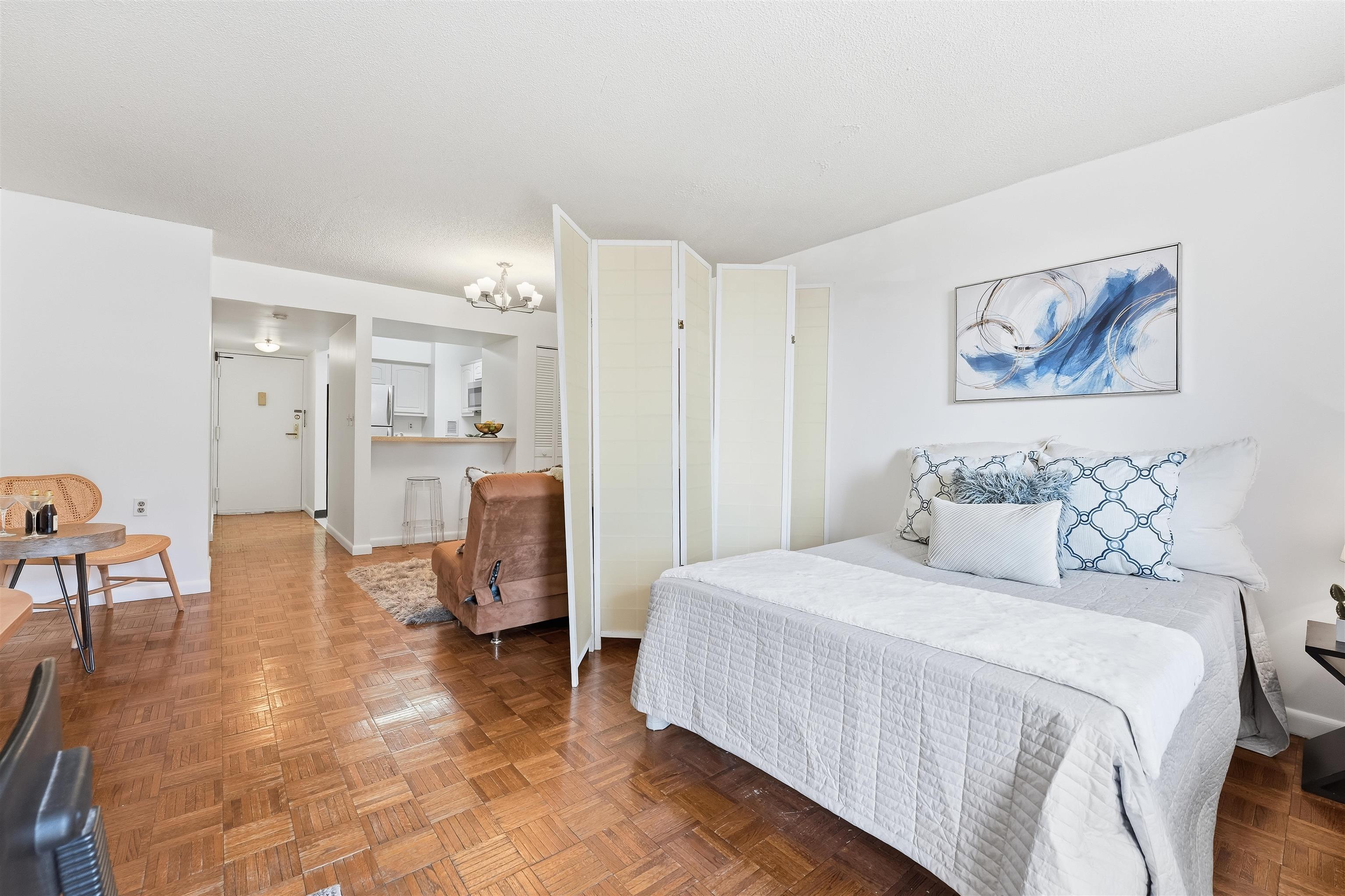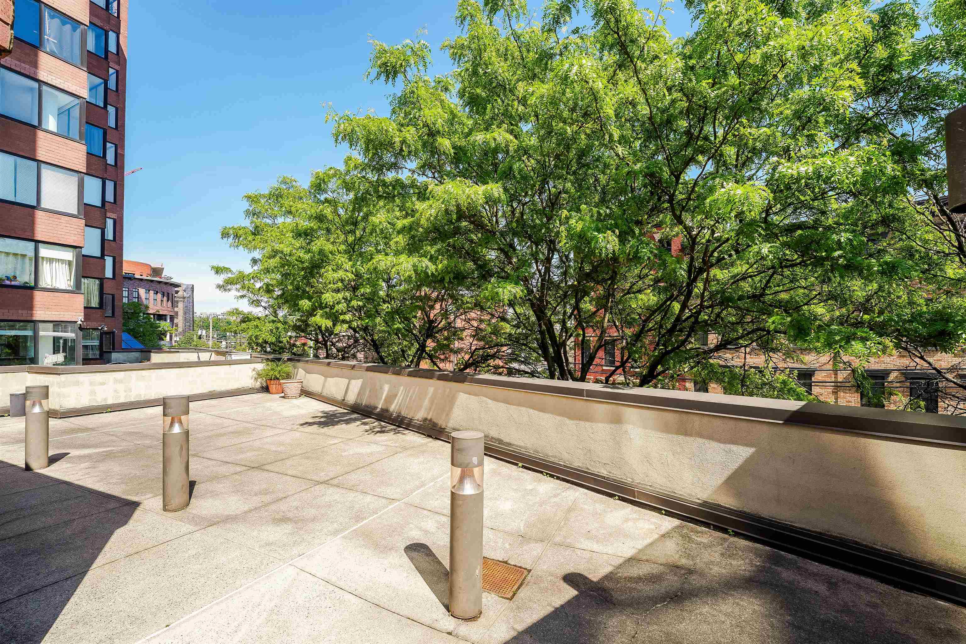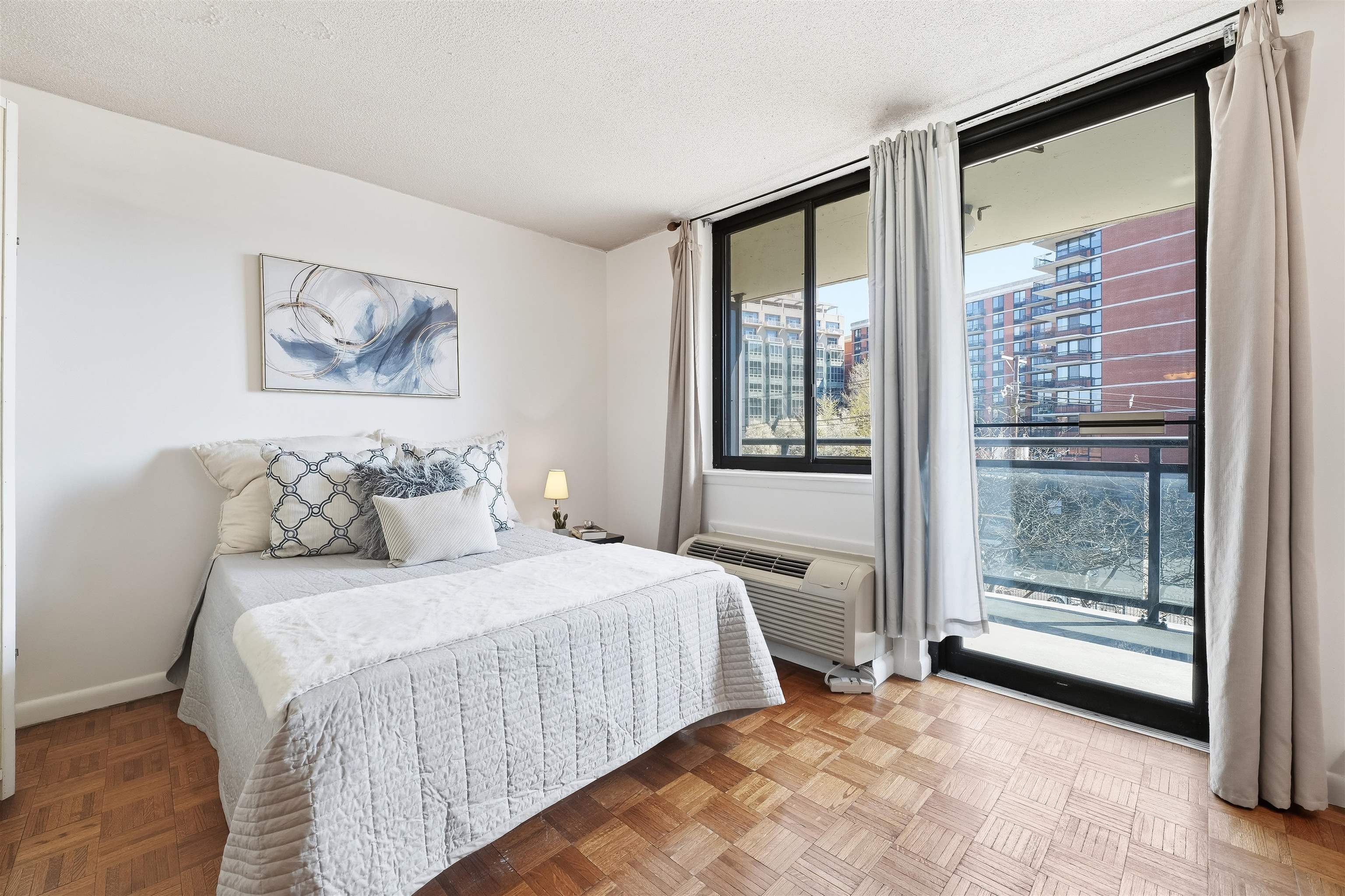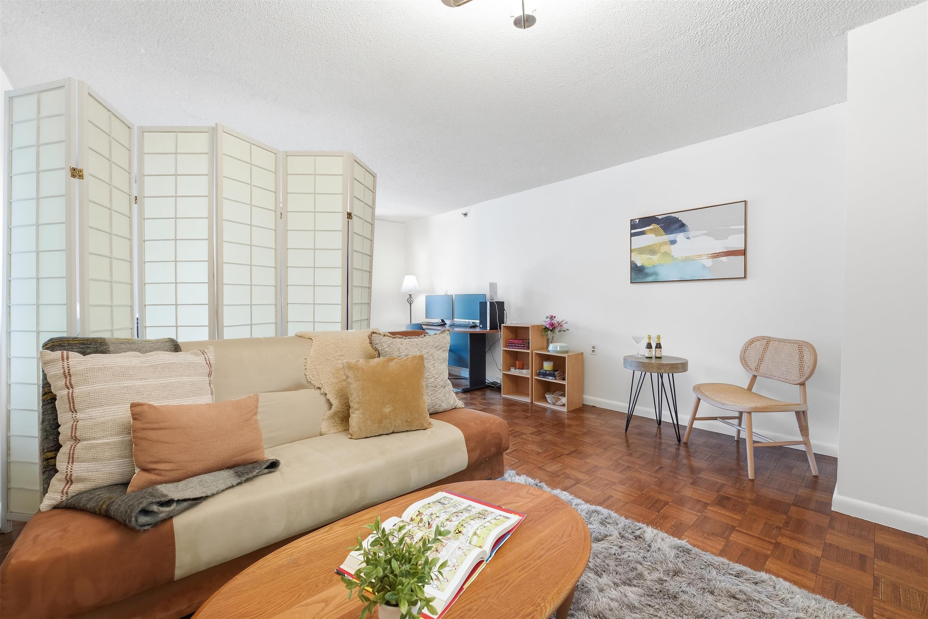 Rare, oversized studio with private terrace and garage parking in the Skyline building, a combination that almost never comes to market. This bright 557 sq ft home with southern exposure lives far beyond a typical studio, with hardwood floors throughout and large windows that flood the space with natural light. The expansive layout easily accommodates a separate sleeping area, a full living and dining area, and a work-from-home setup, all without feeling cramped. The updated kitchen features brand-new stainless steel appliances, generous cabinetry, and functional counter space, while the bathroom offers a full tub/shower. Step outside to your private terrace, perfect for morning coffee, outdoor dining, or unwinding at the end of the day, creating true indoor/outdoor living. Additional highlights include excellent closet space and room for a king-size setup. Located in the full-service Skyline building with a doorman, fitness center, concierge, laundry on every floor, and free PATH shuttle, plus the rare convenience of included valet garage parking. For buyers seeking outdoor space, parking, and full-service living in one home—this is the one.