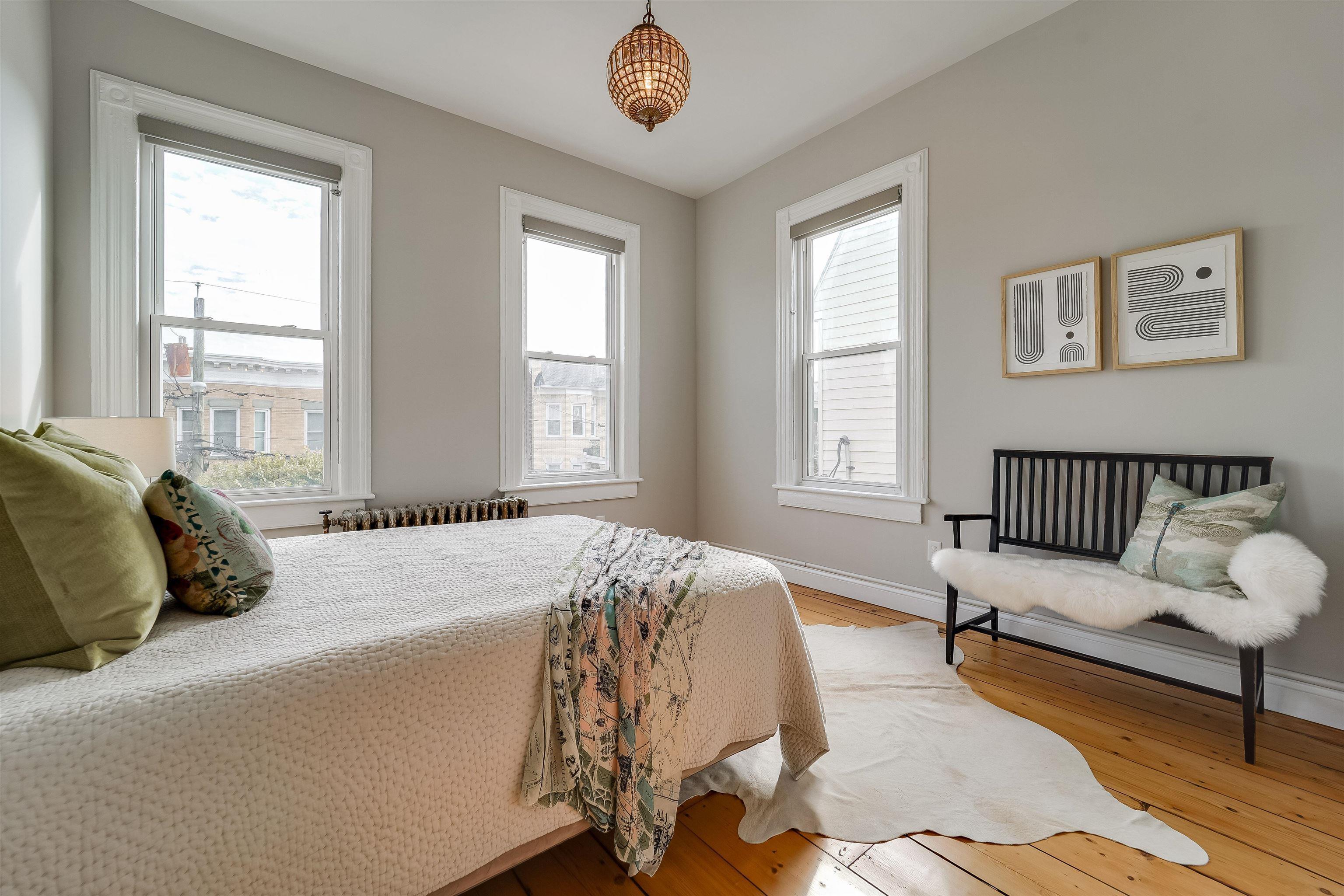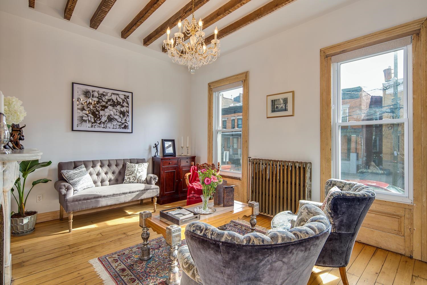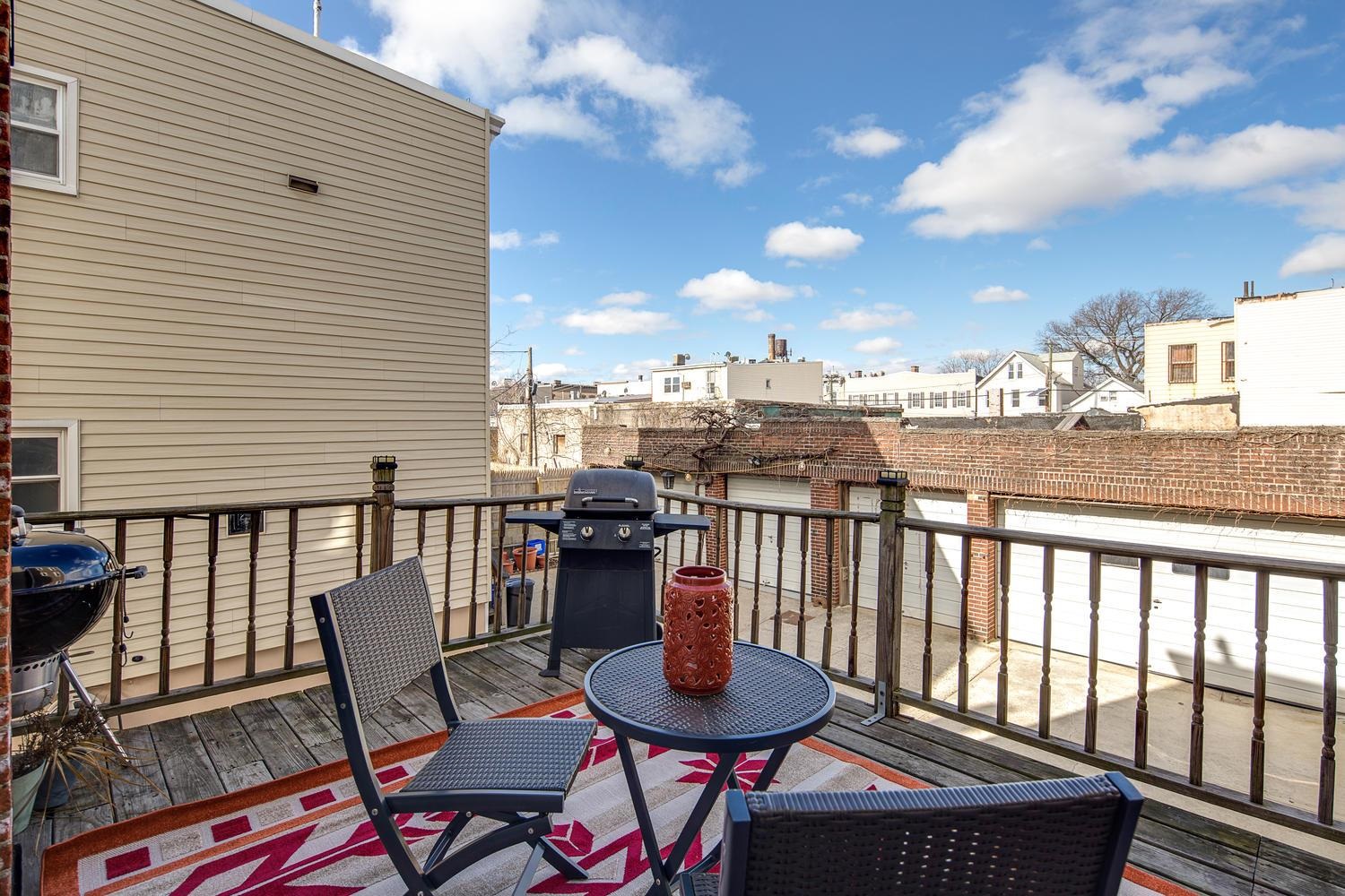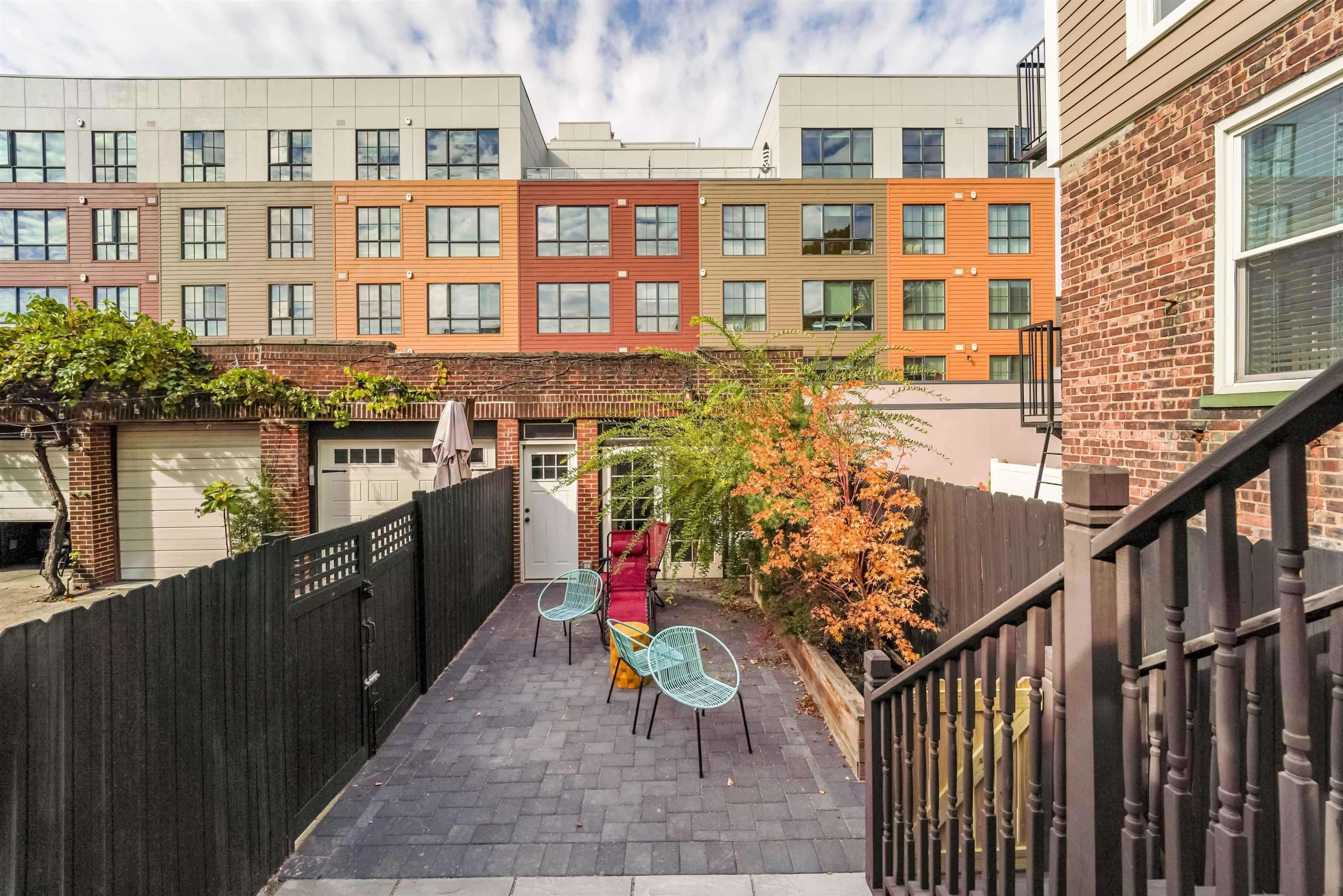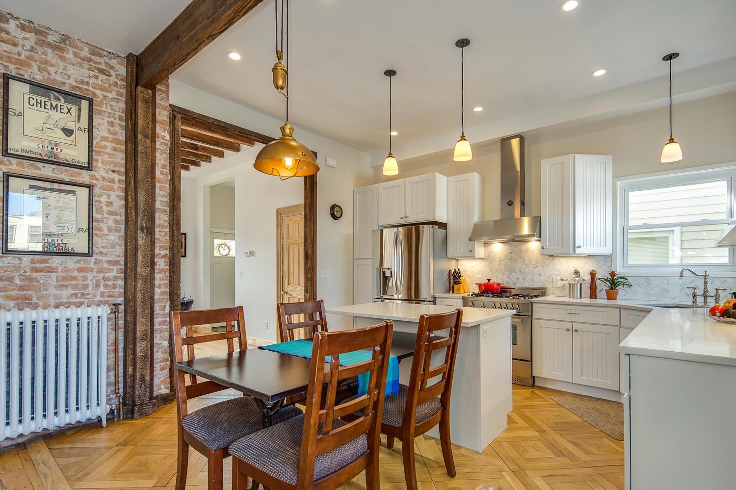 Perfectly positioned on one of the most coveted blocks in Jersey City Heights, this detached two-family home seamlessly blends historic character with high-end contemporary design. As you step into the primary residence, you are greeted by an expansive main floor bathed in natural light, highlighting the stunning original sub-flooring and exposed wood beams. The living area serves as a sophisticated retreat, anchored by a decorative mantle and accented by rich exposed brick that runs throughout the entire property, offering a warm, industrial-chic aesthetic. The heart of the main unit is the chef’s kitchen, a masterpiece of form and function featuring crisp white shaker cabinetry, elegant stone countertops, and a large central island perfect for entertaining. Culinary enthusiasts will appreciate the premium Bertazzoni range and hood and suite of stainless steel appliances. Adjacent to the kitchen, sliding glass doors lead directly to a private terrace, creating a fluid indoor-outdoor living experience. A stylish half-bath and a full-sized stacked washer/dryer complete this level for ultimate convenience. Retreat to the upper level of the main home, where you will find three thoughtfully designed bedrooms. The primary suite is a true sanctuary, boasting a luxurious ensuite bathroom equipped with a deep soaking tub and radiant heated floors for a spa-like feel. The additional bedrooms are serviced by a sleek hallway bath with a custom-tiled shower. Currently, one bedroom has been transformed into a dream walk-in closet featuring fully custom built-ins, offering unparalleled storage. The second unit is a fully equipped one-bedroom, one-bathroom garden-style apartment. Featuring its own full kitchen with an island, dedicated laundry, and direct access to the backyard, this space provides incredible flexibility for rental income or a private guest suite. Outside, the property includes a rare garage parking spot at the rear of the lot with additional attached storage space. Located just steps from the vibrant Riverview-Fisk Park, this unique two-family residence offers a rare combination of historic charm and modern luxury in the heart of The Heights.