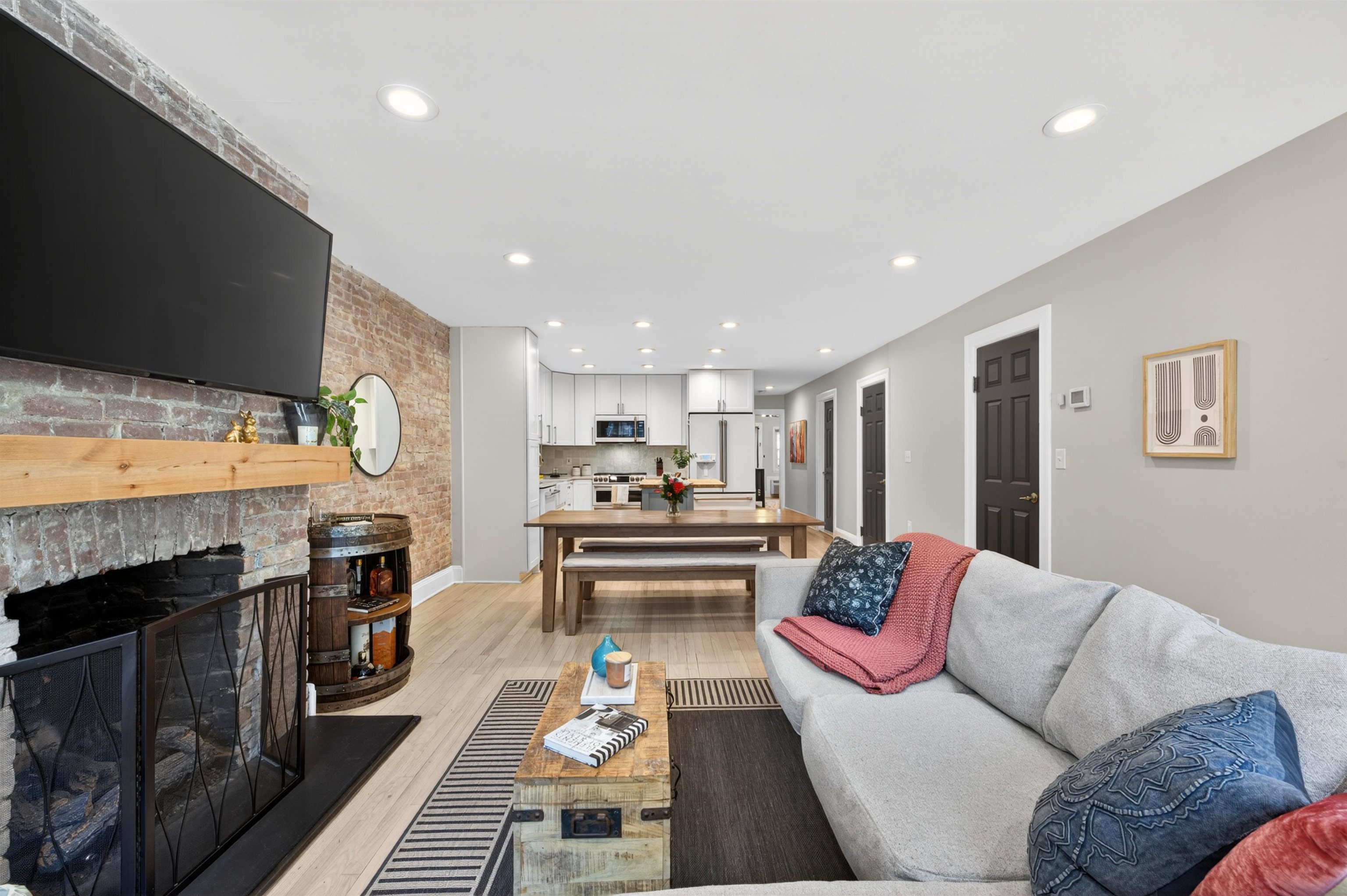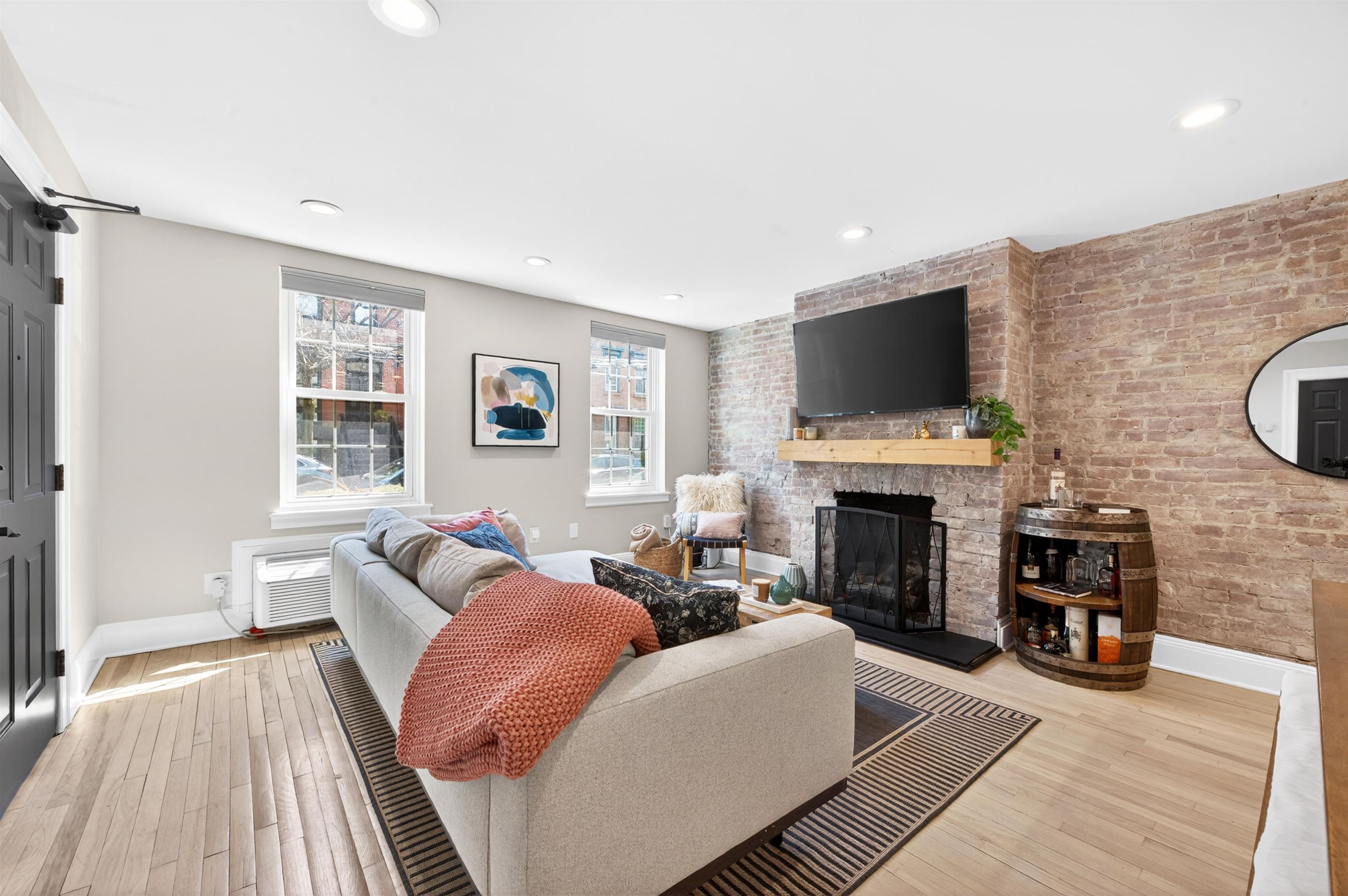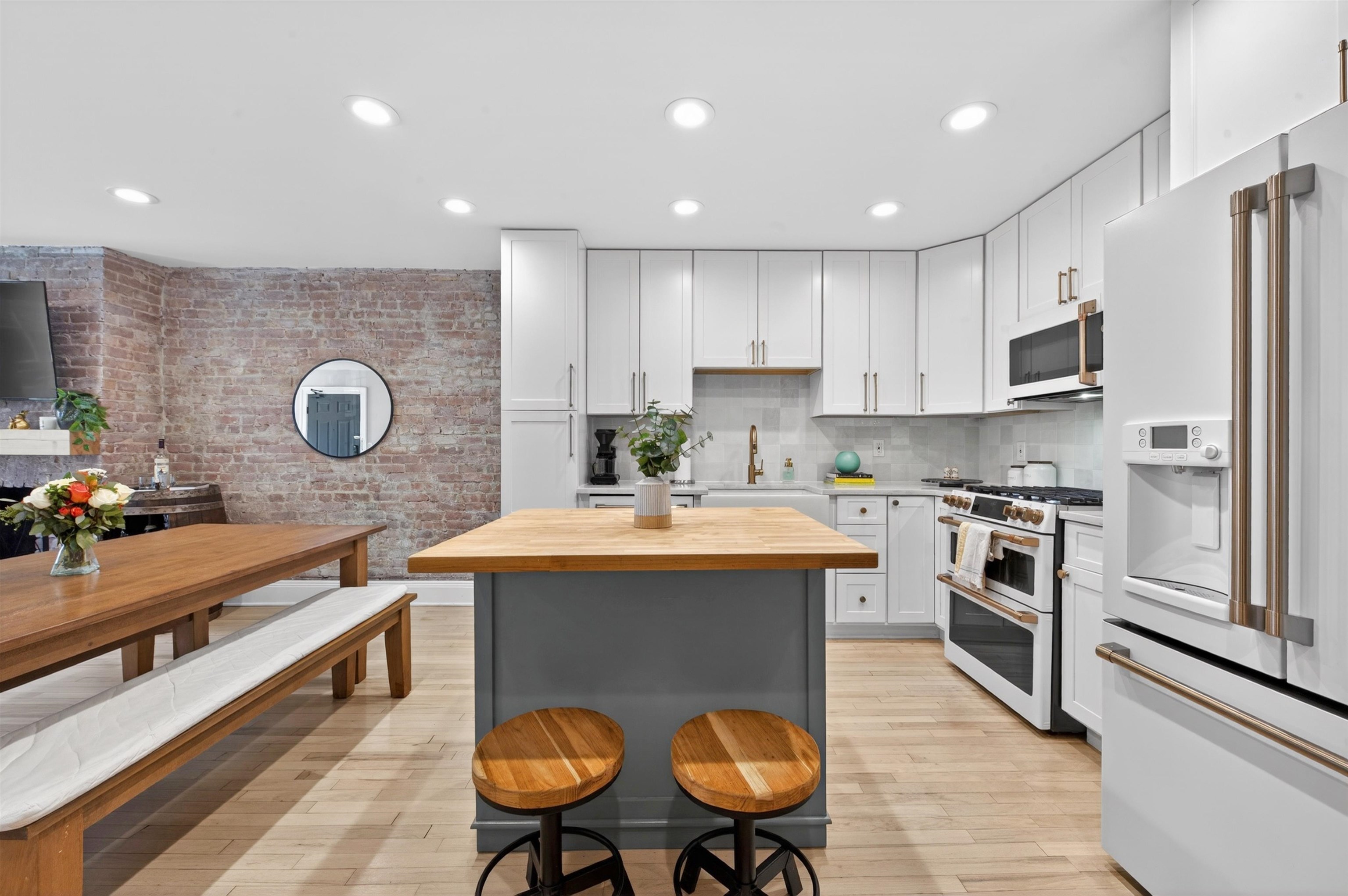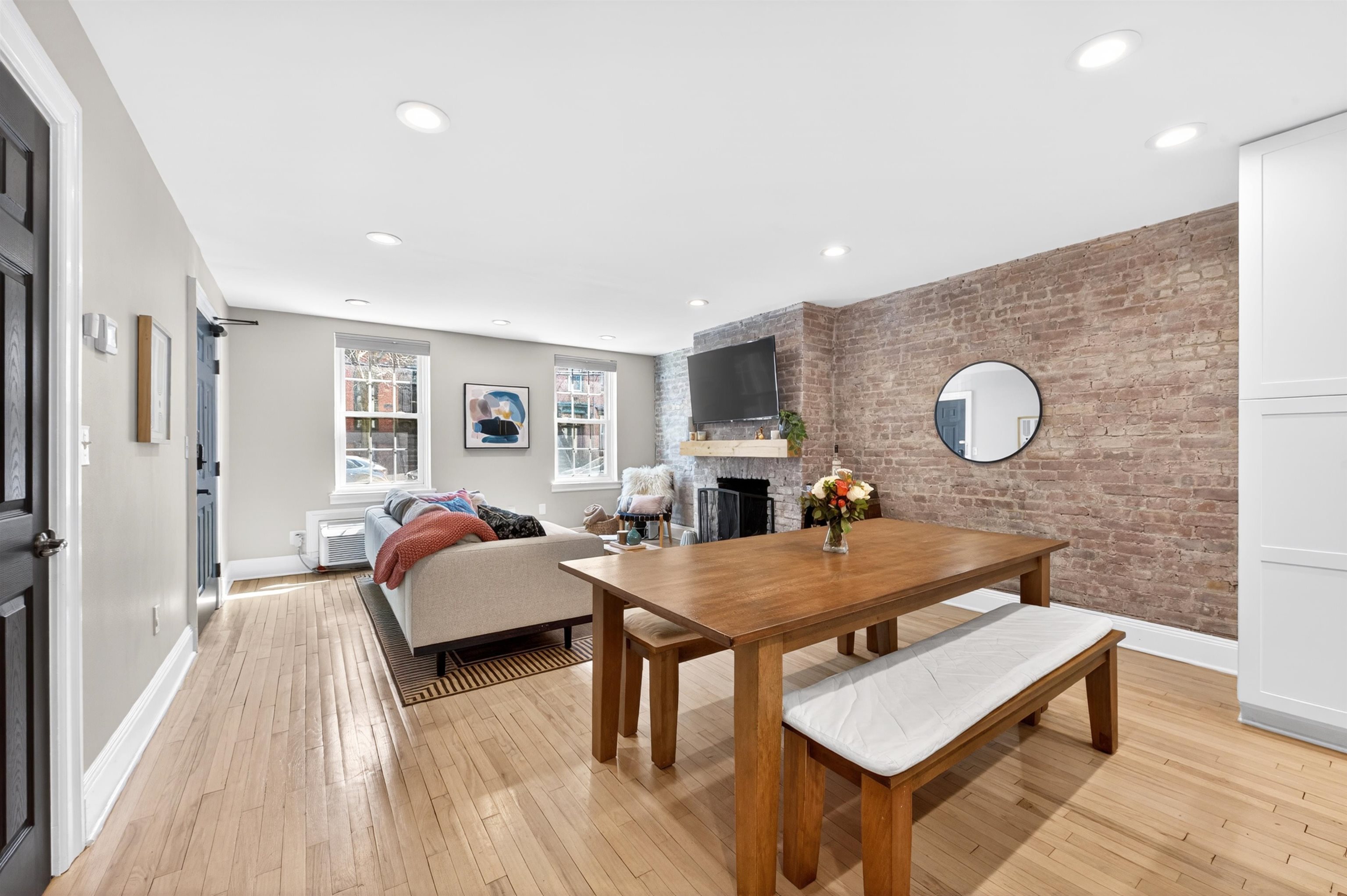 Welcome to 112 Bloomfield Street, Unit 1 — a beautifully updated two-bedroom, two-bathroom home offering over 1,300 square feet of sophisticated living space with a private terrace, perfectly situated on one of Downtown Hoboken’s most sought-after tree-lined blocks. Step inside this sun-lit expansive open-concept living and dining area designed for both entertaining and everyday comfort. Character-rich details include exposed brick, a gas fireplace, recessed lighting, and Scandinavian oak hardwood floors throughout. The stunning chef’s kitchen seamlessly blends function and style, featuring matte white GE Café Series appliances with brushed bronze hardware, a sleek LG dishwasher, white quartz countertops, a custom butcher block island, soft-close cabinetry, and a deep 30-inch farmhouse sink. Thoughtful design meets practicality with abundant storage options, including an oversized entry closet and a generous walk-in laundry room outfitted with a full-size washer and dryer. The primary suite is a true retreat—expansive enough for a king-sized bed and a dedicated office nook—offering a custom walk-in closet, with pocket door entry and a spa-inspired ensuite bath with an oversized glass-enclosed shower. The second bedroom is equally inviting, filled with natural light and featuring its own custom walk-in closet. Additional comforts include smart keyless entry, a designated stroller parking area just outside the unit, and shared basement storage. Enjoy an effortless commute with quick access to the PATH train, NY Waterway Ferry, and NJ Transit. Washington Street, the Hudson River Waterfront Walkway, as well as Hoboken’s finest parks, dining, shops, and schools are all just steps away. Rental parking is available within a two-block radius. A rare opportunity to own a turnkey home in one of Hoboken’s most desirable downtown locations.