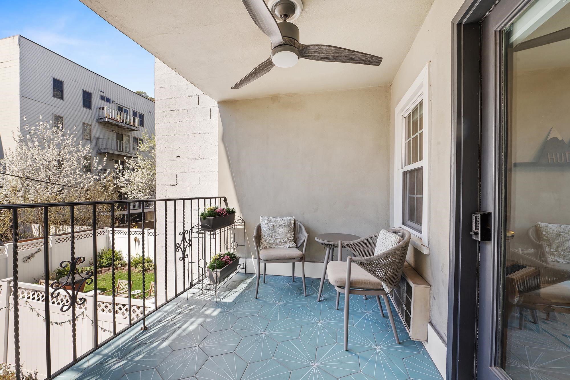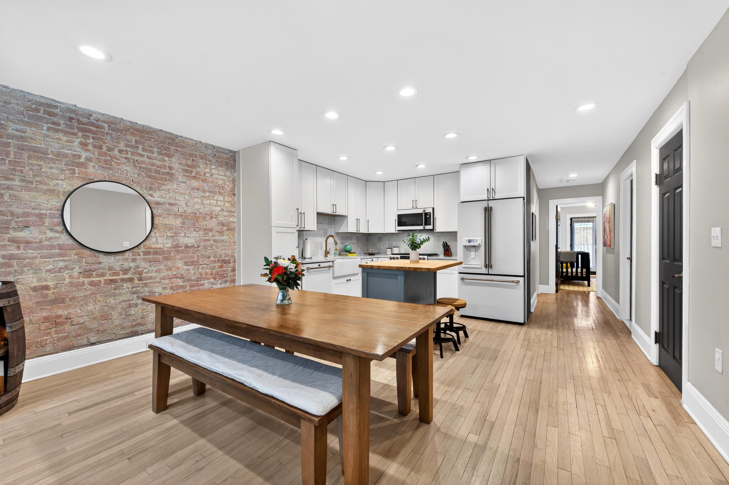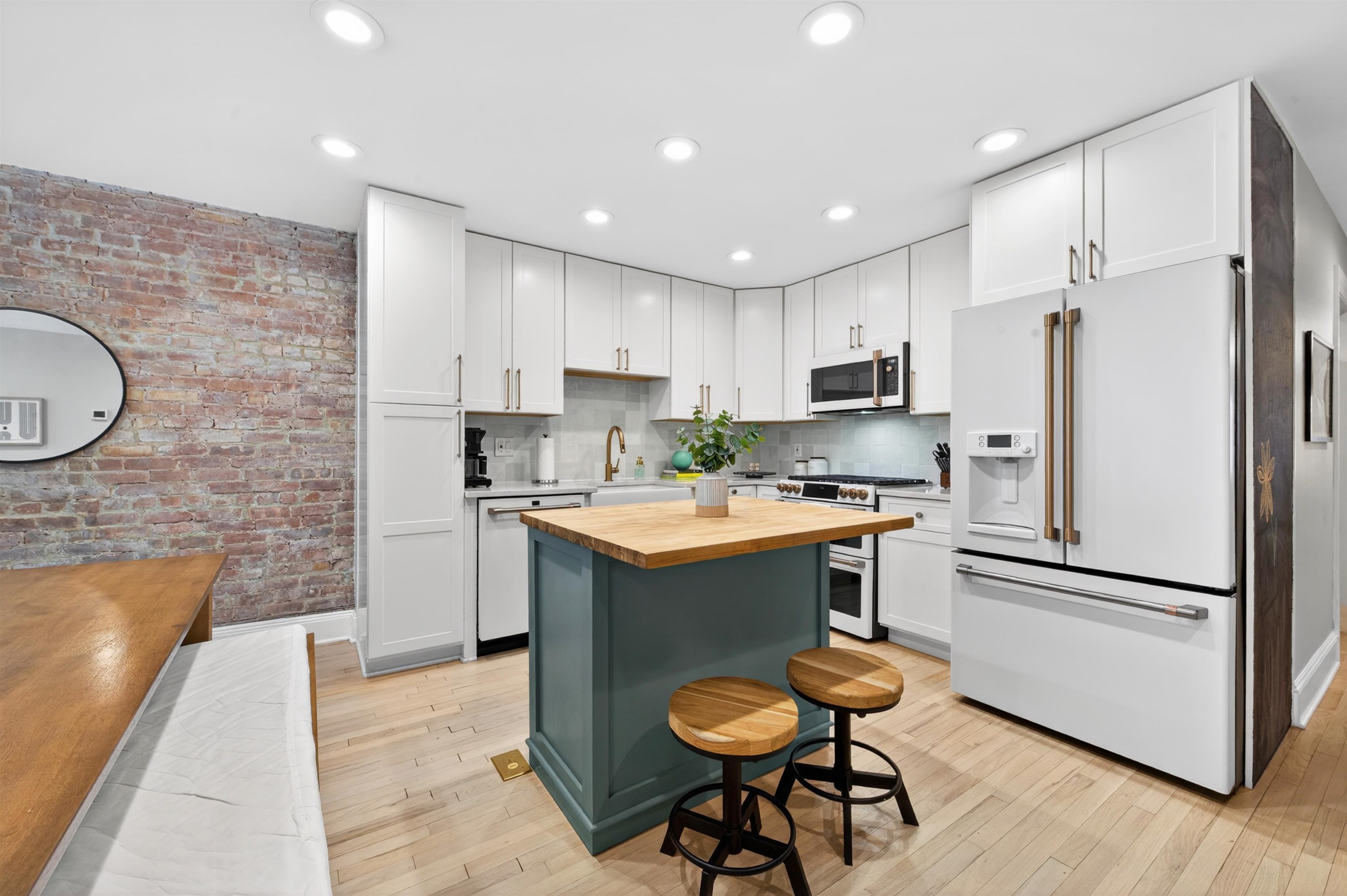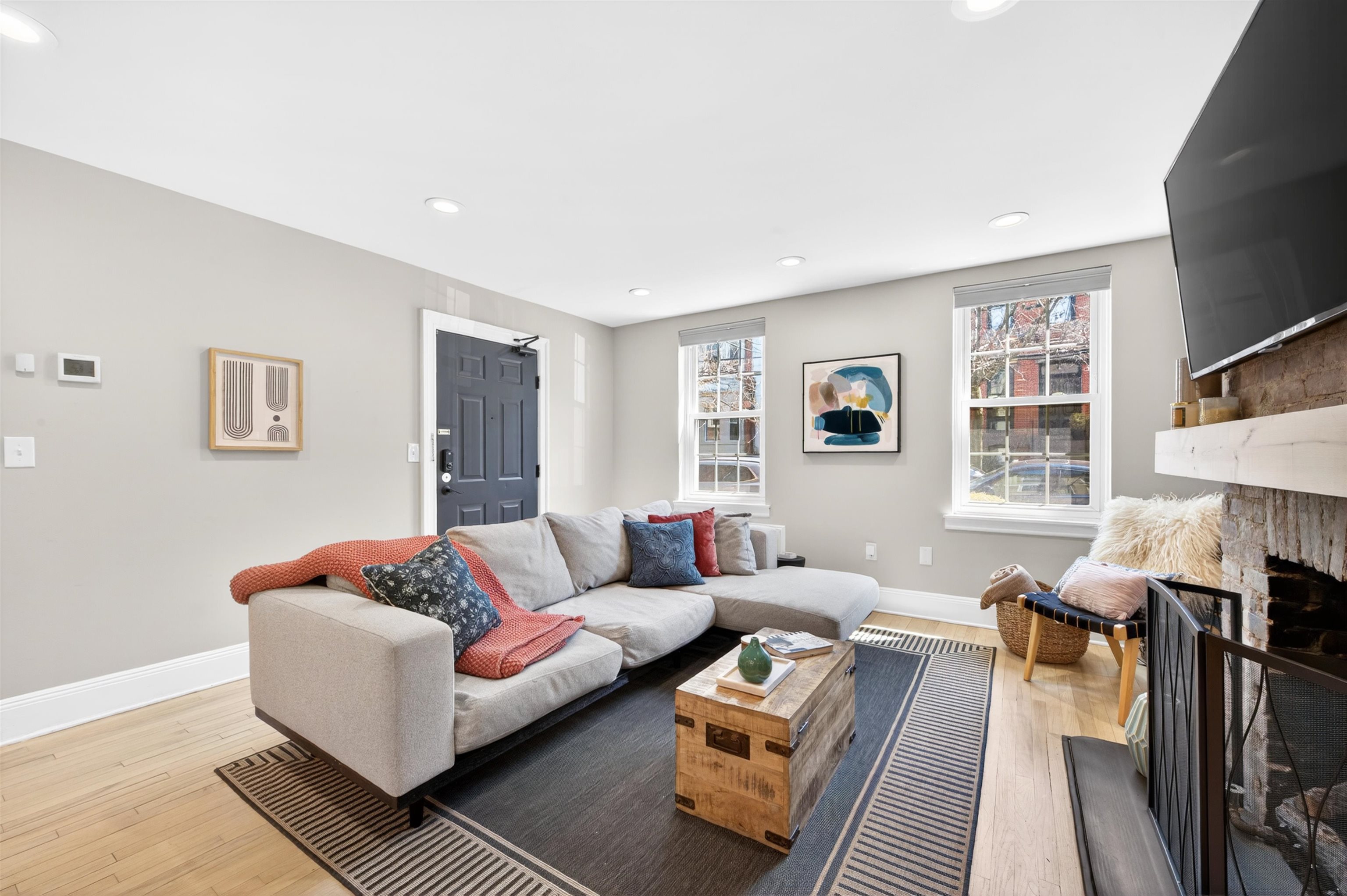 Welcome to 112 Bloomfield Street, Unit 1 — a beautifully updated two-bedroom, two-bathroom home offering over 1,300 square feet of sophisticated living space with a private terrace, perfectly situated on one of Downtown Hoboken’s most sought-after tree-lined blocks. Step inside this sun-lit expansive open-concept living and dining area designed for both entertaining and everyday comfort. Character-rich details include exposed brick, a gas fireplace, recessed lighting, and Scandinavian oak hardwood floors throughout. The stunning chef’s kitchen seamlessly blends function and style, featuring matte white GE Café Series appliances with brushed bronze hardware, a sleek LG dishwasher, white quartz countertops, a custom butcher block island, soft-close cabinetry, and a deep 30-inch farmhouse sink. Thoughtful design meets practicality with abundant storage options, including an oversized entry closet and a generous walk-in laundry room outfitted with a full-size washer and dryer. The primary suite is a true retreat—expansive enough for a king-sized bed and a dedicated office nook—offering a custom walk-in closet, with pocket door entry and a spa-inspired ensuite bath with an oversized glass-enclosed shower. The second bedroom is equally inviting, filled with natural light and featuring its own custom walk-in closet. Additional comforts include smart keyless entry, a designated stroller parking area just outside the unit, and shared basement storage. Enjoy an effortless commute with quick access to the PATH train, NY Waterway Ferry, and NJ Transit. Washington Street, the Hudson River Waterfront Walkway, as well as Hoboken’s finest parks, dining, shops, and schools are all just steps away. Rental parking is available within a two-block radius. A rare opportunity to own a turnkey home in one of Hoboken’s most desirable downtown locations.