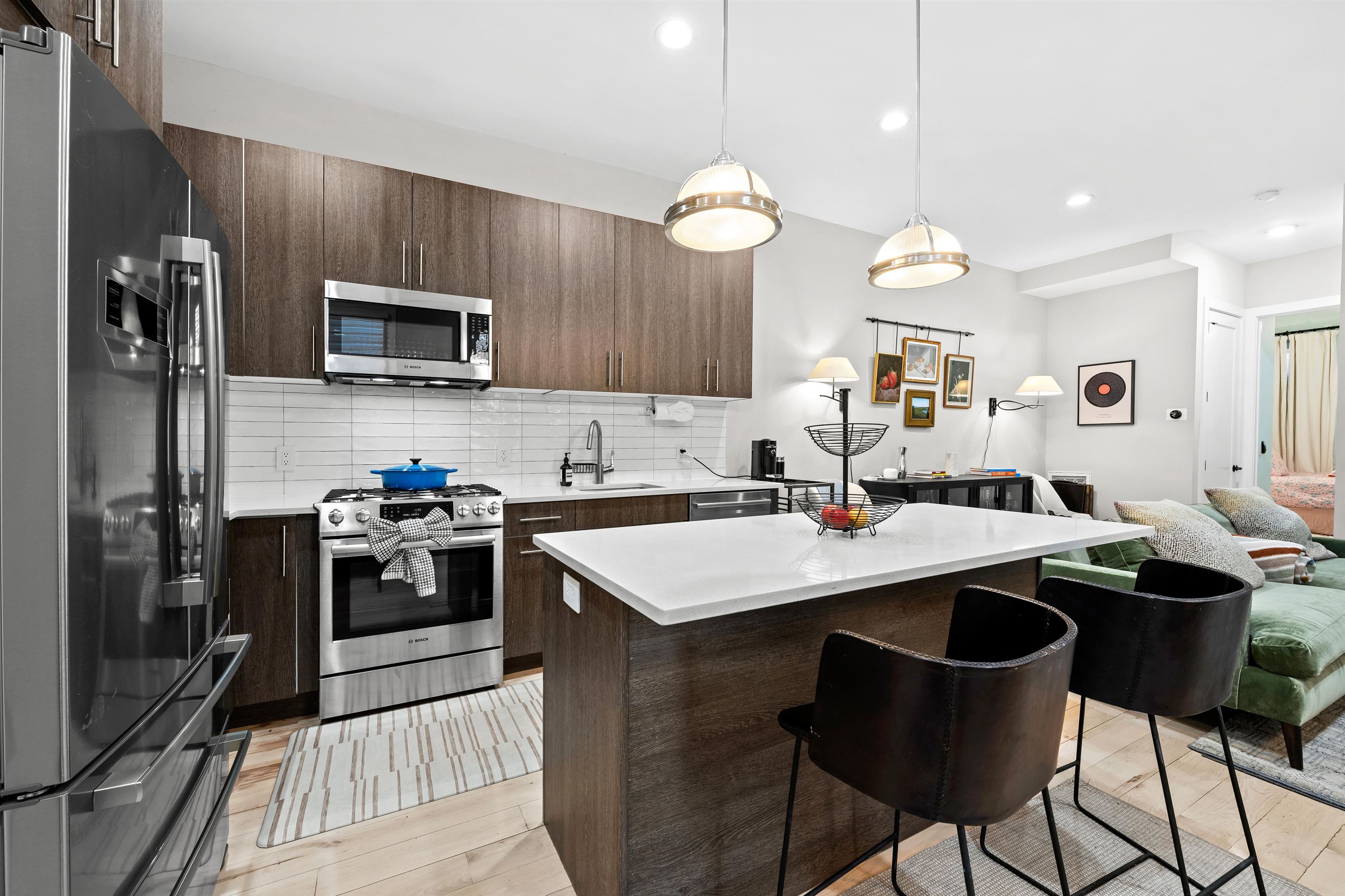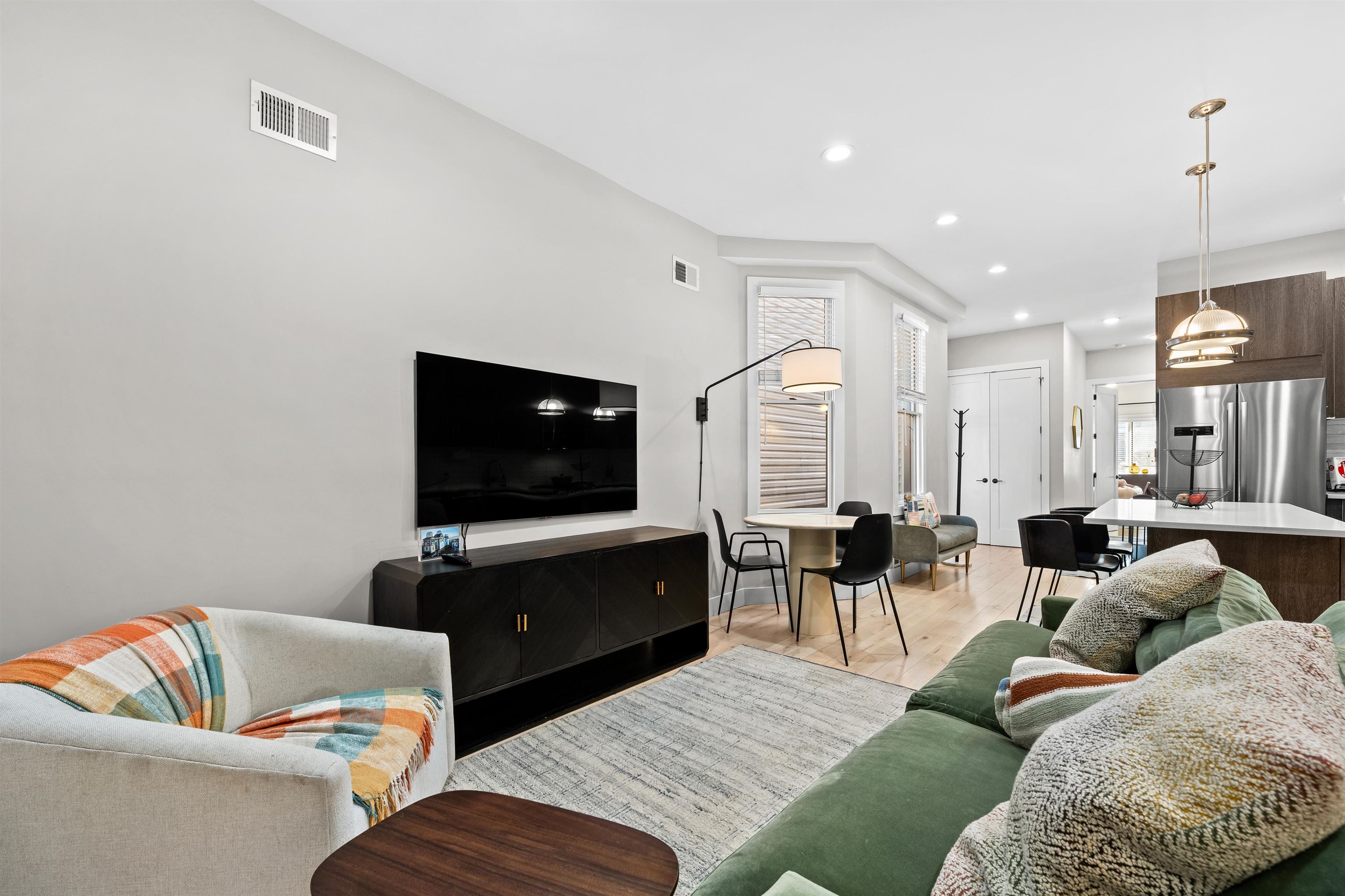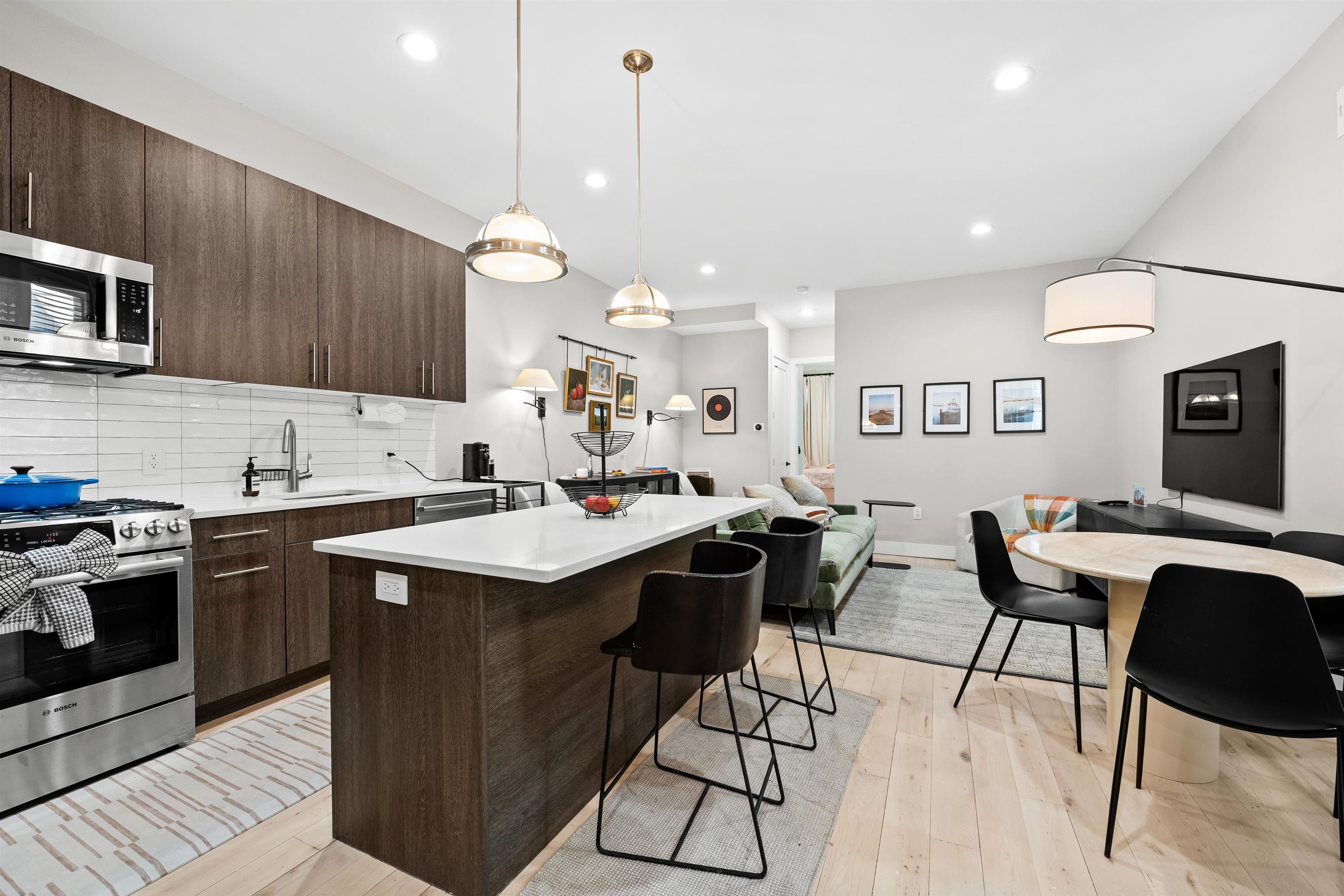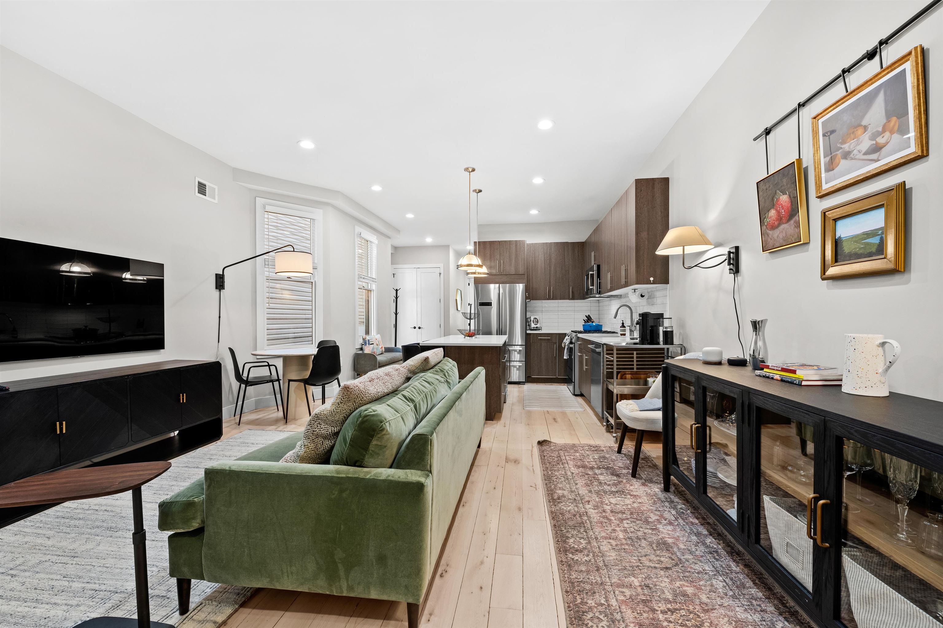 A standout offering at 289 Webster, this fully reimagined duplex sets a new standard for modern style and sophistication. Thoughtfully renovated from top to bottom, the home blends modern design with elevated finishes. Wide-plank maple flooring runs throughout, while soaring ceilings, oversized doors, and expansive Pella windows enhance the sense of space and bring in natural light, creating a warm yet sophisticated atmosphere. The kitchen is both sleek and functional, featuring imported Italian cabinetry, quartz countertops, and a premium Bosch 800 Series appliance package, complete with a built-in wine refrigerator—ideal for everyday living and entertaining alike. Bathrooms are finished with a refined, contemporary edge, showcasing Hansgrohe fixtures, floating vanities, and distinctive design elements such as textured accent walls that add depth and character. Smart home features—including a Nest thermostat, video intercom system, and keyless Schlage entry—add convenience and security. Perfectly situated just moments from the Congress Street Light Rail and the expansive Washington Park, this unit blends spacious comfort and convenience.