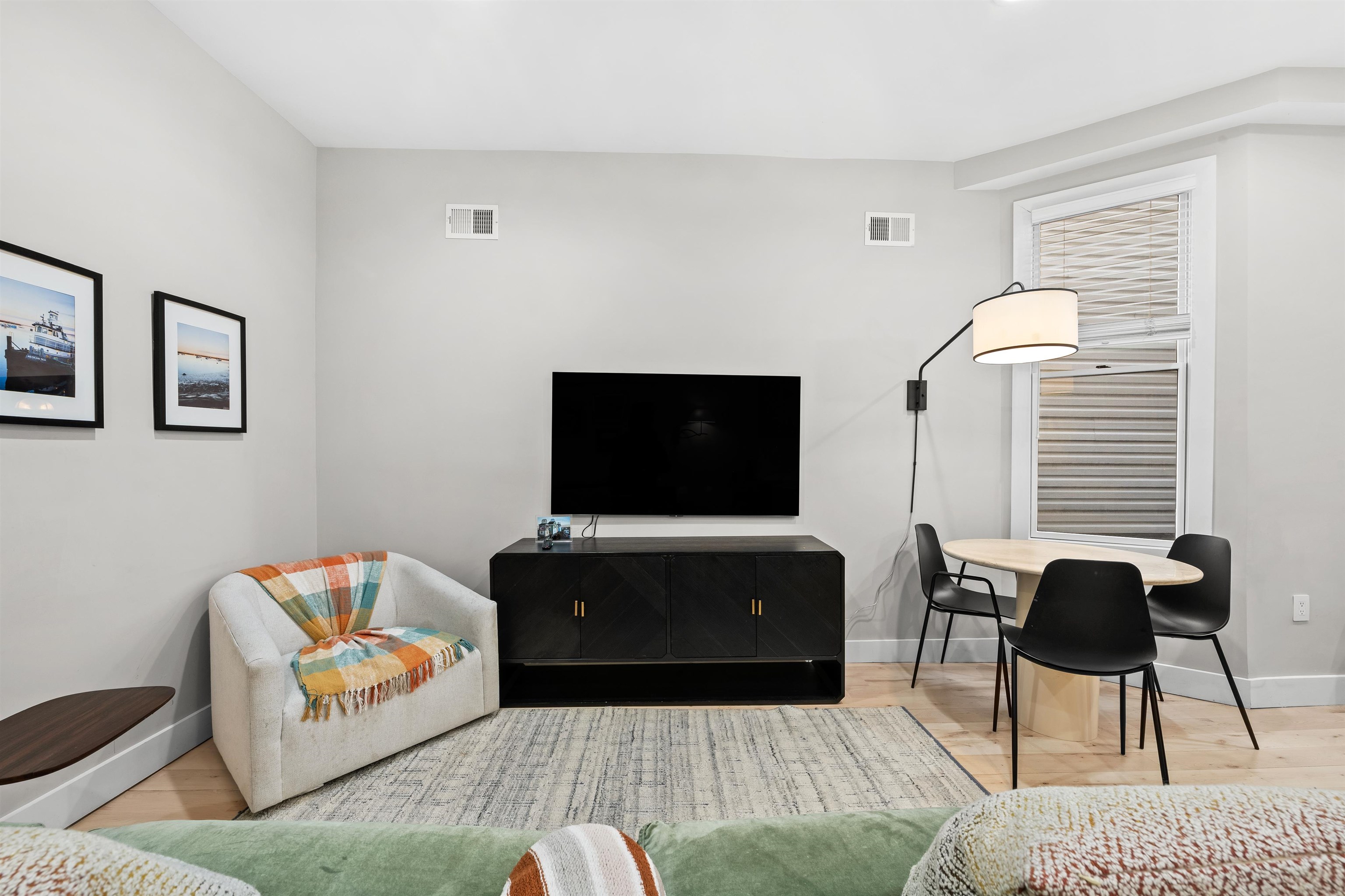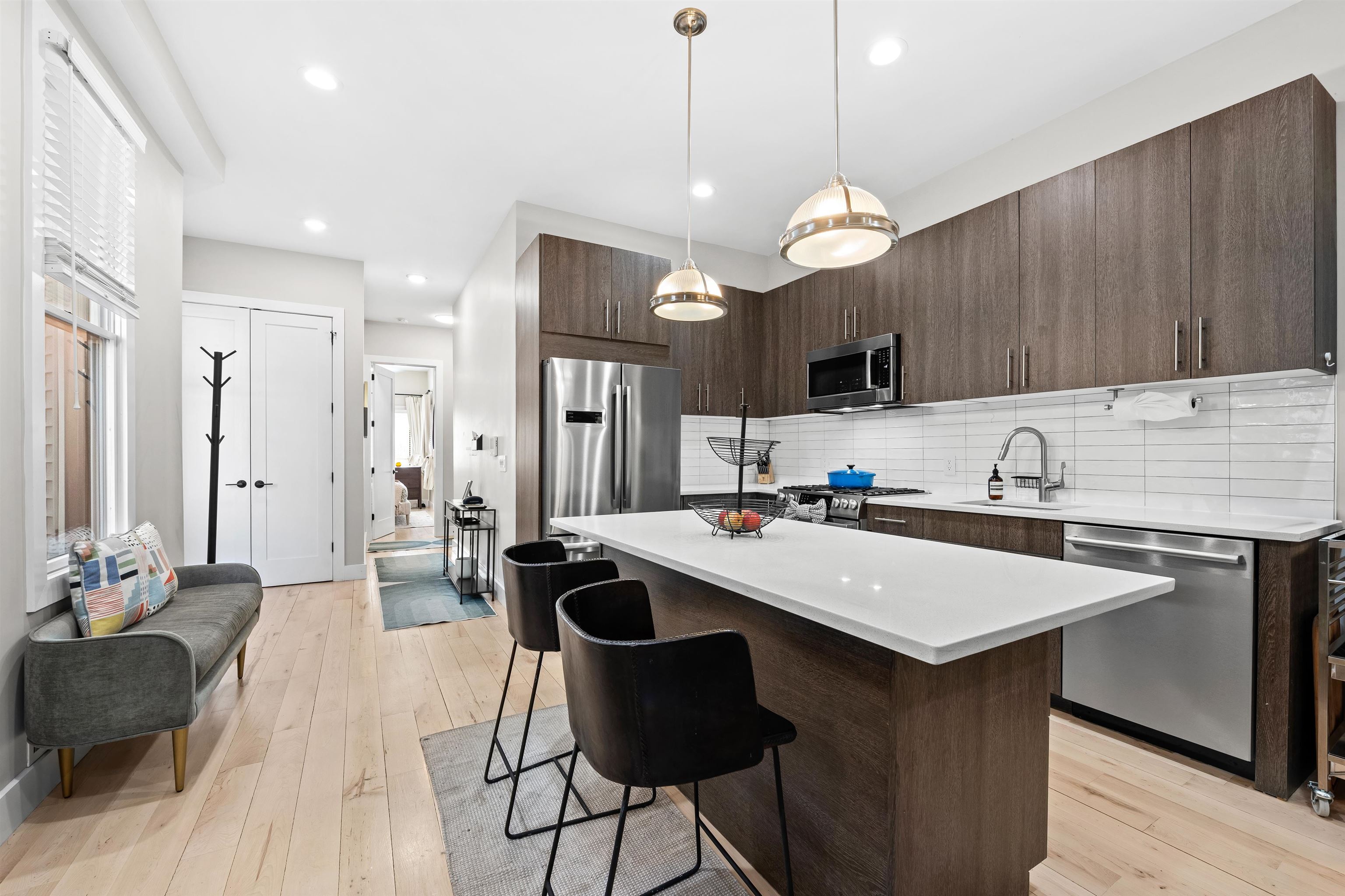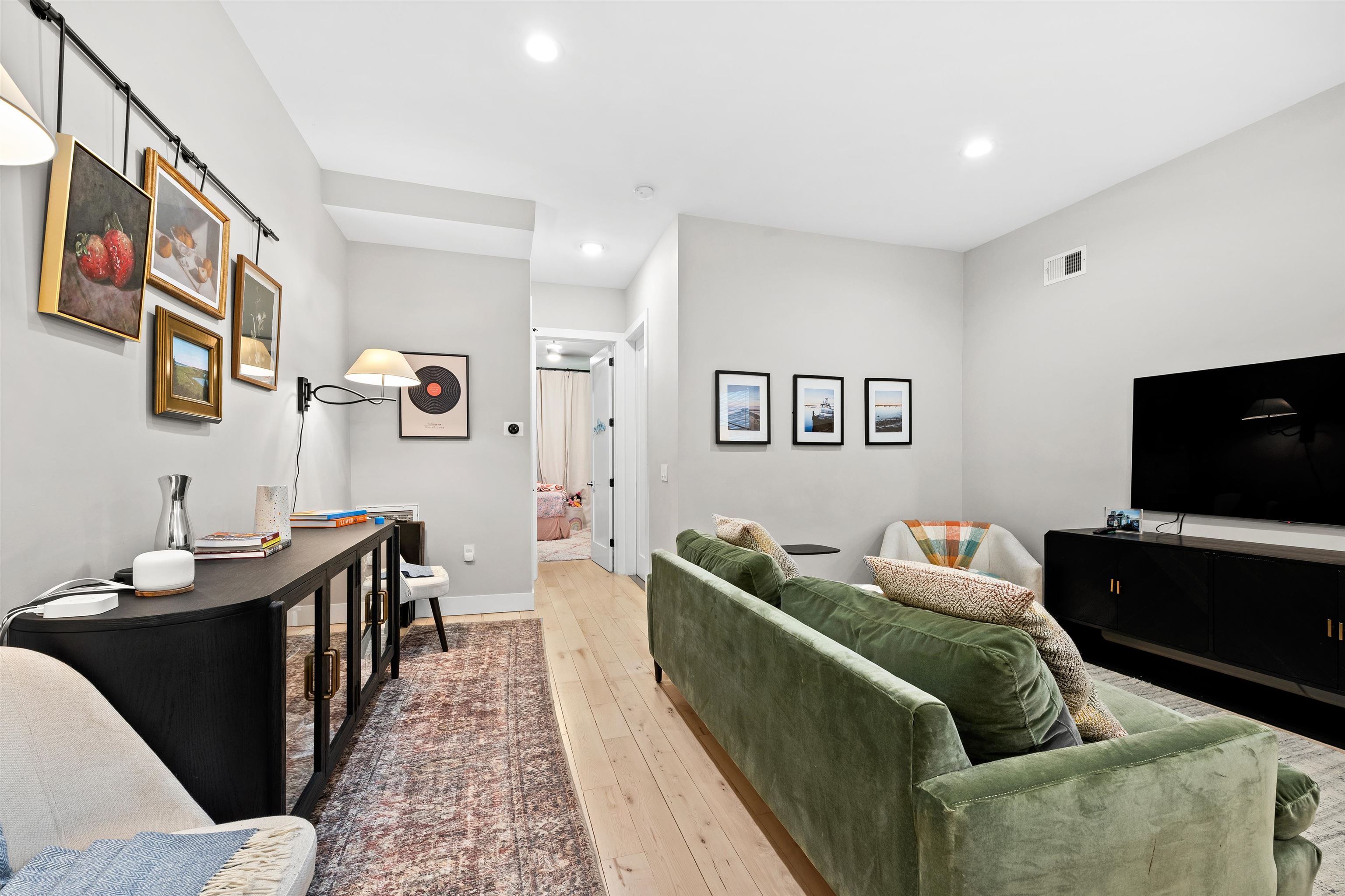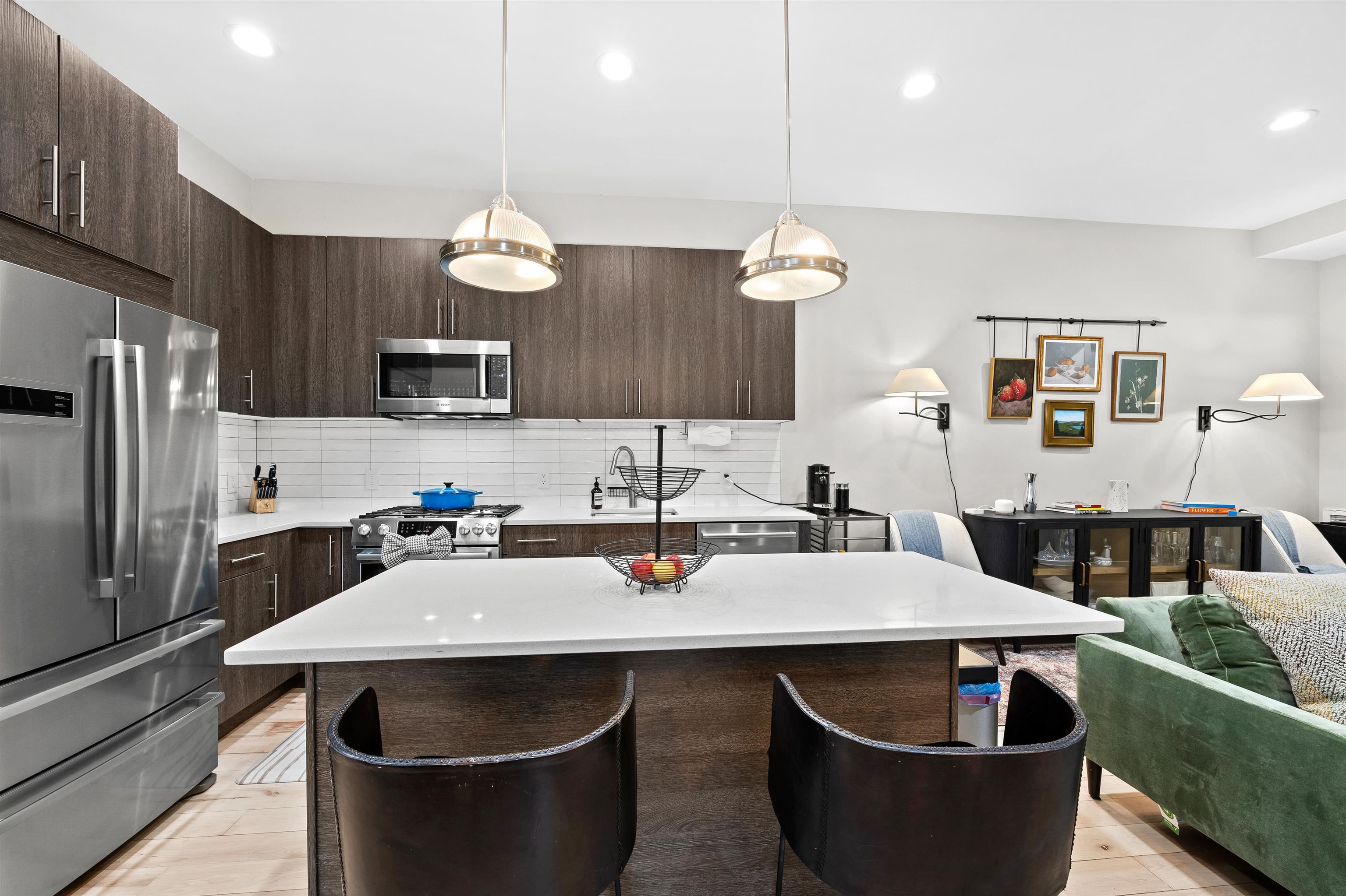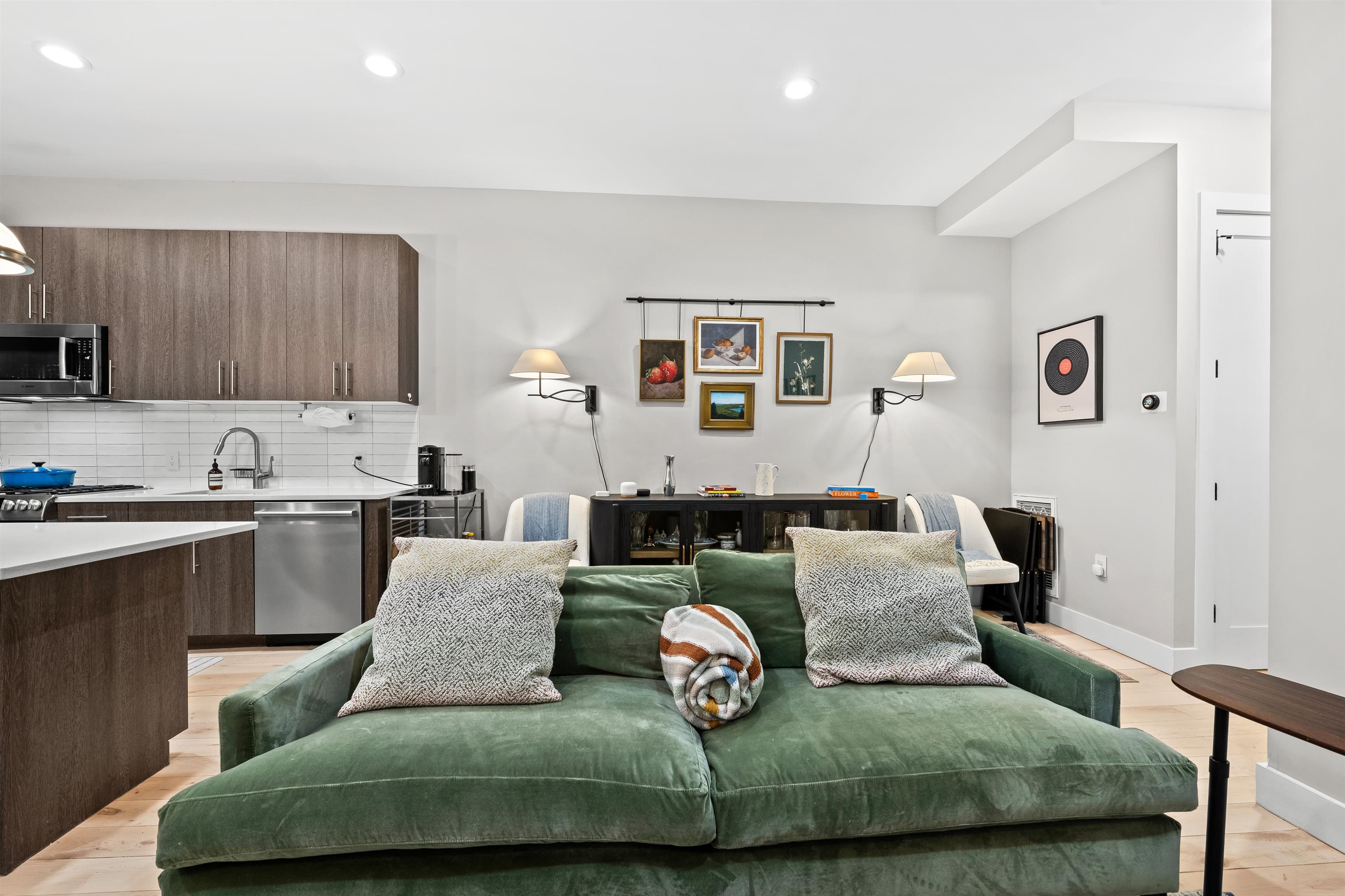 A standout offering at 289 Webster, this fully reimagined duplex sets a new standard for modern style and sophistication. Thoughtfully renovated from top to bottom, the home blends modern design with elevated finishes. Wide-plank maple flooring runs throughout, while soaring ceilings, oversized doors, and expansive Pella windows enhance the sense of space and bring in natural light, creating a warm yet sophisticated atmosphere. The kitchen is both sleek and functional, featuring imported Italian cabinetry, quartz countertops, and a premium Bosch 800 Series appliance package, complete with a built-in wine refrigerator—ideal for everyday living and entertaining alike. Bathrooms are finished with a refined, contemporary edge, showcasing Hansgrohe fixtures, floating vanities, and distinctive design elements such as textured accent walls that add depth and character. Smart home features—including a Nest thermostat, video intercom system, and keyless Schlage entry—add convenience and security. Perfectly situated just moments from the Congress Street Light Rail and the expansive Washington Park, this unit blends spacious comfort and convenience.