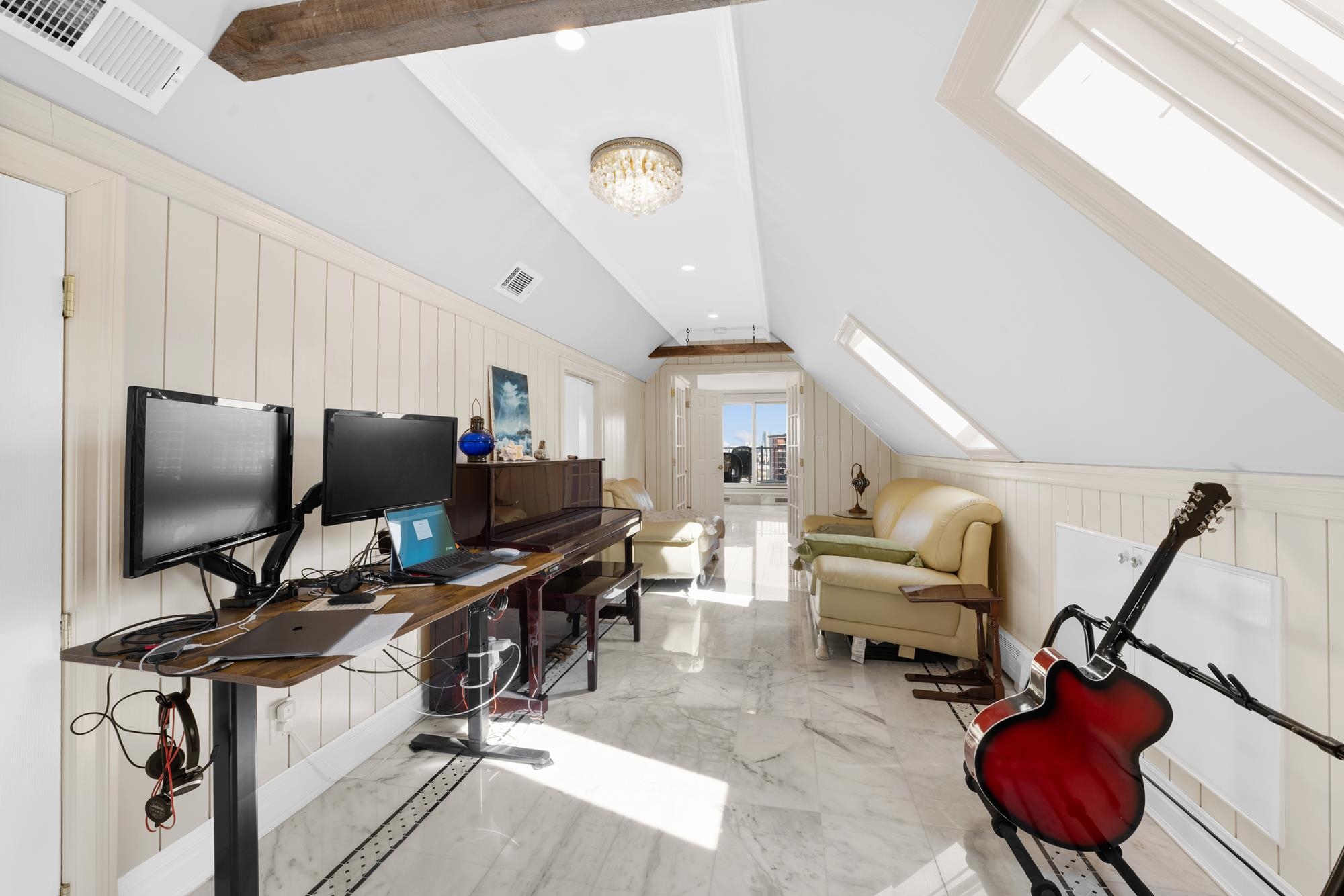 Experience expansive, multi-level living on Ogden Avenue with breathtaking NYC skyline views showcased from two private decks. Spanning over 2,300 square feet, this impressive residence also includes the rare convenience of two dedicated parking spaces—one garage and one driveway. The main level offers a thoughtfully designed layout featuring three generously sized bedrooms with plush new carpeting, two renovated full bathrooms including a primary en-suite with a jacuzzi tub, and an in-unit washer and dryer. The sleek, recently renovated kitchen features stainless steel appliances and flows seamlessly into a bright, open living area that leads directly to your first private outdoor retreat with stunning city views. Upstairs, you’ll find a spacious additional bedroom, a full bathroom, a walk-in closet, and a versatile second living space—perfect for relaxing or entertaining—that opens to a second private deck overlooking the skyline. Ideally located just moments from NYC-bound transportation, the Light Rail, local shops, restaurants, and the popular Riverview Park farmers market, this home offers the perfect blend of space, comfort, and convenience.