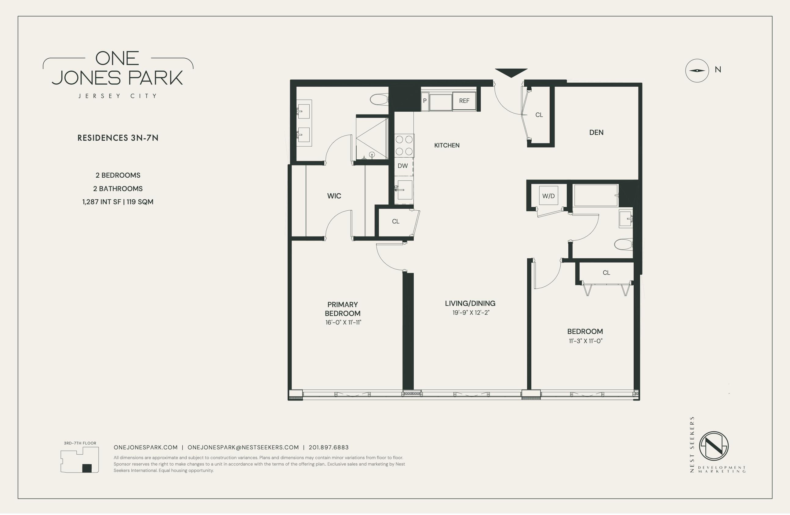 5N is a meticulous two bedroom plus den. One Jones Park – an extraordinary collection of 75 exclusive residences at 387 8th Street in Jersey City’s prestigious Hamilton Park, where incredible artisanship elevates urban living to unprecedented heights. Overlooking the greenery of Enos Jones Park, this architectural gem is nestled in a thriving neighborhood defined by tree-lined streets, an authentic community spirit, and proximity to some of Downtown Jersey City’s most coveted restaurants, cafés, transportation hubs, and entertainment destinations. Each meticulously crafted 1- to 3-bedroom home showcases the finest materials sourced from Italy’s most revered artisans. The gourmet kitchens feature bespoke Meson’s cabinetry with rich wood-textured melamine finishes and premium quartz surfaces throughout. World-class Bosch and Miele appliances complete the culinary experience. Premium Garbelotto 4¾" oak engineered hardwood floors embody centuries of European craftsmanship and flow throughout each residence. The stunning Italian marble bathrooms showcase grand 12" x 24" format stone. Barausse entry doors and Viva interior doors frame each space with architectural distinction. Residents enjoy white-glove service with a 24-hour doorman, a state-of-the-art fitness center, children’s playroom, and a spectacular rooftop lounge offering commanding views of Manhattan’s iconic skyline, Hoboken’s waterfront, and Journal Square’s dynamic horizon. Precision-engineered Schüco windows maximize natural light, while luxury Kohler fixtures throughout the bathrooms provide daily indulgences worthy of the world’s finest hotels. With preferred parking available on-site, One Jones Park represents more than a residence—it’s a statement of refined living, enhanced by Italian excellence, and surrounded by one of Jersey City’s most dynamic and desirable communities. One Jones Park. Home to the New buyer. Now available for immediate occupancy.