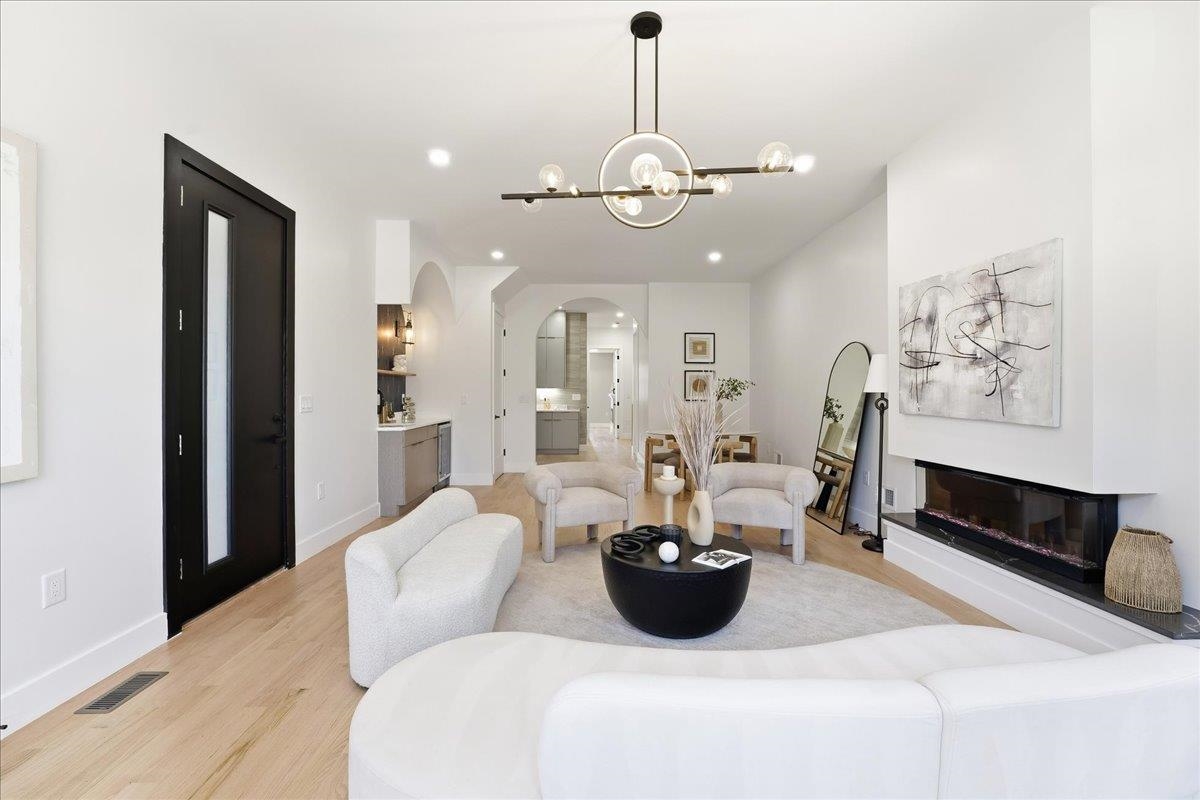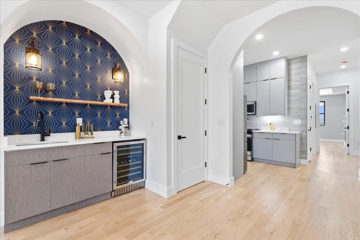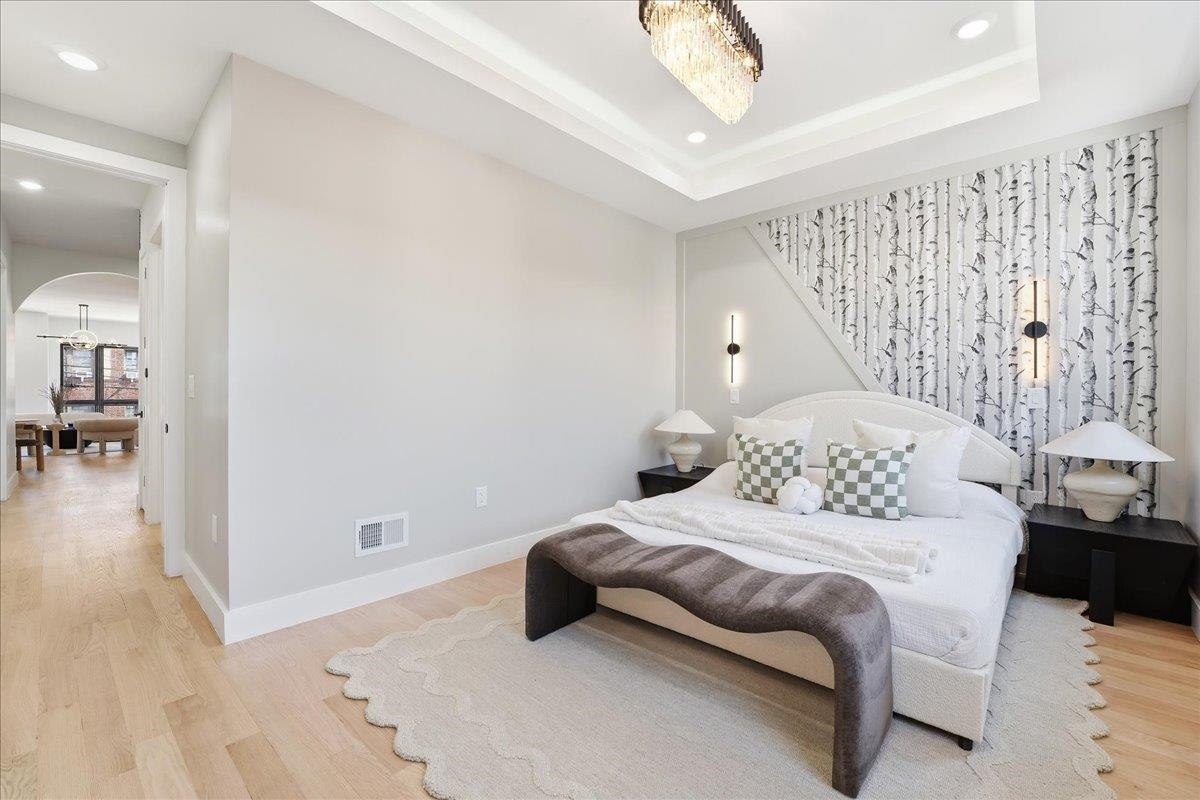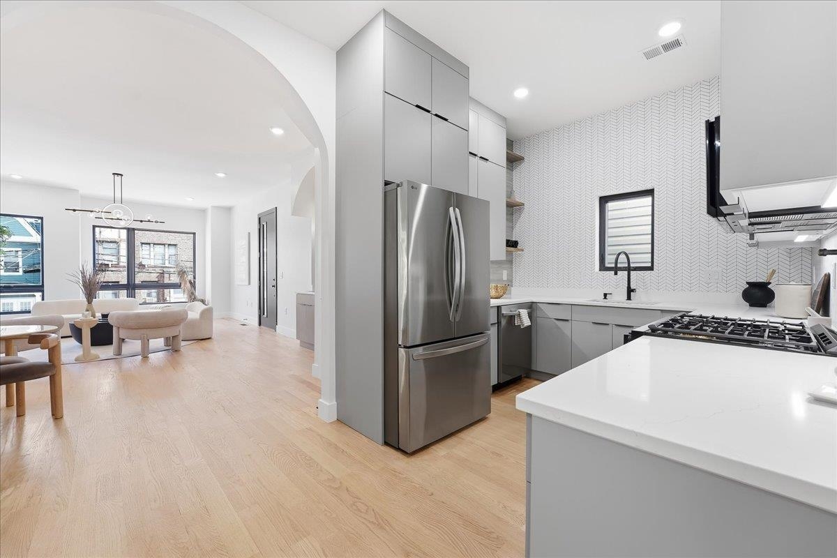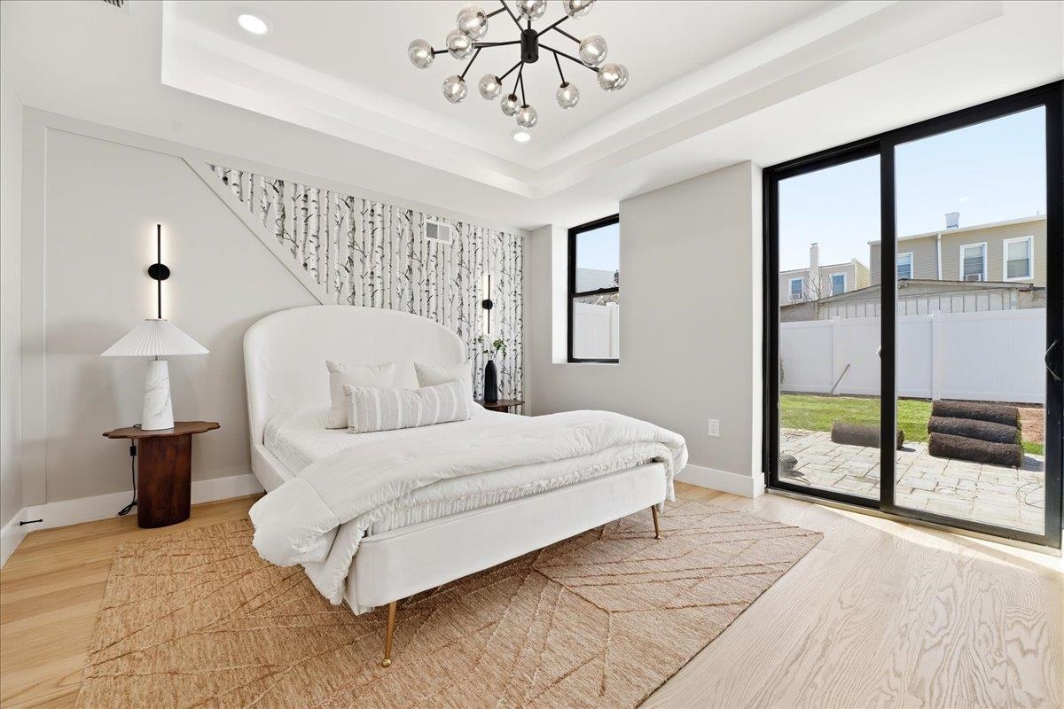 Beauty meets balance at this brand new residence in Jersey City’s West Side, where clean-lined contemporary interiors are enhanced by elegant arches, understated tones, and organic geometric accents. This two-story, 3 bedroom, 3 bath home with a private backyard pairs spacious proportions with warm, modern design throughout, offering elevated living that feels both refined and deeply livable. Built by one of Jersey City’s longtime development teams including an experienced designer, the residence reflects thoughtful execution and expert craftsmanship at every turn. Throughout the home, wide-plank light oak flooring, high ceilings, oversized windows, and carefully chosen lighting create a bright, composed atmosphere. Architectural choices like graceful archways, custom niche cutouts, and thoughtful built-ins add both character and utility, while modern fireplaces bring warmth and style to the living room as well as the primary ensuite. The kitchen brings elegance, anchored by waterfall white quartz countertops, a tile backsplash, custom gray cabinetry carried to the ceiling, exposed shelving, LG appliances, and matte black fixtures, including a pot filler. Entertaining unfolds effortlessly with the cerulean-toned dry bar with wine fridge set amid the open floorplan living space. The primary bedroom is finished with an Aspen-inspired wallpaper feature wall, built-in bedside sconces, a tray ceiling with cove lighting plus crystal chandelier, fireplace, and a finished walk-in closet. Bathrooms feel polished and serene, with tray ceiling detail, tile carried to the ceiling, glass showers, smart mirrors, LED-lit niches, and matte black fixtures that create a look both clean and relaxing. An additional garden-level ensuite bedroom adds flexibility to the layout, ideal for guests, a home office, or a more private retreat within the home. A rare added convenience, the home also includes non-tandem garage parking with a side-by-side EV charging stations. Set in Jersey City’s evolving West Side, this neighborhood offers residential tranquility with tree-lined streets and parks, as well as connection to NYC and surrounding community. Nearby, Lincoln Park offers 273 acres of green space, trails, recreation, and sports amenities, while neighborhood favorites like New Tavern, Snapdragon Café, Carmine's, and Pompei Pizza become everyday staples. Blocks to West Side Light Rail or MLK Light Rail stations with transfers to PATH and ferry, NYC commuting is a breeze.