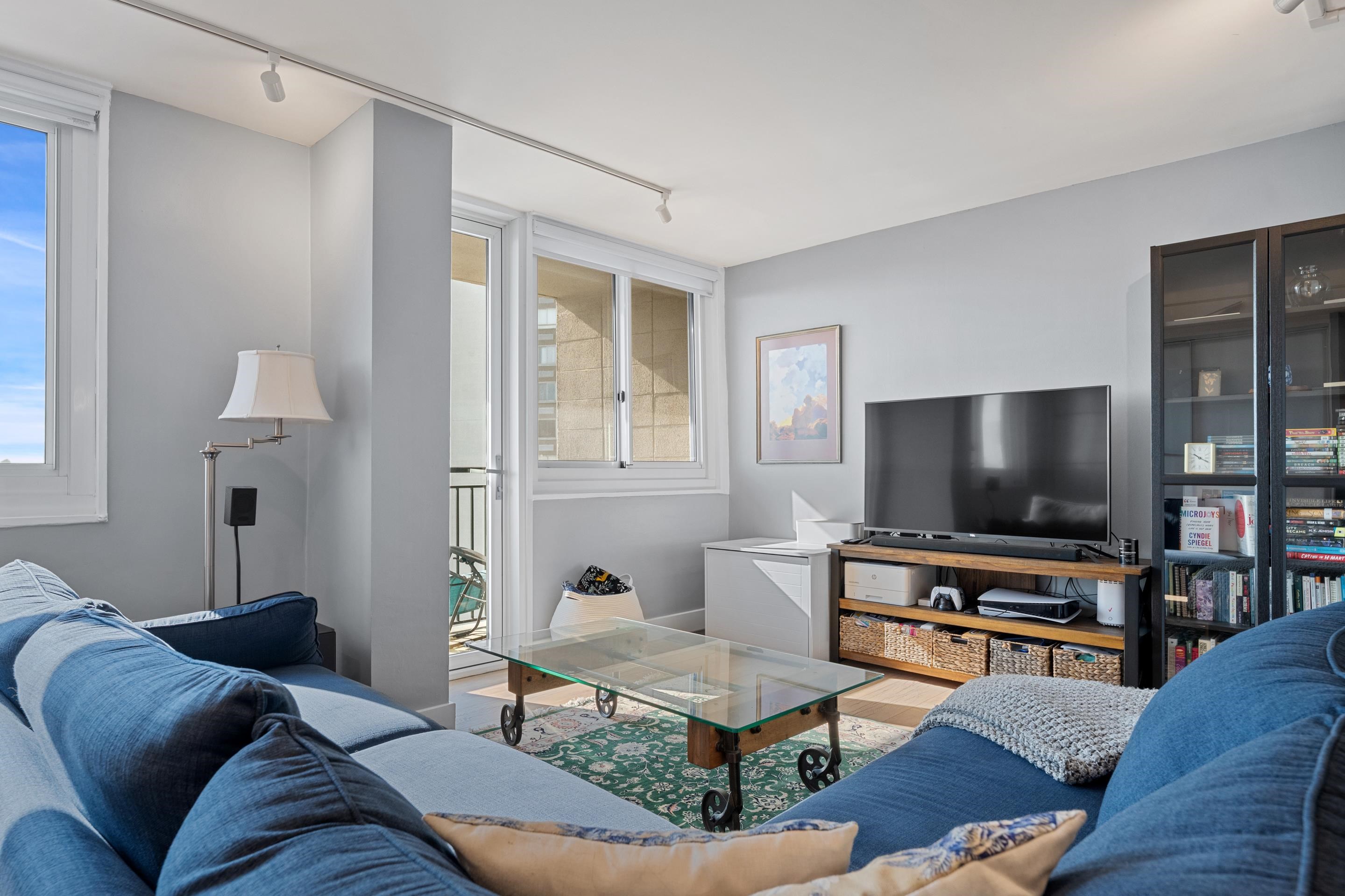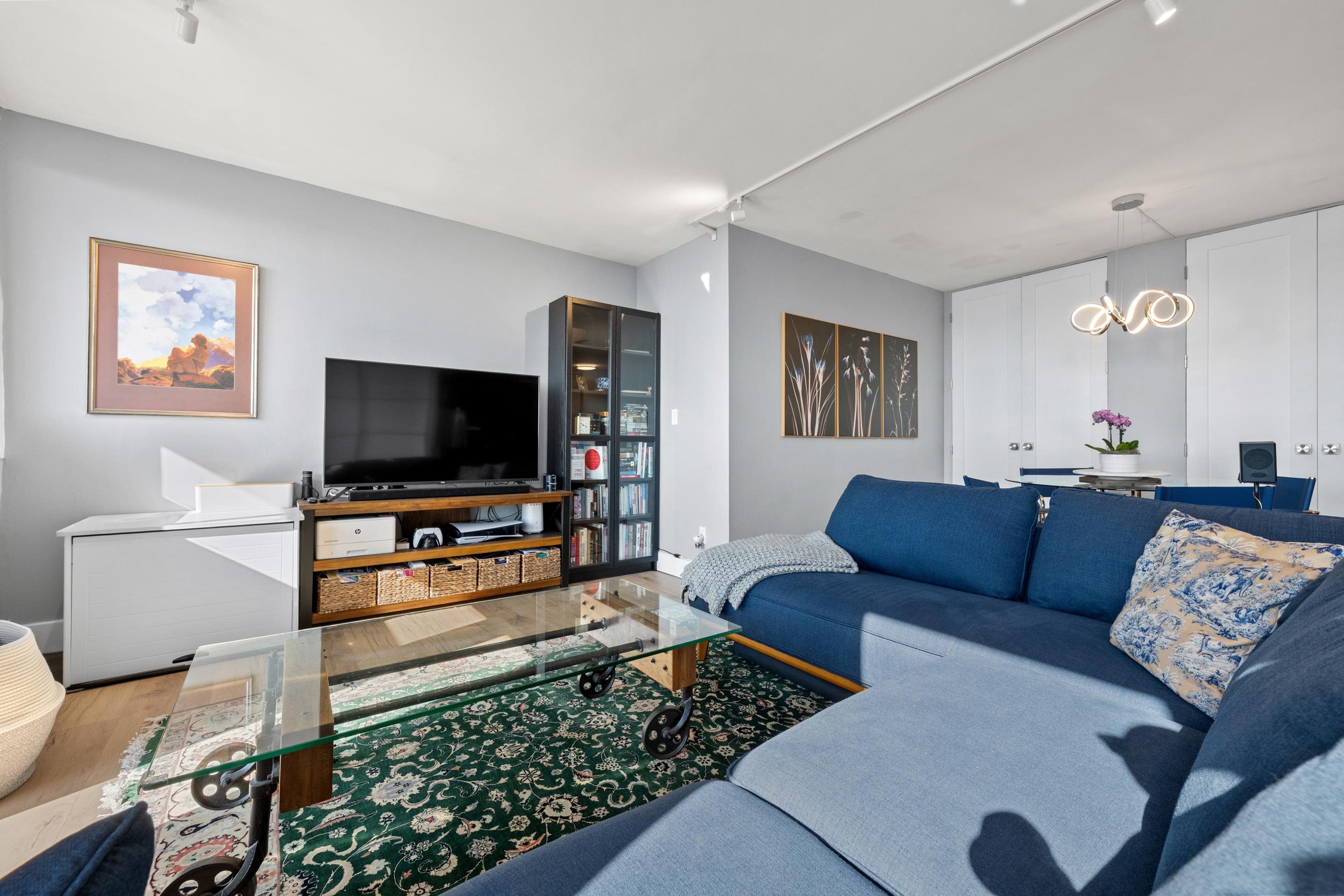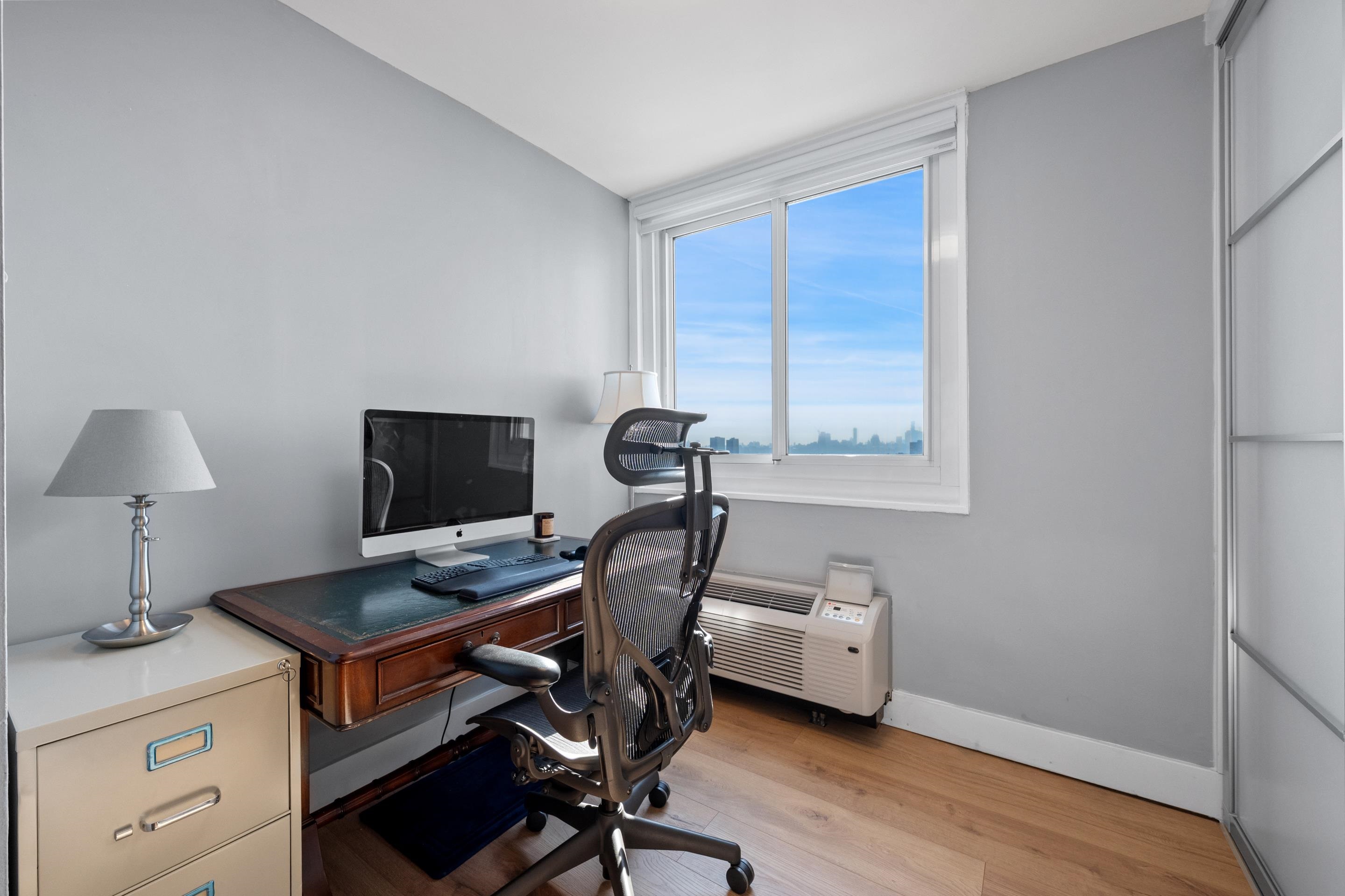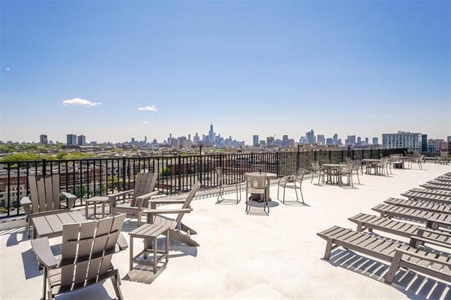 Welcome to this exceptional residence, an oversized one-bedroom with converted second room, perfect for a growing family or those in need of a home office or guest space. Step out onto your private terrace and enjoy panoramic views of Hudson Yards, The Empire State Building, The Freedom Tower, and the Hudson River. The newly installed soundproof windows create a tranquil sanctuary inside. The fully renovated kitchen is a chef's dream, featuring an induction stove, a microwave drawer, a large stainless steel sink, and stunning soapstone countertops with a matching island. Natural-toned flooring and an abundance of storage space flow throughout the home. The large master bedroom features a generous double door closet. The converted second room is a comfortable and private space. The bathroom offers a classic design with subway-style tile, black and white ceramic floor tiles, and a pedestal sink. Located directly across the street from Washington Park, you have immediate access to a large dog run, tennis courts, a basketball court, and playgrounds via a convenient footbridge. This full-service building offers a coveted location just minutes from NYC via public transportation. A complimentary morning drop-off shuttle service is available to the Hoboken PATH and NY Waterway Ferry. Building amenities include a 24-hour concierge, an outdoor pool, a community garden, a residents' lounge, a gym, a dry cleaner, and a deli. A daycare with three and four-year-old programs is also available on-site. Parking is offered for a reasonable $160 per month. Maintenance includes taxes, electric, AC, heat, and hot/cold water. Please note that the assessment has been fully paid by the seller. All reasonable offers will be considered. Please contact to arrange a physical or virtual showing.