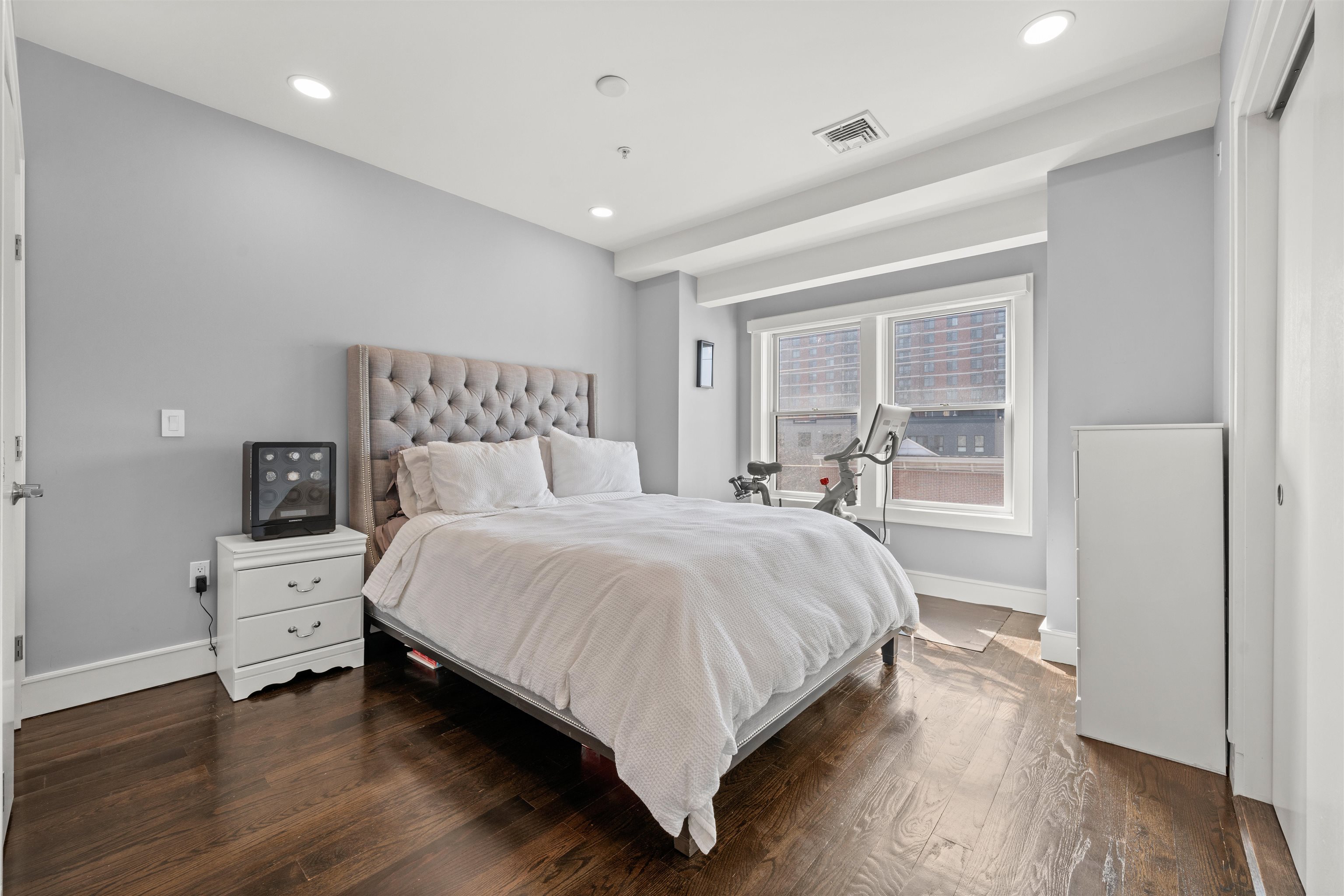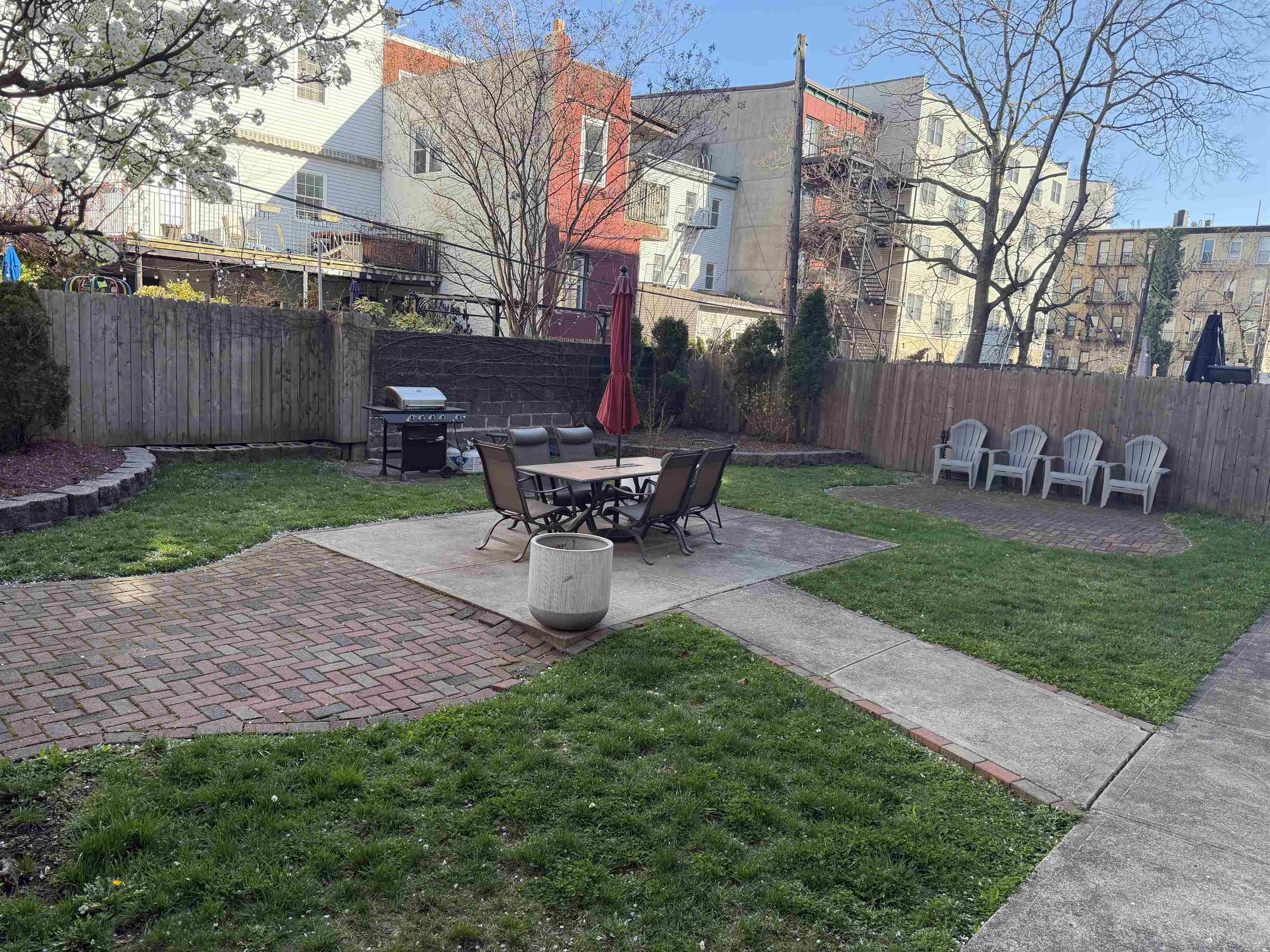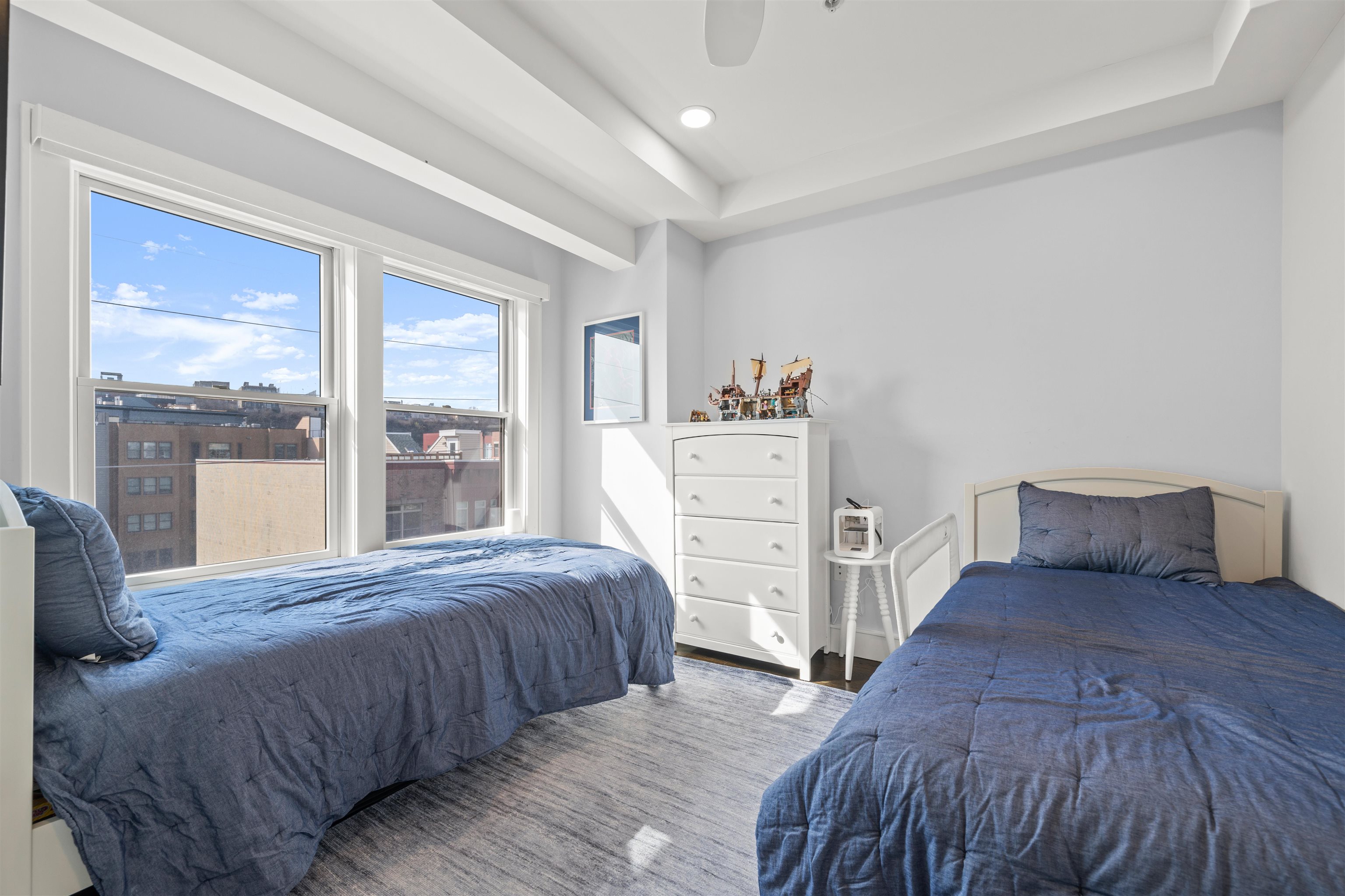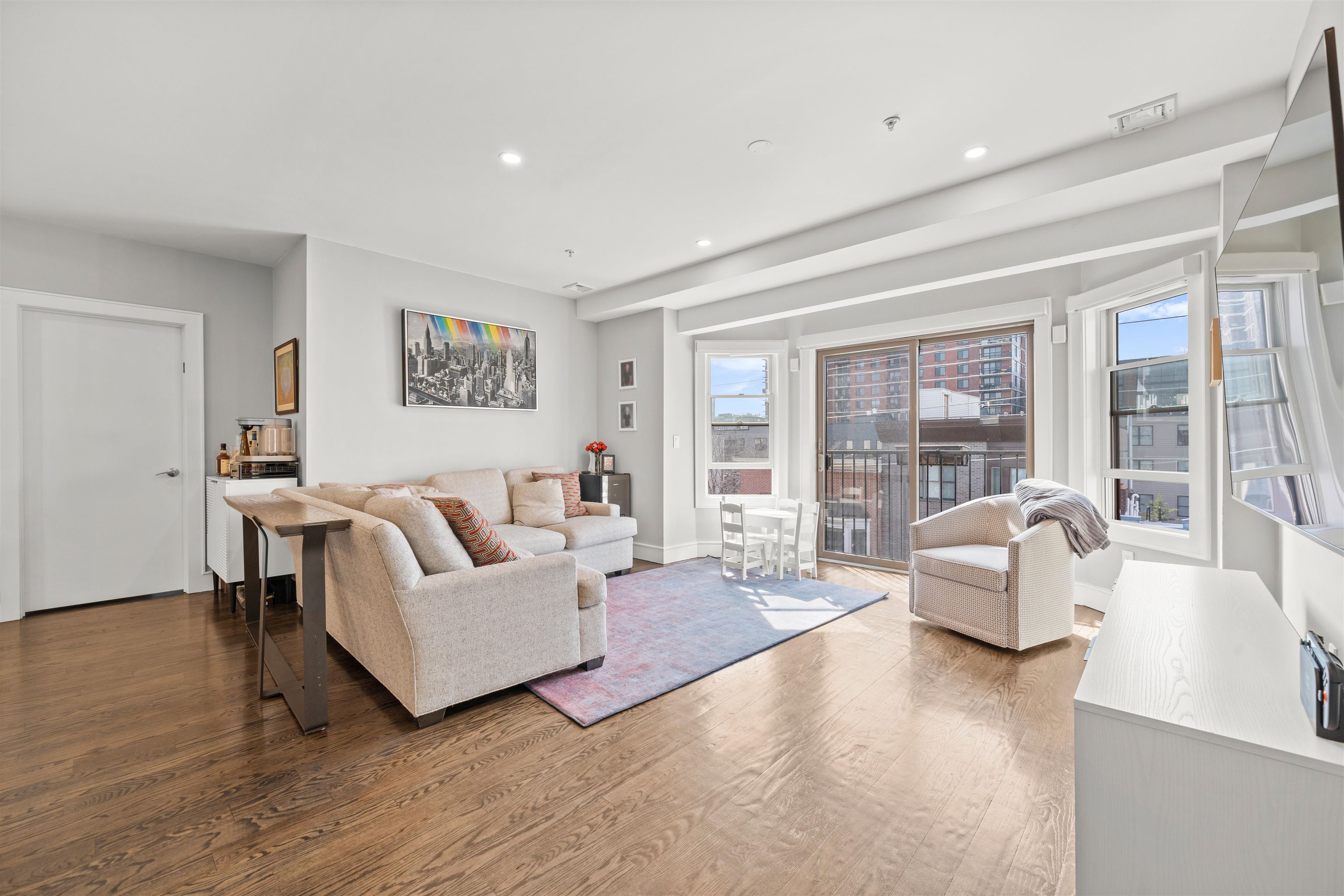 Welcome to 123 Jackson Street, a top-floor residence offering 1,308 square feet of refined living in one of Hoboken’s most sought-after neighborhoods, complete with garage parking. This 2-bedroom + den, 2-bath home combines natural light, functional design, and a true neighborhood feel within an intimate eight-unit boutique building. With southwest exposure and top-floor positioning, the home is filled with natural light throughout the day while offering added privacy with no one above. The open-concept layout is bright and airy, featuring high ceilings and a seamless flow between the living, dining, and kitchen spaces. The kitchen is designed for both everyday living and entertaining, featuring quartz countertops, custom cabinetry, stainless steel appliances, and generous storage. A versatile den provides the flexibility of a third bedroom, home office, or nursery, making the layout ideal for a variety of lifestyles. Additional features include Hunter Douglas motorized shades throughout, in-unit laundry, and ample closet space. The building offers an elevator and a beautifully landscaped shared backyard, providing a rare combination of convenience and outdoor space in Hoboken. Located directly across from Jackson Street Park and minutes from Southwest Resiliency Park, enjoy access to pickleball courts, a dog park, playgrounds, summer concerts, and a weekly farmers market. Commuting is seamless with proximity to the 2nd Street Light Rail, NJ Transit bus on Willow Avenue, the Hop shuttle to the PATH, and Hoboken Terminal. Surrounded by coffee shops, daycares, and local favorites including Zack’s, Antique Bakery, Dear Maud, and Leo’s, with a new grocery store coming to the area, this is southwest Hoboken at its best.