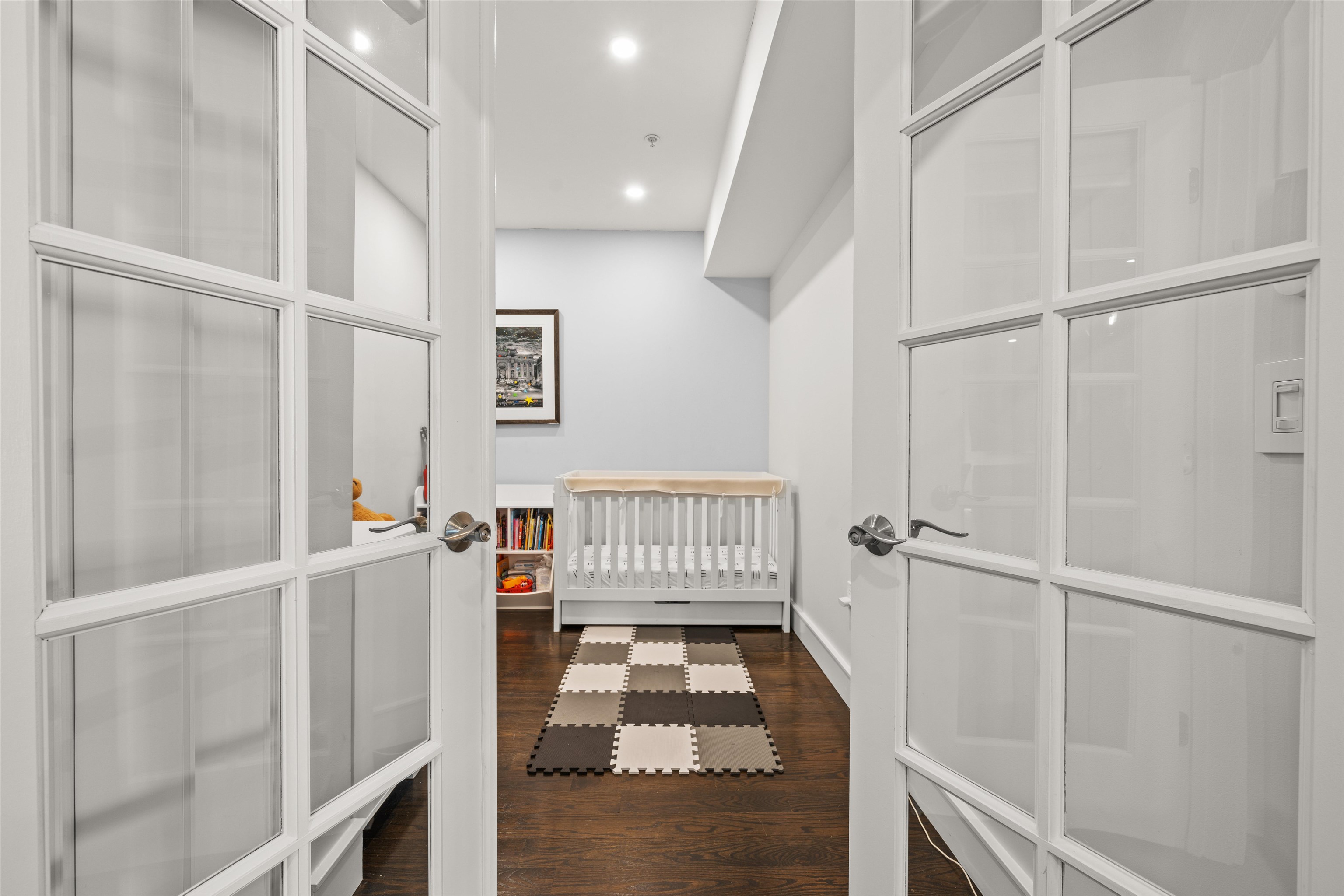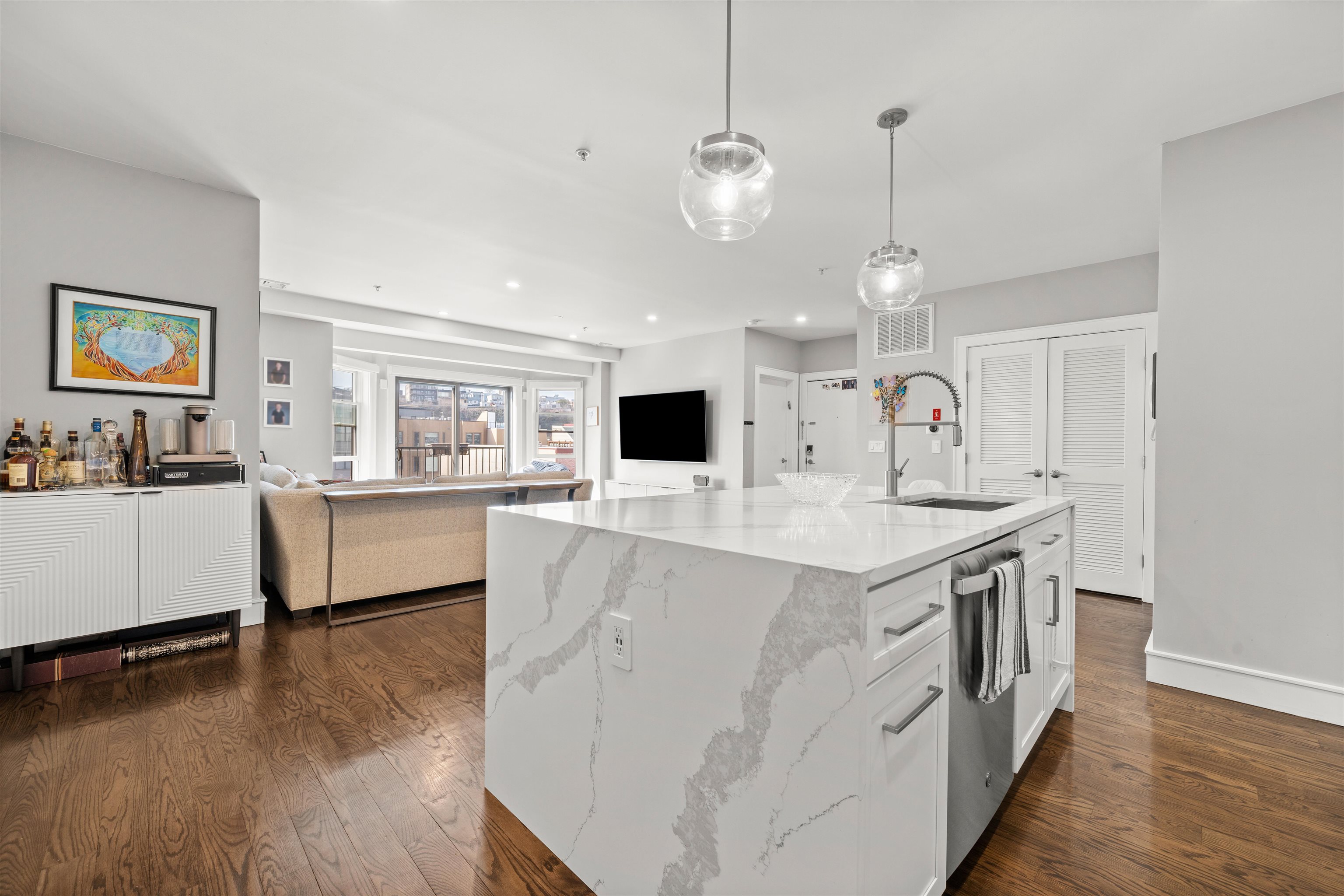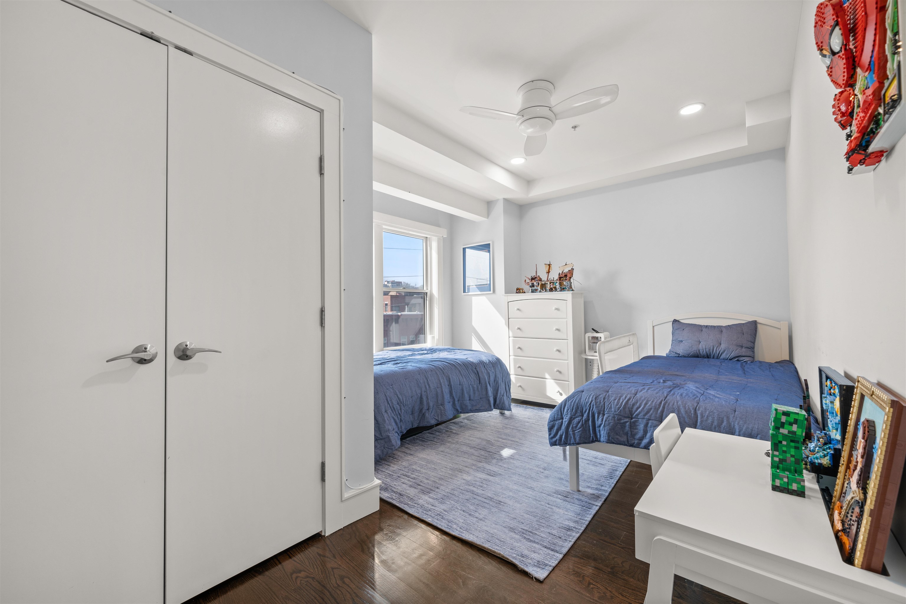 Welcome to 123 Jackson Street, a top-floor residence offering 1,308 square feet of refined living in one of Hoboken’s most sought-after neighborhoods, complete with garage parking. This 2-bedroom + den, 2-bath home combines natural light, functional design, and a true neighborhood feel within an intimate eight-unit boutique building. With southwest exposure and top-floor positioning, the home is filled with natural light throughout the day while offering added privacy with no one above. The open-concept layout is bright and airy, featuring high ceilings and a seamless flow between the living, dining, and kitchen spaces. The kitchen is designed for both everyday living and entertaining, featuring quartz countertops, custom cabinetry, stainless steel appliances, and generous storage. A versatile den provides the flexibility of a third bedroom, home office, or nursery, making the layout ideal for a variety of lifestyles. Additional features include Hunter Douglas motorized shades throughout, in-unit laundry, and ample closet space. The building offers an elevator and a beautifully landscaped shared backyard, providing a rare combination of convenience and outdoor space in Hoboken. Located directly across from Jackson Street Park and minutes from Southwest Resiliency Park, enjoy access to pickleball courts, a dog park, playgrounds, summer concerts, and a weekly farmers market. Commuting is seamless with proximity to the 2nd Street Light Rail, NJ Transit bus on Willow Avenue, the Hop shuttle to the PATH, and Hoboken Terminal. Surrounded by coffee shops, daycares, and local favorites including Zack’s, Antique Bakery, Dear Maud, and Leo’s, with a new grocery store coming to the area, this is southwest Hoboken at its best.