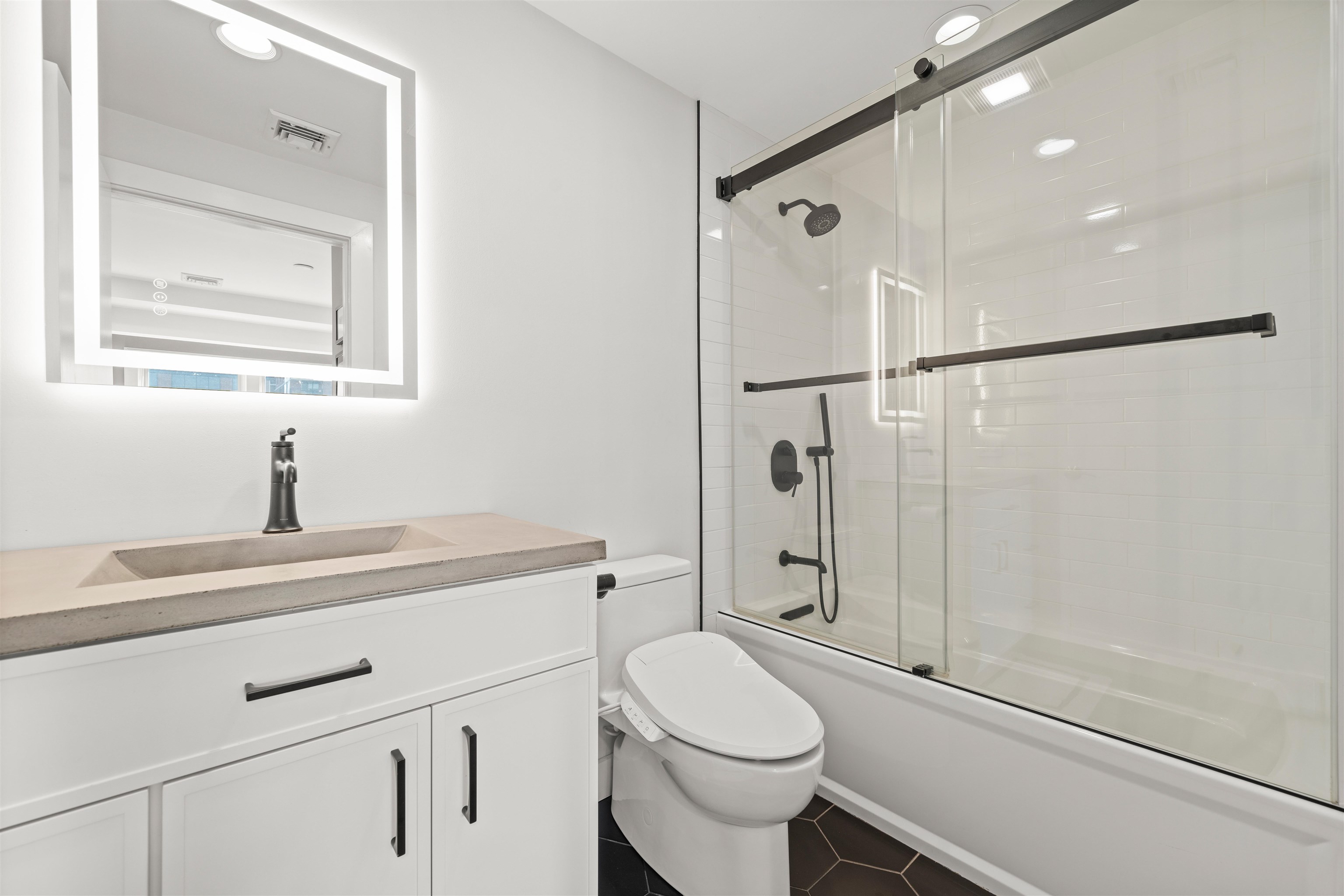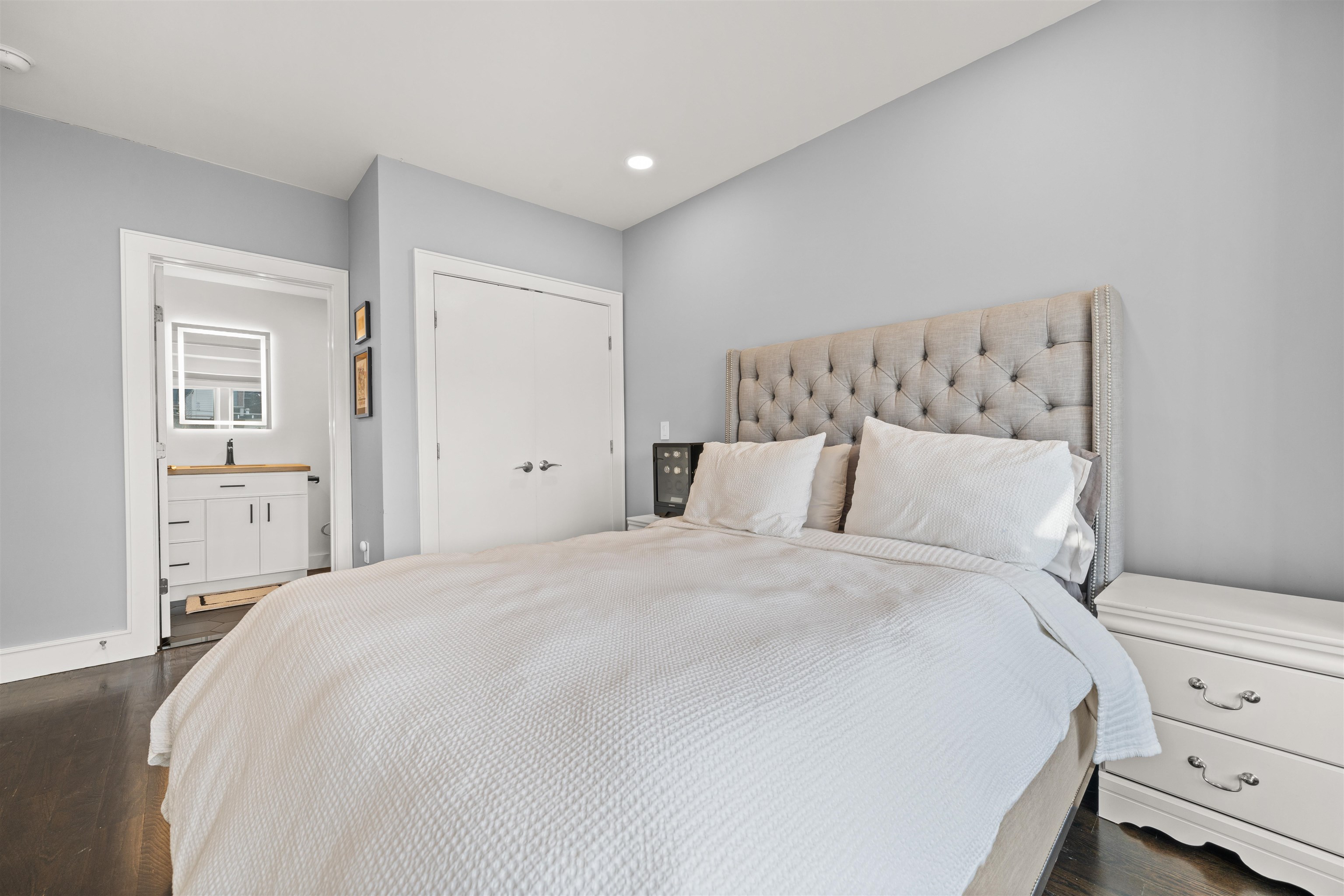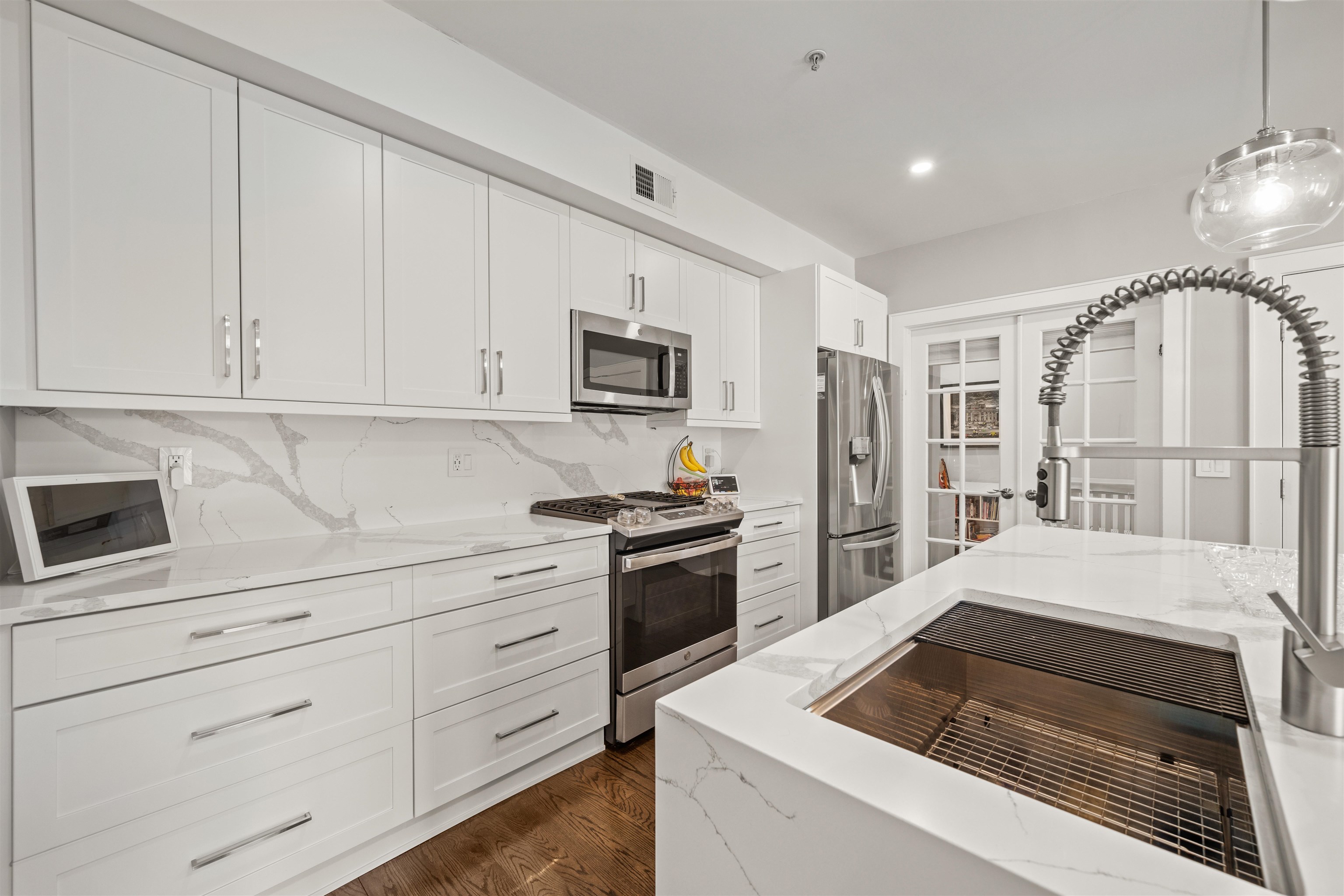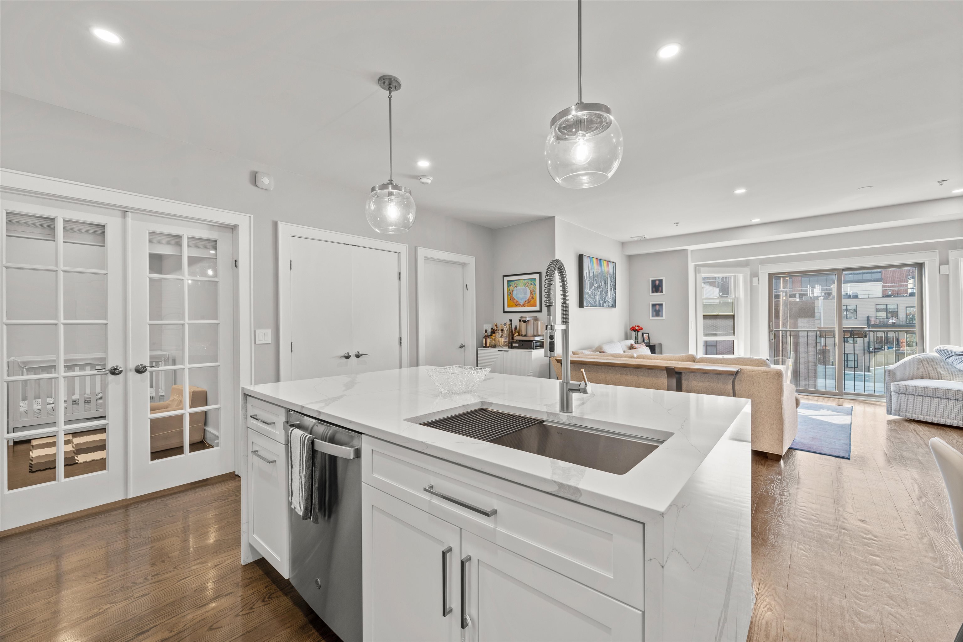 Welcome to 123 Jackson Street, a top-floor residence offering 1,308 square feet of refined living in one of Hoboken’s most sought-after neighborhoods, complete with garage parking. This 2-bedroom + den, 2-bath home combines natural light, functional design, and a true neighborhood feel within an intimate eight-unit boutique building. With southwest exposure and top-floor positioning, the home is filled with natural light throughout the day while offering added privacy with no one above. The open-concept layout is bright and airy, featuring high ceilings and a seamless flow between the living, dining, and kitchen spaces. The kitchen is designed for both everyday living and entertaining, featuring quartz countertops, custom cabinetry, stainless steel appliances, and generous storage. A versatile den provides the flexibility of a third bedroom, home office, or nursery, making the layout ideal for a variety of lifestyles. Additional features include Hunter Douglas motorized shades throughout, in-unit laundry, and ample closet space. The building offers an elevator and a beautifully landscaped shared backyard, providing a rare combination of convenience and outdoor space in Hoboken. Located directly across from Jackson Street Park and minutes from Southwest Resiliency Park, enjoy access to pickleball courts, a dog park, playgrounds, summer concerts, and a weekly farmers market. Commuting is seamless with proximity to the 2nd Street Light Rail, NJ Transit bus on Willow Avenue, the Hop shuttle to the PATH, and Hoboken Terminal. Surrounded by coffee shops, daycares, and local favorites including Zack’s, Antique Bakery, Dear Maud, and Leo’s, with a new grocery store coming to the area, this is southwest Hoboken at its best.
