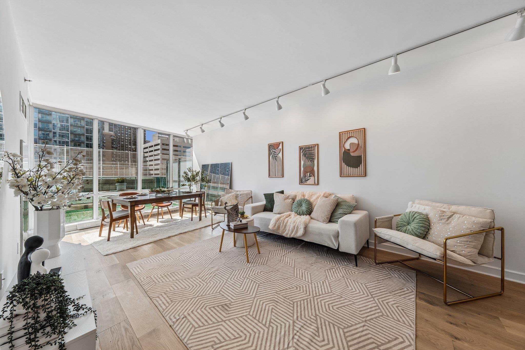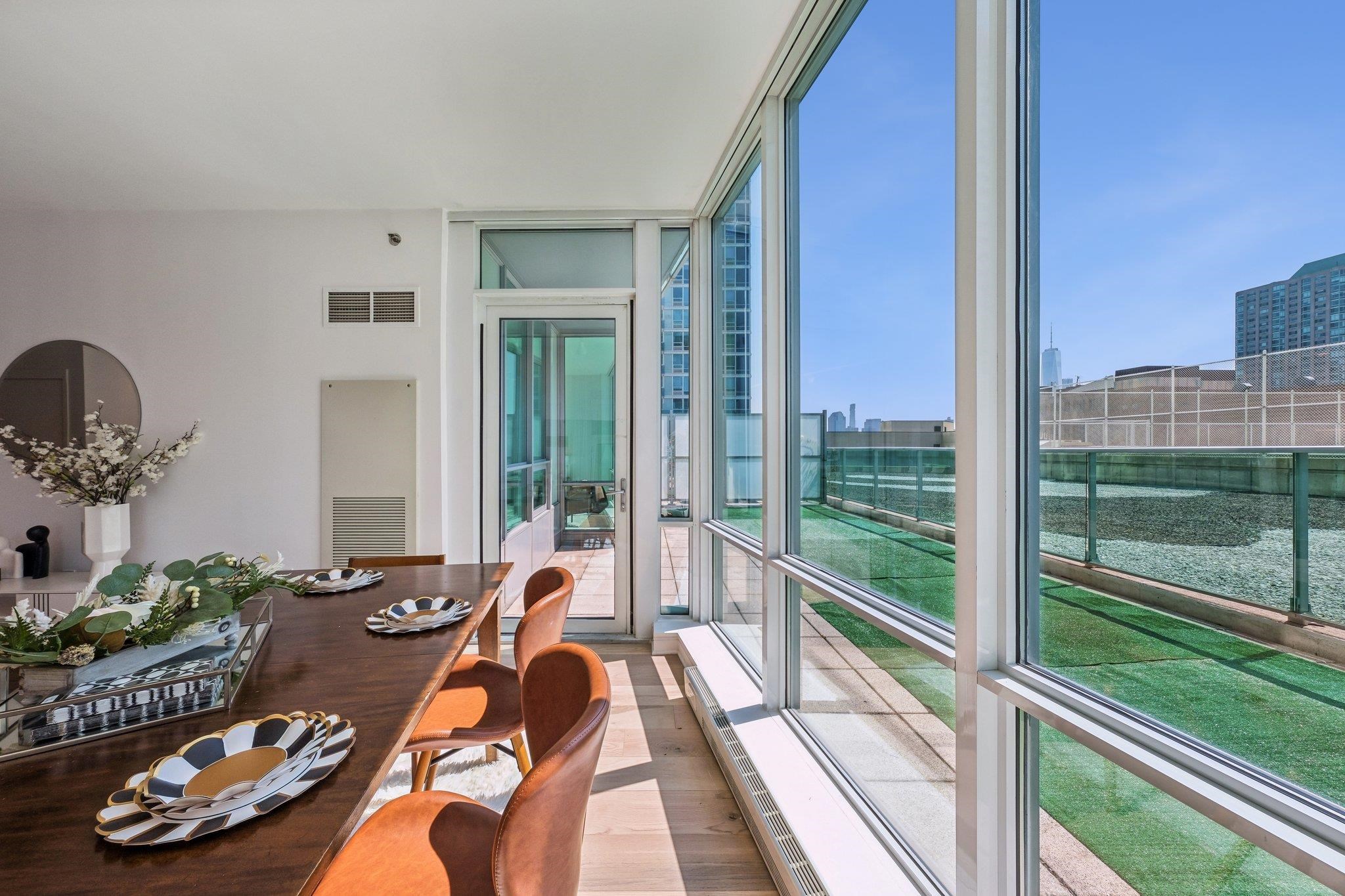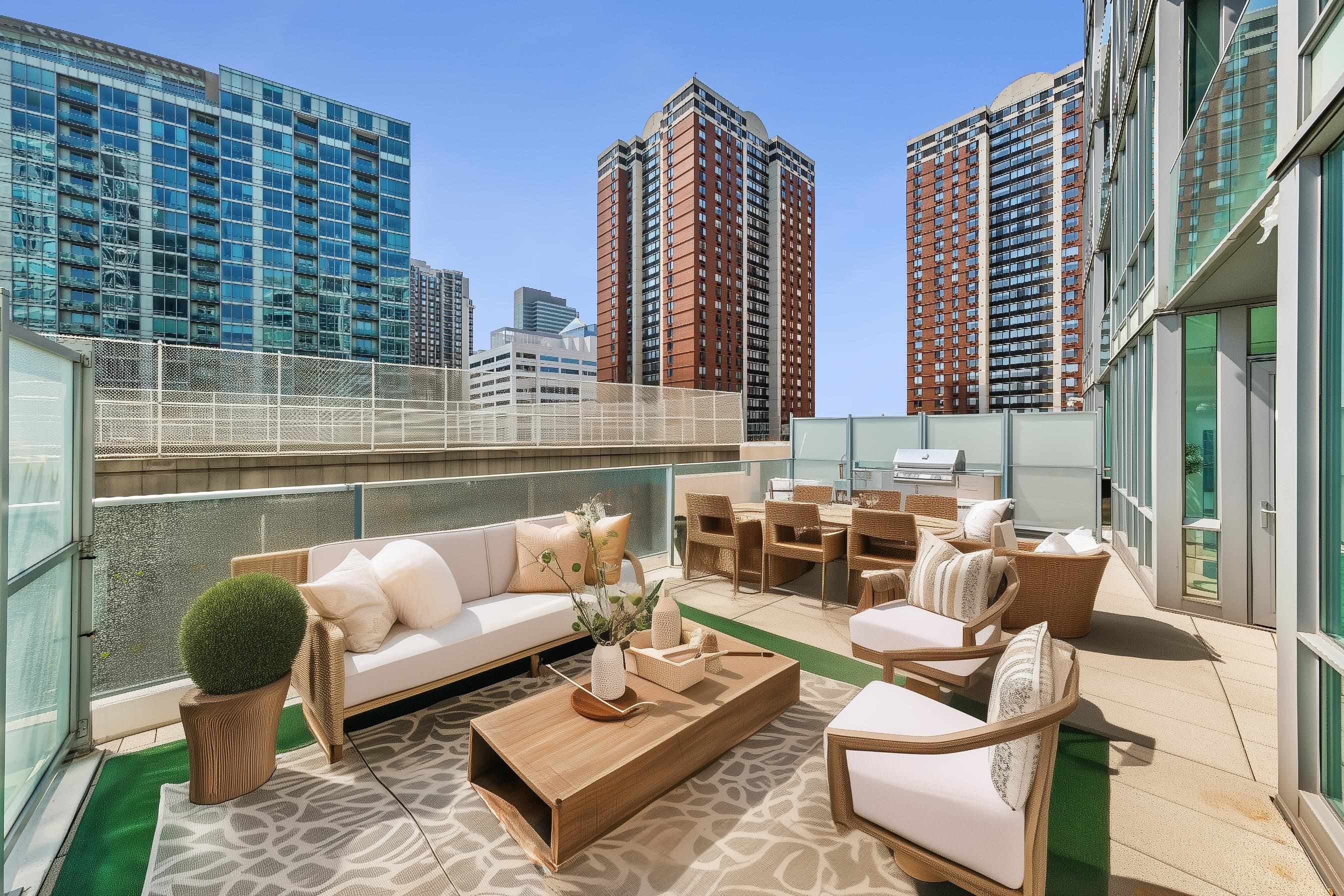 Experience modern sophistication in this sun-drenched 1,270 sq. ft. residence at the Shore Club, one of Newport’s most coveted luxury condominiums. The centerpiece of this home is a massive, nearly 600 sq. ft. private terrace—a rare urban oasis perfectly suited for grand-scale entertainment, a safe outdoor play area for kids, and relaxed family gatherings. In this unique space, barbecuing is permitted (electric/non-open flame) during designated hours, making it the ultimate setting for summer hosting. The interior has been meticulously renovated with brand-new premium white oak wide-plank flooring and freshly smoothed ceilings throughout. The fully upgraded gourmet kitchen is a showstopper, featuring a sleek U-shaped layout with white lacquer cabinetry, pristine white quartz countertops, a KitchenAid gas range (2021), and a newly upgraded Samsung dishwasher (2025). This home features a seamless open-concept design with South and East exposures, framed by floor-to-ceiling windows that flood the space with natural light and showcase a striking NYC skyline backdrop. The primary suite serves as a serene retreat, offering breathtaking Lower Manhattan and Freedom Tower views, a spacious walk-in closet plus an additional closet, and an en-suite bathroom with a double vanity, soaking tub, and walk-in shower. The guest bedroom is equally inviting, with generous proportions and a layout versatile enough to accommodate a queen-size bed. Additional conveniences include an in-unit Bosch washer/dryer (2021). Situated in a neighborhood designed for families and professionals alike, you are steps away from Newport Green Park, summer movie nights, and playgrounds. For families, Bright Horizons daycare is located just across the street, while Stevens Cooperative School is within easy walking distance. Commuting is a breeze with quick access to the Hoboken and Newport PATH stations, Ferry, and Light Rail. The Shore Club’s attentive staff ensures a worry-free living experience with 24-hour concierge, fitness center, sauna, and a rooftop deck. With on-site garage parking available and some of the lowest HOA fees on the waterfront, this residence offers outstanding value and the very best of Hudson River living. Schedule your private viewing today!
