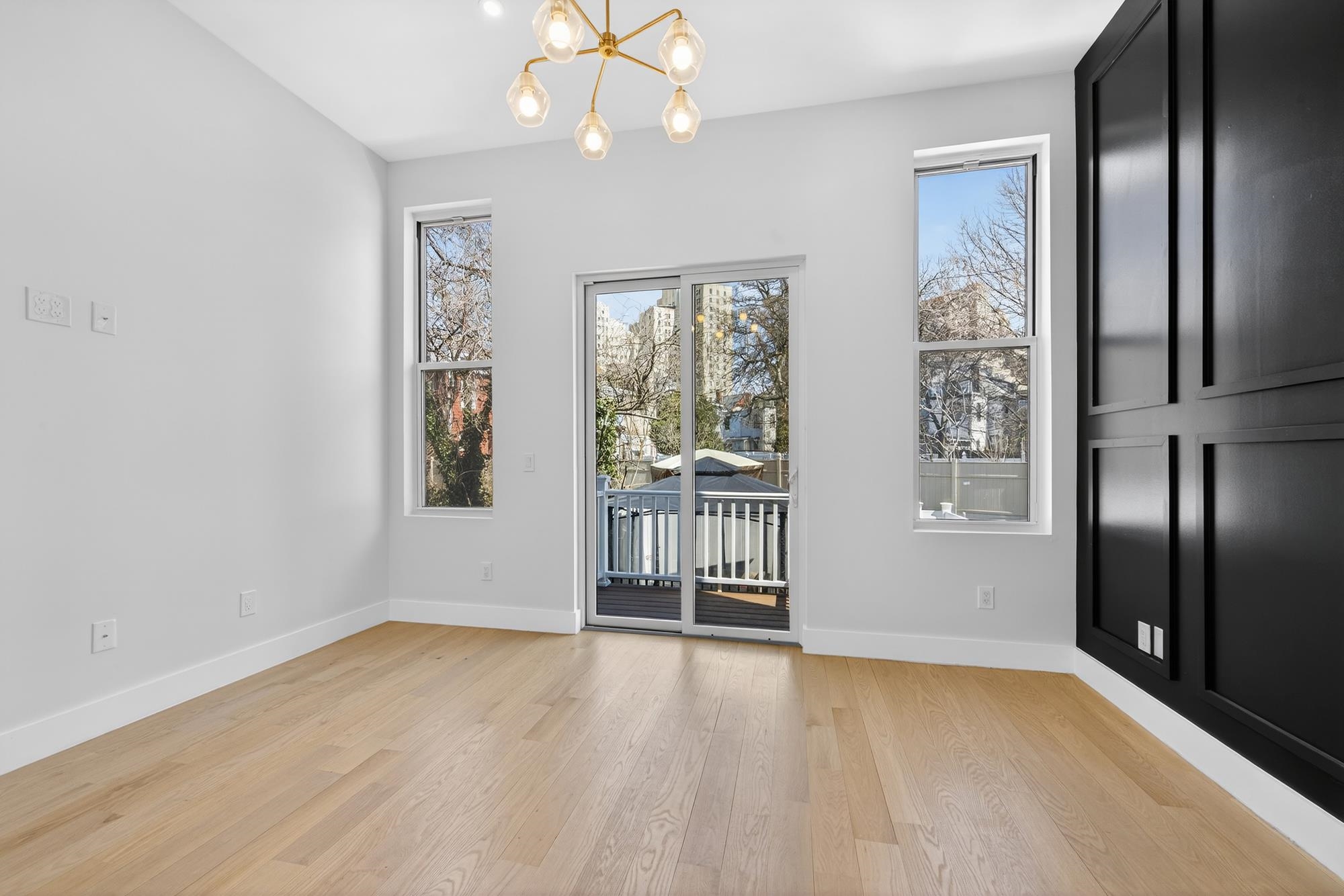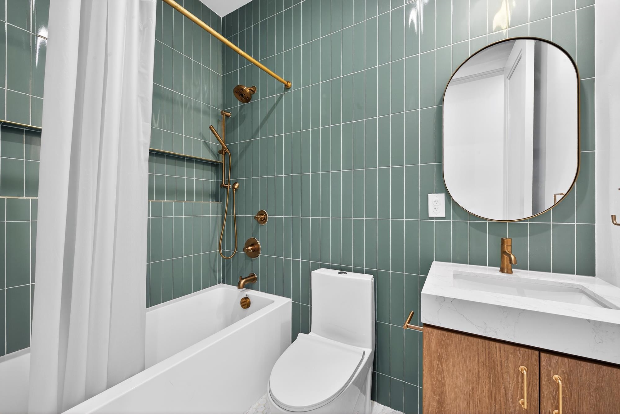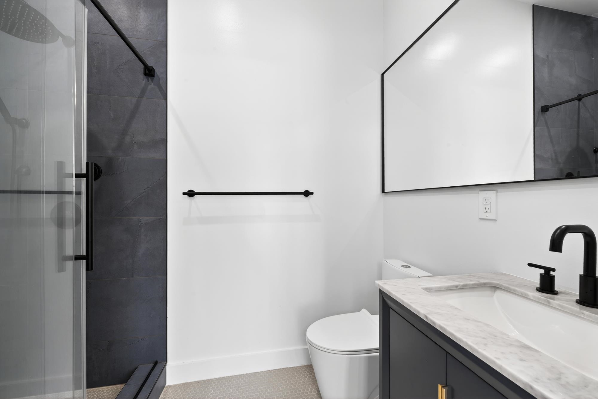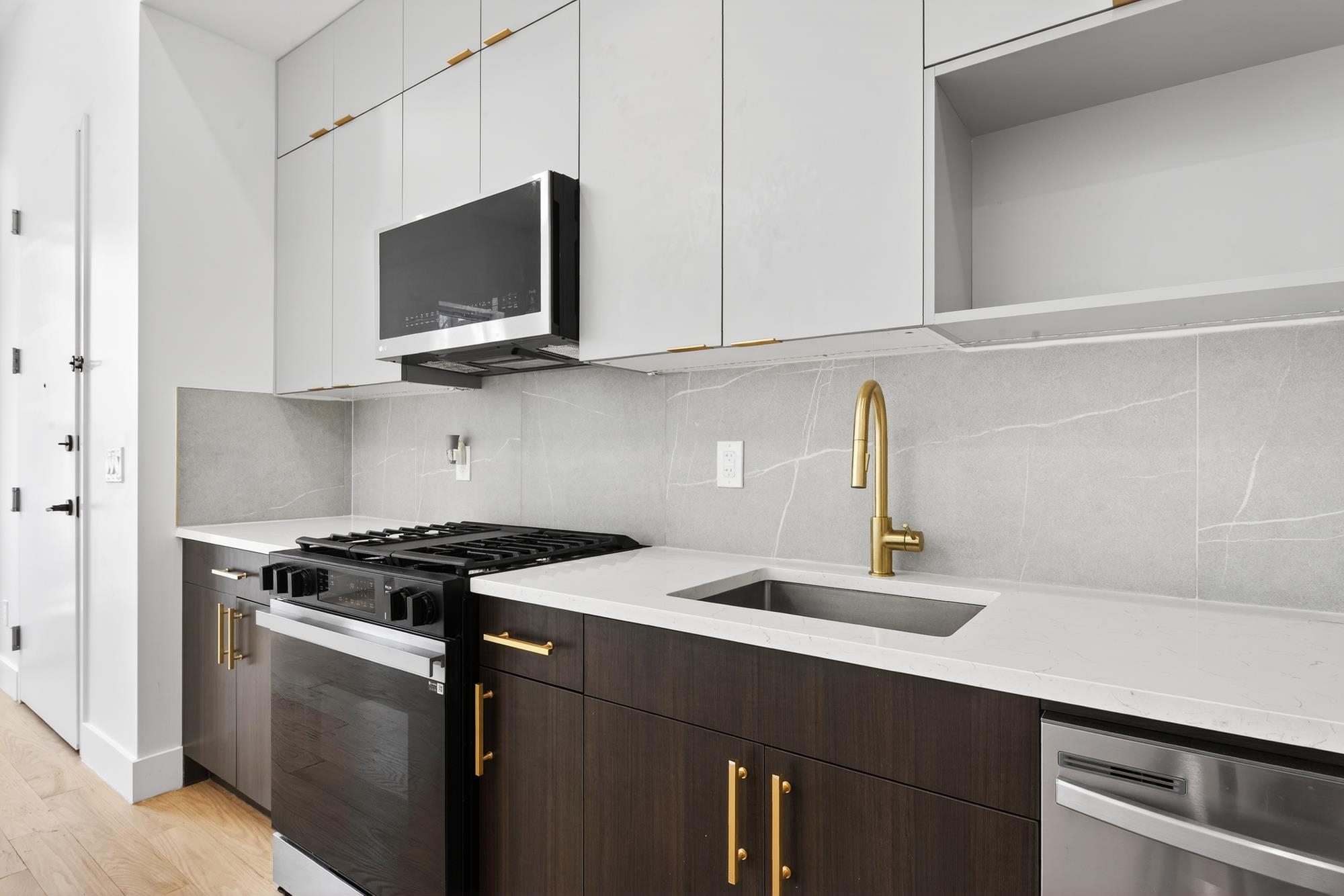 Stunning, recently gut renovated three bedroom and two bathroom condo with a balcony in a prime McGinley Square location! As you enter the condo you are immediately greeted with soaring ceilings and well-considered design that perfectly balances style and functionality. The open-concept living space is anchored by beautiful white oak hardwood floors that carry seamlessly throughout. The kitchen is thoughtfully designed with sleek quartz countertops, custom two-tone cabinetry with gold channel detailing, and Samsung appliances, including an integrated dishwasher for a clean, streamlined look. The bathrooms feature contemporary tilework, a soaking tub, and a glass-enclosed shower, offering both comfort and modern appeal. Additional highlights include central air conditioning, in-home laundry, recessed lighting throughout, and custom lighting fixtures that create a warm and inviting atmosphere. Located in a thriving neighborhood, this home is surrounded by array of popular dining destinations and shops including Target. The building is in close proximity to Liberty State Park, Lincoln Park, and Fairmount Park with a playground right around the corner. With the JSQ PATH less than a mile away and frequent bus service nearby, commuting to NYC is quick and convenient.
