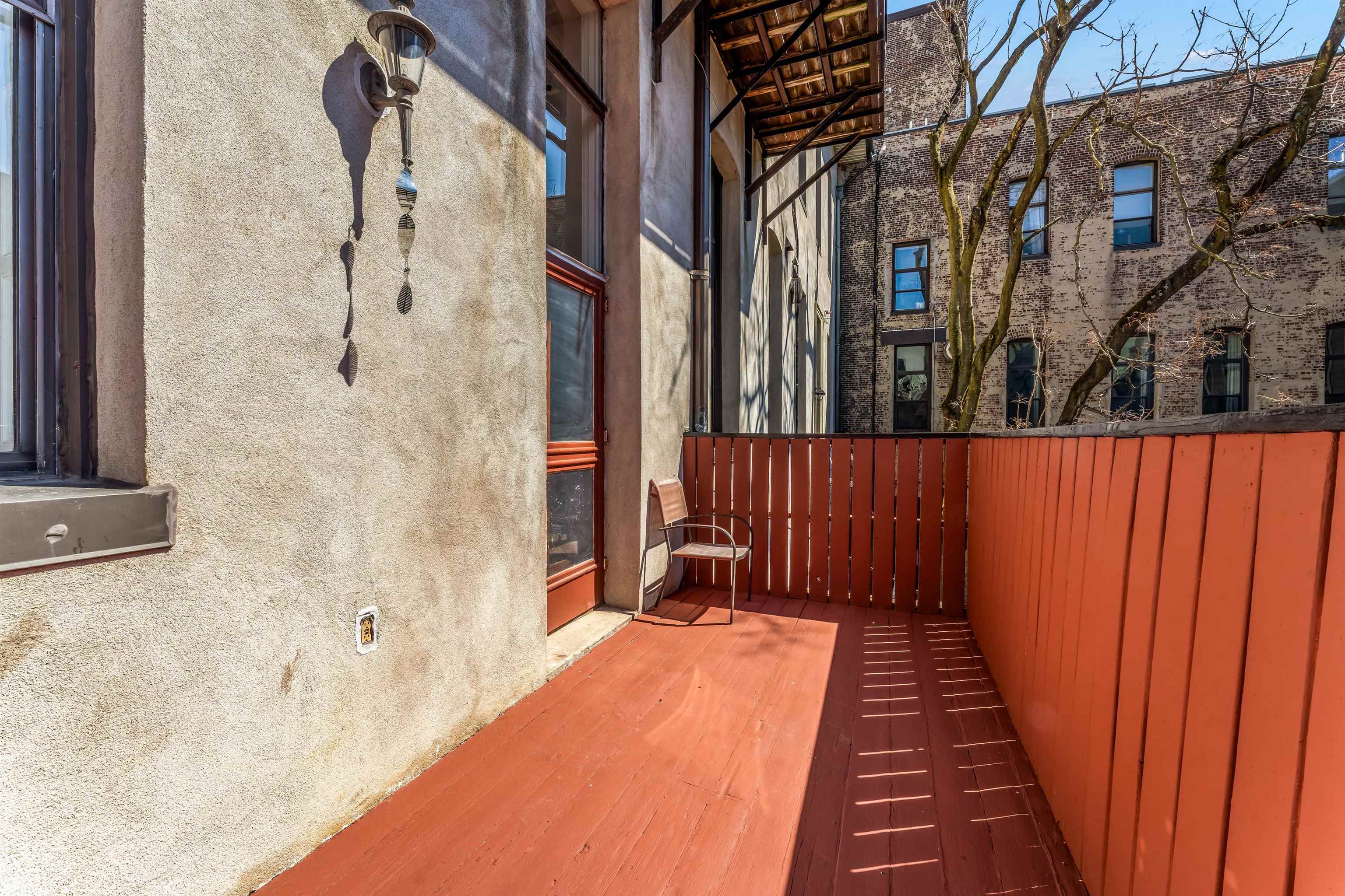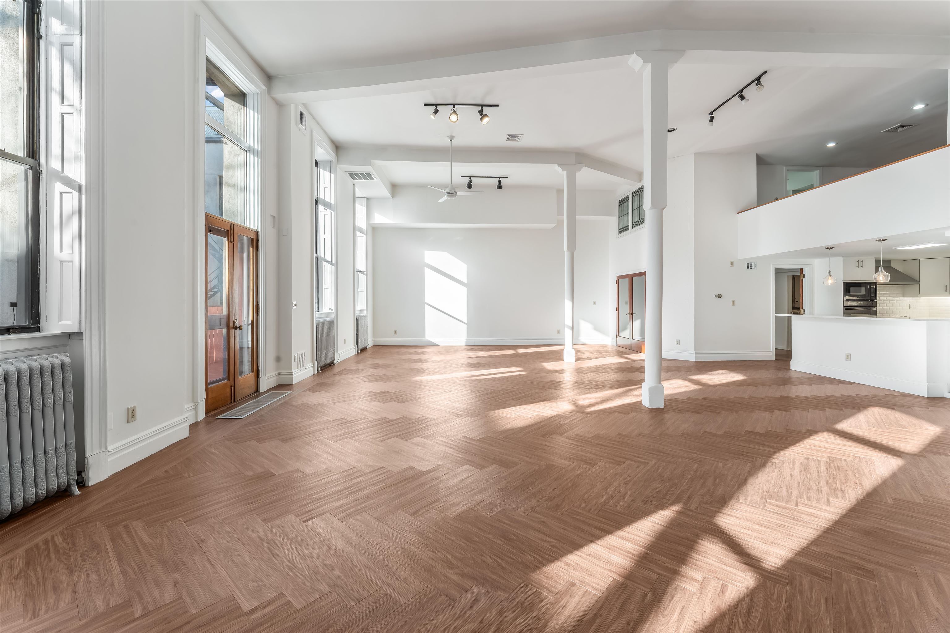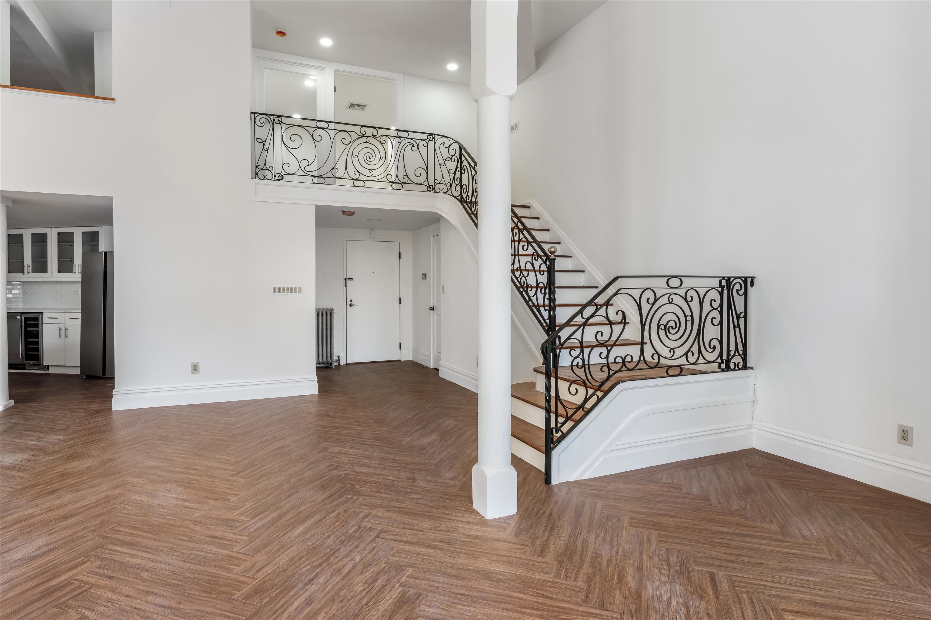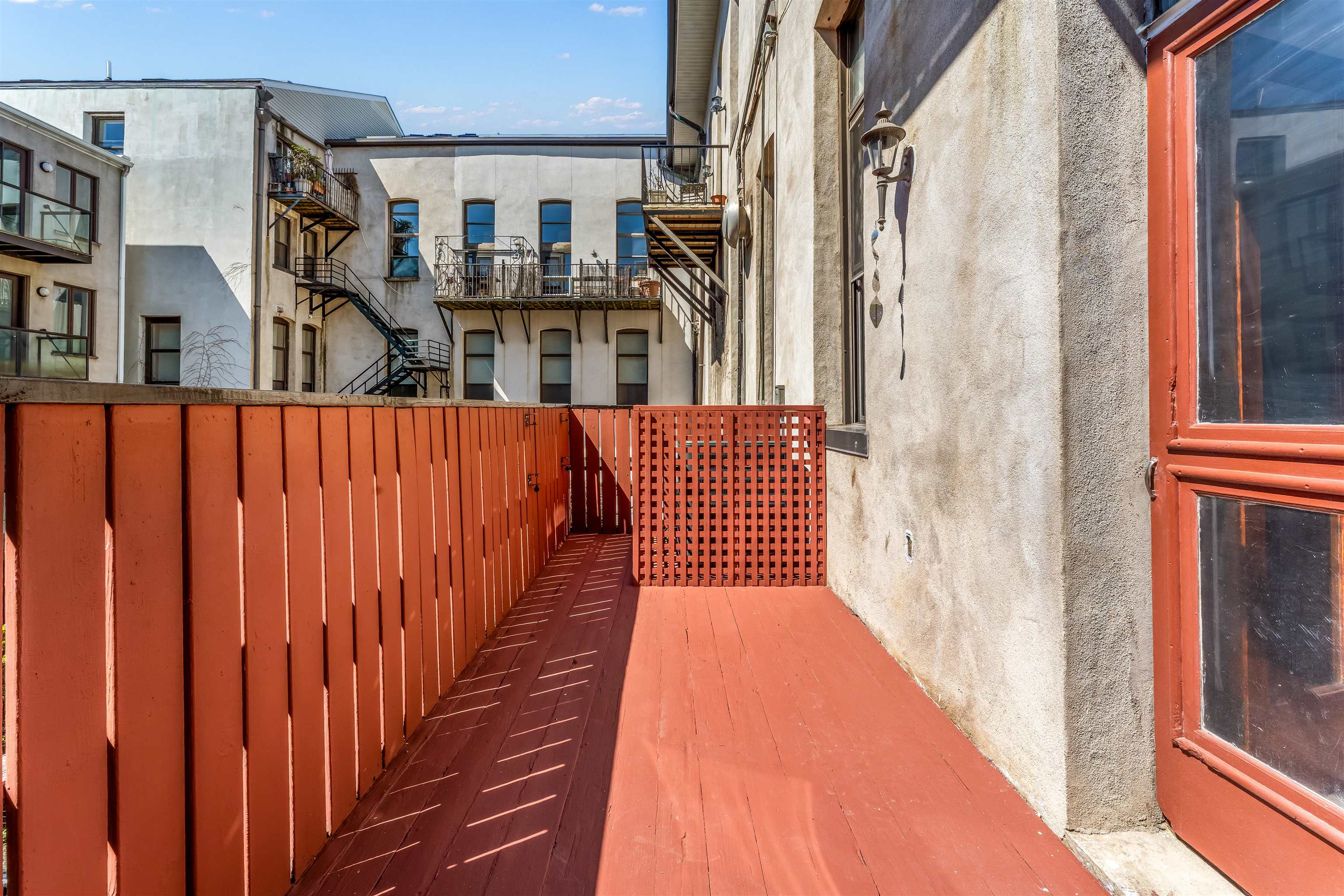 Wells Fargo is an iconic landmark building that used to be a former horse and carriage stables, built in 1890 for the namesake stagecoach empire. The Wells Fargo Loft Condominiums is located at the Heart of Hamilton Park, Historic District. The ceiling soars 15' in height. There are five oversized windows facing south, receiving abundant natural and consistent exposure to sunlight throughout the day. The bathroom is newly renovated! Two large French glass doors lead to 150 sqft private deck. There is also a cozy fireplace installed. Antique wooden shutters, dramatic stairwell with gorgeous Beaux Arts railing, large retro ceiling fans, Gas Log Fireplace, recessed and track lighting. Additionally, there are custom trim moldings and timeless architectural details. The hallways have been remodeled as well. There is a 24-hour virtual doorman service. The Hamilton Park neighborhood is filled with tree lined streets, townhouses, cafes, restaurants, and schools. It's an easy commute to NYC.