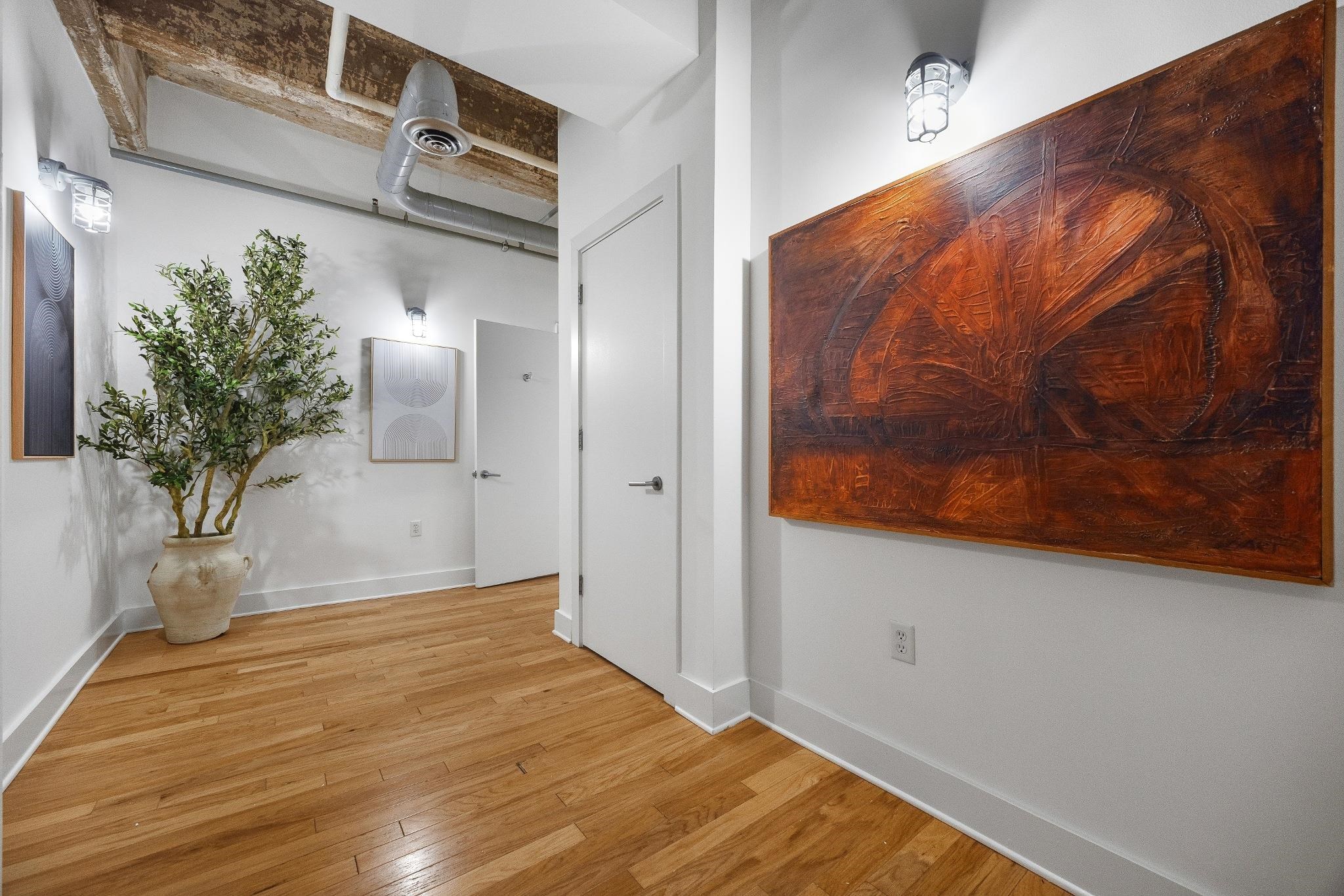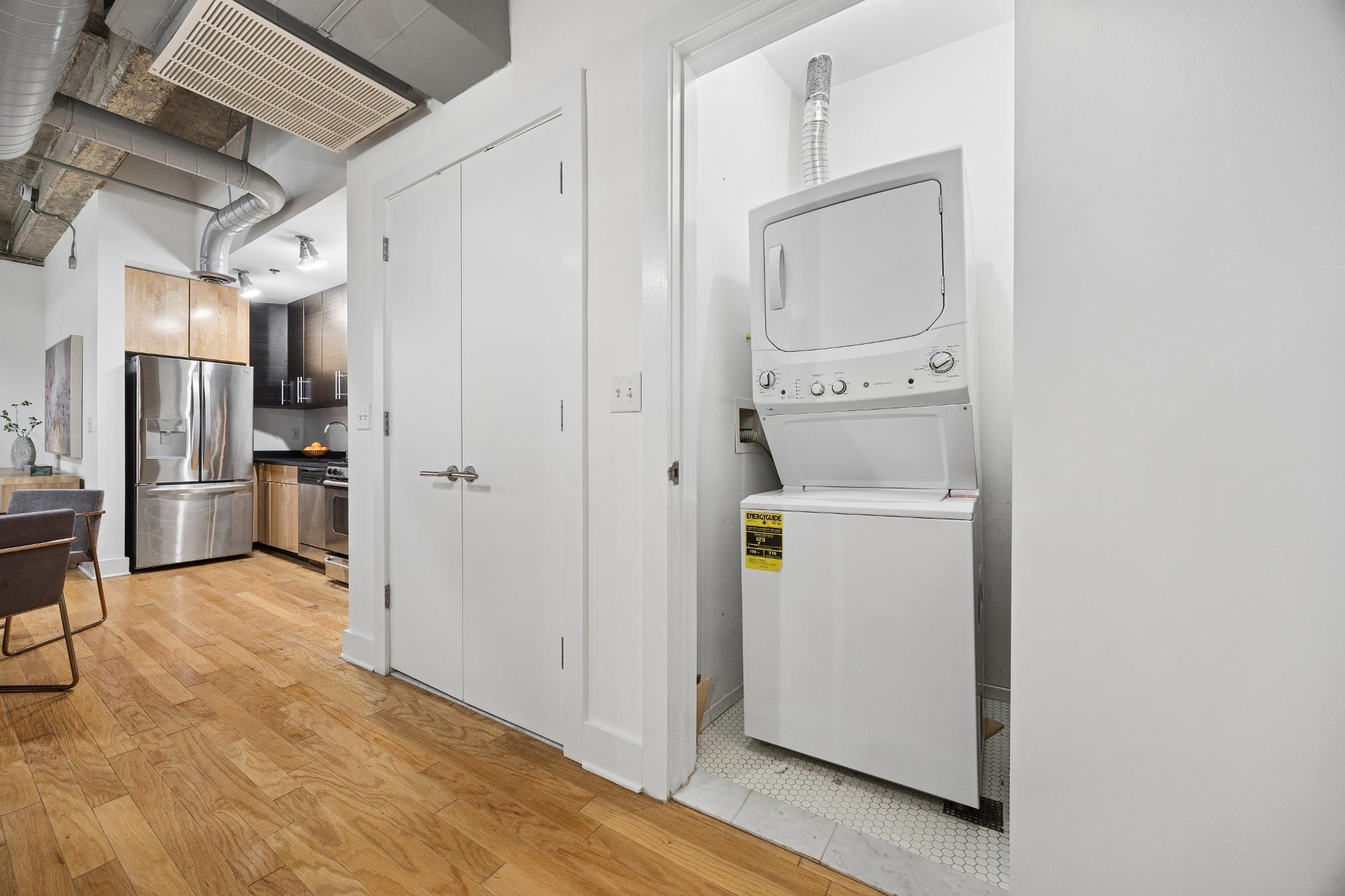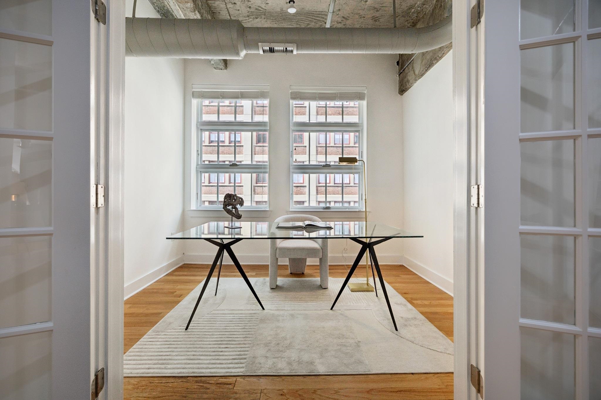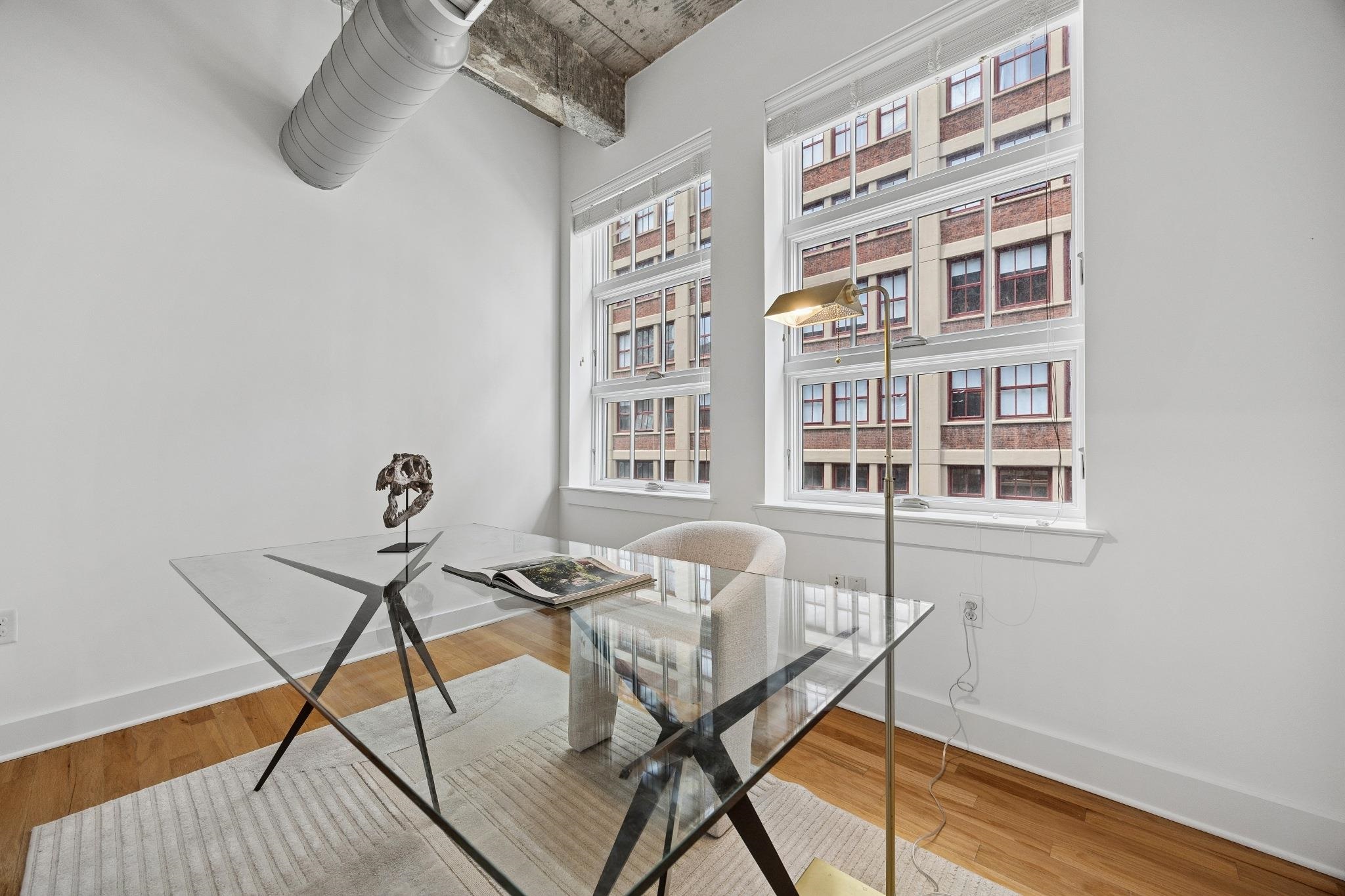 Not your typical old downtown brownstone. Not a glassy new build. Something different. A repurposed warehouse with concrete construction, 12 foot ceilings, exposed brick and pillars. Solid, quiet, and built to last. Approx. 945 sq ft with a layout that works. One bedroom plus a separate office or flex space behind French doors. Large living room with an adjacent dining area and a streamlined kitchen that runs along one wall with good counter space and storage. An oversized entry hall that does more than connect rooms. Quiet from the corridor and flexible for storage, shelving, or a gallery wall. An oversized bathroom adds to the overall scale. In unit washer and dryer. Central air. Tankless Water Heater. Elevator building with a common roof deck. Well maintained. Cooke Lofts in the Powerhouse Arts District. Zoned for PS16. Less than three blocks to the Grove Street PATH. Near restaurants, coffee, the waterfront, and everything that keeps downtown moving. Loft living tends to attract a certain buyer. Someone who values space, structure, and a bit of creativity. If that sounds like you, you will understand this one.